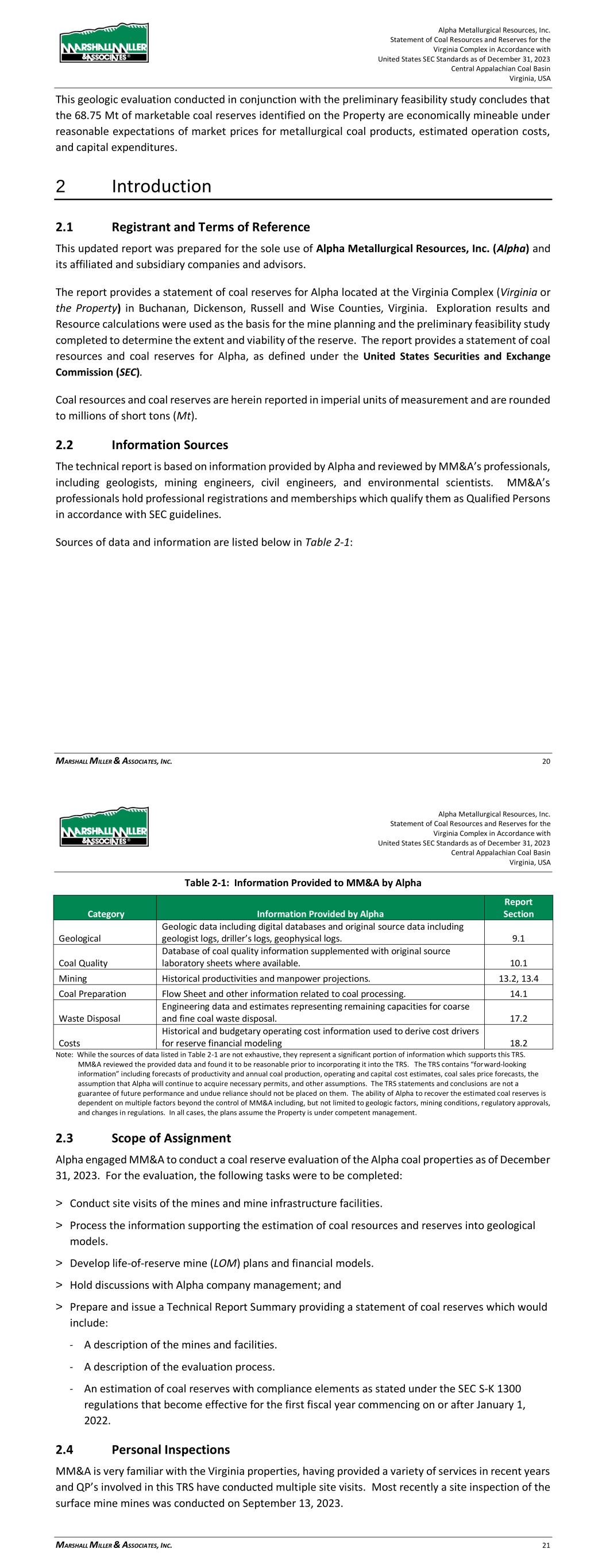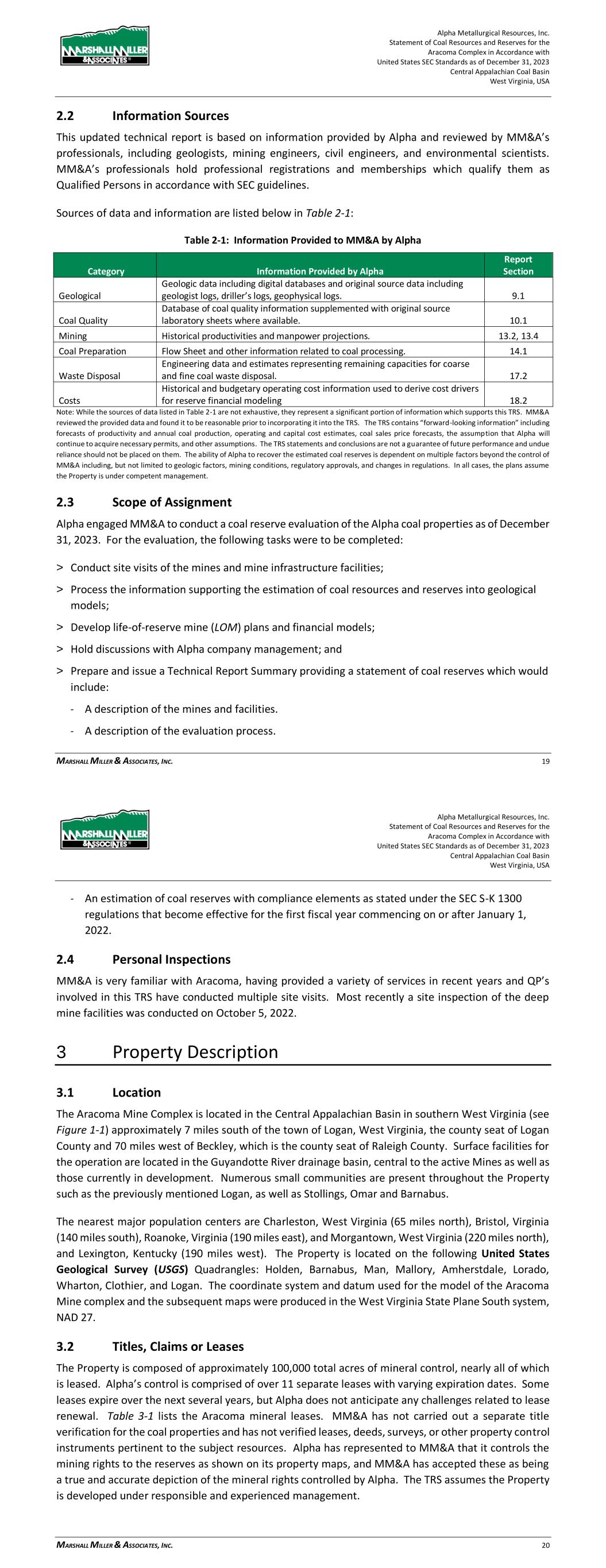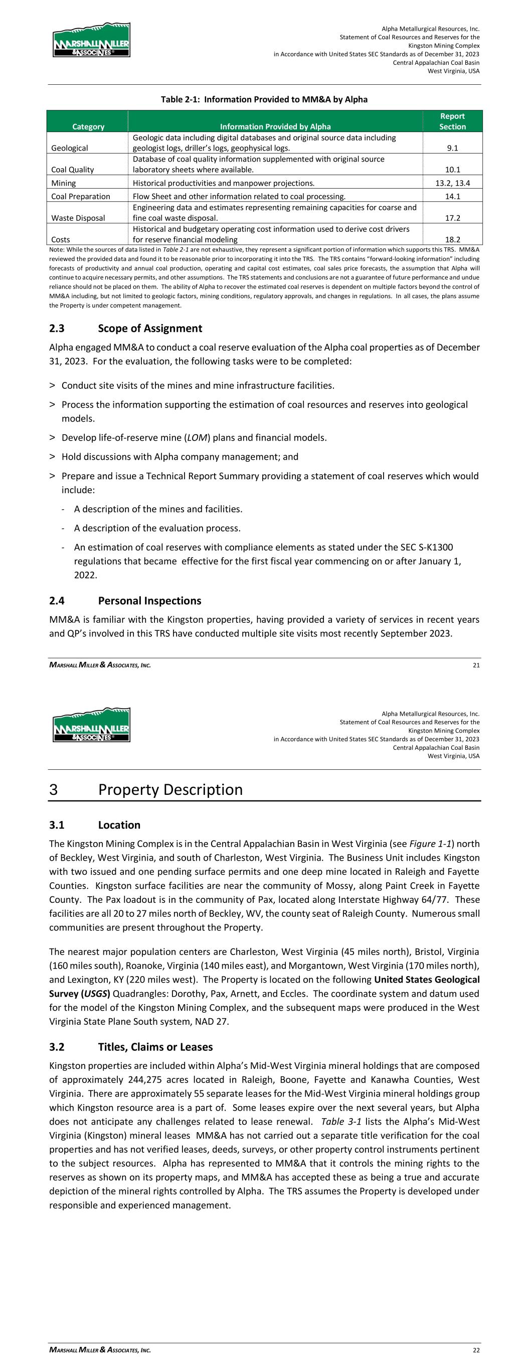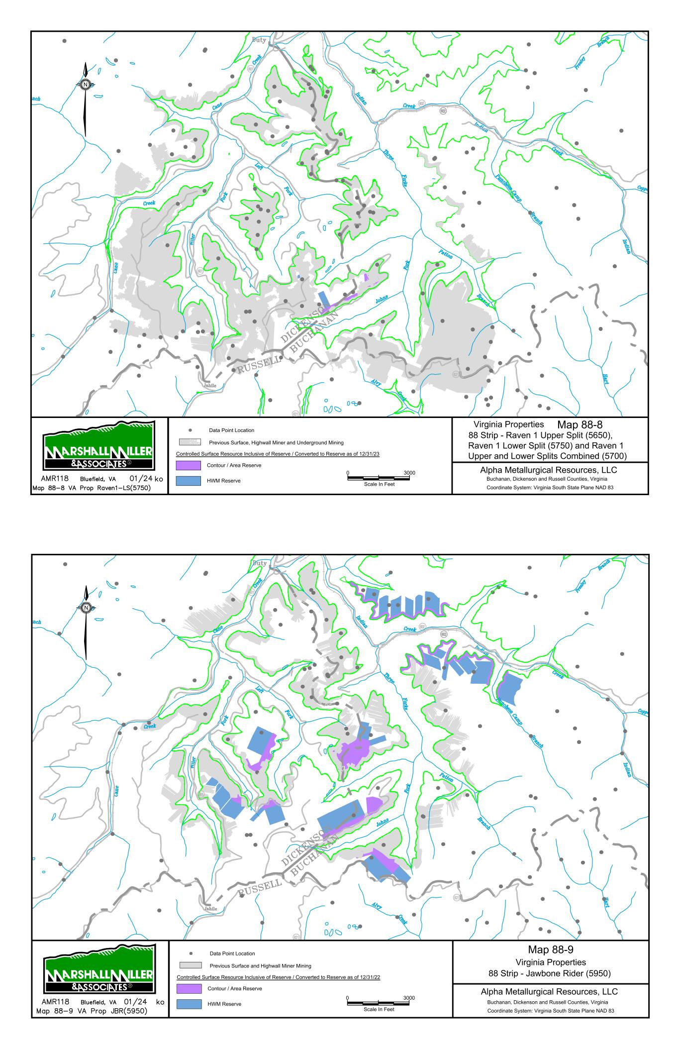 Alpha Metallurgical Resources, Inc. Statement of Coal Resources for the Power Mountain Underground Complex in Accordance with United States SEC Standards as of December 31, 2023 Central Appalachian Coal Basin West Virginia, USA MARSHALL MILLER & ASSOCIATES, INC. 11 > Hold discussions with Alpha company management; and > Prepare and issue a Technical Report Summary providing a statement of coal resources which would include: - A description of the facilities. - A description of the evaluation process. - An estimation of coal resources with compliance elements as stated under the SEC S-K 1300 regulations. 2.4 Personal Inspections MM&A is very familiar with the Power Mountain West Virginia Properties, having provided a variety of services in recent years. Qualitied Persons involved in this TRS have conducted a site visit to the new Rolling Thunder Powellton mine during September 2023 and also visited Jerry Fork and Power Mountain surface facilities. 2.5 Updates to Previous TRS MM&A previously prepared an S-K 1300 TRS filings pertaining to the Property for the period ending December 31, 2022. Additionally, multiple reserve analyses have been completed on the Property by MM&A and other industry experts. 3 Property Description 3.1 Location The Power Mountain Complex is located in the Central Appalachian Basin of southern West Virginia (see Figure 3-1) with coal properties in Nicholas County. The Jerry Fork Eagle Mine is located within the Power Mountain facilities area that includes the preparation plant and rail surface facilities. The Rolling Thunder Powellton seam property is located approximately 10 miles west of the preparation plant and surface facilities. The Power Mountain surface facilities are approximately 20 miles west of the town of Summerville, West Virginia, the county seat of Nicholas County. Additionally, the Property is approximately 50 miles north of Beckley, West Virginia, and 53 miles east of Charleston, West Virginia, the state capital of West Virginia. Surface facilities for the operation are located in the Twentymile Creek and Gauley River drainage basins. Numerous small communities are present near the Property such as Drennen, Lockwood, and Belva, West Virginia. The nearest major population center is Charleston, West Virginia, the capital of West Virginia that is approximately 53 miles west of the surface facilities. Other major population centers are Beckley, West Virginia (50 miles south), Roanoke, Virginia (155 miles southeast), Morgantown, West Virginia (135 miles north), and Lexington, Kentucky (230 miles west). Alpha Metallurgical Resources, Inc. Statement of Coal Resources for the Power Mountain Underground Complex in Accordance with United States SEC Standards as of December 31, 2023 Central Appalachian Coal Basin West Virginia, USA MARSHALL MILLER & ASSOCIATES, INC. 12 The coal resources are located on the following United States Geological Survey (USGS) Quadrangles: Bentree, Lockwood, Gilboa, and Swandale. The coordinate system and datum used for the model of the Power Mountain coal resources and mine complex and the subsequent maps were produced in the West Virginia State Plane South system, NAD 27. Figure 3-1: Property Location Map 3.2 Titles, Claims or Leases MM&A has not carried out a separate title verification for the coal property and has not verified leases, deeds, surveys, or other property control instruments pertinent to the subject resources. Alpha’s property is comprised of approximately 51,400 total acres of mineral control owned in fee and approximately 5 separate leases with varying expiration dates. Table 3-1 lists the Power Mountain property mineral control. Alpha has represented to MM&A that Alpha controls the mining rights to the resources as shown on the property maps, and MM&A has accepted these as being a true and accurate depiction of the mineral rights controlled by Alpha.