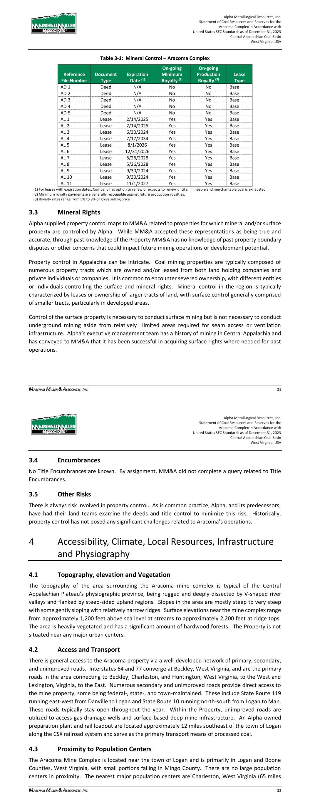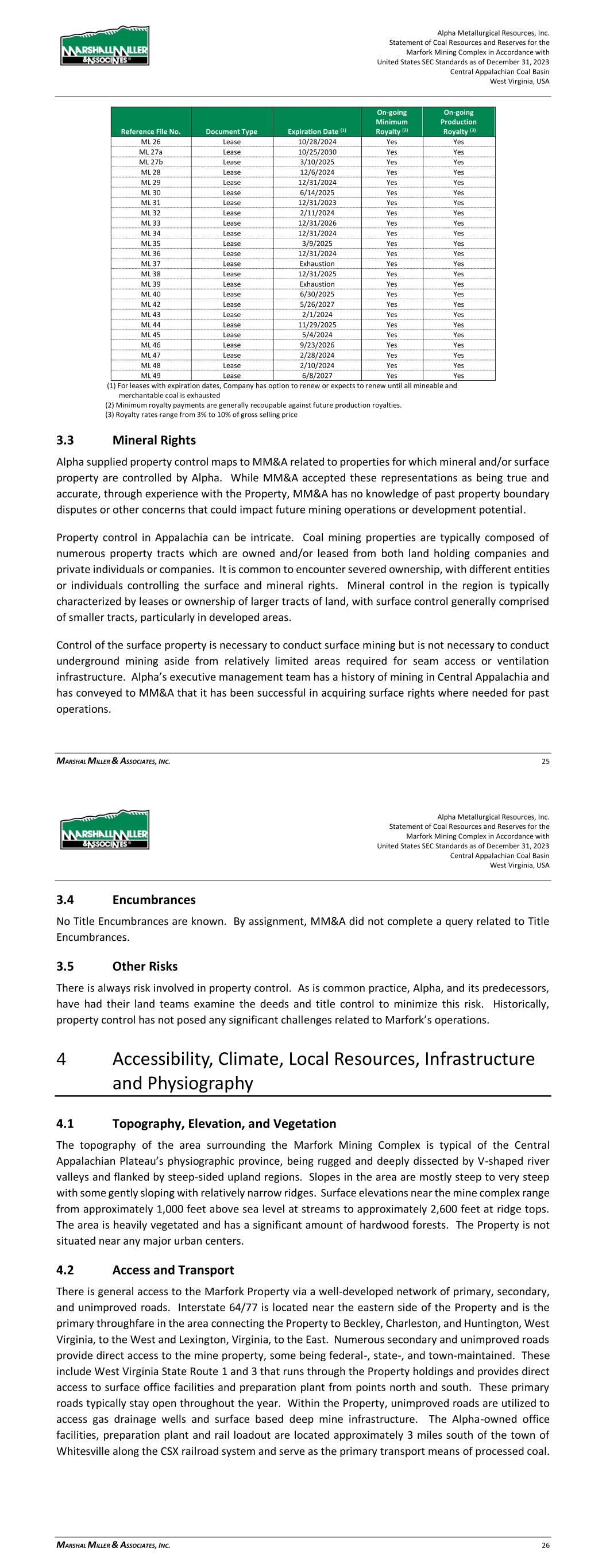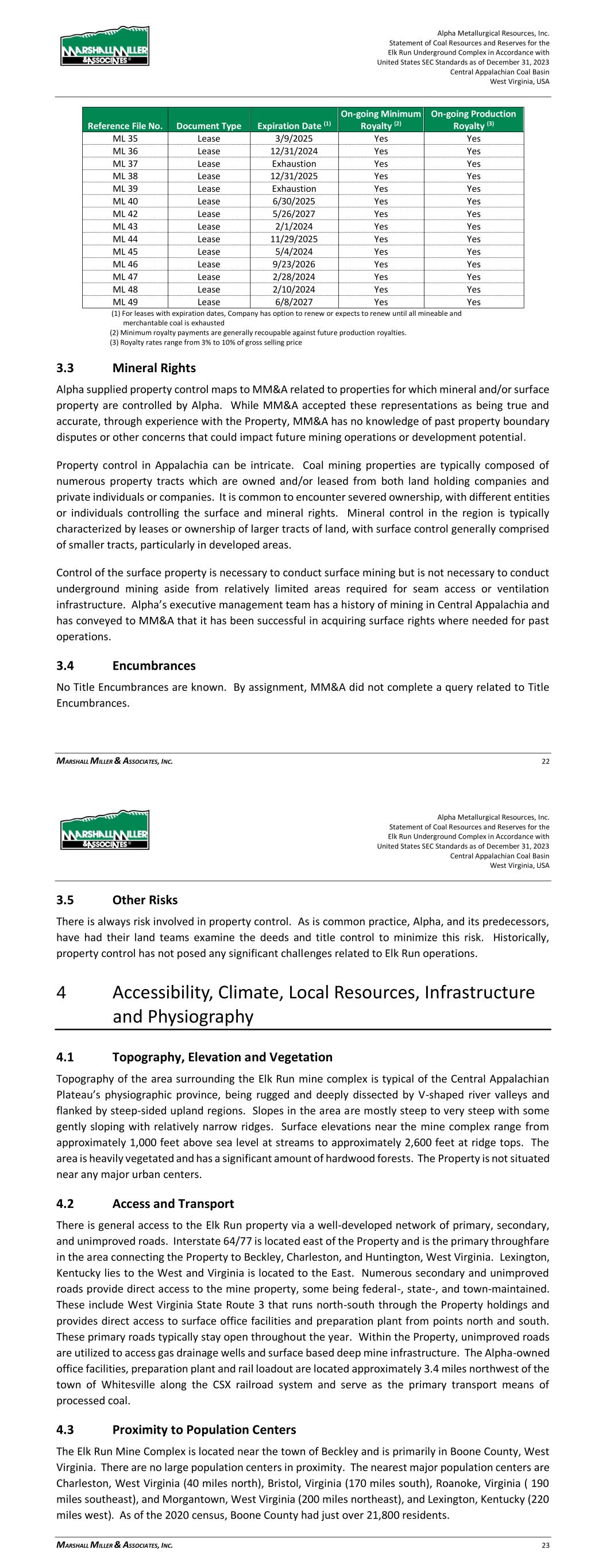 Alpha Metallurgical Resources, Inc. Statement of Coal Resources for the Power Mountain Underground Complex in Accordance with United States SEC Standards as of December 31, 2023 Central Appalachian Coal Basin West Virginia, USA MARSHALL MILLER & ASSOCIATES, INC. 13 Table 3-1: Mineral Control – Power Mountain Complex Reference File Number Document Type Expiration Date (1) On-going Minimum Royalty (2) On-going Production Royalty (3) PD 1 Deed N/A N/A N/A PD 2 Deed N/A N/A N/A PD 3 Deed N/A N/A N/A PD 4 Deed N/A N/A N/A PD 5 Deed N/A N/A N/A PL 1 Lease 3/31/2024 Yes Yes PL 4 Lease 12/31/2026 Yes Yes PL 5 Lease 5/11/2027 Yes Yes PL 6 Lease 5/11/2027 Yes Yes PL 7 Lease 12/31/2023 Yes Yes (1) For leases with expiration dates, Company has option to renew or expects to renew until all mineable and merchantable coal is exhausted (2) Minimum royalty payments are generally recoupable against future production royalties. (3) Royalty rates range from 5.5% to 9% of gross selling price 3.3 Mineral Rights Alpha supplied property control maps to MM&A related to properties for which mineral and/or surface property are controlled by Alpha. While MM&A accepted these representations as being true and accurate, through experience with the Property, MM&A has no knowledge of past property boundary disputes or other concerns that could impact future mining operations or development potential. Property control in Appalachia can be intricate. Coal mining properties are typically composed of numerous property tracts which are owned and/or leased from both land holding companies and private individuals or companies. It is common to encounter severed ownership, with different entities or individuals controlling the surface and mineral rights. Mineral control in the region is typically characterized by leases or ownership of larger tracts of land, with surface control generally comprised of smaller tracts, particularly in developed areas. Control of the surface property is necessary to conduct surface mining but is not necessary to conduct underground mining aside from relatively limited areas required for seam access or ventilation infrastructure. Alpha’s executive management team has a history of mining in Central Appalachia and has conveyed to MM&A that it has been successful in acquiring surface rights where needed for past operations. By assignment, MM&A has not completed a title review of the Power Mountain properties. 3.4 Encumbrances No Title Encumbrances are known. By assignment, MM&A did not complete a query related to Title Encumbrances or Environmental Encumbrances. Alpha Metallurgical Resources, Inc. Statement of Coal Resources for the Power Mountain Underground Complex in Accordance with United States SEC Standards as of December 31, 2023 Central Appalachian Coal Basin West Virginia, USA MARSHALL MILLER & ASSOCIATES, INC. 14 3.5 Other Risks There is always risk involved in property control. As is common practice, Alpha, and its predecessors, have had their land teams examine the deeds and title control to minimize this risk. Historically, property control has not posed any significant challenges related to Power Mountain operations. 4 Accessibility, Climate, Local Resources, Infrastructure and Physiography 4.1 Topography, Elevation, and Vegetation The Property is located within the Appalachian Plateau physiographic province along the Gauley River. The terrain is typical of the Central Appalachian Plateau’s physiographic province, being rugged and deeply dissected by V-shaped river valleys and flanked by steep-sided upland regions. Slopes in the area are mostly steep to very steep with some gently sloping with relatively narrow ridges. Surface elevations near the mine complex range from approximately 900 feet above sea level at streams to approximately 2,000 feet at ridge tops. The area is heavily vegetated and has a significant amount of hardwood forests. The Property is not situated near any major urban centers. 4.2 Access and Transport Primary access to the Power Mountain properties is provided through West Virginia Route 39 (WV-39) that parallels the Gauley River. WV-39 connects with West Virginia Route 19 (WV-19) in Summersville, WV and State Route-60 at Gauley Bridge that provides access to Charleston, West Virginia and points north and south. Numerous secondary and unimproved roads provide direct access to the mine property. These roads typically stay open throughout the year. Within the Property, unimproved roads are utilized to access gas drainage wells and surface based deep mine infrastructure. Rail transport is provided to the Power Mountain loadout by Norfork Southern (NS) Railroad. 4.3 Proximity to Population Centers The Power Mountain properties are located near the town of Summersville, West Virginia in Nicholas County. There are no large population centers in close proximity to the Property. The nearest major population centers are Charleston, West Virginia (53 miles west), Roanoke, Virginia (155 miles southeast), and Morgantown, West Virginia (135 miles north), and Lexington, Kentucky (230 miles west). As of the 2020 census, Nicholas County had just over 24,600 residents.