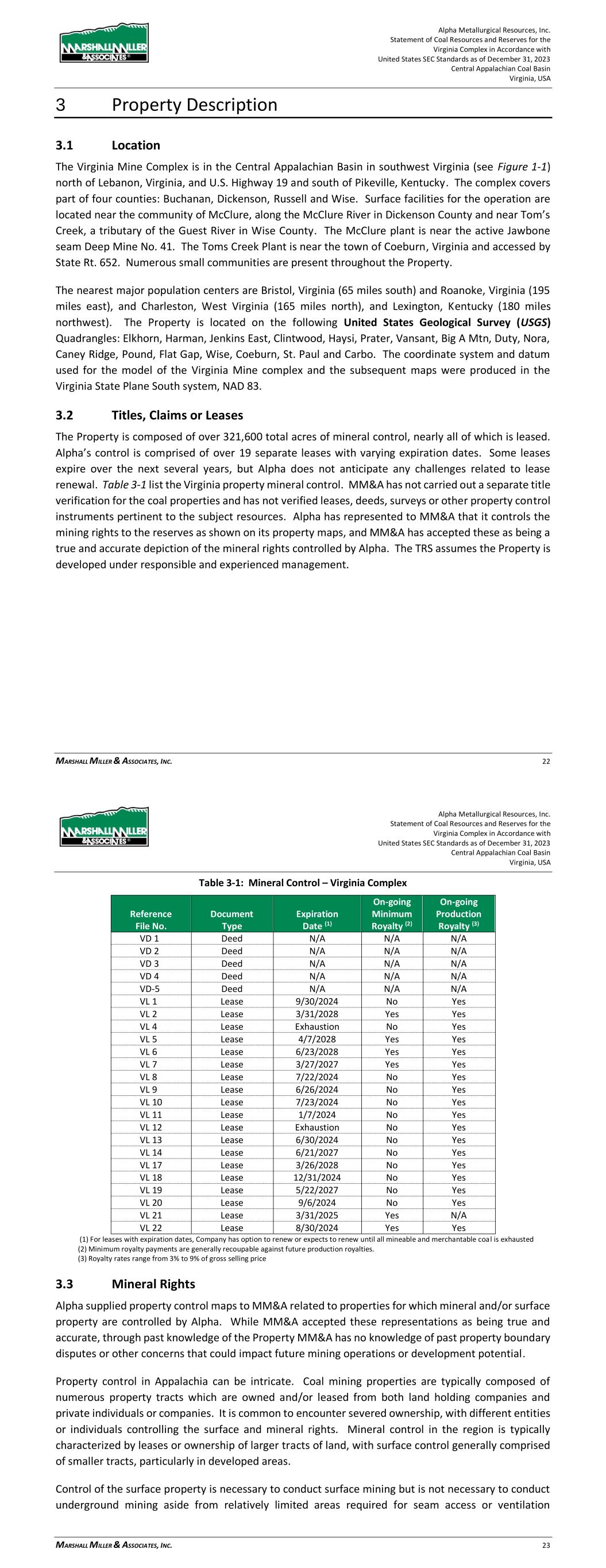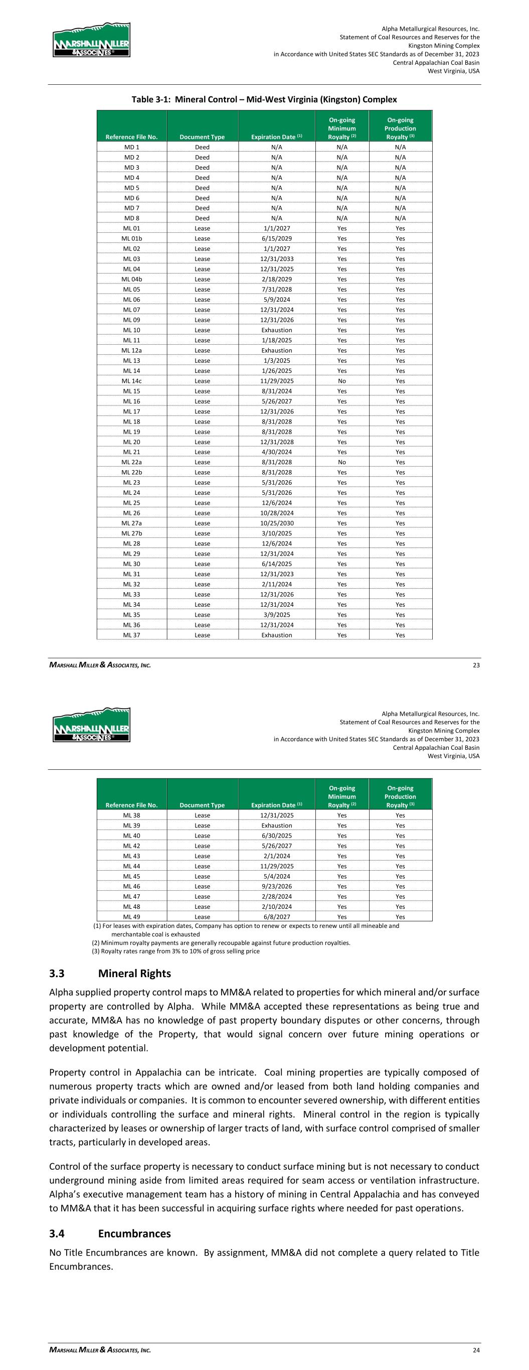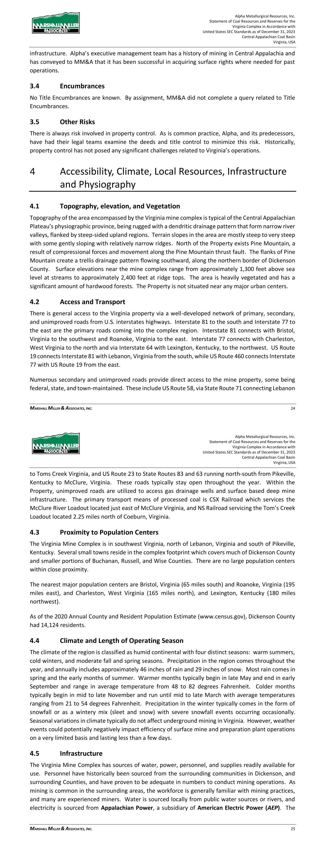 Alpha Metallurgical Resources, Inc. Statement of Coal Resources for the Power Mountain Underground Complex in Accordance with United States SEC Standards as of December 31, 2023 Central Appalachian Coal Basin West Virginia, USA MARSHALL MILLER & ASSOCIATES, INC. 13 Table 3-1: Mineral Control – Power Mountain Complex Reference File Number Document Type Expiration Date (1) On-going Minimum Royalty (2) On-going Production Royalty (3) PD 1 Deed N/A N/A N/A PD 2 Deed N/A N/A N/A PD 3 Deed N/A N/A N/A PD 4 Deed N/A N/A N/A PD 5 Deed N/A N/A N/A PL 1 Lease 3/31/2024 Yes Yes PL 4 Lease 12/31/2026 Yes Yes PL 5 Lease 5/11/2027 Yes Yes PL 6 Lease 5/11/2027 Yes Yes PL 7 Lease 12/31/2023 Yes Yes (1) For leases with expiration dates, Company has option to renew or expects to renew until all mineable and merchantable coal is exhausted (2) Minimum royalty payments are generally recoupable against future production royalties. (3) Royalty rates range from 5.5% to 9% of gross selling price 3.3 Mineral Rights Alpha supplied property control maps to MM&A related to properties for which mineral and/or surface property are controlled by Alpha. While MM&A accepted these representations as being true and accurate, through experience with the Property, MM&A has no knowledge of past property boundary disputes or other concerns that could impact future mining operations or development potential. Property control in Appalachia can be intricate. Coal mining properties are typically composed of numerous property tracts which are owned and/or leased from both land holding companies and private individuals or companies. It is common to encounter severed ownership, with different entities or individuals controlling the surface and mineral rights. Mineral control in the region is typically characterized by leases or ownership of larger tracts of land, with surface control generally comprised of smaller tracts, particularly in developed areas. Control of the surface property is necessary to conduct surface mining but is not necessary to conduct underground mining aside from relatively limited areas required for seam access or ventilation infrastructure. Alpha’s executive management team has a history of mining in Central Appalachia and has conveyed to MM&A that it has been successful in acquiring surface rights where needed for past operations. By assignment, MM&A has not completed a title review of the Power Mountain properties. 3.4 Encumbrances No Title Encumbrances are known. By assignment, MM&A did not complete a query related to Title Encumbrances or Environmental Encumbrances. Alpha Metallurgical Resources, Inc. Statement of Coal Resources for the Power Mountain Underground Complex in Accordance with United States SEC Standards as of December 31, 2023 Central Appalachian Coal Basin West Virginia, USA MARSHALL MILLER & ASSOCIATES, INC. 14 3.5 Other Risks There is always risk involved in property control. As is common practice, Alpha, and its predecessors, have had their land teams examine the deeds and title control to minimize this risk. Historically, property control has not posed any significant challenges related to Power Mountain operations. 4 Accessibility, Climate, Local Resources, Infrastructure and Physiography 4.1 Topography, Elevation, and Vegetation The Property is located within the Appalachian Plateau physiographic province along the Gauley River. The terrain is typical of the Central Appalachian Plateau’s physiographic province, being rugged and deeply dissected by V-shaped river valleys and flanked by steep-sided upland regions. Slopes in the area are mostly steep to very steep with some gently sloping with relatively narrow ridges. Surface elevations near the mine complex range from approximately 900 feet above sea level at streams to approximately 2,000 feet at ridge tops. The area is heavily vegetated and has a significant amount of hardwood forests. The Property is not situated near any major urban centers. 4.2 Access and Transport Primary access to the Power Mountain properties is provided through West Virginia Route 39 (WV-39) that parallels the Gauley River. WV-39 connects with West Virginia Route 19 (WV-19) in Summersville, WV and State Route-60 at Gauley Bridge that provides access to Charleston, West Virginia and points north and south. Numerous secondary and unimproved roads provide direct access to the mine property. These roads typically stay open throughout the year. Within the Property, unimproved roads are utilized to access gas drainage wells and surface based deep mine infrastructure. Rail transport is provided to the Power Mountain loadout by Norfork Southern (NS) Railroad. 4.3 Proximity to Population Centers The Power Mountain properties are located near the town of Summersville, West Virginia in Nicholas County. There are no large population centers in close proximity to the Property. The nearest major population centers are Charleston, West Virginia (53 miles west), Roanoke, Virginia (155 miles southeast), and Morgantown, West Virginia (135 miles north), and Lexington, Kentucky (230 miles west). As of the 2020 census, Nicholas County had just over 24,600 residents.