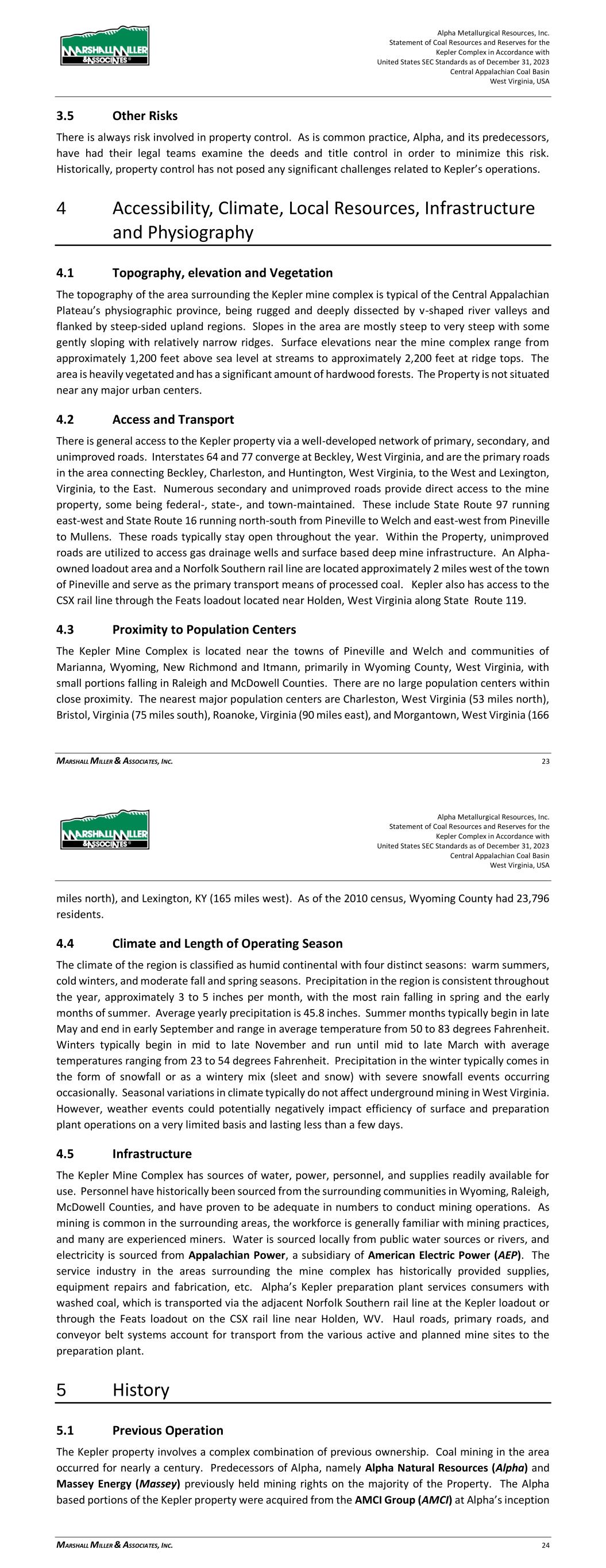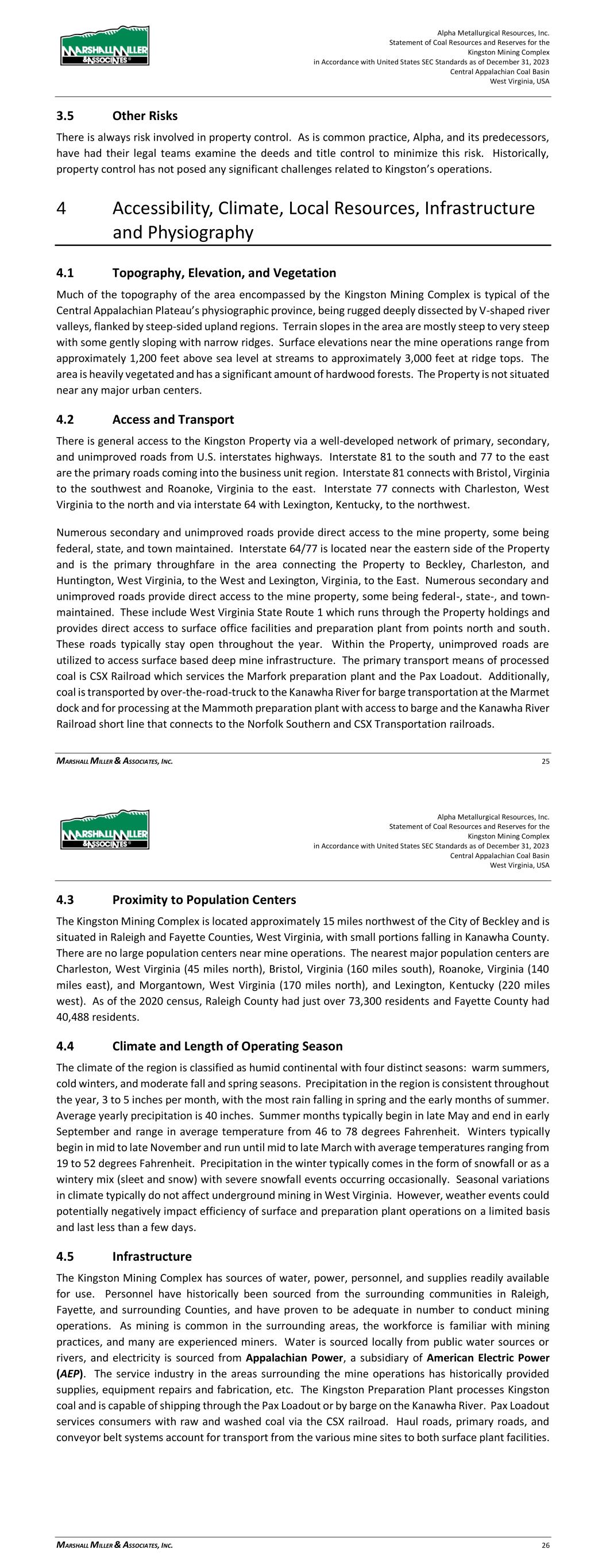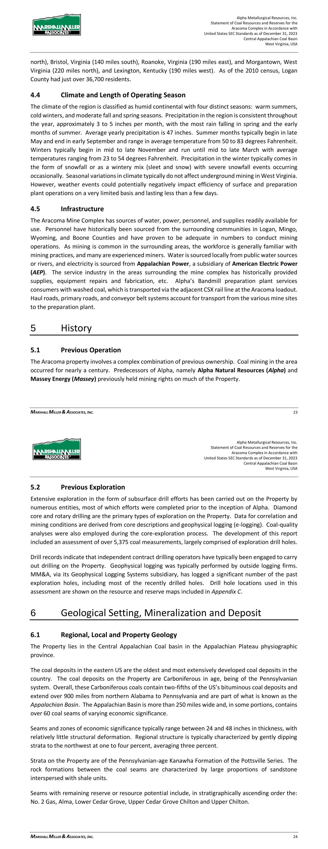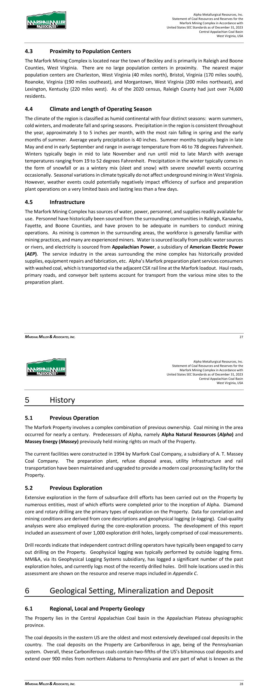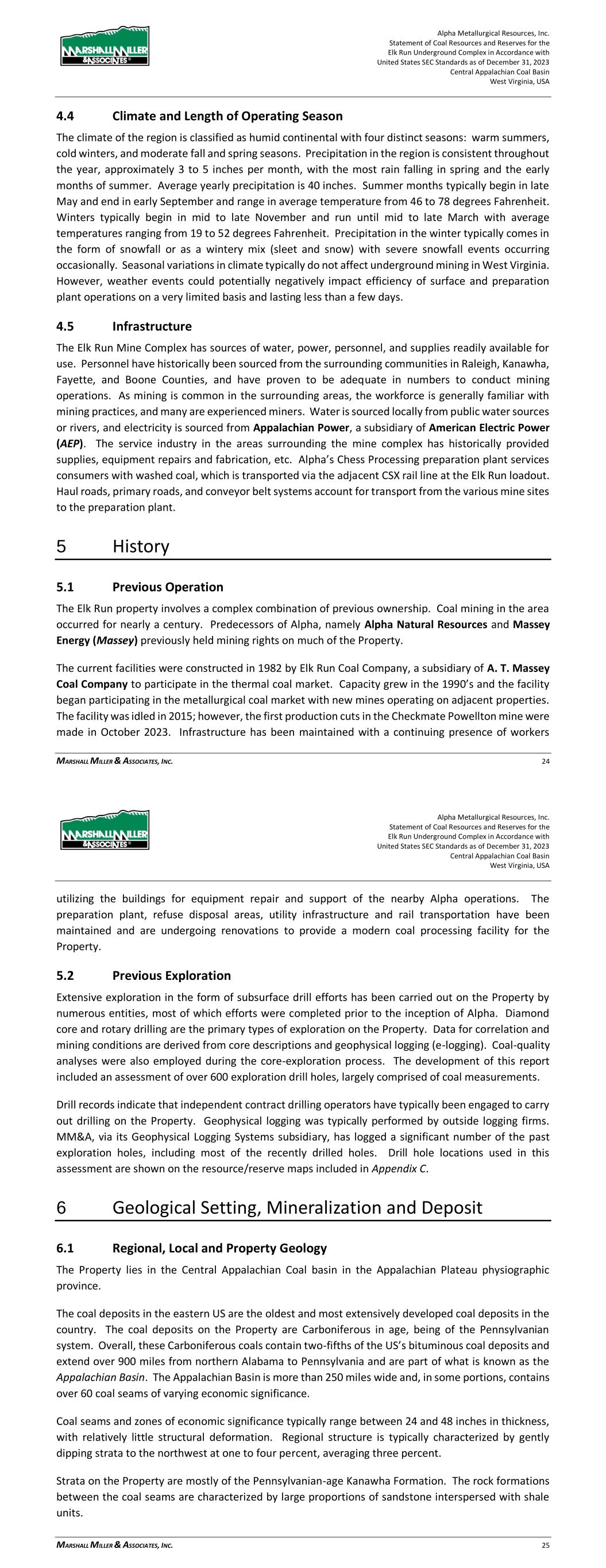 Alpha Metallurgical Resources, Inc. Statement of Coal Resources for the Power Mountain Underground Complex in Accordance with United States SEC Standards as of December 31, 2023 Central Appalachian Coal Basin West Virginia, USA MARSHALL MILLER & ASSOCIATES, INC. 15 4.4 Climate and Length of Operating Season The climate of the region is classified as humid continental with four distinct seasons: warm summers, cold winters, and moderate fall and spring seasons. Precipitation in the region is consistent throughout the year, approximately 3 to 5 inches per month, with the most rain falling in spring and the early months of summer. Average yearly precipitation is 51.1 inches. Summer months typically begin in late May and end in early September and range in average temperature from 46 to 78 degrees Fahrenheit. Winters typically begin in mid to late November and run until mid to late March with average temperatures ranging from 19 to 52 degrees Fahrenheit. Precipitation in the winter typically comes in the form of snowfall or as a wintery mix (sleet and snow) with severe snowfall events occurring occasionally. Seasonal variations in climate typically do not affect underground mining in West Virginia. 4.5 Infrastructure The Power Mountain properties have sources of water, power, personnel, and supplies readily available for use. Personnel have historically been hired from the surrounding communities in Nicholas, Raleigh, Kanawha, Fayette, and Boone Counties, and have proven to be adequate in numbers to conduct mining operations. As mining is common in the surrounding areas, the workforce is generally familiar with mining practices, and many are experienced miners. Water is sourced locally from ground water collected in abandoned underground mines and the refuge impoundment, and electricity is sourced from Appalachian Power, a subsidiary of American Electric Power (AEP). The service industry in the areas surrounding the mine complex has historically provided supplies, equipment repairs and fabrication, etc. Alpha’s Power Mountain preparation plant services consumers with washed coal, which is transported via the adjacent NS rail line at the Power Mountain loadout. Haul roads, primary roads, and conveyor belt systems account for transport from the various mine sites to the preparation plant. 5 History 5.1 Previous Operation The Power Mountain properties involve a complex combination of previous ownership. Coal mining in the area has occurred for nearly a century. Predecessors of Alpha, namely Alpha Natural Resources (ANR) and Massey Energy (Massey) previously held mining rights on much of the Property. The current Power Mountain preparation plant surface facilities were constructed in 1985 by A.T. Massey Coal Company. The preparation plant was upgraded in 2010 and the refuse disposal areas, utility infrastructure and rail transportation have been maintained to provide a modern coal processing facility for the Property. Alpha Metallurgical Resources, Inc. Statement of Coal Resources for the Power Mountain Underground Complex in Accordance with United States SEC Standards as of December 31, 2023 Central Appalachian Coal Basin West Virginia, USA MARSHALL MILLER & ASSOCIATES, INC. 16 The Eagle seam resources are associated with the Jerry Fork Eagle underground mine. The mine was constructed in 1999 and has since been in continuous operation. The Rolling Thunder Powellton seam resources were developed in 2023, additionally there is historic underground mining on the Property. 5.2 Previous Exploration Extensive exploration in the form of subsurface drill efforts has been carried out on the Property by numerous entities, most of which efforts were completed prior to the inception of Alpha. The most recent exploration drilling has been conducted by Alpha in 2021. Diamond core and rotary drilling are the primary types of exploration on the Property. Data for correlation and mining conditions are derived from core descriptions and geophysical logging (e-logging). Coal quality analyses were also employed during the core exploration process. The development of this report included an assessment of over 250 exploration drill holes, largely comprised of coal measurements. Drill records indicate that independent contract drilling operators have typically been engaged to carry out drilling on the Property. Geophysical logging was typically performed by outside logging firms. MM&A, via its Geophysical Logging Systems (GLS) subsidiary, has logged a significant number of the past exploration holes, including most of the recently drilled holes. 6 Geology 6.1 Regional, Local and Property Geology The Property lies in the Central Appalachian Coal basin in the Appalachian Plateau physiographic province. The coal deposits in the eastern US are the oldest and most extensively developed coal deposits in the country. The coal deposits on the Property are Carboniferous in age, being of the Pennsylvanian system. Overall, these Carboniferous coals contain two-fifths of the US’s bituminous coal deposits and extend over 900 miles from northern Alabama to Pennsylvania and are part of what is known as the Appalachian Basin. The Appalachian Basin is more than 250 miles wide and, in some portions, contains over 60 coal seams of varying economic significance. Coal seams and zones of economic significance typically range between 24 and 48 inches in thickness, with relatively little structural deformation. Regional structure is typically characterized by gently dipping strata to the northwest at one to four percent, averaging three percent. Strata on the Property are mostly of the Pennsylvanian-age Kanawha Formation and the older, lower Beckley and Fire Creek seams are part of the New River Formation of the Pottsville Series. The rock formations between the coal seams are characterized by large proportions of sandstone interspersed with shale units.