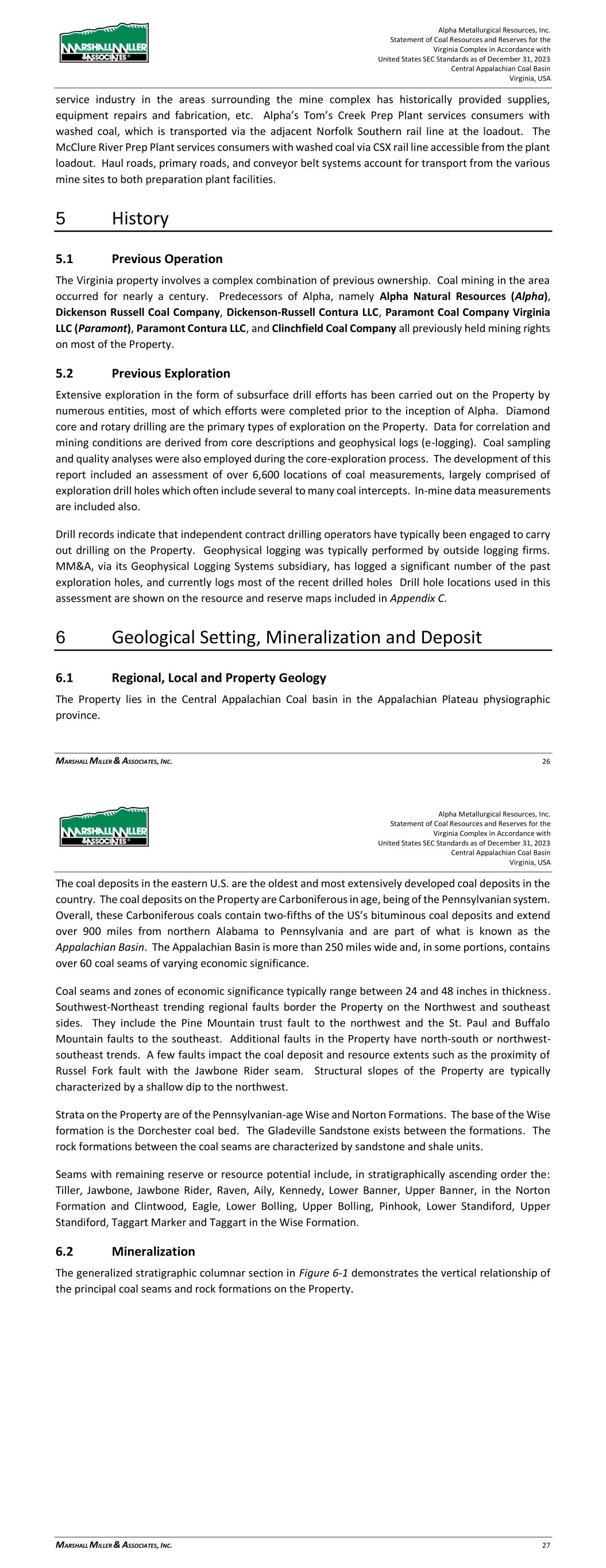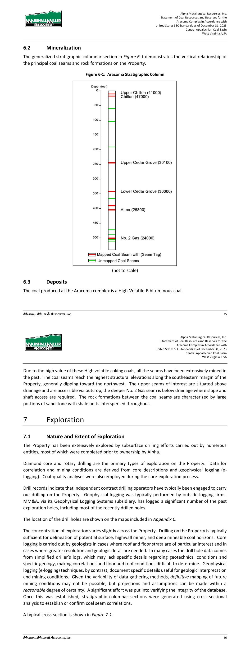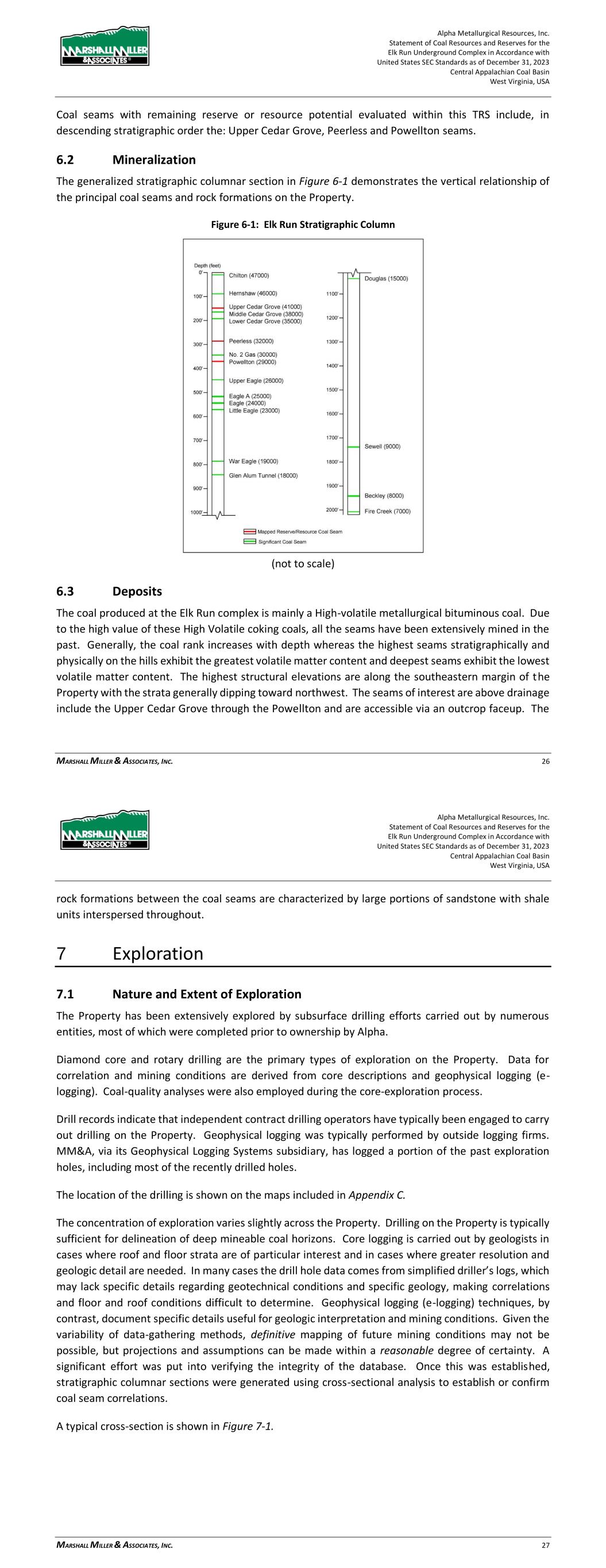 Alpha Metallurgical Resources, Inc. Statement of Coal Resources and Reserves for the Elk Run Underground Complex in Accordance with United States SEC Standards as of December 31, 2023 Central Appalachian Coal Basin West Virginia, USA MARSHALL MILLER & ASSOCIATES, INC. 26 Coal seams with remaining reserve or resource potential evaluated within this TRS include, in descending stratigraphic order the: Upper Cedar Grove, Peerless and Powellton seams. 6.2 Mineralization The generalized stratigraphic columnar section in Figure 6-1 demonstrates the vertical relationship of the principal coal seams and rock formations on the Property. Figure 6-1: Elk Run Stratigraphic Column (not to scale) 6.3 Deposits The coal produced at the Elk Run complex is mainly a High-volatile metallurgical bituminous coal. Due to the high value of these High Volatile coking coals, all the seams have been extensively mined in the past. Generally, the coal rank increases with depth whereas the highest seams stratigraphically and physically on the hills exhibit the greatest volatile matter content and deepest seams exhibit the lowest volatile matter content. The highest structural elevations are along the southeastern margin of the Property with the strata generally dipping toward northwest. The seams of interest are above drainage include the Upper Cedar Grove through the Powellton and are accessible via an outcrop faceup. The Alpha Metallurgical Resources, Inc. Statement of Coal Resources and Reserves for the Elk Run Underground Complex in Accordance with United States SEC Standards as of December 31, 2023 Central Appalachian Coal Basin West Virginia, USA MARSHALL MILLER & ASSOCIATES, INC. 27 rock formations between the coal seams are characterized by large portions of sandstone with shale units interspersed throughout. 7 Exploration 7.1 Nature and Extent of Exploration The Property has been extensively explored by subsurface drilling efforts carried out by numerous entities, most of which were completed prior to ownership by Alpha. Diamond core and rotary drilling are the primary types of exploration on the Property. Data for correlation and mining conditions are derived from core descriptions and geophysical logging (e- logging). Coal-quality analyses were also employed during the core-exploration process. Drill records indicate that independent contract drilling operators have typically been engaged to carry out drilling on the Property. Geophysical logging was typically performed by outside logging firms. MM&A, via its Geophysical Logging Systems subsidiary, has logged a portion of the past exploration holes, including most of the recently drilled holes. The location of the drilling is shown on the maps included in Appendix C. The concentration of exploration varies slightly across the Property. Drilling on the Property is typically sufficient for delineation of deep mineable coal horizons. Core logging is carried out by geologists in cases where roof and floor strata are of particular interest and in cases where greater resolution and geologic detail are needed. In many cases the drill hole data comes from simplified driller’s logs, which may lack specific details regarding geotechnical conditions and specific geology, making correlations and floor and roof conditions difficult to determine. Geophysical logging (e-logging) techniques, by contrast, document specific details useful for geologic interpretation and mining conditions. Given the variability of data-gathering methods, definitive mapping of future mining conditions may not be possible, but projections and assumptions can be made within a reasonable degree of certainty. A significant effort was put into verifying the integrity of the database. Once this was established, stratigraphic columnar sections were generated using cross-sectional analysis to establish or confirm coal seam correlations. A typical cross-section is shown in Figure 7-1.