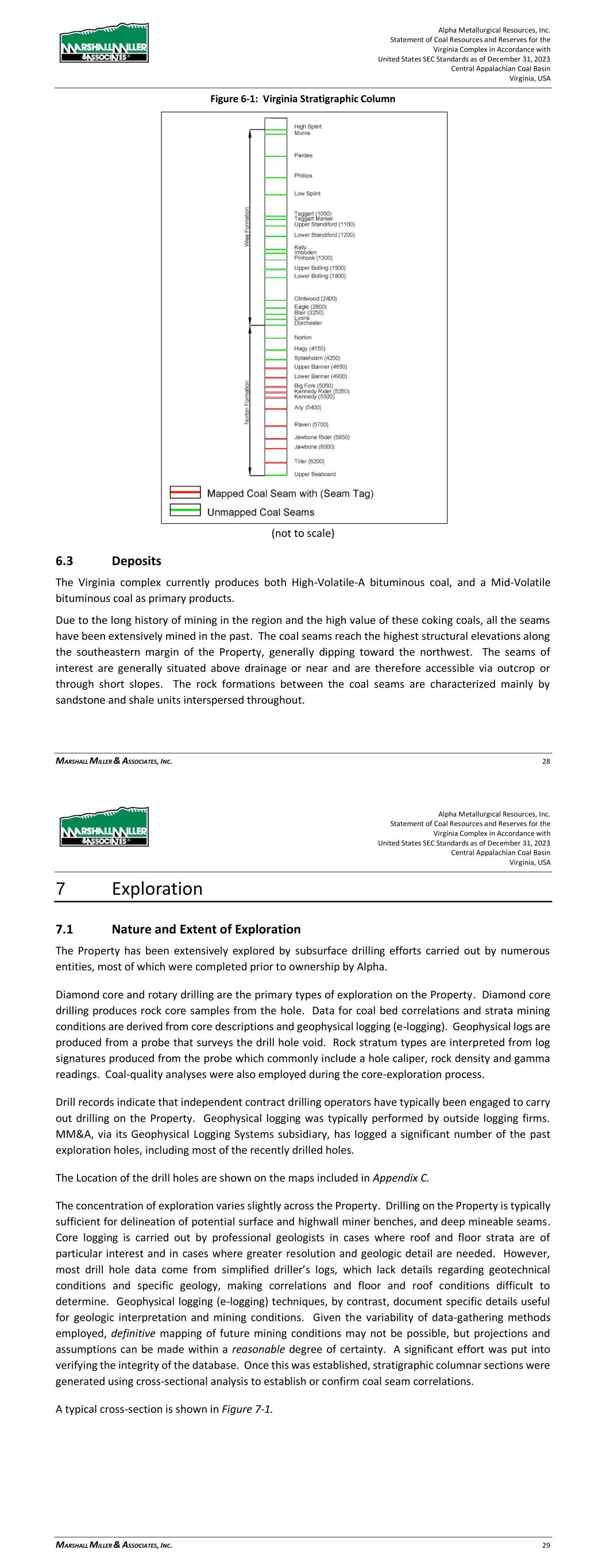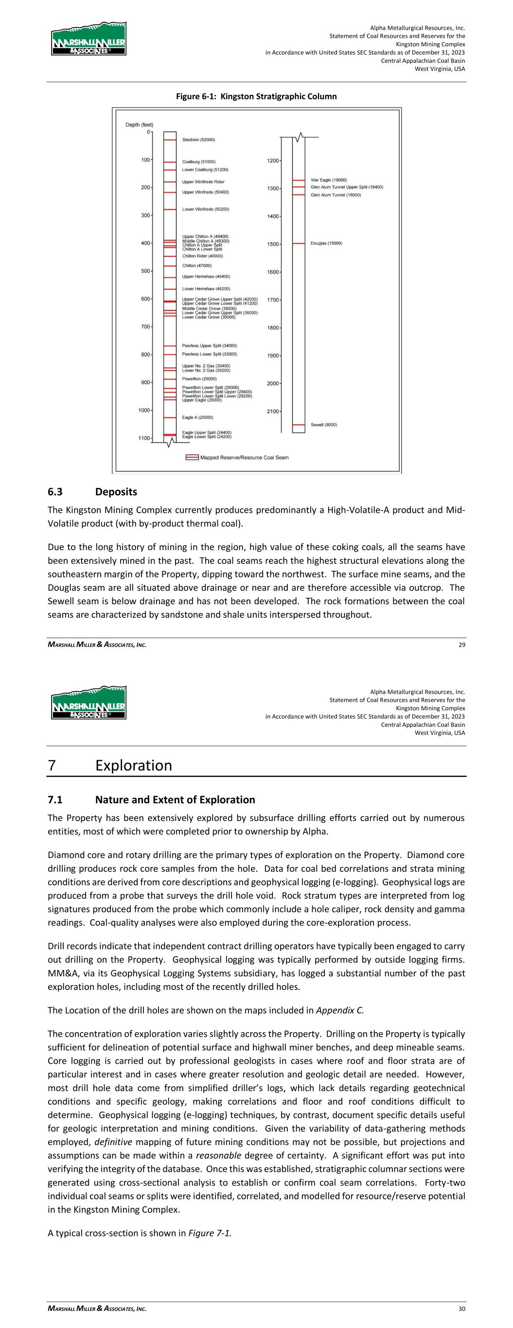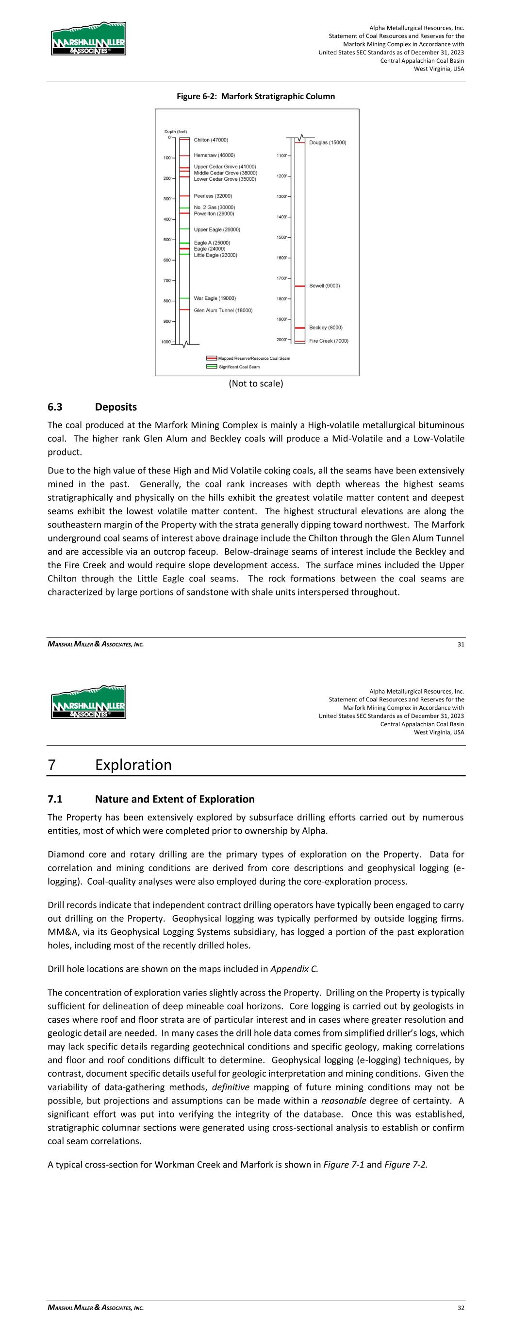 Alpha Metallurgical Resources, Inc. Statement of Coal Resources and Reserves for the Elk Run Underground Complex in Accordance with United States SEC Standards as of December 31, 2023 Central Appalachian Coal Basin West Virginia, USA MARSHALL MILLER & ASSOCIATES, INC. 26 Coal seams with remaining reserve or resource potential evaluated within this TRS include, in descending stratigraphic order the: Upper Cedar Grove, Peerless and Powellton seams. 6.2 Mineralization The generalized stratigraphic columnar section in Figure 6-1 demonstrates the vertical relationship of the principal coal seams and rock formations on the Property. Figure 6-1: Elk Run Stratigraphic Column (not to scale) 6.3 Deposits The coal produced at the Elk Run complex is mainly a High-volatile metallurgical bituminous coal. Due to the high value of these High Volatile coking coals, all the seams have been extensively mined in the past. Generally, the coal rank increases with depth whereas the highest seams stratigraphically and physically on the hills exhibit the greatest volatile matter content and deepest seams exhibit the lowest volatile matter content. The highest structural elevations are along the southeastern margin of the Property with the strata generally dipping toward northwest. The seams of interest are above drainage include the Upper Cedar Grove through the Powellton and are accessible via an outcrop faceup. The Alpha Metallurgical Resources, Inc. Statement of Coal Resources and Reserves for the Elk Run Underground Complex in Accordance with United States SEC Standards as of December 31, 2023 Central Appalachian Coal Basin West Virginia, USA MARSHALL MILLER & ASSOCIATES, INC. 27 rock formations between the coal seams are characterized by large portions of sandstone with shale units interspersed throughout. 7 Exploration 7.1 Nature and Extent of Exploration The Property has been extensively explored by subsurface drilling efforts carried out by numerous entities, most of which were completed prior to ownership by Alpha. Diamond core and rotary drilling are the primary types of exploration on the Property. Data for correlation and mining conditions are derived from core descriptions and geophysical logging (e- logging). Coal-quality analyses were also employed during the core-exploration process. Drill records indicate that independent contract drilling operators have typically been engaged to carry out drilling on the Property. Geophysical logging was typically performed by outside logging firms. MM&A, via its Geophysical Logging Systems subsidiary, has logged a portion of the past exploration holes, including most of the recently drilled holes. The location of the drilling is shown on the maps included in Appendix C. The concentration of exploration varies slightly across the Property. Drilling on the Property is typically sufficient for delineation of deep mineable coal horizons. Core logging is carried out by geologists in cases where roof and floor strata are of particular interest and in cases where greater resolution and geologic detail are needed. In many cases the drill hole data comes from simplified driller’s logs, which may lack specific details regarding geotechnical conditions and specific geology, making correlations and floor and roof conditions difficult to determine. Geophysical logging (e-logging) techniques, by contrast, document specific details useful for geologic interpretation and mining conditions. Given the variability of data-gathering methods, definitive mapping of future mining conditions may not be possible, but projections and assumptions can be made within a reasonable degree of certainty. A significant effort was put into verifying the integrity of the database. Once this was established, stratigraphic columnar sections were generated using cross-sectional analysis to establish or confirm coal seam correlations. A typical cross-section is shown in Figure 7-1.
