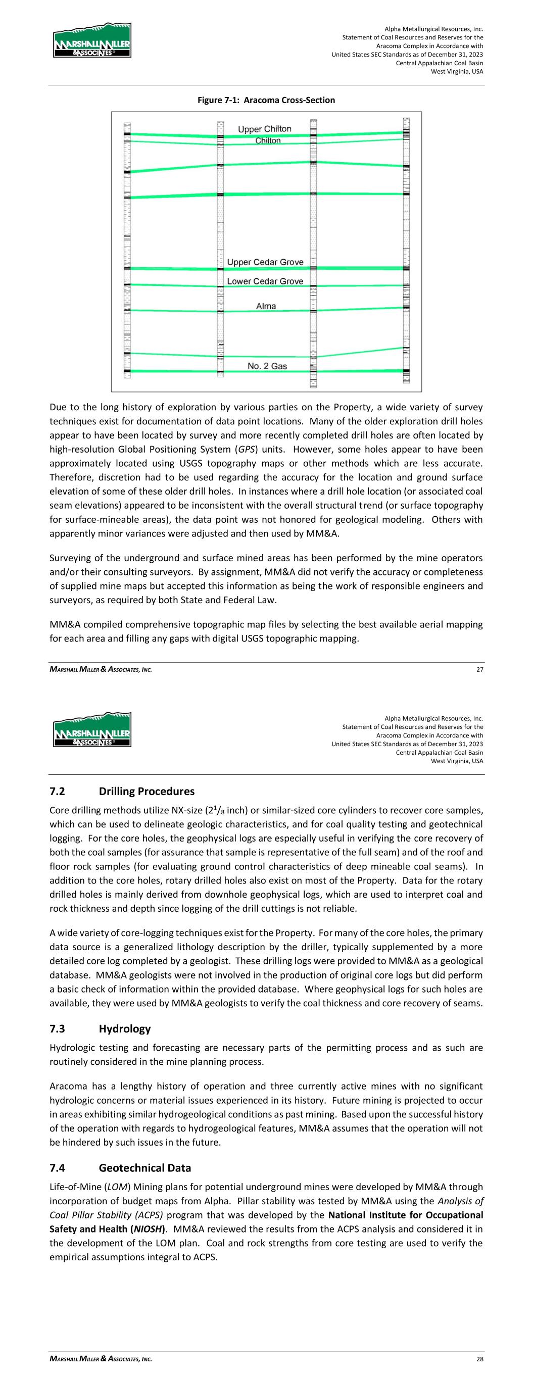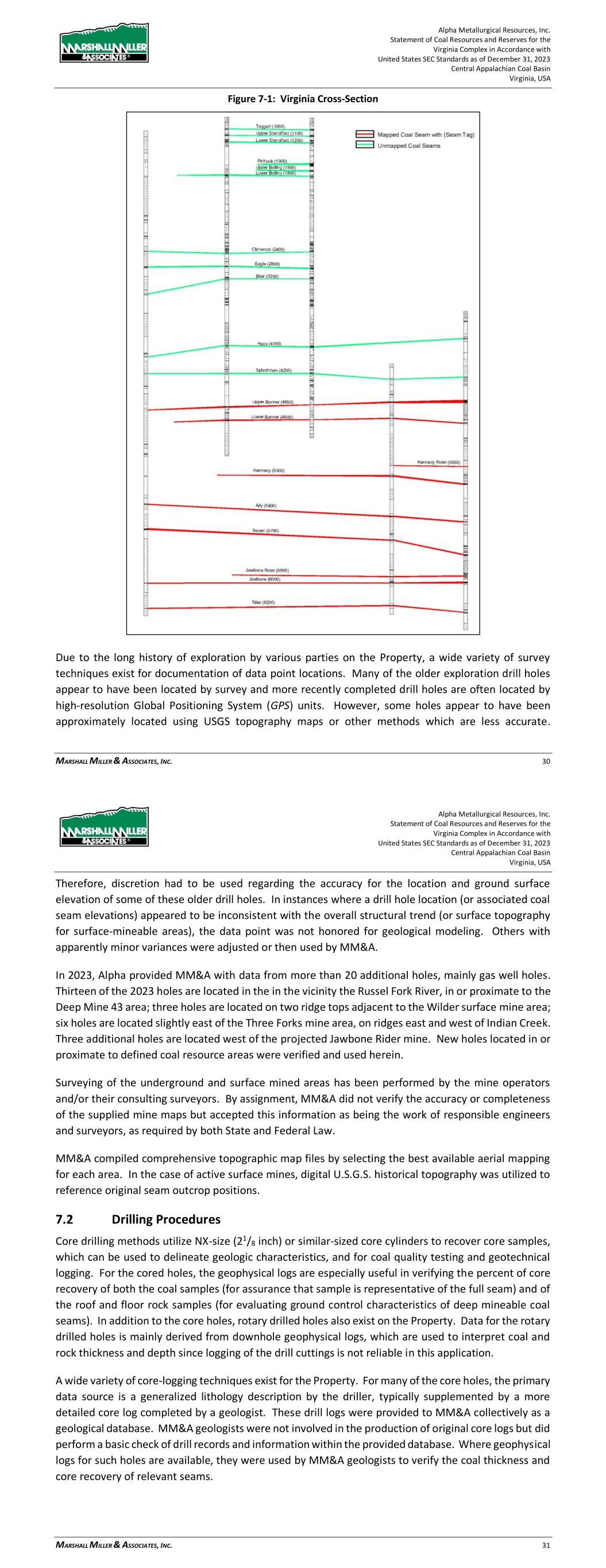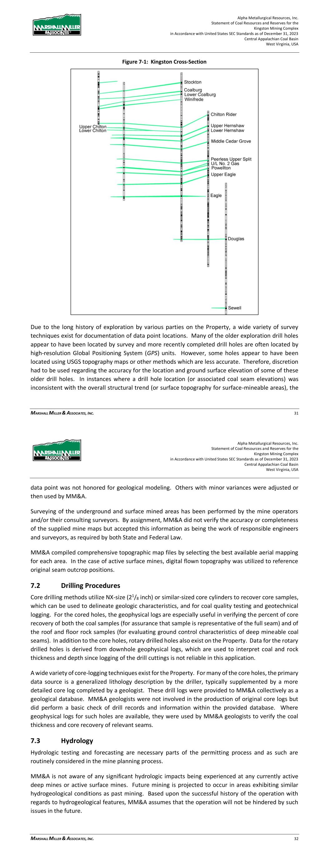 Alpha Metallurgical Resources, Inc. Statement of Coal Resources and Reserves for the Elk Run Underground Complex in Accordance with United States SEC Standards as of December 31, 2023 Central Appalachian Coal Basin West Virginia, USA MARSHALL MILLER & ASSOCIATES, INC. 28 Figure 7-1: Elk Run Cross-Section Due to the long history of exploration by various parties on the Property, a wide variety of survey techniques exist for documentation of data point locations. Many of the older exploration drill holes appear to have been located by traditional land survey methods and more recently completed drill holes are often located by high-resolution Global Positioning System (GPS) units. However, some holes appear to have been approximately located using USGS topography maps or other methods which are Alpha Metallurgical Resources, Inc. Statement of Coal Resources and Reserves for the Elk Run Underground Complex in Accordance with United States SEC Standards as of December 31, 2023 Central Appalachian Coal Basin West Virginia, USA MARSHALL MILLER & ASSOCIATES, INC. 29 less accurate. Therefore, discretion had to be used regarding the accuracy for the location and ground surface elevation of some of these older drill holes. In instances where a drill hole location (or associated coal seam elevations) appeared to be inconsistent with the overall structural trend (or surface topography for surface-mineable areas), the data point was not honored for geological modeling. Others with apparently minor variances were adjusted and then used by MM&A. Surveying of the underground and surface mined areas has been performed by the mine operators and/or their consulting surveyors. By assignment, MM&A did not verify the accuracy or completeness of mine maps supplied by Alpha but accepted this information as being the work of responsible engineers and surveyors, as required by both State and Federal Law. MM&A compiled comprehensive topographic map files by selecting the best available aerial mapping for each area and filling any gaps with digital USGS topographic mapping. 7.2 Drilling Procedures Core drilling methods utilize NX-size (21/8 inch) or similar-sized core cylinders to recover core samples, which can be used to delineate geologic characteristics, and for coal quality testing and geotechnical logging. For the core holes, the geophysical logs are especially useful in verifying the core recovery of both the coal samples (for assurance that sample is representative of the full seam) and of the roof and floor rock samples (for evaluating ground control characteristics of deep mineable coal seams). In addition to the core holes, rotary drilled holes also exist on the Property. Data for the rotary drilled holes is mainly derived from downhole geophysical logs, which are used to interpret coal and rock thickness and depth since logging of the drill cuttings is not reliable. A wide variety of core-logging techniques exist for the Property. For many of the core holes, the primary data source is a generalized lithology description by the driller, more recent holes are generally supplemented by a more detailed core log completed by a geologist. These drilling logs were provided to MM&A as a geological database. MM&A geologists were not involved in the production of original core logs but did perform a basic check of information within the provided database. An audit of the Alpha database was conducted in 2021 by comparing seam depths, coal, and parting thicknesses in the electronic database against the source drill logs and the results were acceptable. Where geophysical logs for such holes are available, they were used by MM&A geologists to verify the coal thickness and core recovery of seams. 7.3 Hydrology Hydrologic testing and forecasting are necessary parts of the permitting process and as such are routinely considered in the mine planning process. Elk Run has a lengthy history of operation with no significant hydrologic concerns or material issues experienced in its history. Future mining is projected to occur in areas exhibiting similar