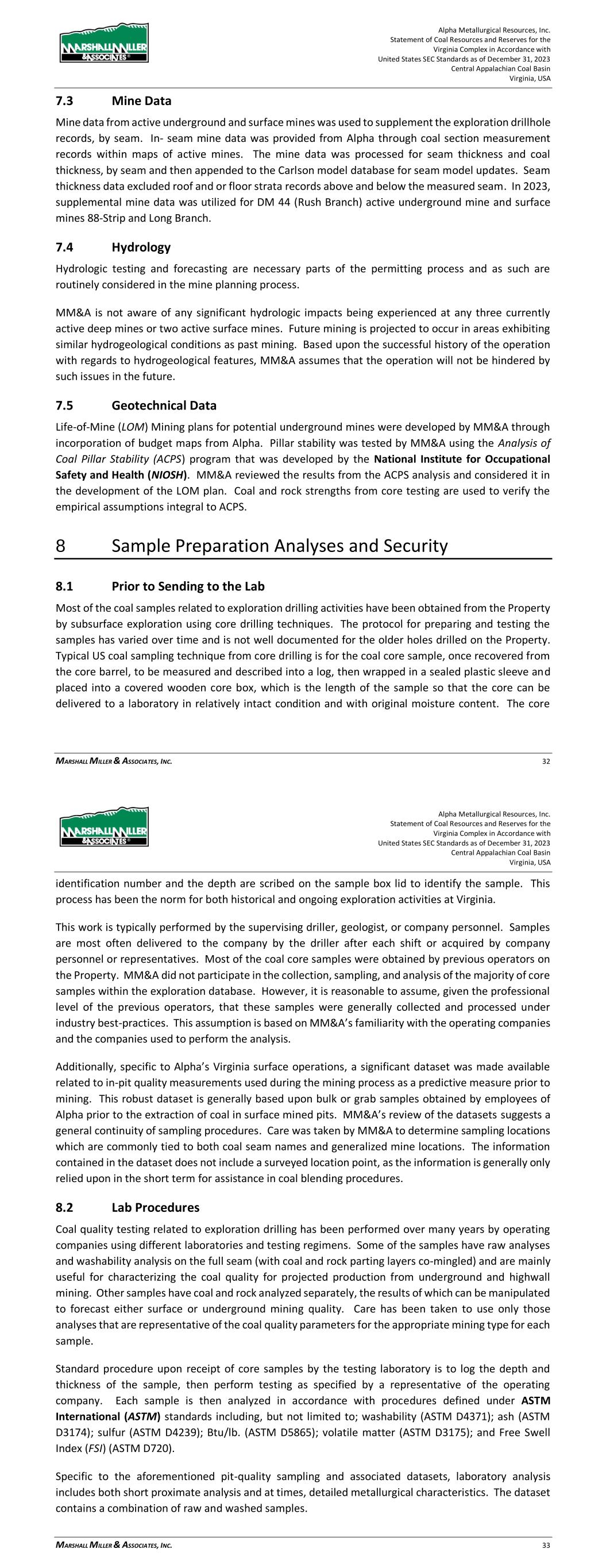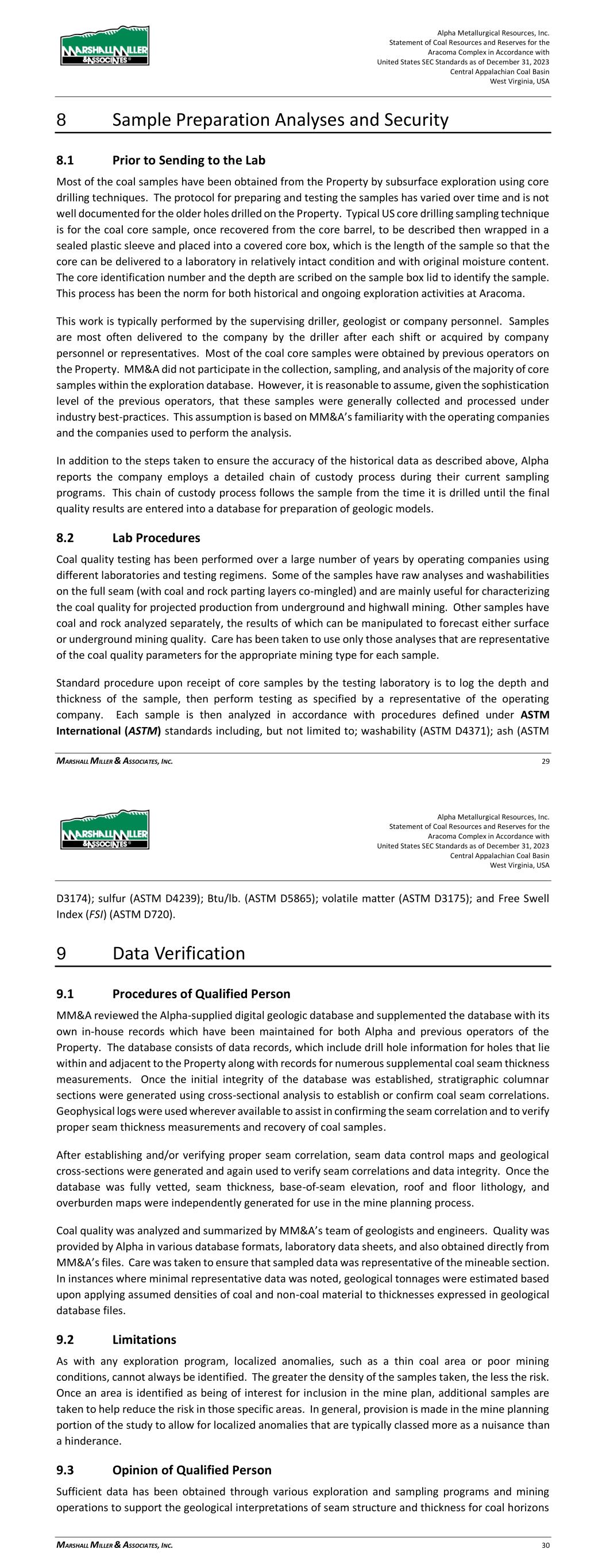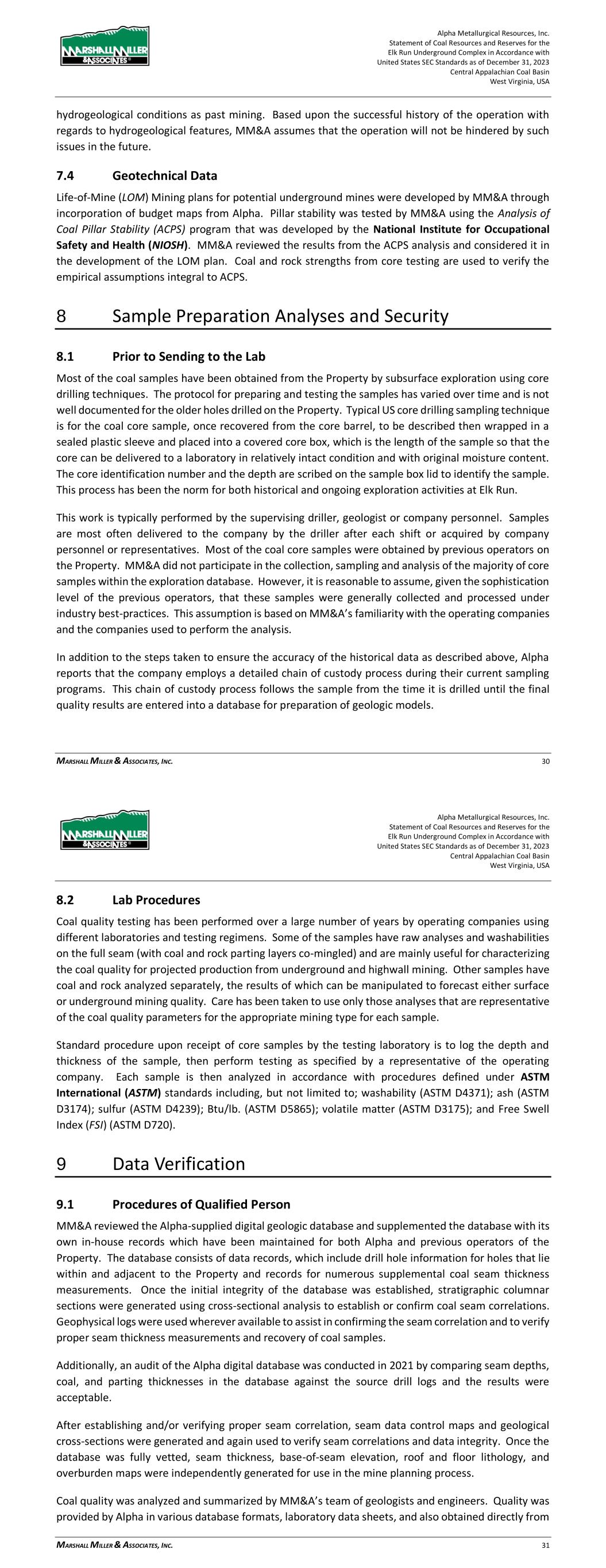 Alpha Metallurgical Resources, Inc. Statement of Coal Resources and Reserves for the Elk Run Underground Complex in Accordance with United States SEC Standards as of December 31, 2023 Central Appalachian Coal Basin West Virginia, USA MARSHALL MILLER & ASSOCIATES, INC. 30 hydrogeological conditions as past mining. Based upon the successful history of the operation with regards to hydrogeological features, MM&A assumes that the operation will not be hindered by such issues in the future. 7.4 Geotechnical Data Life-of-Mine (LOM) Mining plans for potential underground mines were developed by MM&A through incorporation of budget maps from Alpha. Pillar stability was tested by MM&A using the Analysis of Coal Pillar Stability (ACPS) program that was developed by the National Institute for Occupational Safety and Health (NIOSH). MM&A reviewed the results from the ACPS analysis and considered it in the development of the LOM plan. Coal and rock strengths from core testing are used to verify the empirical assumptions integral to ACPS. 8 Sample Preparation Analyses and Security 8.1 Prior to Sending to the Lab Most of the coal samples have been obtained from the Property by subsurface exploration using core drilling techniques. The protocol for preparing and testing the samples has varied over time and is not well documented for the older holes drilled on the Property. Typical US core drilling sampling technique is for the coal core sample, once recovered from the core barrel, to be described then wrapped in a sealed plastic sleeve and placed into a covered core box, which is the length of the sample so that the core can be delivered to a laboratory in relatively intact condition and with original moisture content. The core identification number and the depth are scribed on the sample box lid to identify the sample. This process has been the norm for both historical and ongoing exploration activities at Elk Run. This work is typically performed by the supervising driller, geologist or company personnel. Samples are most often delivered to the company by the driller after each shift or acquired by company personnel or representatives. Most of the coal core samples were obtained by previous operators on the Property. MM&A did not participate in the collection, sampling and analysis of the majority of core samples within the exploration database. However, it is reasonable to assume, given the sophistication level of the previous operators, that these samples were generally collected and processed under industry best-practices. This assumption is based on MM&A’s familiarity with the operating companies and the companies used to perform the analysis. In addition to the steps taken to ensure the accuracy of the historical data as described above, Alpha reports that the company employs a detailed chain of custody process during their current sampling programs. This chain of custody process follows the sample from the time it is drilled until the final quality results are entered into a database for preparation of geologic models. Alpha Metallurgical Resources, Inc. Statement of Coal Resources and Reserves for the Elk Run Underground Complex in Accordance with United States SEC Standards as of December 31, 2023 Central Appalachian Coal Basin West Virginia, USA MARSHALL MILLER & ASSOCIATES, INC. 31 8.2 Lab Procedures Coal quality testing has been performed over a large number of years by operating companies using different laboratories and testing regimens. Some of the samples have raw analyses and washabilities on the full seam (with coal and rock parting layers co-mingled) and are mainly useful for characterizing the coal quality for projected production from underground and highwall mining. Other samples have coal and rock analyzed separately, the results of which can be manipulated to forecast either surface or underground mining quality. Care has been taken to use only those analyses that are representative of the coal quality parameters for the appropriate mining type for each sample. Standard procedure upon receipt of core samples by the testing laboratory is to log the depth and thickness of the sample, then perform testing as specified by a representative of the operating company. Each sample is then analyzed in accordance with procedures defined under ASTM International (ASTM) standards including, but not limited to; washability (ASTM D4371); ash (ASTM D3174); sulfur (ASTM D4239); Btu/lb. (ASTM D5865); volatile matter (ASTM D3175); and Free Swell Index (FSI) (ASTM D720). 9 Data Verification 9.1 Procedures of Qualified Person MM&A reviewed the Alpha-supplied digital geologic database and supplemented the database with its own in-house records which have been maintained for both Alpha and previous operators of the Property. The database consists of data records, which include drill hole information for holes that lie within and adjacent to the Property and records for numerous supplemental coal seam thickness measurements. Once the initial integrity of the database was established, stratigraphic columnar sections were generated using cross-sectional analysis to establish or confirm coal seam correlations. Geophysical logs were used wherever available to assist in confirming the seam correlation and to verify proper seam thickness measurements and recovery of coal samples. Additionally, an audit of the Alpha digital database was conducted in 2021 by comparing seam depths, coal, and parting thicknesses in the database against the source drill logs and the results were acceptable. After establishing and/or verifying proper seam correlation, seam data control maps and geological cross-sections were generated and again used to verify seam correlations and data integrity. Once the database was fully vetted, seam thickness, base-of-seam elevation, roof and floor lithology, and overburden maps were independently generated for use in the mine planning process. Coal quality was analyzed and summarized by MM&