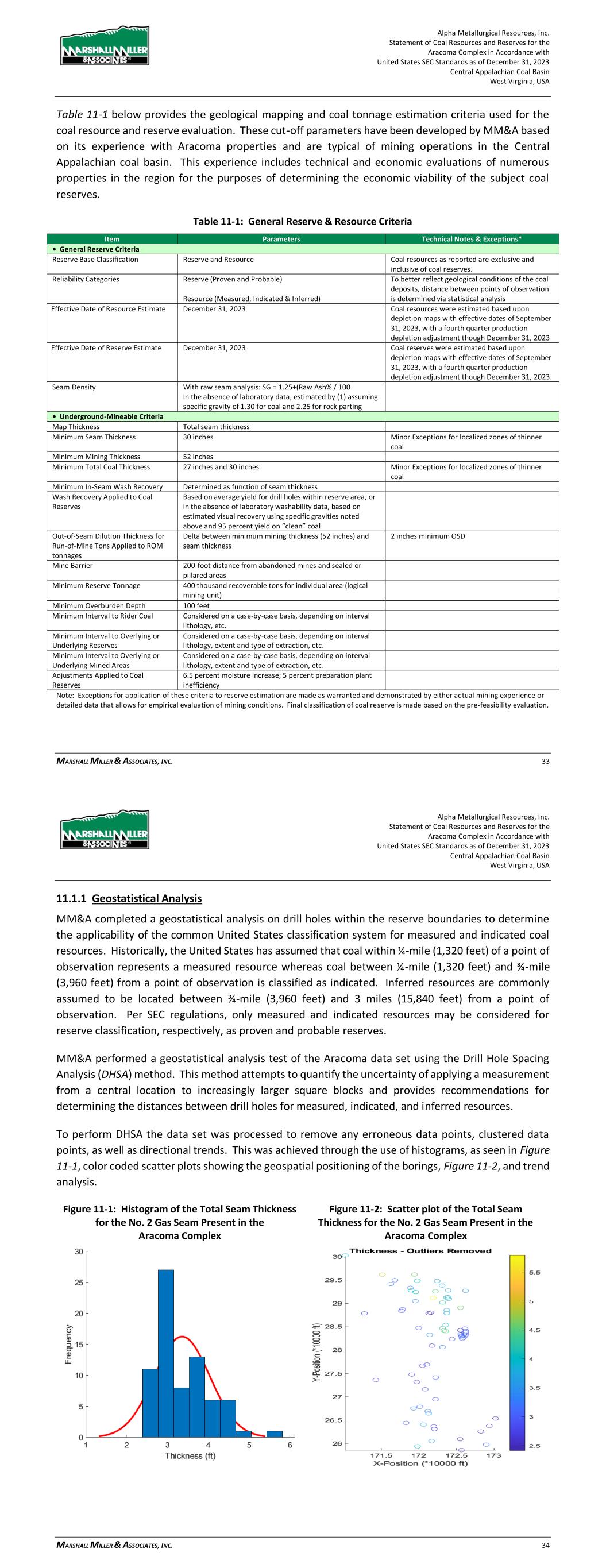 Alpha Metallurgical Resources, Inc. Statement of Coal Resources for the Power Mountain Underground Complex in Accordance with United States SEC Standards as of December 31, 2023 Central Appalachian Coal Basin West Virginia, USA MARSHALL MILLER & ASSOCIATES, INC. 27 Table 11-1: General Resource Evaluation Criteria Item Parameters Technical Notes & Exceptions* • General Reserve Criteria Reserve Classification Resource Coal resources as reported are exclusive of coal reserves (have not been converted to reserve). Reliability Categories Resource (Measured, Indicated & Inferred) To better reflect geological conditions of the coal deposits, distance between points of observation is determined via statistical analysis Measured Classification 0.25 Mile, (1320’) Projection form Measurement Point Based on 11.1.1 Analysis Indicated Classification 0.25 to 0.75 Mile, (1320’ to 3960’) Projection form Measurement Point Based on 11.1.1 Analysis Inferred Classification 0.75 to 3.0 Mile, (3960’ to 15,840) Projection form Measurement Point Based on 11.1.1 Analysis Effective Date of Resource Estimate December 31, 2023 Coal resources were estimated based upon depletion maps as of September 30, 2023, and a fourth quarter 2023 production depletion adjustment. Seam Density - with Raw Seam Analysis 1.25 + (Raw Ash% / 100) Seam Density - without Raw Seam Analysis Estimated by (1) assuming specific gravity of 1.30 for coal and 2.25 for rock parting • Underground-Mineable Criteria Map Thickness Total seam thickness Minimum Seam Thickness 2.5 Feet, 30 inches Minor Exceptions for localized zones of thinner coal Minimum Mining Thickness Not Considered Resource Only Study Minimum Total Coal Thickness 2.5 Feet, 30 inches Minor Exceptions for localized zones of thinner coal Minimum In-Seam Wash Recovery Not Considered Resource Only Study. Wash Recovery Applied to Coal Reserves Not Applicable Resources Reported on an In-Situ Basis Out-of-Seam Dilution Thickness for Run-of-Mine Tons Applied to ROM tonnages Not Considered Mine Barrier Not Considered Minimum Resource Tonnage 400 thousand recoverable tons for individual area (logical mining unit) Minimum Overburden Depth 100 feet Minimum Interval to Rider Coal Considered on a case-by-case basis, depending on interval lithology, etc. Minimum Interval to Overlying or Underlying Reserves Not Applicable Minimum Interval to Overlying or Underlying Mined Areas Not Applicable Adjustments Applied to Coal Resources Not Applicable Resources Reported on an In-Situ Basis 11.1.1 Geostatistical Analysis for Classification MM&A completed a geostatistical analysis on drill holes within the resource boundaries to determine the applicability of the common United States classification system for measured and indicated coal resources. Historically, the United States has assumed that coal within ¼-mile (1,320 feet) of a point of observation represents a measured resource whereas coal between ¼-mile (1,320 feet) and ¾-mile (3,960 feet) from a point of observation is classified as indicated. Inferred resources are commonly assumed to be located between ¾-mile (3,960 feet) and 3 miles (15,840 feet) from a point of observation. Alpha Metallurgical Resources, Inc. Statement of Coal Resources for the Power Mountain Underground Complex in Accordance with United States SEC Standards as of December 31, 2023 Central Appalachian Coal Basin West Virginia, USA MARSHALL MILLER & ASSOCIATES, INC. 28 MM&A performed a geostatistical analysis test of the Powellton seam data set using the Drill Hole Spacing Analysis (DHSA) method. This method attempts to quantify the uncertainty of applying a measurement from a central location to increasingly larger square blocks and provides recommendations for determining the distances between drill holes for measured, indicated, and inferred resources. To perform DHSA the data set was processed to remove any erroneous data points, clustered data points, as well as directional trends. This was achieved using histograms, as seen in Figure 11-1, color coded scatter plots showing the geospatial positioning of the borings, Figure 11-2, and trend analysis. Figure 11-1: Histogram of the Total Seam Thickness for the Powellton Seam Present in the Property Figure 11-2: Scatter Plot of the Total Seam Thickness for the Powellton Seam Present in the Property Following the completion of data processing, a variogram of the data set was created, Figure 11-3. The variogram plots average square difference against the separation distance between the data pairs. The separation distance is broken up into separate bins defined by a uniform lag distance (e.g., for a lag distance of 499 feet the bins would be 0 – 499 feet, 502 – 1,000 feet, etc.). Each pair of data points that are less than one lag distance apart are reported in the first bin. If the data pair is further apart than one lag distance but less than two lag distances apart, then the variance is reported in the second bin. The numerical average for differences reported for each bin is then plotted on the variogram. Care was taken to define the lag distance in such a way as to not overestimate any nugget effect present in the data set. Lastly, modeled equations, often spherical, gaussian, or exponential, are applied to the variogram to represent the data set across a continuous spectrum.