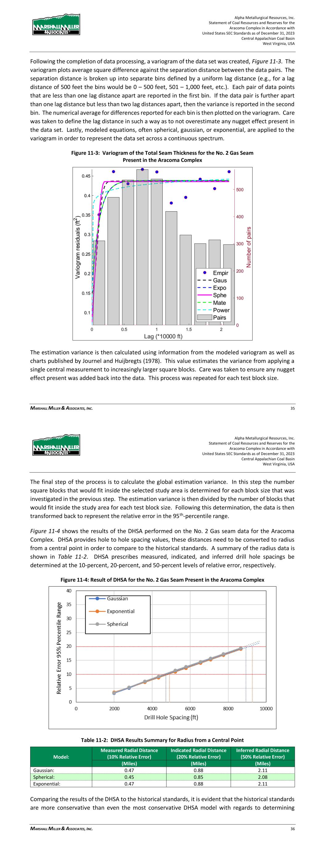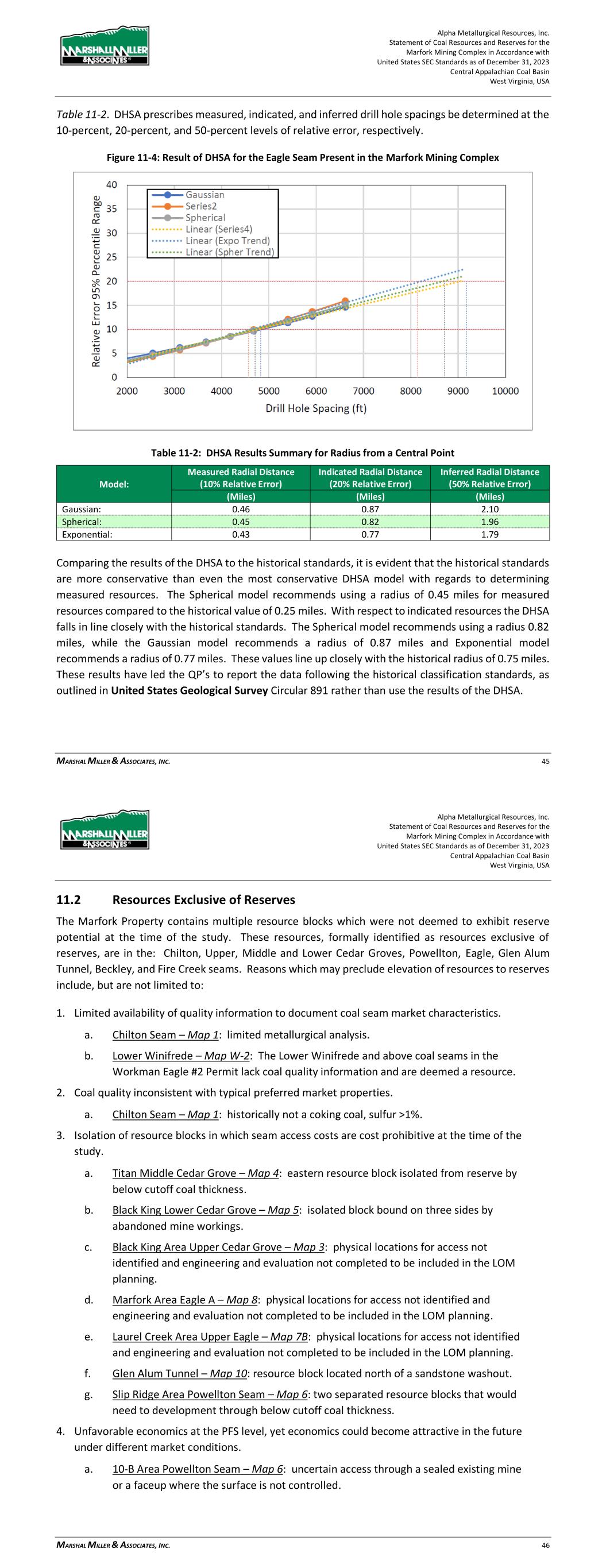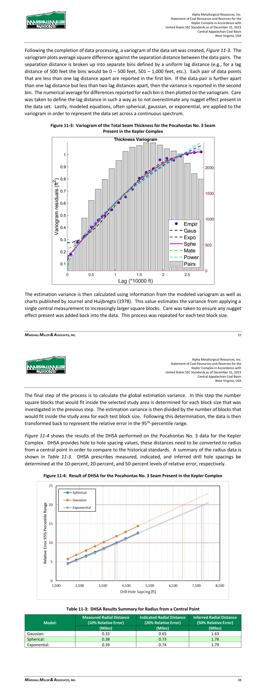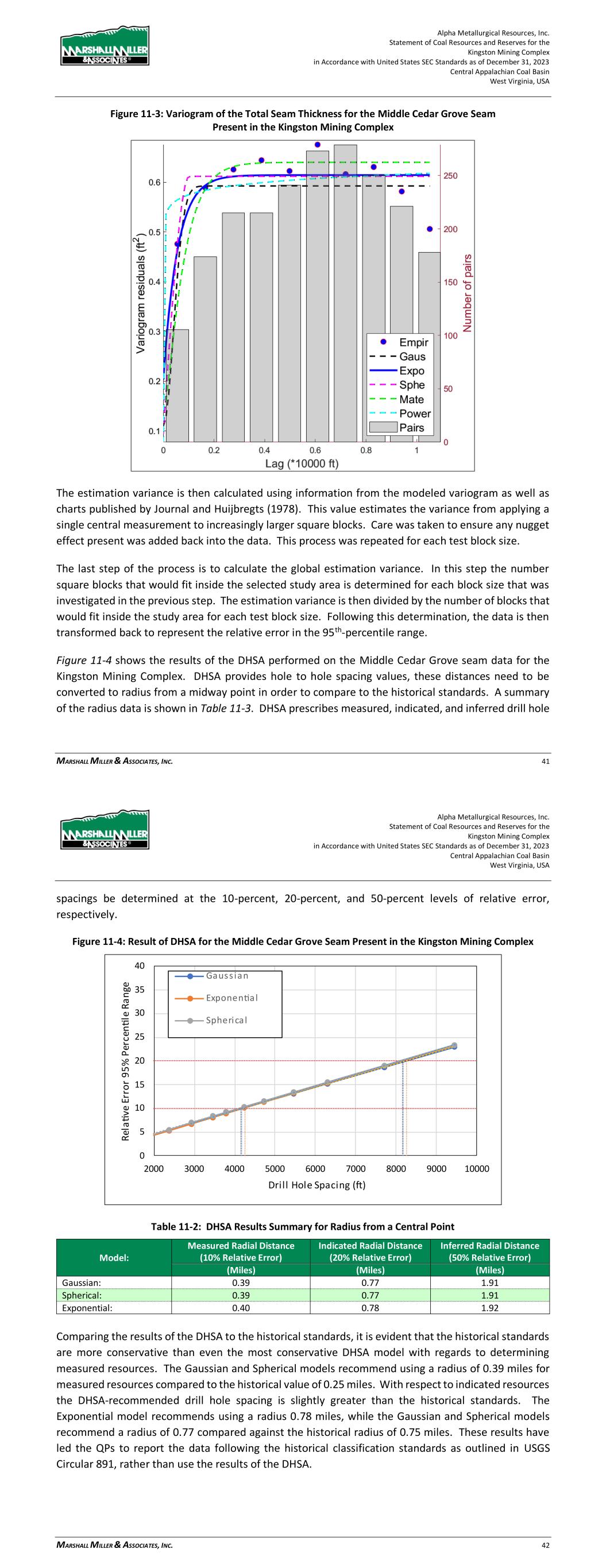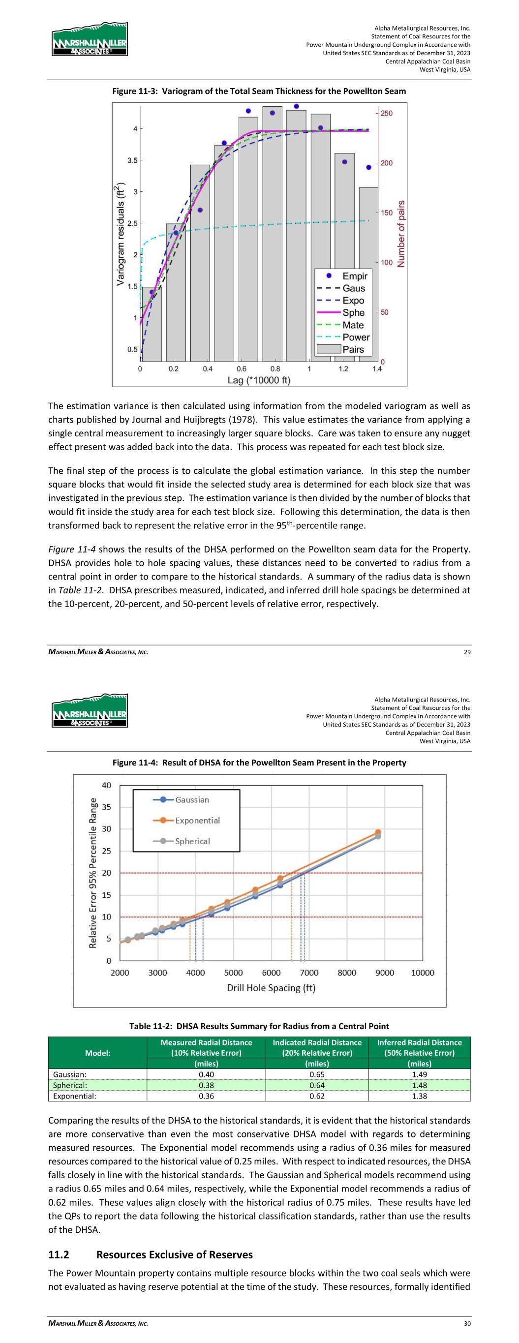 Alpha Metallurgical Resources, Inc. Statement of Coal Resources for the Power Mountain Underground Complex in Accordance with United States SEC Standards as of December 31, 2023 Central Appalachian Coal Basin West Virginia, USA MARSHALL MILLER & ASSOCIATES, INC. 29 Figure 11-3: Variogram of the Total Seam Thickness for the Powellton Seam The estimation variance is then calculated using information from the modeled variogram as well as charts published by Journal and Huijbregts (1978). This value estimates the variance from applying a single central measurement to increasingly larger square blocks. Care was taken to ensure any nugget effect present was added back into the data. This process was repeated for each test block size. The final step of the process is to calculate the global estimation variance. In this step the number square blocks that would fit inside the selected study area is determined for each block size that was investigated in the previous step. The estimation variance is then divided by the number of blocks that would fit inside the study area for each test block size. Following this determination, the data is then transformed back to represent the relative error in the 95th-percentile range. Figure 11-4 shows the results of the DHSA performed on the Powellton seam data for the Property. DHSA provides hole to hole spacing values, these distances need to be converted to radius from a central point in order to compare to the historical standards. A summary of the radius data is shown in Table 11-2. DHSA prescribes measured, indicated, and inferred drill hole spacings be determined at the 10-percent, 20-percent, and 50-percent levels of relative error, respectively. Alpha Metallurgical Resources, Inc. Statement of Coal Resources for the Power Mountain Underground Complex in Accordance with United States SEC Standards as of December 31, 2023 Central Appalachian Coal Basin West Virginia, USA MARSHALL MILLER & ASSOCIATES, INC. 30 Figure 11-4: Result of DHSA for the Powellton Seam Present in the Property Table 11-2: DHSA Results Summary for Radius from a Central Point Model: Measured Radial Distance (10% Relative Error) Indicated Radial Distance (20% Relative Error) Inferred Radial Distance (50% Relative Error) (miles) (miles) (miles) Gaussian: 0.40 0.65 1.49 Spherical: 0.38 0.64 1.48 Exponential: 0.36 0.62 1.38 Comparing the results of the DHSA to the historical standards, it is evident that the historical standards are more conservative than even the most conservative DHSA model with regards to determining measured resources. The Exponential model recommends using a radius of 0.36 miles for measured resources compared to the historical value of 0.25 miles. With respect to indicated resources, the DHSA falls closely in line with the historical standards. The Gaussian and Spherical models recommend using a radius 0.65 miles and 0.64 miles, respectively, while the Exponential model recommends a radius of 0.62 miles. These values align closely with the historical radius of 0.75 miles. These results have led the QPs to report the data following the historical classification standards, rather than use the results of the DHSA. 11.2 Resources Exclusive of Reserves The Power Mountain property contains multiple resource blocks within the two coal seals which were not evaluated as having reserve potential at the time of the study. These resources, formally identified