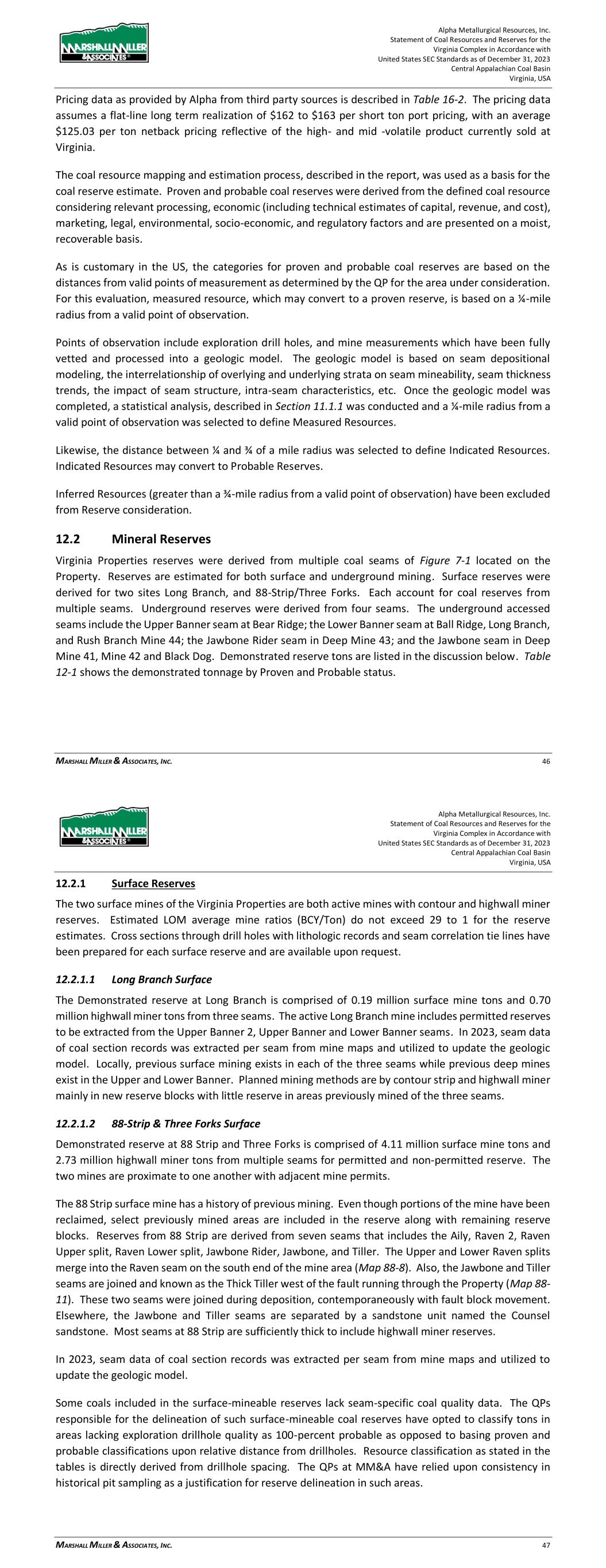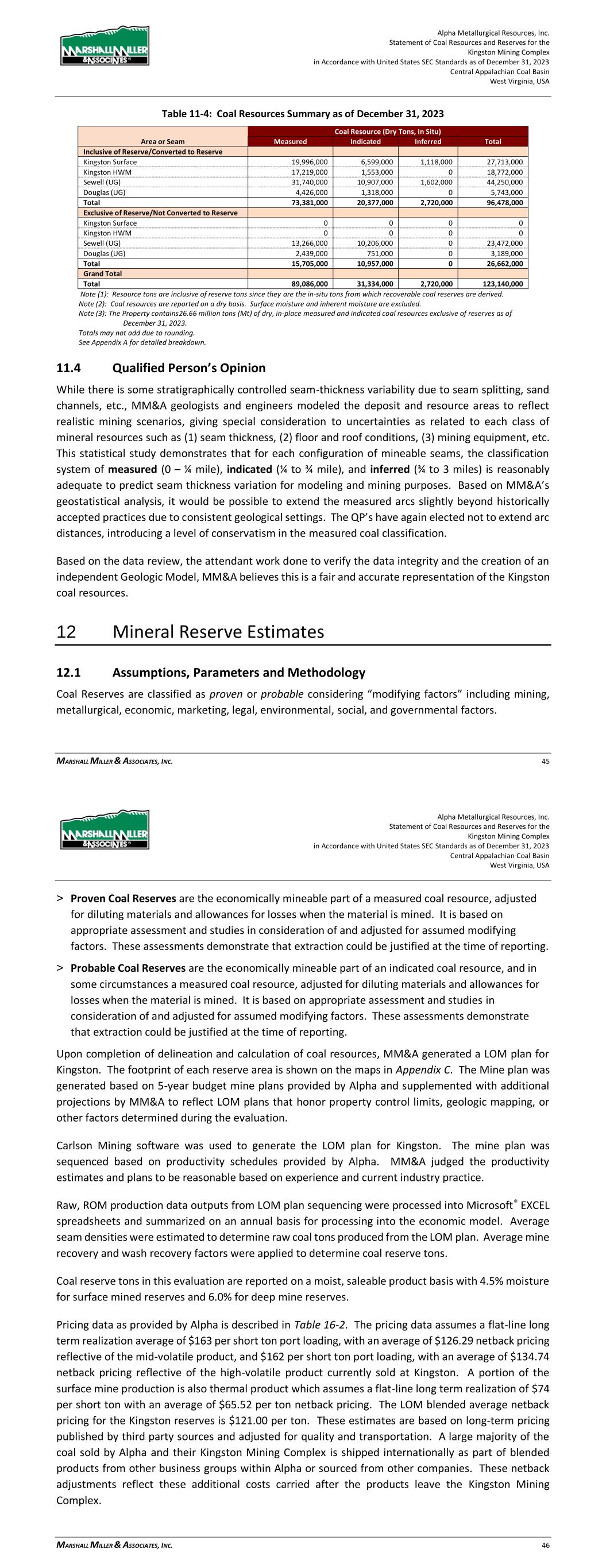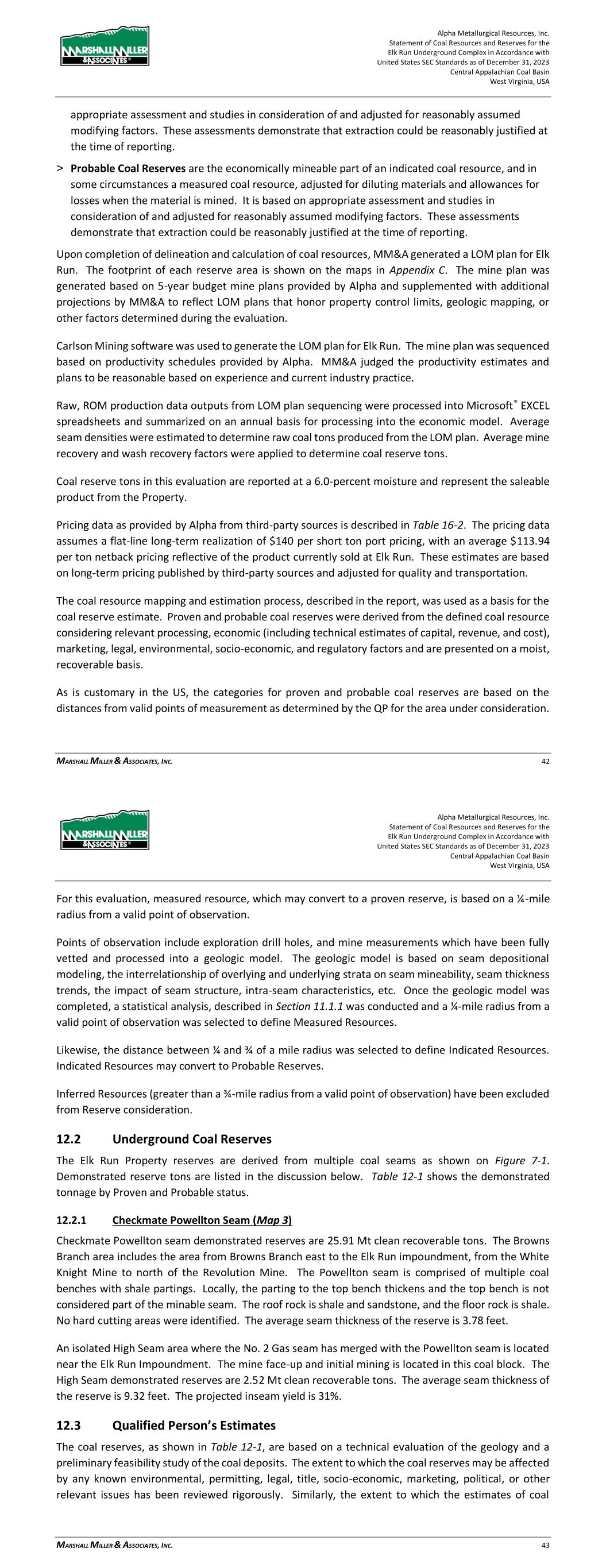 Alpha Metallurgical Resources, Inc. Statement of Coal Resources and Reserves for the Elk Run Underground Complex in Accordance with United States SEC Standards as of December 31, 2023 Central Appalachian Coal Basin West Virginia, USA MARSHALL MILLER & ASSOCIATES, INC. 42 appropriate assessment and studies in consideration of and adjusted for reasonably assumed modifying factors. These assessments demonstrate that extraction could be reasonably justified at the time of reporting. > Probable Coal Reserves are the economically mineable part of an indicated coal resource, and in some circumstances a measured coal resource, adjusted for diluting materials and allowances for losses when the material is mined. It is based on appropriate assessment and studies in consideration of and adjusted for reasonably assumed modifying factors. These assessments demonstrate that extraction could be reasonably justified at the time of reporting. Upon completion of delineation and calculation of coal resources, MM&A generated a LOM plan for Elk Run. The footprint of each reserve area is shown on the maps in Appendix C. The mine plan was generated based on 5-year budget mine plans provided by Alpha and supplemented with additional projections by MM&A to reflect LOM plans that honor property control limits, geologic mapping, or other factors determined during the evaluation. Carlson Mining software was used to generate the LOM plan for Elk Run. The mine plan was sequenced based on productivity schedules provided by Alpha. MM&A judged the productivity estimates and plans to be reasonable based on experience and current industry practice. Raw, ROM production data outputs from LOM plan sequencing were processed into Microsoft® EXCEL spreadsheets and summarized on an annual basis for processing into the economic model. Average seam densities were estimated to determine raw coal tons produced from the LOM plan. Average mine recovery and wash recovery factors were applied to determine coal reserve tons. Coal reserve tons in this evaluation are reported at a 6.0-percent moisture and represent the saleable product from the Property. Pricing data as provided by Alpha from third-party sources is described in Table 16-2. The pricing data assumes a flat-line long-term realization of $140 per short ton port pricing, with an average $113.94 per ton netback pricing reflective of the product currently sold at Elk Run. These estimates are based on long-term pricing published by third-party sources and adjusted for quality and transportation. The coal resource mapping and estimation process, described in the report, was used as a basis for the coal reserve estimate. Proven and probable coal reserves were derived from the defined coal resource considering relevant processing, economic (including technical estimates of capital, revenue, and cost), marketing, legal, environmental, socio-economic, and regulatory factors and are presented on a moist, recoverable basis. As is customary in the US, the categories for proven and probable coal reserves are based on the distances from valid points of measurement as determined by the QP for the area under consideration. Alpha Metallurgical Resources, Inc. Statement of Coal Resources and Reserves for the Elk Run Underground Complex in Accordance with United States SEC Standards as of December 31, 2023 Central Appalachian Coal Basin West Virginia, USA MARSHALL MILLER & ASSOCIATES, INC. 43 For this evaluation, measured resource, which may convert to a proven reserve, is based on a ¼-mile radius from a valid point of observation. Points of observation include exploration drill holes, and mine measurements which have been fully vetted and processed into a geologic model. The geologic model is based on seam depositional modeling, the interrelationship of overlying and underlying strata on seam mineability, seam thickness trends, the impact of seam structure, intra-seam characteristics, etc. Once the geologic model was completed, a statistical analysis, described in Section 11.1.1 was conducted and a ¼-mile radius from a valid point of observation was selected to define Measured Resources. Likewise, the distance between ¼ and ¾ of a mile radius was selected to define Indicated Resources. Indicated Resources may convert to Probable Reserves. Inferred Resources (greater than a ¾-mile radius from a valid point of observation) have been excluded from Reserve consideration. 12.2 Underground Coal Reserves The Elk Run Property reserves are derived from multiple coal seams as shown on Figure 7-1. Demonstrated reserve tons are listed in the discussion below. Table 12-1 shows the demonstrated tonnage by Proven and Probable status. 12.2.1 Checkmate Powellton Seam (Map 3) Checkmate Powellton seam demonstrated reserves are 25.91 Mt clean recoverable tons. The Browns Branch area includes the area from Browns Branch east to the Elk Run impoundment, from the White Knight Mine to north of the Revolution Mine. The Powellton seam is comprised of multiple coal benches with shale partings. Locally, the parting to the top bench thickens and the top bench is not considered part of the minable seam. The roof rock is shale and sandstone, and the floor rock is shale. No hard cutting areas were identified. The average seam thickness of the reserve is 3.78 feet. An isolated High Seam area where the No. 2 Gas seam has merged with the Powellton seam is located near the Elk Run Impoundment. The mine face-up and initial mining is located in this coal block. The High Seam demonstrated reserves are 2.52 Mt clean recoverable tons. The average seam thickness of the reserve is 9.32 feet. The projected inseam yield is 31%. 12.3 Qualified Person’s Estimates The coal reserves, as shown in Table 12-1, are based on a technical evaluation of the geology and a preliminary feasibility study of the coal deposits. The extent to which the coal reserves may be affected by any known environmental, permitting, legal, title, socio-economic