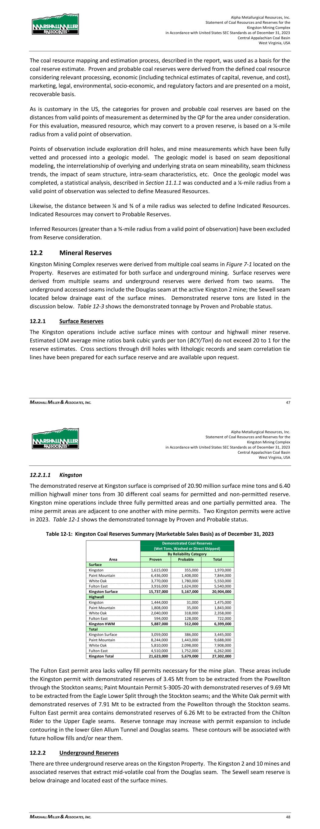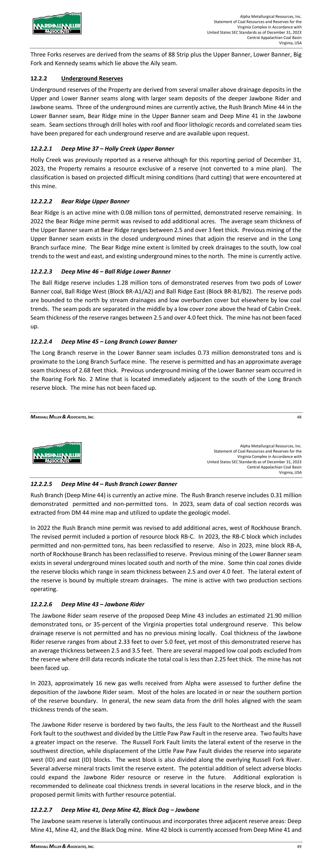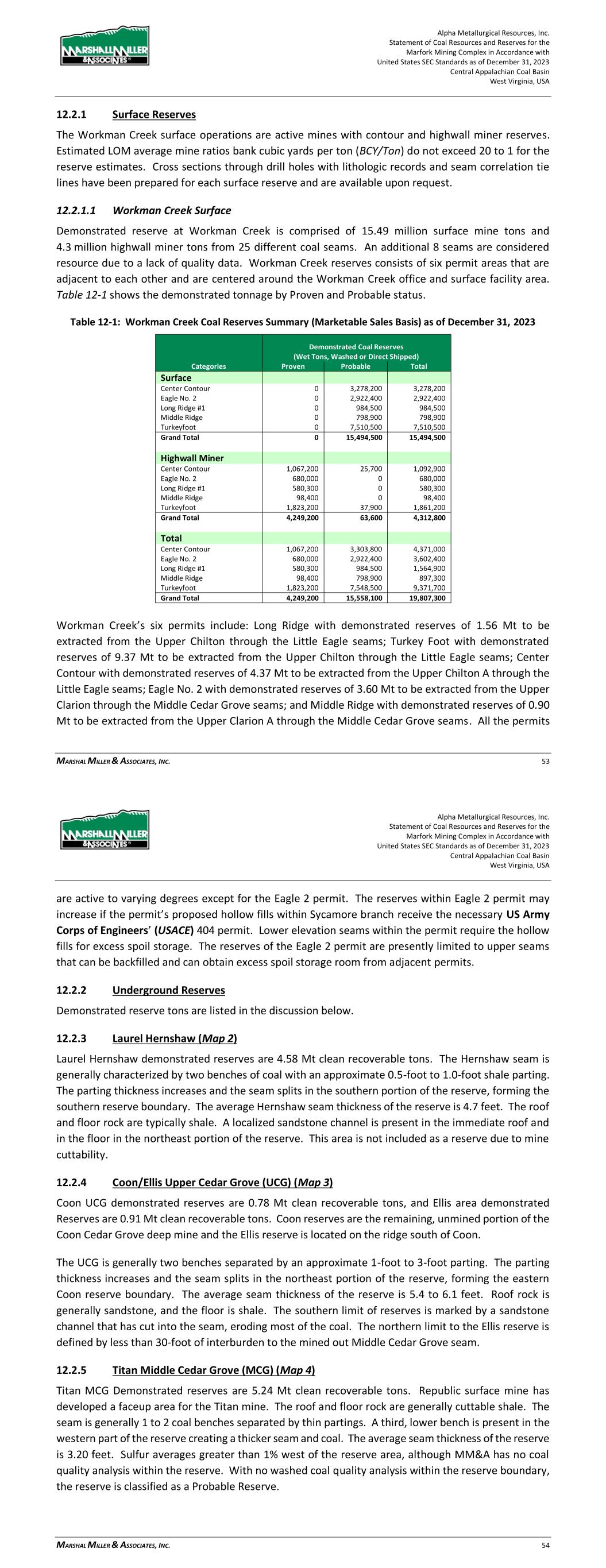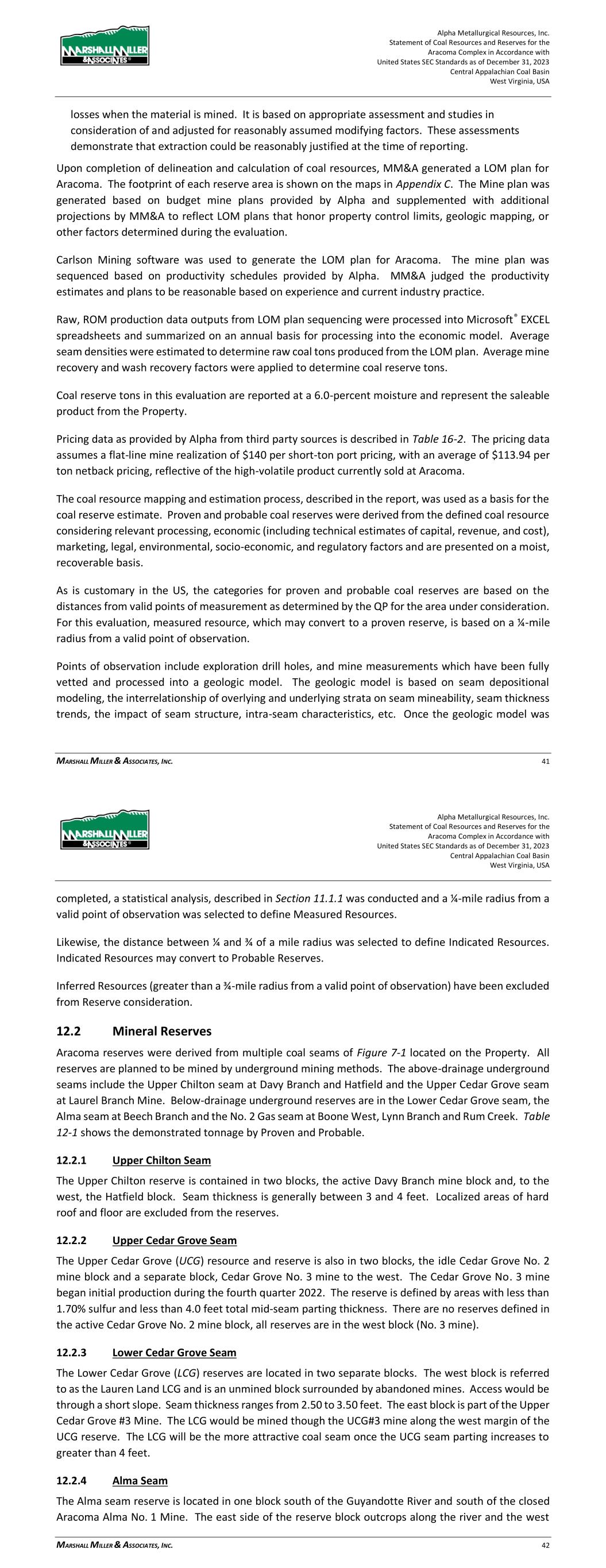 Alpha Metallurgical Resources, Inc. Statement of Coal Resources and Reserves for the Elk Run Underground Complex in Accordance with United States SEC Standards as of December 31, 2023 Central Appalachian Coal Basin West Virginia, USA MARSHALL MILLER & ASSOCIATES, INC. 42 appropriate assessment and studies in consideration of and adjusted for reasonably assumed modifying factors. These assessments demonstrate that extraction could be reasonably justified at the time of reporting. > Probable Coal Reserves are the economically mineable part of an indicated coal resource, and in some circumstances a measured coal resource, adjusted for diluting materials and allowances for losses when the material is mined. It is based on appropriate assessment and studies in consideration of and adjusted for reasonably assumed modifying factors. These assessments demonstrate that extraction could be reasonably justified at the time of reporting. Upon completion of delineation and calculation of coal resources, MM&A generated a LOM plan for Elk Run. The footprint of each reserve area is shown on the maps in Appendix C. The mine plan was generated based on 5-year budget mine plans provided by Alpha and supplemented with additional projections by MM&A to reflect LOM plans that honor property control limits, geologic mapping, or other factors determined during the evaluation. Carlson Mining software was used to generate the LOM plan for Elk Run. The mine plan was sequenced based on productivity schedules provided by Alpha. MM&A judged the productivity estimates and plans to be reasonable based on experience and current industry practice. Raw, ROM production data outputs from LOM plan sequencing were processed into Microsoft® EXCEL spreadsheets and summarized on an annual basis for processing into the economic model. Average seam densities were estimated to determine raw coal tons produced from the LOM plan. Average mine recovery and wash recovery factors were applied to determine coal reserve tons. Coal reserve tons in this evaluation are reported at a 6.0-percent moisture and represent the saleable product from the Property. Pricing data as provided by Alpha from third-party sources is described in Table 16-2. The pricing data assumes a flat-line long-term realization of $140 per short ton port pricing, with an average $113.94 per ton netback pricing reflective of the product currently sold at Elk Run. These estimates are based on long-term pricing published by third-party sources and adjusted for quality and transportation. The coal resource mapping and estimation process, described in the report, was used as a basis for the coal reserve estimate. Proven and probable coal reserves were derived from the defined coal resource considering relevant processing, economic (including technical estimates of capital, revenue, and cost), marketing, legal, environmental, socio-economic, and regulatory factors and are presented on a moist, recoverable basis. As is customary in the US, the categories for proven and probable coal reserves are based on the distances from valid points of measurement as determined by the QP for the area under consideration. Alpha Metallurgical Resources, Inc. Statement of Coal Resources and Reserves for the Elk Run Underground Complex in Accordance with United States SEC Standards as of December 31, 2023 Central Appalachian Coal Basin West Virginia, USA MARSHALL MILLER & ASSOCIATES, INC. 43 For this evaluation, measured resource, which may convert to a proven reserve, is based on a ¼-mile radius from a valid point of observation. Points of observation include exploration drill holes, and mine measurements which have been fully vetted and processed into a geologic model. The geologic model is based on seam depositional modeling, the interrelationship of overlying and underlying strata on seam mineability, seam thickness trends, the impact of seam structure, intra-seam characteristics, etc. Once the geologic model was completed, a statistical analysis, described in Section 11.1.1 was conducted and a ¼-mile radius from a valid point of observation was selected to define Measured Resources. Likewise, the distance between ¼ and ¾ of a mile radius was selected to define Indicated Resources. Indicated Resources may convert to Probable Reserves. Inferred Resources (greater than a ¾-mile radius from a valid point of observation) have been excluded from Reserve consideration. 12.2 Underground Coal Reserves The Elk Run Property reserves are derived from multiple coal seams as shown on Figure 7-1. Demonstrated reserve tons are listed in the discussion below. Table 12-1 shows the demonstrated tonnage by Proven and Probable status. 12.2.1 Checkmate Powellton Seam (Map 3) Checkmate Powellton seam demonstrated reserves are 25.91 Mt clean recoverable tons. The Browns Branch area includes the area from Browns Branch east to the Elk Run impoundment, from the White Knight Mine to north of the Revolution Mine. The Powellton seam is comprised of multiple coal benches with shale partings. Locally, the parting to the top bench thickens and the top bench is not considered part of the minable seam. The roof rock is shale and sandstone, and the floor rock is shale. No hard cutting areas were identified. The average seam thickness of the reserve is 3.78 feet. An isolated High Seam area where the No. 2 Gas seam has merged with the Powellton seam is located near the Elk Run Impoundment. The mine face-up and initial mining is located in this coal block. The High Seam demonstrated reserves are 2.52 Mt clean recoverable tons. The average seam thickness of the reserve is 9.32 feet. The projected inseam yield is 31%. 12.3 Qualified Person’s Estimates The coal reserves, as shown in Table 12-1, are based on a technical evaluation of the geology and a preliminary feasibility study of the coal deposits. The extent to which the coal reserves may be affected by any known environmental, permitting, legal, title, socio-economic