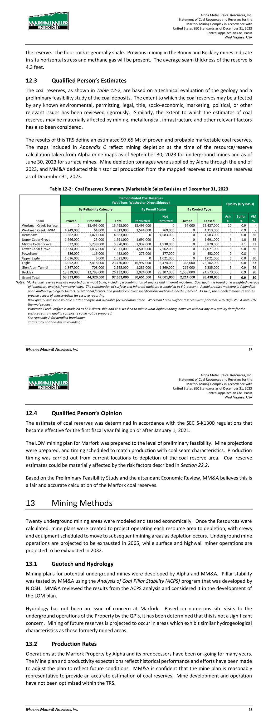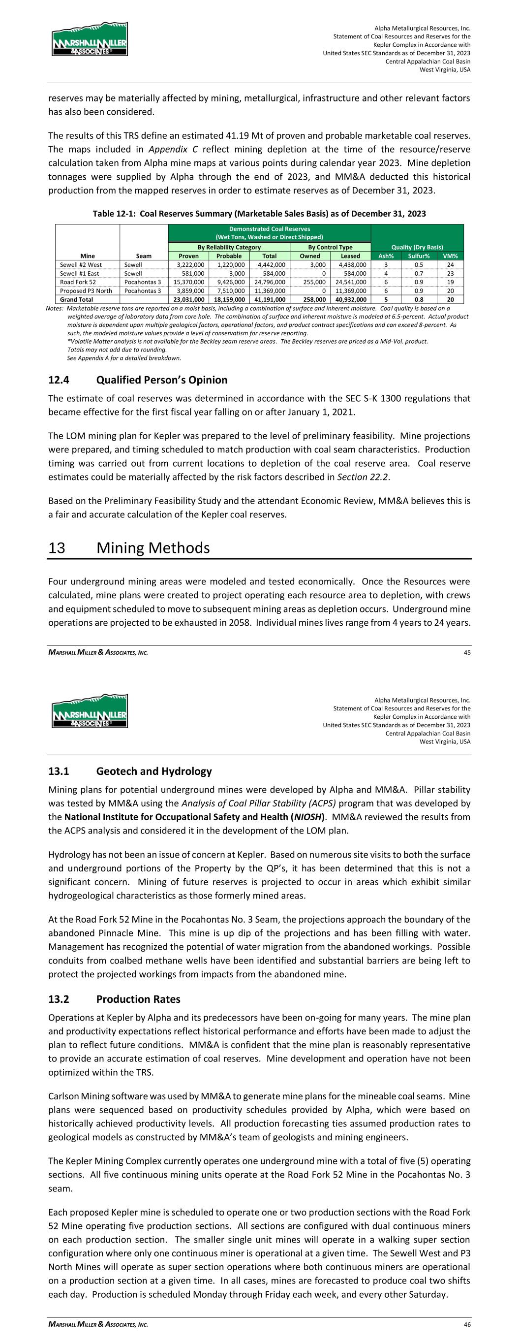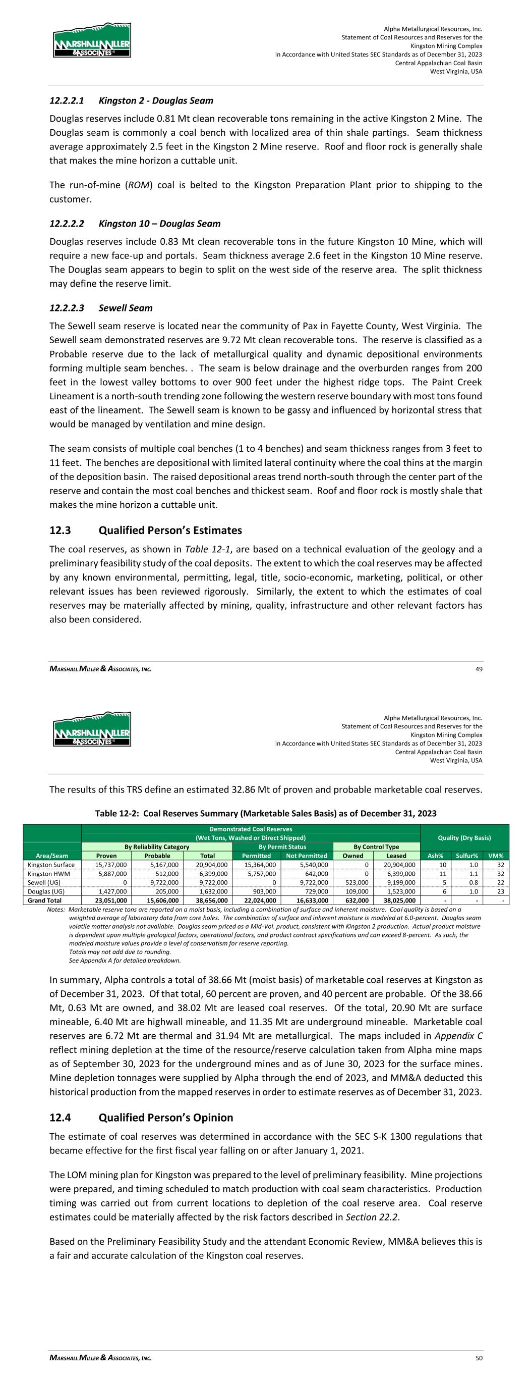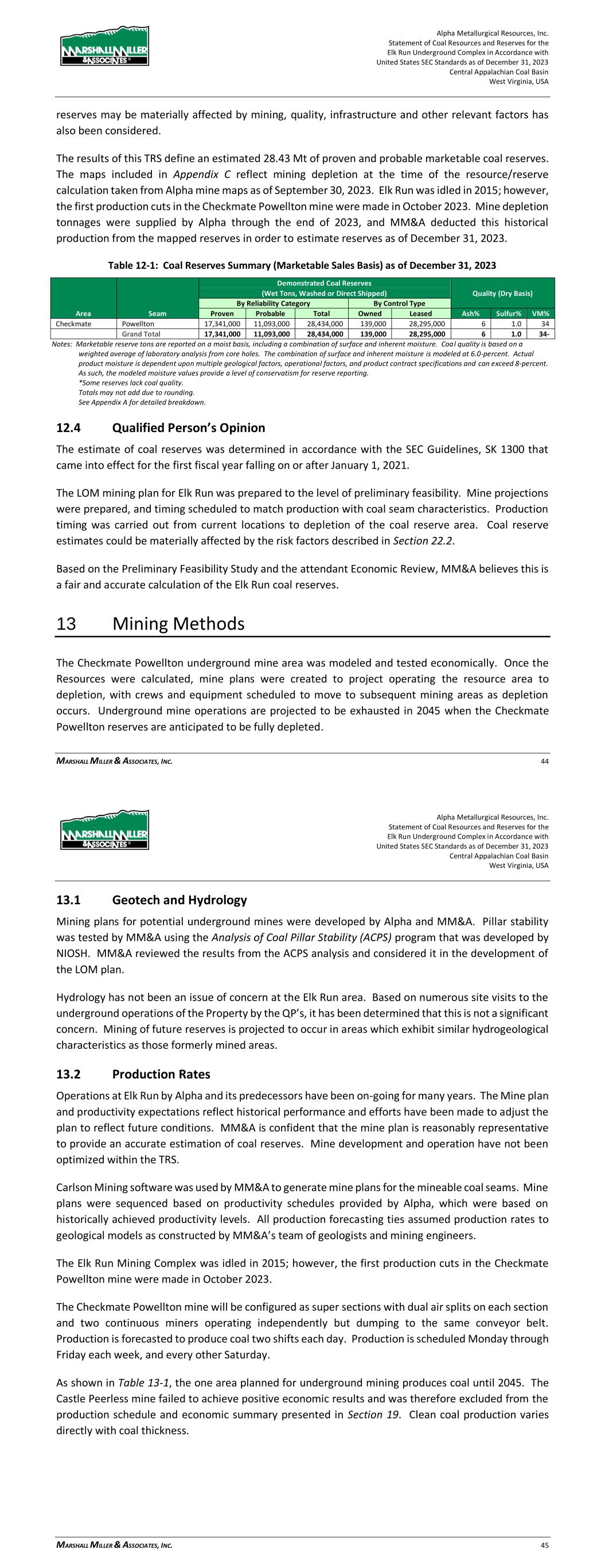 Alpha Metallurgical Resources, Inc. Statement of Coal Resources and Reserves for the Elk Run Underground Complex in Accordance with United States SEC Standards as of December 31, 2023 Central Appalachian Coal Basin West Virginia, USA MARSHALL MILLER & ASSOCIATES, INC. 44 reserves may be materially affected by mining, quality, infrastructure and other relevant factors has also been considered. The results of this TRS define an estimated 28.43 Mt of proven and probable marketable coal reserves. The maps included in Appendix C reflect mining depletion at the time of the resource/reserve calculation taken from Alpha mine maps as of September 30, 2023. Elk Run was idled in 2015; however, the first production cuts in the Checkmate Powellton mine were made in October 2023. Mine depletion tonnages were supplied by Alpha through the end of 2023, and MM&A deducted this historical production from the mapped reserves in order to estimate reserves as of December 31, 2023. Table 12-1: Coal Reserves Summary (Marketable Sales Basis) as of December 31, 2023 Demonstrated Coal Reserves Quality (Dry Basis) (Wet Tons, Washed or Direct Shipped) By Reliability Category By Control Type Area Seam Proven Probable Total Owned Leased Ash% Sulfur% VM% Checkmate Powellton 17,341,000 11,093,000 28,434,000 139,000 28,295,000 6 1.0 34 Grand Total 17,341,000 11,093,000 28,434,000 139,000 28,295,000 6 1.0 34- Notes: Marketable reserve tons are reported on a moist basis, including a combination of surface and inherent moisture. Coal quality is based on a weighted average of laboratory analysis from core holes. The combination of surface and inherent moisture is modeled at 6.0-percent. Actual product moisture is dependent upon multiple geological factors, operational factors, and product contract specifications and can exceed 8-percent. As such, the modeled moisture values provide a level of conservatism for reserve reporting. *Some reserves lack coal quality. Totals may not add due to rounding. See Appendix A for detailed breakdown. 12.4 Qualified Person’s Opinion The estimate of coal reserves was determined in accordance with the SEC Guidelines, SK 1300 that came into effect for the first fiscal year falling on or after January 1, 2021. The LOM mining plan for Elk Run was prepared to the level of preliminary feasibility. Mine projections were prepared, and timing scheduled to match production with coal seam characteristics. Production timing was carried out from current locations to depletion of the coal reserve area. Coal reserve estimates could be materially affected by the risk factors described in Section 22.2. Based on the Preliminary Feasibility Study and the attendant Economic Review, MM&A believes this is a fair and accurate calculation of the Elk Run coal reserves. 13 Mining Methods The Checkmate Powellton underground mine area was modeled and tested economically. Once the Resources were calculated, mine plans were created to project operating the resource area to depletion, with crews and equipment scheduled to move to subsequent mining areas as depletion occurs. Underground mine operations are projected to be exhausted in 2045 when the Checkmate Powellton reserves are anticipated to be fully depleted. Alpha Metallurgical Resources, Inc. Statement of Coal Resources and Reserves for the Elk Run Underground Complex in Accordance with United States SEC Standards as of December 31, 2023 Central Appalachian Coal Basin West Virginia, USA MARSHALL MILLER & ASSOCIATES, INC. 45 13.1 Geotech and Hydrology Mining plans for potential underground mines were developed by Alpha and MM&A. Pillar stability was tested by MM&A using the Analysis of Coal Pillar Stability (ACPS) program that was developed by NIOSH. MM&A reviewed the results from the ACPS analysis and considered it in the development of the LOM plan. Hydrology has not been an issue of concern at the Elk Run area. Based on numerous site visits to the underground operations of the Property by the QP’s, it has been determined that this is not a significant concern. Mining of future reserves is projected to occur in areas which exhibit similar hydrogeological characteristics as those formerly mined areas. 13.2 Production Rates Operations at Elk Run by Alpha and its predecessors have been on-going for many years. The Mine plan and productivity expectations reflect historical performance and efforts have been made to adjust the plan to reflect future conditions. MM&A is confident that the mine plan is reasonably representative to provide an accurate estimation of coal reserves. Mine development and operation have not been optimized within the TRS. Carlson Mining software was used by MM&A to generate mine plans for the mineable coal seams. Mine plans were sequenced based on productivity schedules provided by Alpha, which were based on historically achieved productivity levels. All production forecasting ties assumed production rates to geological models as constructed by MM&A’s team of geologists and mining engineers. The Elk Run Mining Complex was idled in 2015; however, the first production cuts in the Checkmate Powellton mine were made in October 2023. The Checkmate Powellton mine will be configured as super sections with dual air splits on each section and two continuous miners operating independently but dumping to the same conveyor belt. Production is forecasted to produce coal two shifts each day. Production is scheduled Monday through Friday each week, and every other Saturday. As shown in Table 13-1, the one area planned for underground mining produces coal until 2045. The Castle Peerless mine failed to achieve positive economic results and was therefore excluded from the production schedule and economic summary presented in Section 19. Clean coal production varies directly with coal thickness.
