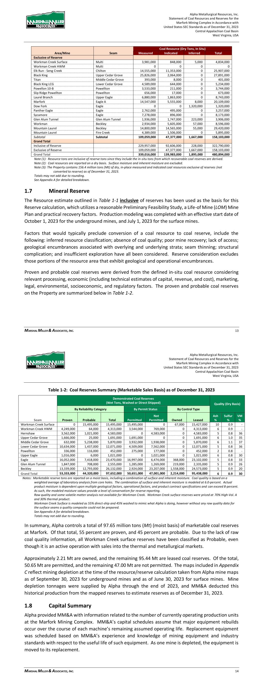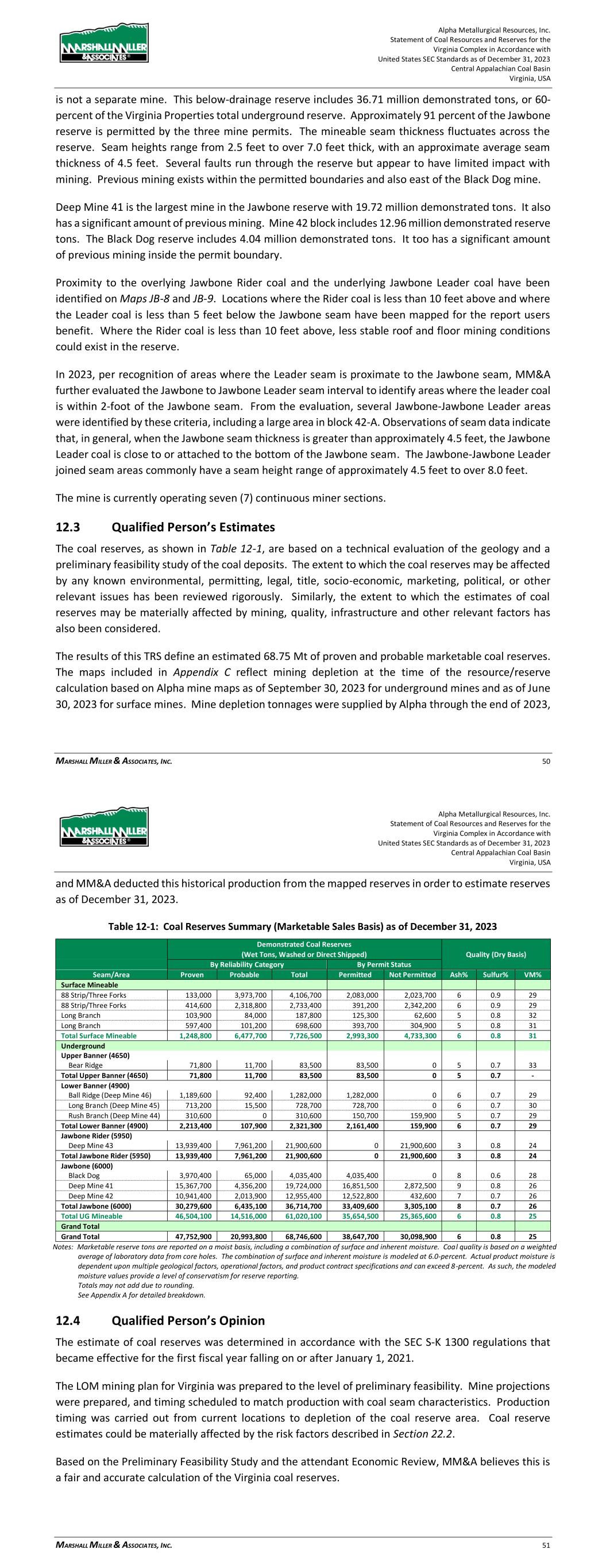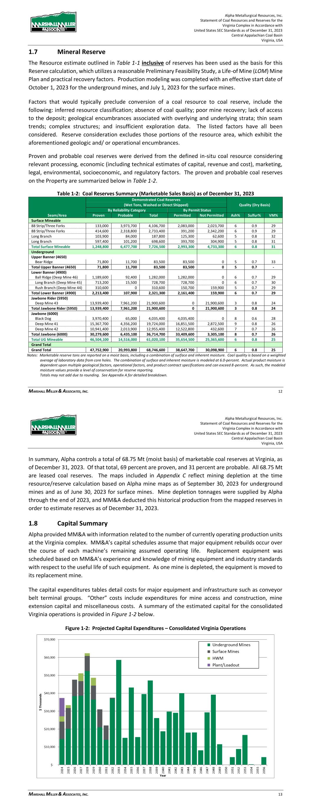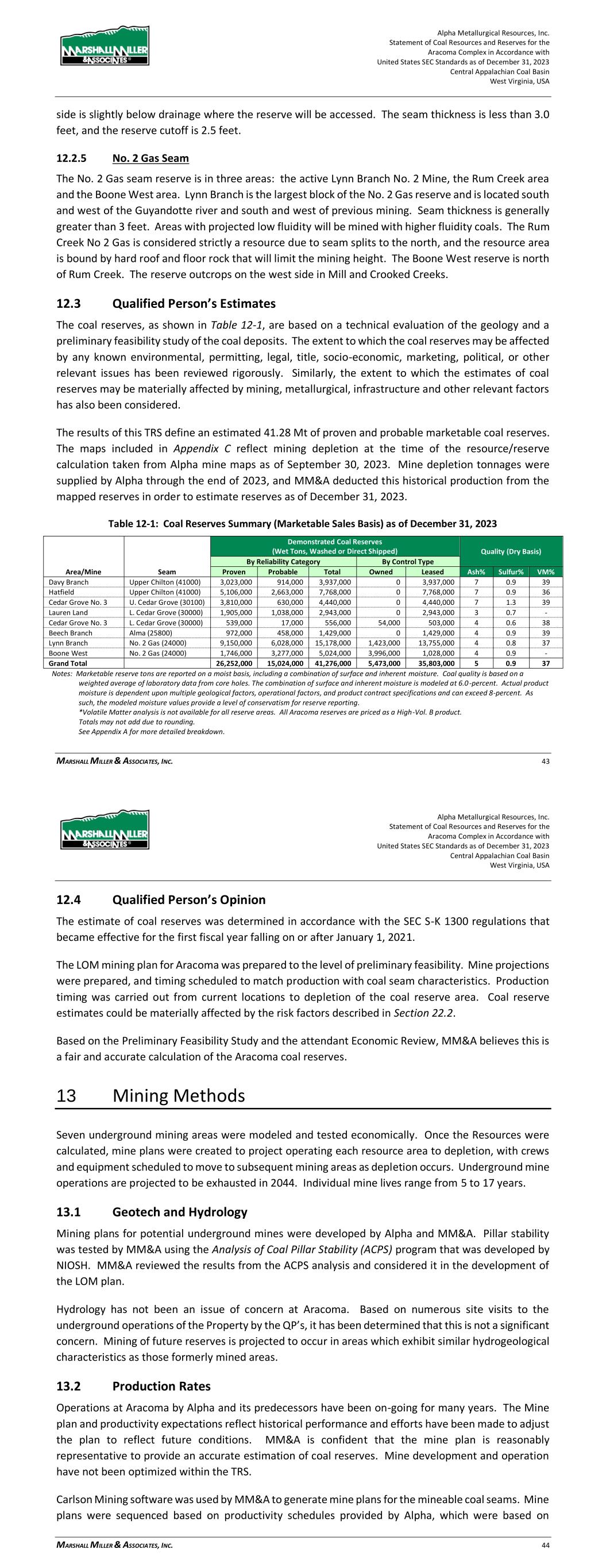 Alpha Metallurgical Resources, Inc. Statement of Coal Resources and Reserves for the Elk Run Underground Complex in Accordance with United States SEC Standards as of December 31, 2023 Central Appalachian Coal Basin West Virginia, USA MARSHALL MILLER & ASSOCIATES, INC. 44 reserves may be materially affected by mining, quality, infrastructure and other relevant factors has also been considered. The results of this TRS define an estimated 28.43 Mt of proven and probable marketable coal reserves. The maps included in Appendix C reflect mining depletion at the time of the resource/reserve calculation taken from Alpha mine maps as of September 30, 2023. Elk Run was idled in 2015; however, the first production cuts in the Checkmate Powellton mine were made in October 2023. Mine depletion tonnages were supplied by Alpha through the end of 2023, and MM&A deducted this historical production from the mapped reserves in order to estimate reserves as of December 31, 2023. Table 12-1: Coal Reserves Summary (Marketable Sales Basis) as of December 31, 2023 Demonstrated Coal Reserves Quality (Dry Basis) (Wet Tons, Washed or Direct Shipped) By Reliability Category By Control Type Area Seam Proven Probable Total Owned Leased Ash% Sulfur% VM% Checkmate Powellton 17,341,000 11,093,000 28,434,000 139,000 28,295,000 6 1.0 34 Grand Total 17,341,000 11,093,000 28,434,000 139,000 28,295,000 6 1.0 34- Notes: Marketable reserve tons are reported on a moist basis, including a combination of surface and inherent moisture. Coal quality is based on a weighted average of laboratory analysis from core holes. The combination of surface and inherent moisture is modeled at 6.0-percent. Actual product moisture is dependent upon multiple geological factors, operational factors, and product contract specifications and can exceed 8-percent. As such, the modeled moisture values provide a level of conservatism for reserve reporting. *Some reserves lack coal quality. Totals may not add due to rounding. See Appendix A for detailed breakdown. 12.4 Qualified Person’s Opinion The estimate of coal reserves was determined in accordance with the SEC Guidelines, SK 1300 that came into effect for the first fiscal year falling on or after January 1, 2021. The LOM mining plan for Elk Run was prepared to the level of preliminary feasibility. Mine projections were prepared, and timing scheduled to match production with coal seam characteristics. Production timing was carried out from current locations to depletion of the coal reserve area. Coal reserve estimates could be materially affected by the risk factors described in Section 22.2. Based on the Preliminary Feasibility Study and the attendant Economic Review, MM&A believes this is a fair and accurate calculation of the Elk Run coal reserves. 13 Mining Methods The Checkmate Powellton underground mine area was modeled and tested economically. Once the Resources were calculated, mine plans were created to project operating the resource area to depletion, with crews and equipment scheduled to move to subsequent mining areas as depletion occurs. Underground mine operations are projected to be exhausted in 2045 when the Checkmate Powellton reserves are anticipated to be fully depleted. Alpha Metallurgical Resources, Inc. Statement of Coal Resources and Reserves for the Elk Run Underground Complex in Accordance with United States SEC Standards as of December 31, 2023 Central Appalachian Coal Basin West Virginia, USA MARSHALL MILLER & ASSOCIATES, INC. 45 13.1 Geotech and Hydrology Mining plans for potential underground mines were developed by Alpha and MM&A. Pillar stability was tested by MM&A using the Analysis of Coal Pillar Stability (ACPS) program that was developed by NIOSH. MM&A reviewed the results from the ACPS analysis and considered it in the development of the LOM plan. Hydrology has not been an issue of concern at the Elk Run area. Based on numerous site visits to the underground operations of the Property by the QP’s, it has been determined that this is not a significant concern. Mining of future reserves is projected to occur in areas which exhibit similar hydrogeological characteristics as those formerly mined areas. 13.2 Production Rates Operations at Elk Run by Alpha and its predecessors have been on-going for many years. The Mine plan and productivity expectations reflect historical performance and efforts have been made to adjust the plan to reflect future conditions. MM&A is confident that the mine plan is reasonably representative to provide an accurate estimation of coal reserves. Mine development and operation have not been optimized within the TRS. Carlson Mining software was used by MM&A to generate mine plans for the mineable coal seams. Mine plans were sequenced based on productivity schedules provided by Alpha, which were based on historically achieved productivity levels. All production forecasting ties assumed production rates to geological models as constructed by MM&A’s team of geologists and mining engineers. The Elk Run Mining Complex was idled in 2015; however, the first production cuts in the Checkmate Powellton mine were made in October 2023. The Checkmate Powellton mine will be configured as super sections with dual air splits on each section and two continuous miners operating independently but dumping to the same conveyor belt. Production is forecasted to produce coal two shifts each day. Production is scheduled Monday through Friday each week, and every other Saturday. As shown in Table 13-1, the one area planned for underground mining produces coal until 2045. The Castle Peerless mine failed to achieve positive economic results and was therefore excluded from the production schedule and economic summary presented in Section 19. Clean coal production varies directly with coal thickness.