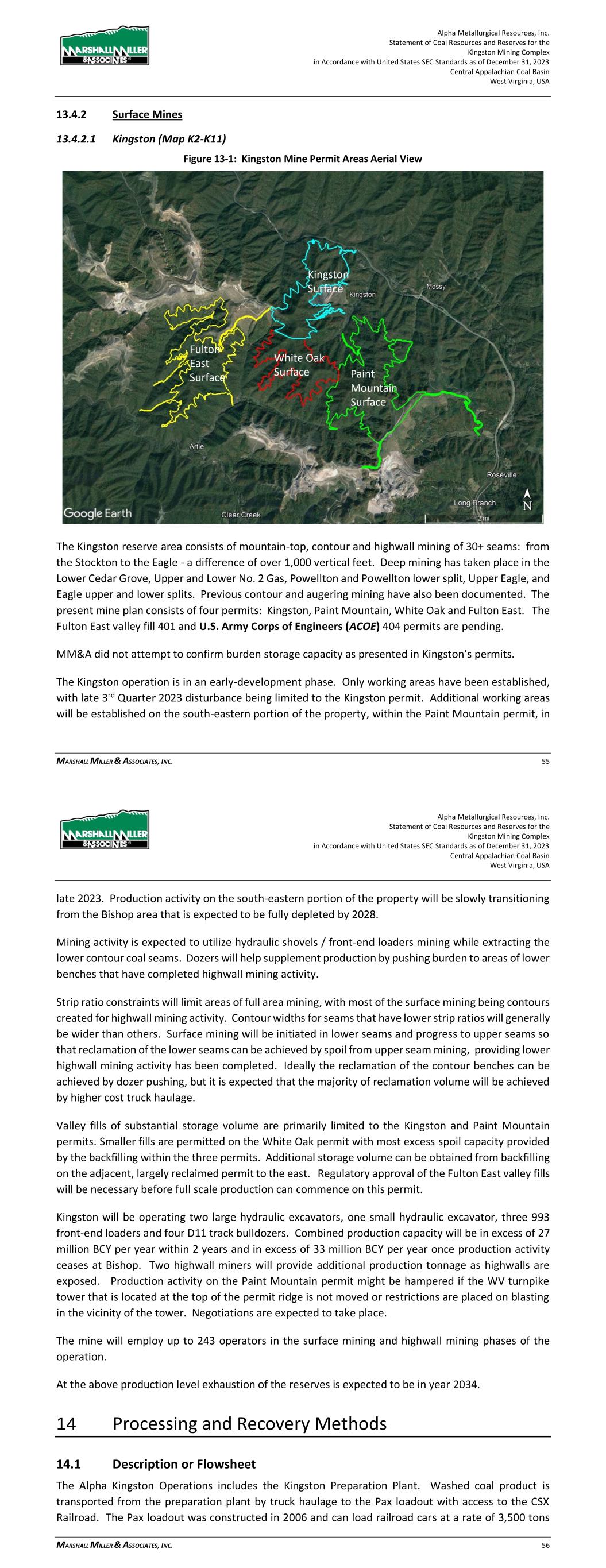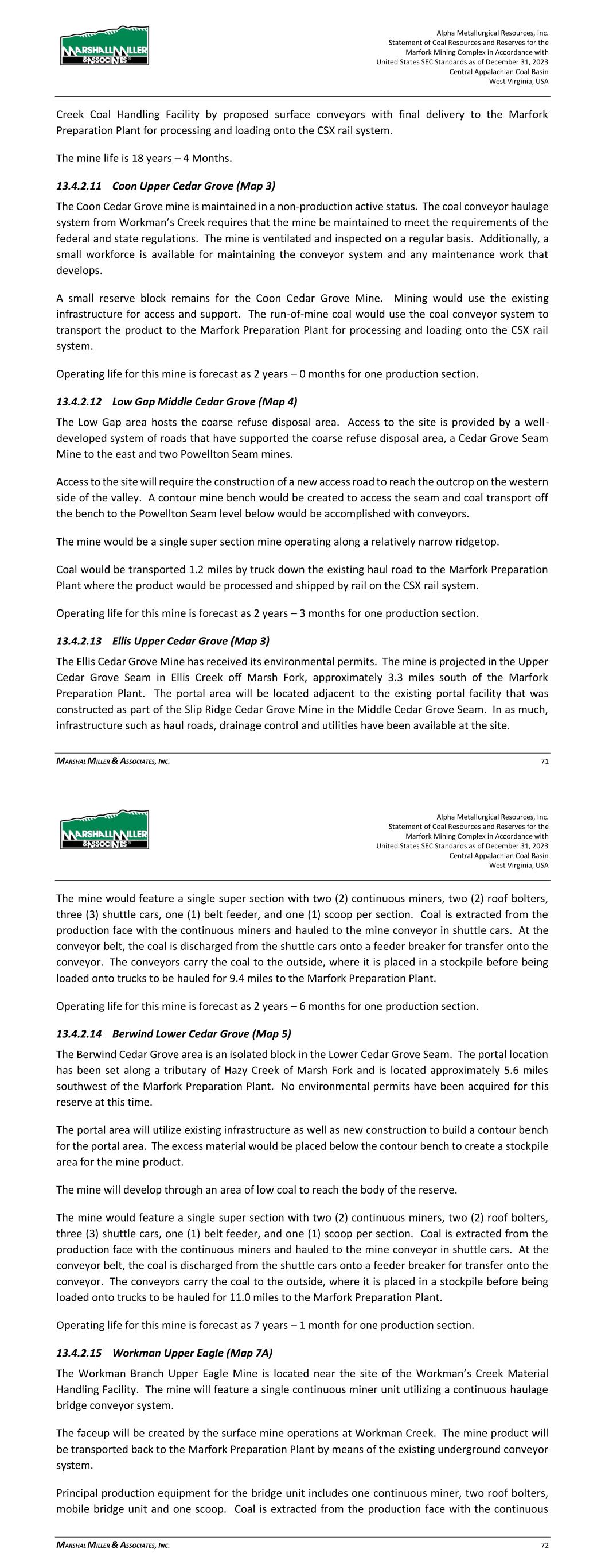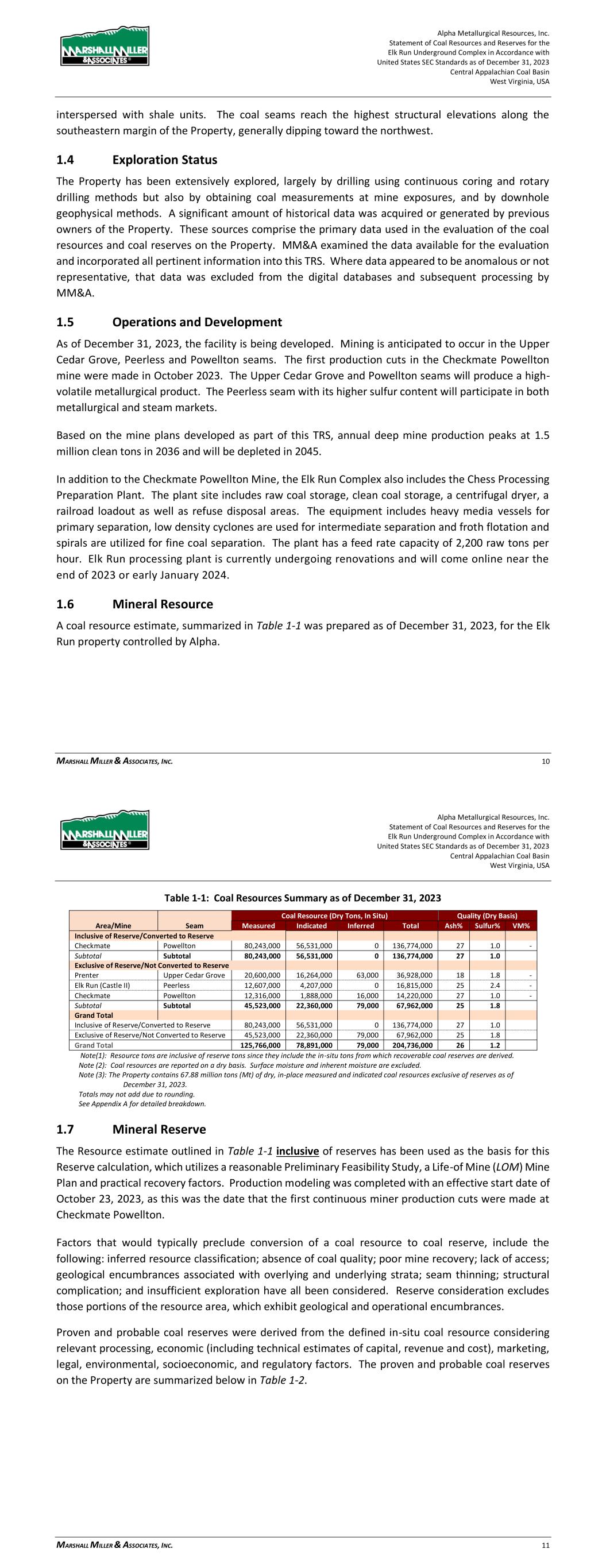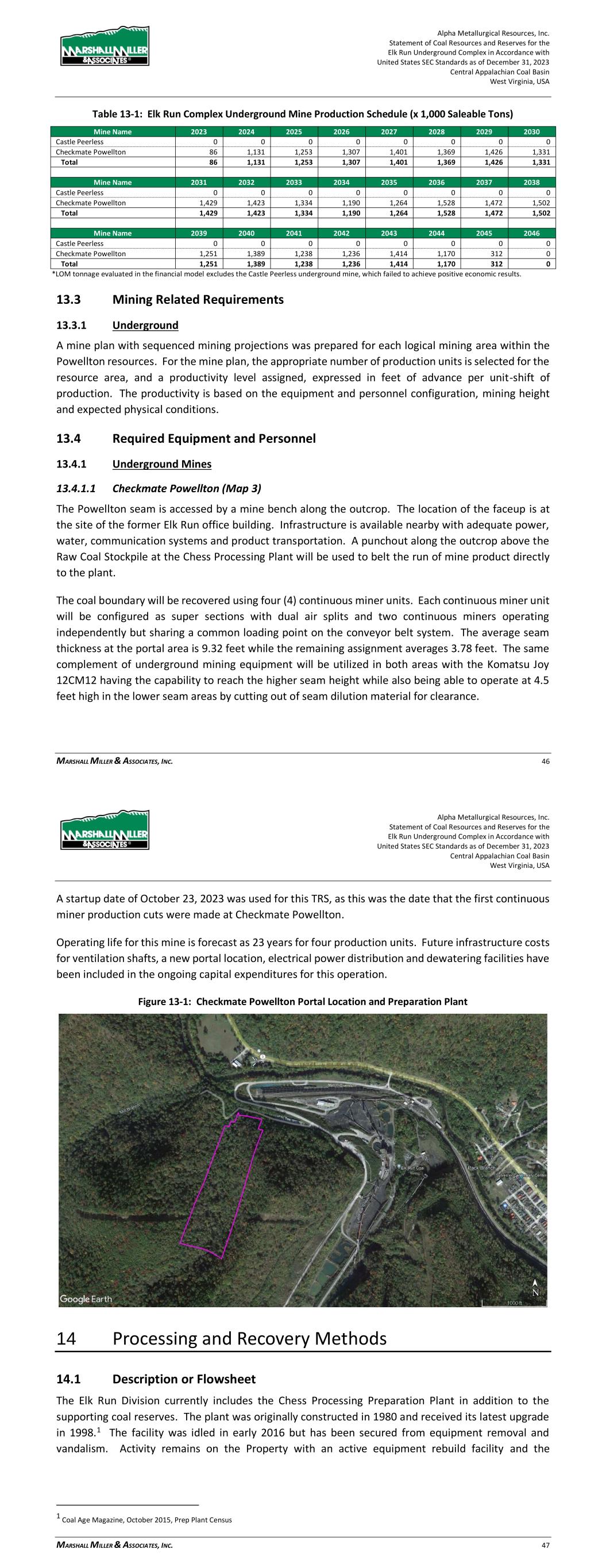 Alpha Metallurgical Resources, Inc. Statement of Coal Resources and Reserves for the Elk Run Underground Complex in Accordance with United States SEC Standards as of December 31, 2023 Central Appalachian Coal Basin West Virginia, USA MARSHALL MILLER & ASSOCIATES, INC. 46 Table 13-1: Elk Run Complex Underground Mine Production Schedule (x 1,000 Saleable Tons) Mine Name 2023 2024 2025 2026 2027 2028 2029 2030 Castle Peerless 0 0 0 0 0 0 0 0 Checkmate Powellton 86 1,131 1,253 1,307 1,401 1,369 1,426 1,331 Total 86 1,131 1,253 1,307 1,401 1,369 1,426 1,331 Mine Name 2031 2032 2033 2034 2035 2036 2037 2038 Castle Peerless 0 0 0 0 0 0 0 0 Checkmate Powellton 1,429 1,423 1,334 1,190 1,264 1,528 1,472 1,502 Total 1,429 1,423 1,334 1,190 1,264 1,528 1,472 1,502 Mine Name 2039 2040 2041 2042 2043 2044 2045 2046 Castle Peerless 0 0 0 0 0 0 0 0 Checkmate Powellton 1,251 1,389 1,238 1,236 1,414 1,170 312 0 Total 1,251 1,389 1,238 1,236 1,414 1,170 312 0 *LOM tonnage evaluated in the financial model excludes the Castle Peerless underground mine, which failed to achieve positive economic results. 13.3 Mining Related Requirements 13.3.1 Underground A mine plan with sequenced mining projections was prepared for each logical mining area within the Powellton resources. For the mine plan, the appropriate number of production units is selected for the resource area, and a productivity level assigned, expressed in feet of advance per unit-shift of production. The productivity is based on the equipment and personnel configuration, mining height and expected physical conditions. 13.4 Required Equipment and Personnel 13.4.1 Underground Mines 13.4.1.1 Checkmate Powellton (Map 3) The Powellton seam is accessed by a mine bench along the outcrop. The location of the faceup is at the site of the former Elk Run office building. Infrastructure is available nearby with adequate power, water, communication systems and product transportation. A punchout along the outcrop above the Raw Coal Stockpile at the Chess Processing Plant will be used to belt the run of mine product directly to the plant. The coal boundary will be recovered using four (4) continuous miner units. Each continuous miner unit will be configured as super sections with dual air splits and two continuous miners operating independently but sharing a common loading point on the conveyor belt system. The average seam thickness at the portal area is 9.32 feet while the remaining assignment averages 3.78 feet. The same complement of underground mining equipment will be utilized in both areas with the Komatsu Joy 12CM12 having the capability to reach the higher seam height while also being able to operate at 4.5 feet high in the lower seam areas by cutting out of seam dilution material for clearance. Alpha Metallurgical Resources, Inc. Statement of Coal Resources and Reserves for the Elk Run Underground Complex in Accordance with United States SEC Standards as of December 31, 2023 Central Appalachian Coal Basin West Virginia, USA MARSHALL MILLER & ASSOCIATES, INC. 47 A startup date of October 23, 2023 was used for this TRS, as this was the date that the first continuous miner production cuts were made at Checkmate Powellton. Operating life for this mine is forecast as 23 years for four production units. Future infrastructure costs for ventilation shafts, a new portal location, electrical power distribution and dewatering facilities have been included in the ongoing capital expenditures for this operation. Figure 13-1: Checkmate Powellton Portal Location and Preparation Plant 14 Processing and Recovery Methods 14.1 Description or Flowsheet The Elk Run Division currently includes the Chess Processing Preparation Plant in addition to the supporting coal reserves. The plant was originally constructed in 1980 and received its latest upgrade in 1998.1 The facility was idled in early 2016 but has been secured from equipment removal and vandalism. Activity remains on the Property with an active equipment rebuild facility and the 1 Coal Age Magazine, October 2015, Prep Plant Census