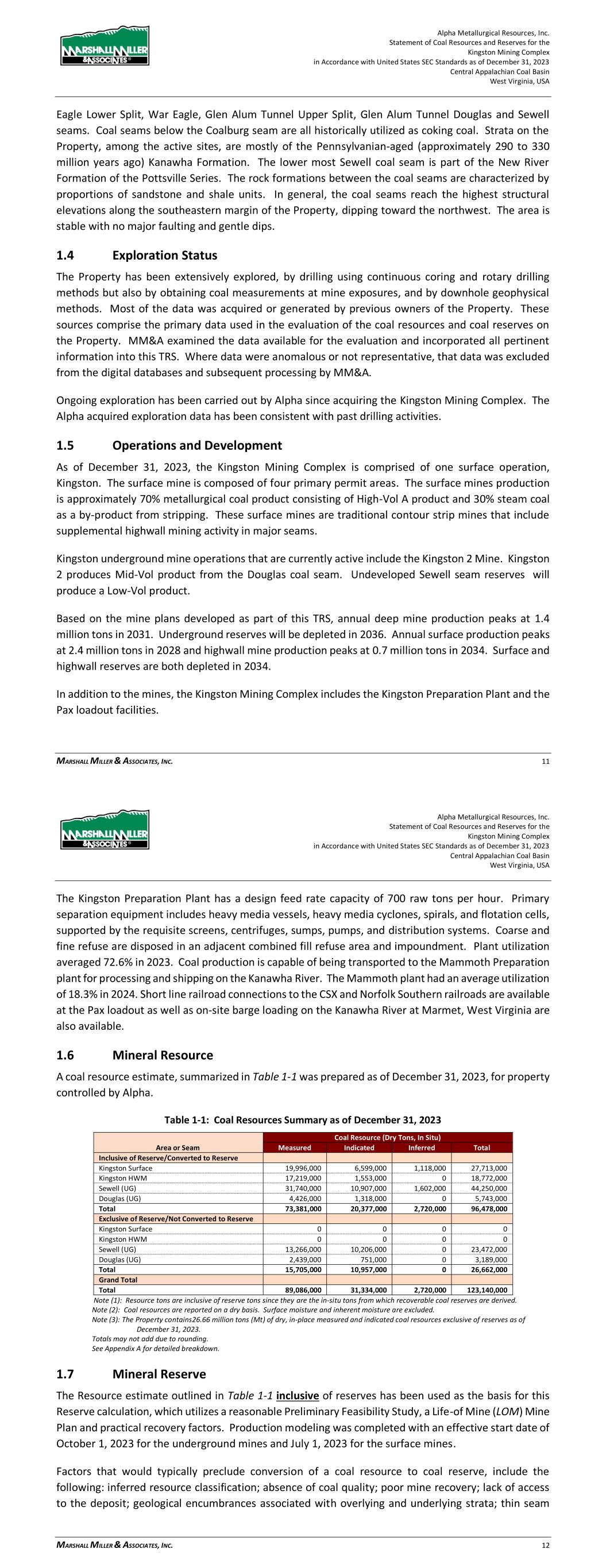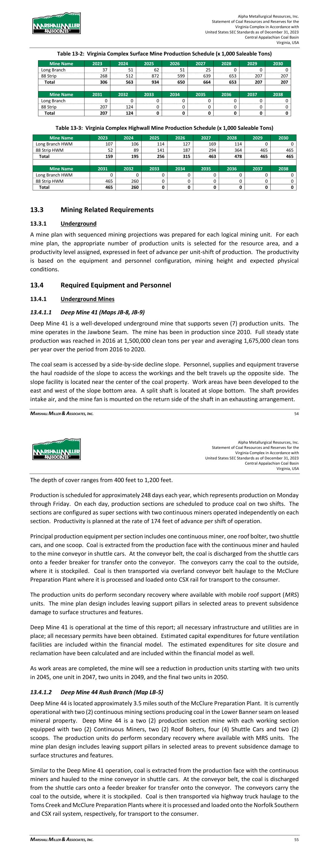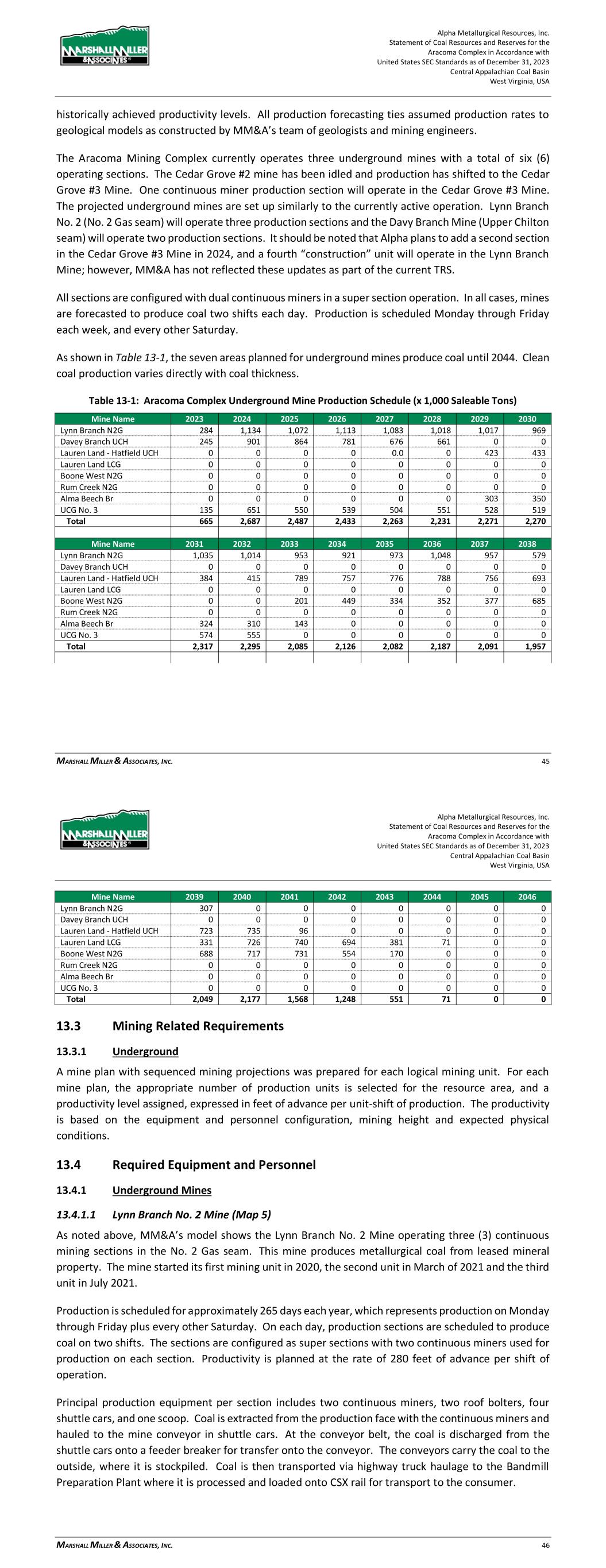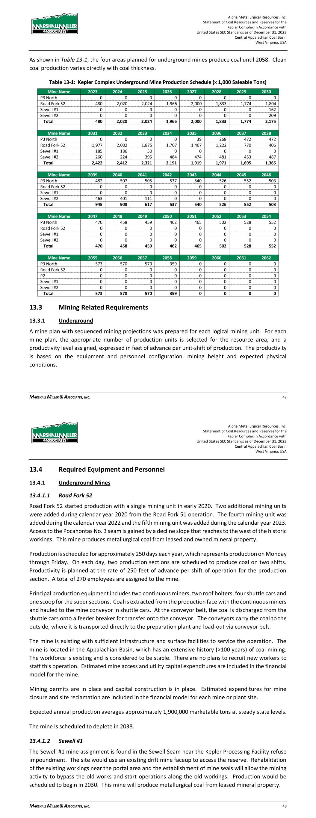 Alpha Metallurgical Resources, Inc. Statement of Coal Resources and Reserves for the Elk Run Underground Complex in Accordance with United States SEC Standards as of December 31, 2023 Central Appalachian Coal Basin West Virginia, USA MARSHALL MILLER & ASSOCIATES, INC. 46 Table 13-1: Elk Run Complex Underground Mine Production Schedule (x 1,000 Saleable Tons) Mine Name 2023 2024 2025 2026 2027 2028 2029 2030 Castle Peerless 0 0 0 0 0 0 0 0 Checkmate Powellton 86 1,131 1,253 1,307 1,401 1,369 1,426 1,331 Total 86 1,131 1,253 1,307 1,401 1,369 1,426 1,331 Mine Name 2031 2032 2033 2034 2035 2036 2037 2038 Castle Peerless 0 0 0 0 0 0 0 0 Checkmate Powellton 1,429 1,423 1,334 1,190 1,264 1,528 1,472 1,502 Total 1,429 1,423 1,334 1,190 1,264 1,528 1,472 1,502 Mine Name 2039 2040 2041 2042 2043 2044 2045 2046 Castle Peerless 0 0 0 0 0 0 0 0 Checkmate Powellton 1,251 1,389 1,238 1,236 1,414 1,170 312 0 Total 1,251 1,389 1,238 1,236 1,414 1,170 312 0 *LOM tonnage evaluated in the financial model excludes the Castle Peerless underground mine, which failed to achieve positive economic results. 13.3 Mining Related Requirements 13.3.1 Underground A mine plan with sequenced mining projections was prepared for each logical mining area within the Powellton resources. For the mine plan, the appropriate number of production units is selected for the resource area, and a productivity level assigned, expressed in feet of advance per unit-shift of production. The productivity is based on the equipment and personnel configuration, mining height and expected physical conditions. 13.4 Required Equipment and Personnel 13.4.1 Underground Mines 13.4.1.1 Checkmate Powellton (Map 3) The Powellton seam is accessed by a mine bench along the outcrop. The location of the faceup is at the site of the former Elk Run office building. Infrastructure is available nearby with adequate power, water, communication systems and product transportation. A punchout along the outcrop above the Raw Coal Stockpile at the Chess Processing Plant will be used to belt the run of mine product directly to the plant. The coal boundary will be recovered using four (4) continuous miner units. Each continuous miner unit will be configured as super sections with dual air splits and two continuous miners operating independently but sharing a common loading point on the conveyor belt system. The average seam thickness at the portal area is 9.32 feet while the remaining assignment averages 3.78 feet. The same complement of underground mining equipment will be utilized in both areas with the Komatsu Joy 12CM12 having the capability to reach the higher seam height while also being able to operate at 4.5 feet high in the lower seam areas by cutting out of seam dilution material for clearance. Alpha Metallurgical Resources, Inc. Statement of Coal Resources and Reserves for the Elk Run Underground Complex in Accordance with United States SEC Standards as of December 31, 2023 Central Appalachian Coal Basin West Virginia, USA MARSHALL MILLER & ASSOCIATES, INC. 47 A startup date of October 23, 2023 was used for this TRS, as this was the date that the first continuous miner production cuts were made at Checkmate Powellton. Operating life for this mine is forecast as 23 years for four production units. Future infrastructure costs for ventilation shafts, a new portal location, electrical power distribution and dewatering facilities have been included in the ongoing capital expenditures for this operation. Figure 13-1: Checkmate Powellton Portal Location and Preparation Plant 14 Processing and Recovery Methods 14.1 Description or Flowsheet The Elk Run Division currently includes the Chess Processing Preparation Plant in addition to the supporting coal reserves. The plant was originally constructed in 1980 and received its latest upgrade in 1998.1 The facility was idled in early 2016 but has been secured from equipment removal and vandalism. Activity remains on the Property with an active equipment rebuild facility and the 1 Coal Age Magazine, October 2015, Prep Plant Census