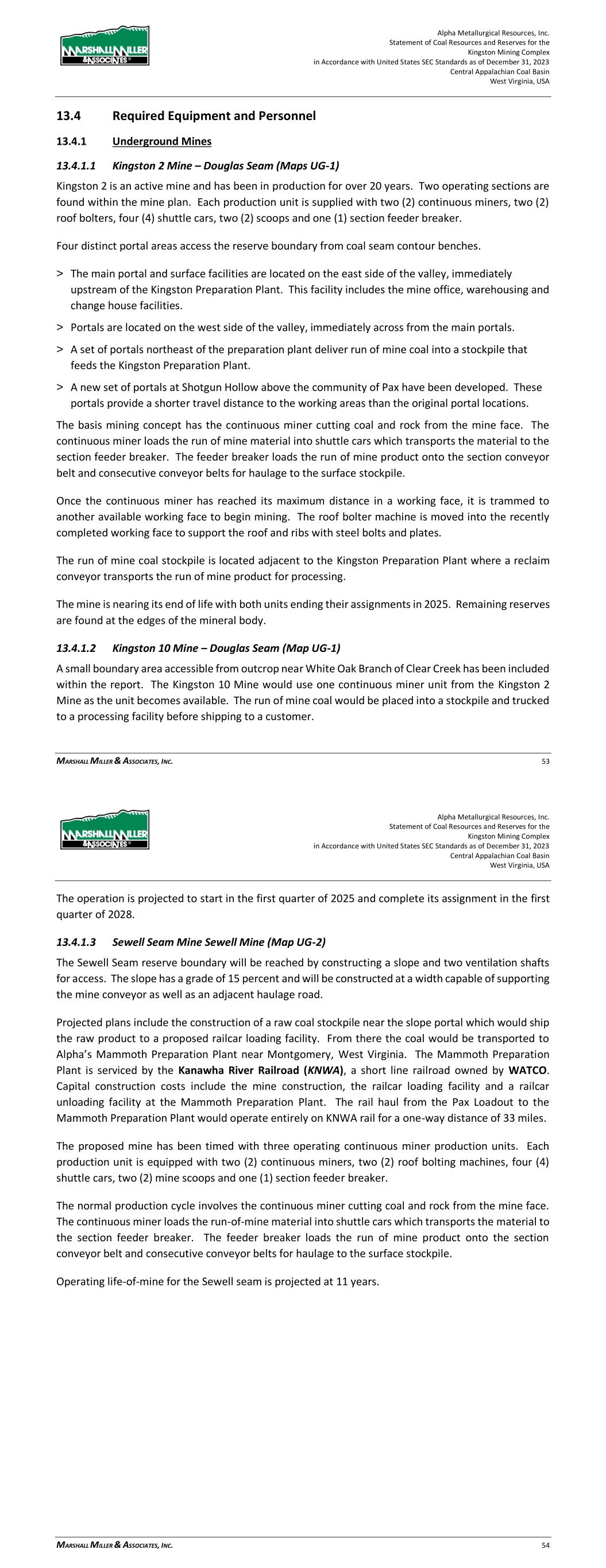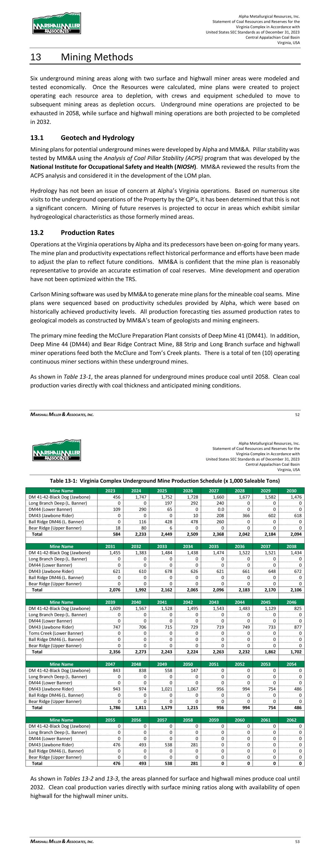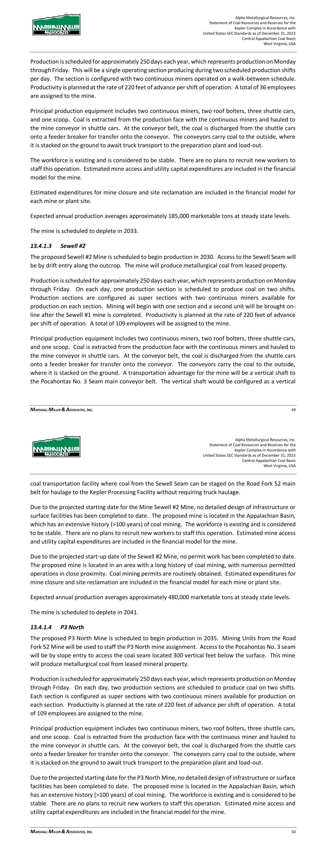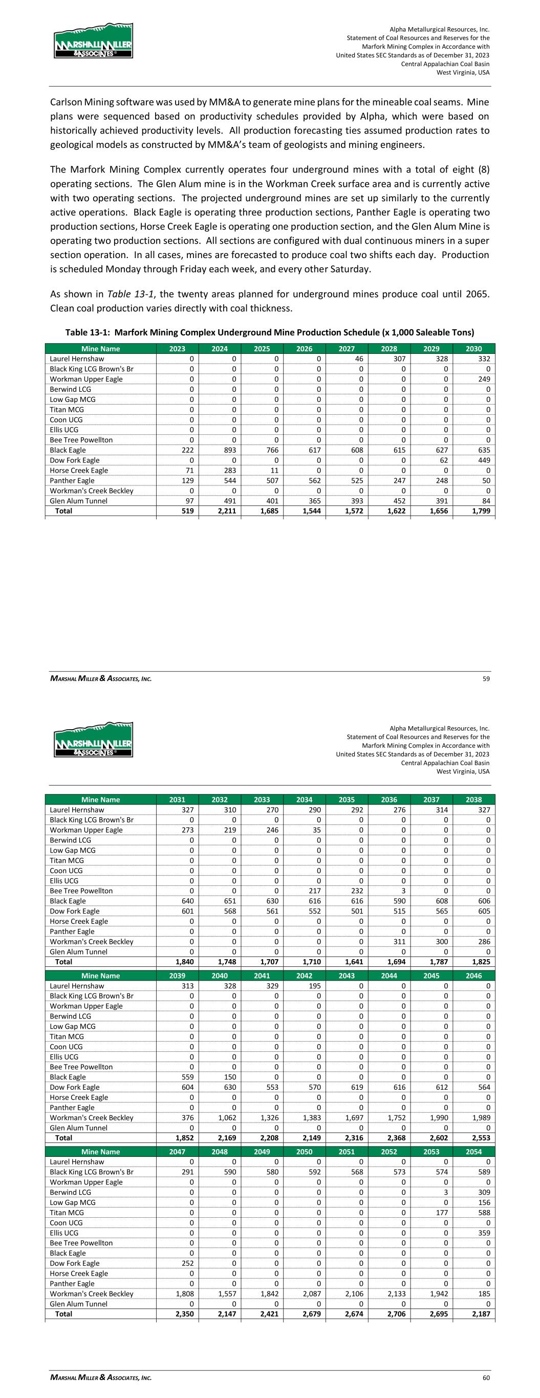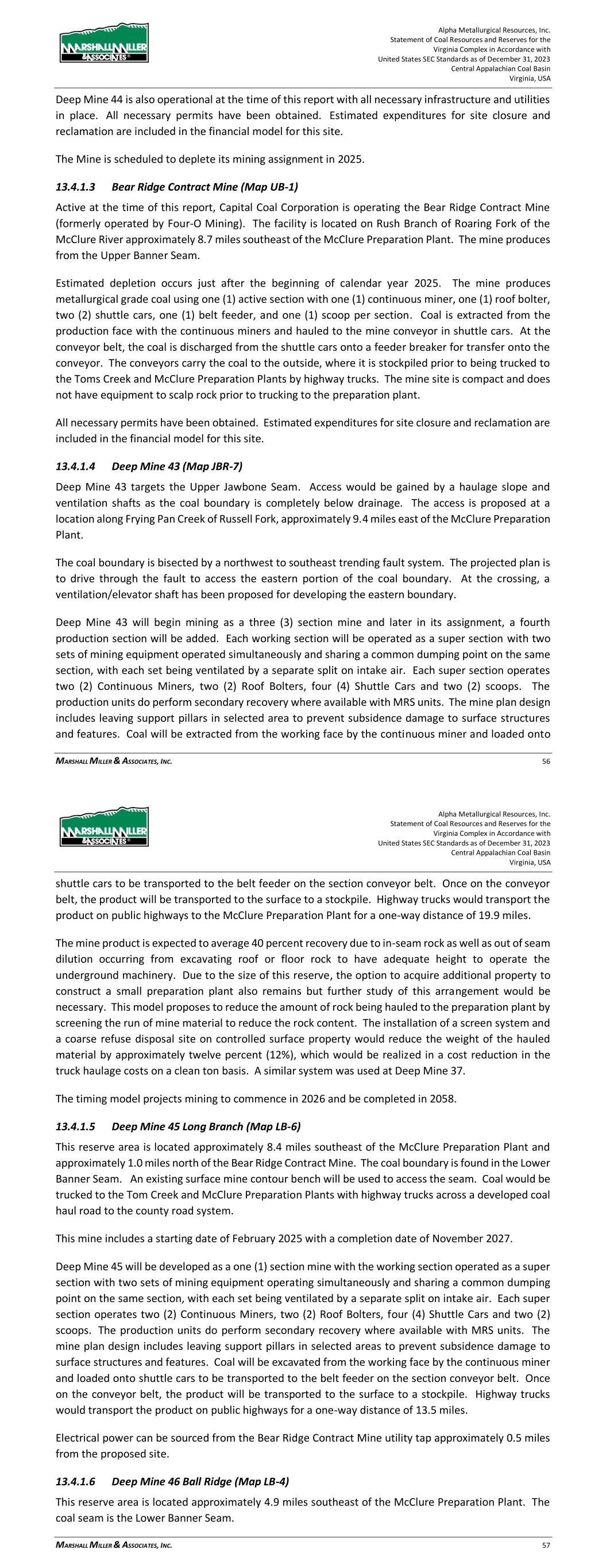 Alpha Metallurgical Resources, Inc. Statement of Coal Resources and Reserves for the Elk Run Underground Complex in Accordance with United States SEC Standards as of December 31, 2023 Central Appalachian Coal Basin West Virginia, USA MARSHALL MILLER & ASSOCIATES, INC. 46 Table 13-1: Elk Run Complex Underground Mine Production Schedule (x 1,000 Saleable Tons) Mine Name 2023 2024 2025 2026 2027 2028 2029 2030 Castle Peerless 0 0 0 0 0 0 0 0 Checkmate Powellton 86 1,131 1,253 1,307 1,401 1,369 1,426 1,331 Total 86 1,131 1,253 1,307 1,401 1,369 1,426 1,331 Mine Name 2031 2032 2033 2034 2035 2036 2037 2038 Castle Peerless 0 0 0 0 0 0 0 0 Checkmate Powellton 1,429 1,423 1,334 1,190 1,264 1,528 1,472 1,502 Total 1,429 1,423 1,334 1,190 1,264 1,528 1,472 1,502 Mine Name 2039 2040 2041 2042 2043 2044 2045 2046 Castle Peerless 0 0 0 0 0 0 0 0 Checkmate Powellton 1,251 1,389 1,238 1,236 1,414 1,170 312 0 Total 1,251 1,389 1,238 1,236 1,414 1,170 312 0 *LOM tonnage evaluated in the financial model excludes the Castle Peerless underground mine, which failed to achieve positive economic results. 13.3 Mining Related Requirements 13.3.1 Underground A mine plan with sequenced mining projections was prepared for each logical mining area within the Powellton resources. For the mine plan, the appropriate number of production units is selected for the resource area, and a productivity level assigned, expressed in feet of advance per unit-shift of production. The productivity is based on the equipment and personnel configuration, mining height and expected physical conditions. 13.4 Required Equipment and Personnel 13.4.1 Underground Mines 13.4.1.1 Checkmate Powellton (Map 3) The Powellton seam is accessed by a mine bench along the outcrop. The location of the faceup is at the site of the former Elk Run office building. Infrastructure is available nearby with adequate power, water, communication systems and product transportation. A punchout along the outcrop above the Raw Coal Stockpile at the Chess Processing Plant will be used to belt the run of mine product directly to the plant. The coal boundary will be recovered using four (4) continuous miner units. Each continuous miner unit will be configured as super sections with dual air splits and two continuous miners operating independently but sharing a common loading point on the conveyor belt system. The average seam thickness at the portal area is 9.32 feet while the remaining assignment averages 3.78 feet. The same complement of underground mining equipment will be utilized in both areas with the Komatsu Joy 12CM12 having the capability to reach the higher seam height while also being able to operate at 4.5 feet high in the lower seam areas by cutting out of seam dilution material for clearance. Alpha Metallurgical Resources, Inc. Statement of Coal Resources and Reserves for the Elk Run Underground Complex in Accordance with United States SEC Standards as of December 31, 2023 Central Appalachian Coal Basin West Virginia, USA MARSHALL MILLER & ASSOCIATES, INC. 47 A startup date of October 23, 2023 was used for this TRS, as this was the date that the first continuous miner production cuts were made at Checkmate Powellton. Operating life for this mine is forecast as 23 years for four production units. Future infrastructure costs for ventilation shafts, a new portal location, electrical power distribution and dewatering facilities have been included in the ongoing capital expenditures for this operation. Figure 13-1: Checkmate Powellton Portal Location and Preparation Plant 14 Processing and Recovery Methods 14.1 Description or Flowsheet The Elk Run Division currently includes the Chess Processing Preparation Plant in addition to the supporting coal reserves. The plant was originally constructed in 1980 and received its latest upgrade in 1998.1 The facility was idled in early 2016 but has been secured from equipment removal and vandalism. Activity remains on the Property with an active equipment rebuild facility and the 1 Coal Age Magazine, October 2015, Prep Plant Census