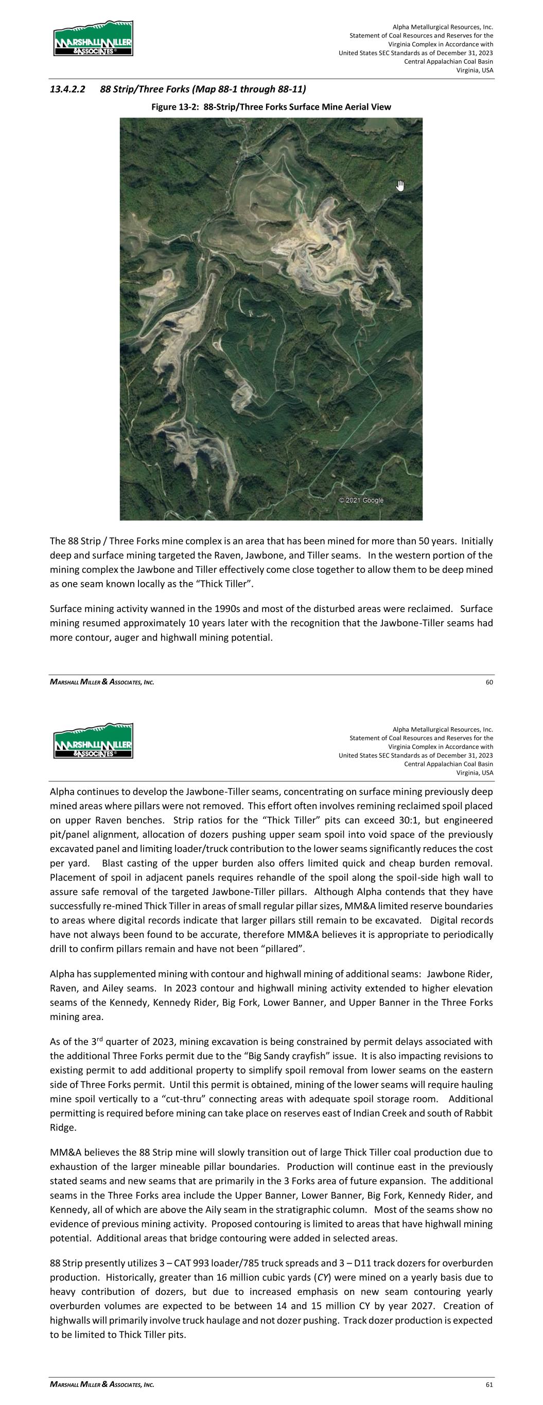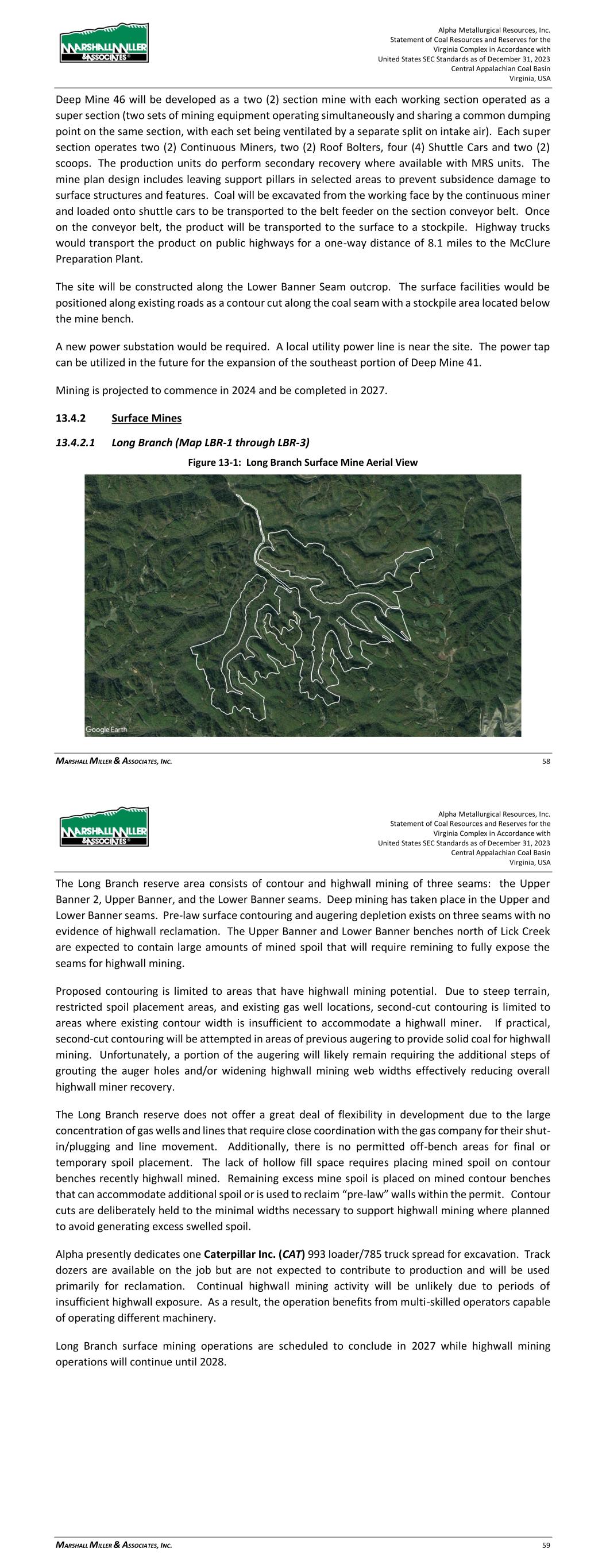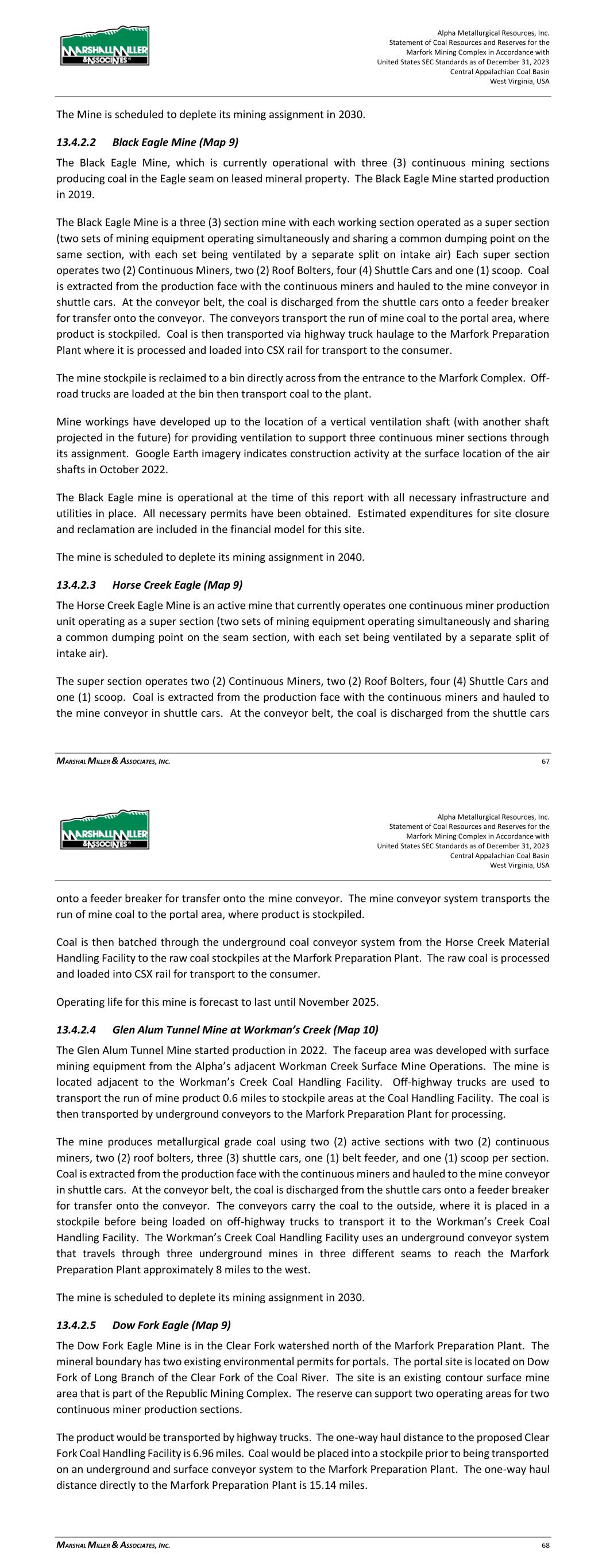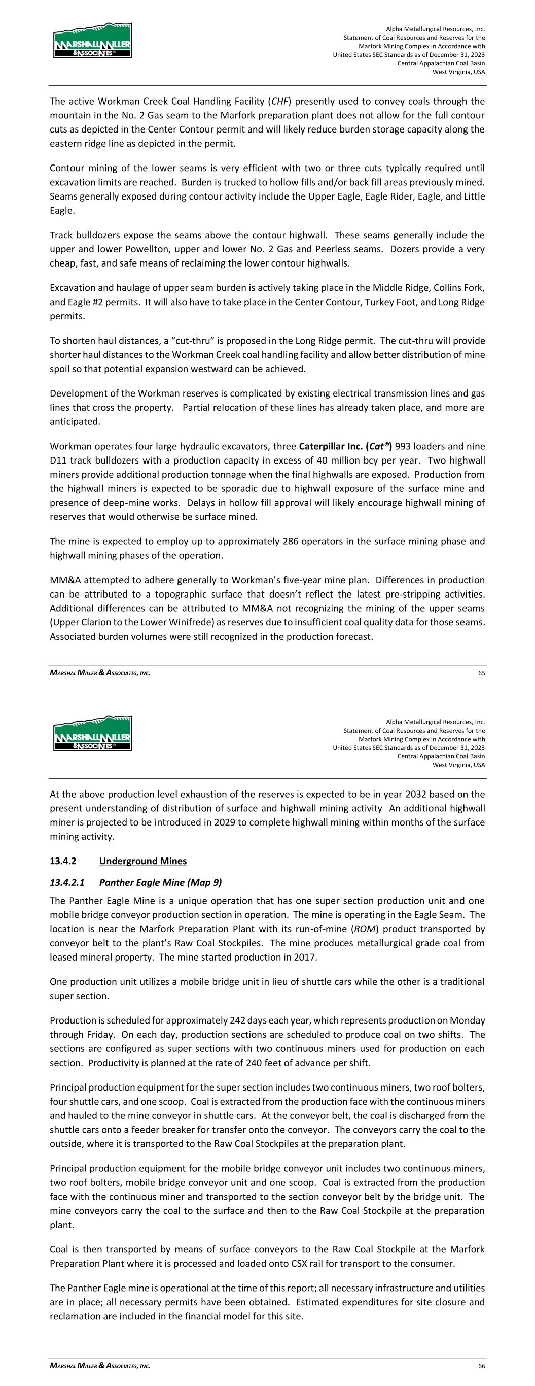 Alpha Metallurgical Resources, Inc. Statement of Coal Resources and Reserves for the Elk Run Underground Complex in Accordance with United States SEC Standards as of December 31, 2023 Central Appalachian Coal Basin West Virginia, USA MARSHALL MILLER & ASSOCIATES, INC. 46 Table 13-1: Elk Run Complex Underground Mine Production Schedule (x 1,000 Saleable Tons) Mine Name 2023 2024 2025 2026 2027 2028 2029 2030 Castle Peerless 0 0 0 0 0 0 0 0 Checkmate Powellton 86 1,131 1,253 1,307 1,401 1,369 1,426 1,331 Total 86 1,131 1,253 1,307 1,401 1,369 1,426 1,331 Mine Name 2031 2032 2033 2034 2035 2036 2037 2038 Castle Peerless 0 0 0 0 0 0 0 0 Checkmate Powellton 1,429 1,423 1,334 1,190 1,264 1,528 1,472 1,502 Total 1,429 1,423 1,334 1,190 1,264 1,528 1,472 1,502 Mine Name 2039 2040 2041 2042 2043 2044 2045 2046 Castle Peerless 0 0 0 0 0 0 0 0 Checkmate Powellton 1,251 1,389 1,238 1,236 1,414 1,170 312 0 Total 1,251 1,389 1,238 1,236 1,414 1,170 312 0 *LOM tonnage evaluated in the financial model excludes the Castle Peerless underground mine, which failed to achieve positive economic results. 13.3 Mining Related Requirements 13.3.1 Underground A mine plan with sequenced mining projections was prepared for each logical mining area within the Powellton resources. For the mine plan, the appropriate number of production units is selected for the resource area, and a productivity level assigned, expressed in feet of advance per unit-shift of production. The productivity is based on the equipment and personnel configuration, mining height and expected physical conditions. 13.4 Required Equipment and Personnel 13.4.1 Underground Mines 13.4.1.1 Checkmate Powellton (Map 3) The Powellton seam is accessed by a mine bench along the outcrop. The location of the faceup is at the site of the former Elk Run office building. Infrastructure is available nearby with adequate power, water, communication systems and product transportation. A punchout along the outcrop above the Raw Coal Stockpile at the Chess Processing Plant will be used to belt the run of mine product directly to the plant. The coal boundary will be recovered using four (4) continuous miner units. Each continuous miner unit will be configured as super sections with dual air splits and two continuous miners operating independently but sharing a common loading point on the conveyor belt system. The average seam thickness at the portal area is 9.32 feet while the remaining assignment averages 3.78 feet. The same complement of underground mining equipment will be utilized in both areas with the Komatsu Joy 12CM12 having the capability to reach the higher seam height while also being able to operate at 4.5 feet high in the lower seam areas by cutting out of seam dilution material for clearance. Alpha Metallurgical Resources, Inc. Statement of Coal Resources and Reserves for the Elk Run Underground Complex in Accordance with United States SEC Standards as of December 31, 2023 Central Appalachian Coal Basin West Virginia, USA MARSHALL MILLER & ASSOCIATES, INC. 47 A startup date of October 23, 2023 was used for this TRS, as this was the date that the first continuous miner production cuts were made at Checkmate Powellton. Operating life for this mine is forecast as 23 years for four production units. Future infrastructure costs for ventilation shafts, a new portal location, electrical power distribution and dewatering facilities have been included in the ongoing capital expenditures for this operation. Figure 13-1: Checkmate Powellton Portal Location and Preparation Plant 14 Processing and Recovery Methods 14.1 Description or Flowsheet The Elk Run Division currently includes the Chess Processing Preparation Plant in addition to the supporting coal reserves. The plant was originally constructed in 1980 and received its latest upgrade in 1998.1 The facility was idled in early 2016 but has been secured from equipment removal and vandalism. Activity remains on the Property with an active equipment rebuild facility and the 1 Coal Age Magazine, October 2015, Prep Plant Census