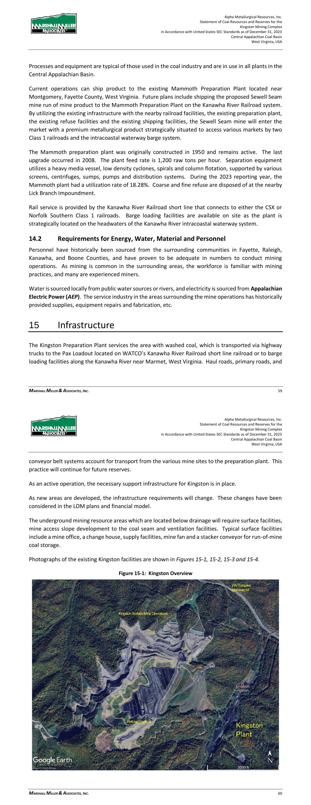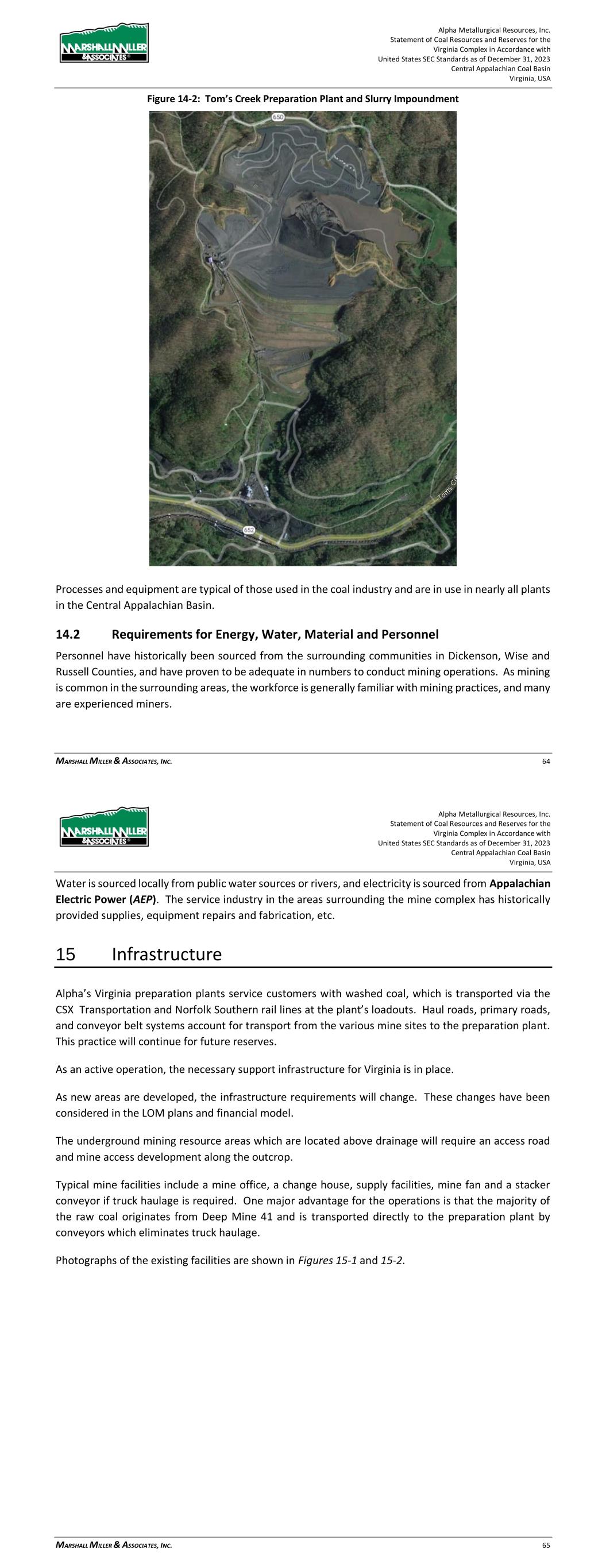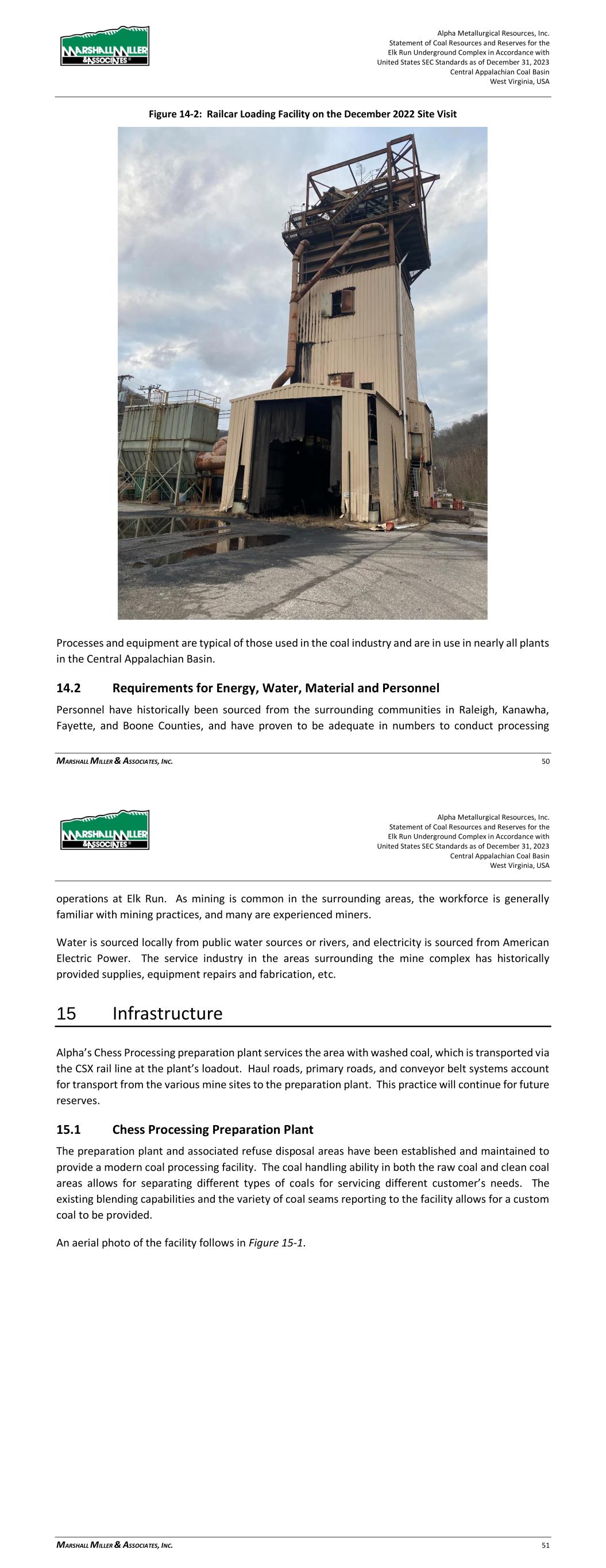 Alpha Metallurgical Resources, Inc. Statement of Coal Resources and Reserves for the Elk Run Underground Complex in Accordance with United States SEC Standards as of December 31, 2023 Central Appalachian Coal Basin West Virginia, USA MARSHALL MILLER & ASSOCIATES, INC. 50 Figure 14-2: Railcar Loading Facility on the December 2022 Site Visit Processes and equipment are typical of those used in the coal industry and are in use in nearly all plants in the Central Appalachian Basin. 14.2 Requirements for Energy, Water, Material and Personnel Personnel have historically been sourced from the surrounding communities in Raleigh, Kanawha, Fayette, and Boone Counties, and have proven to be adequate in numbers to conduct processing Alpha Metallurgical Resources, Inc. Statement of Coal Resources and Reserves for the Elk Run Underground Complex in Accordance with United States SEC Standards as of December 31, 2023 Central Appalachian Coal Basin West Virginia, USA MARSHALL MILLER & ASSOCIATES, INC. 51 operations at Elk Run. As mining is common in the surrounding areas, the workforce is generally familiar with mining practices, and many are experienced miners. Water is sourced locally from public water sources or rivers, and electricity is sourced from American Electric Power. The service industry in the areas surrounding the mine complex has historically provided supplies, equipment repairs and fabrication, etc. 15 Infrastructure Alpha’s Chess Processing preparation plant services the area with washed coal, which is transported via the CSX rail line at the plant’s loadout. Haul roads, primary roads, and conveyor belt systems account for transport from the various mine sites to the preparation plant. This practice will continue for future reserves. 15.1 Chess Processing Preparation Plant The preparation plant and associated refuse disposal areas have been established and maintained to provide a modern coal processing facility. The coal handling ability in both the raw coal and clean coal areas allows for separating different types of coals for servicing different customer’s needs. The existing blending capabilities and the variety of coal seams reporting to the facility allows for a custom coal to be provided. An aerial photo of the facility follows in Figure 15-1.