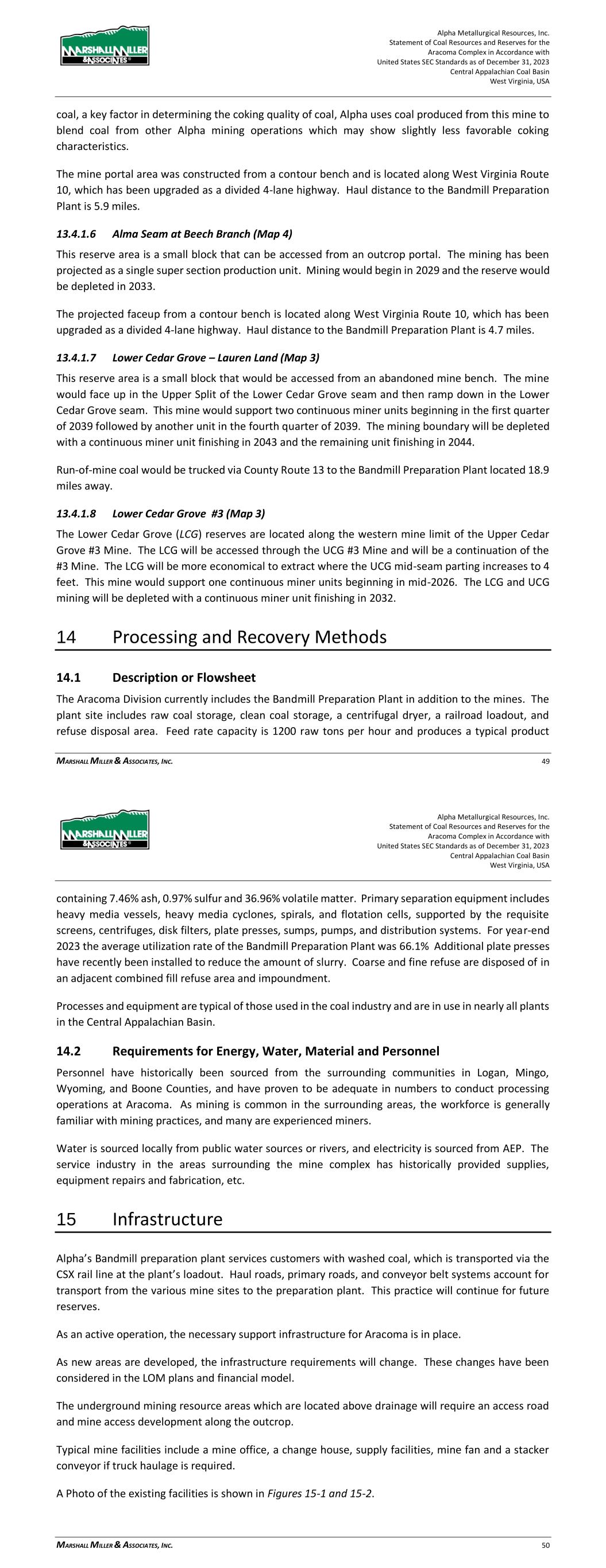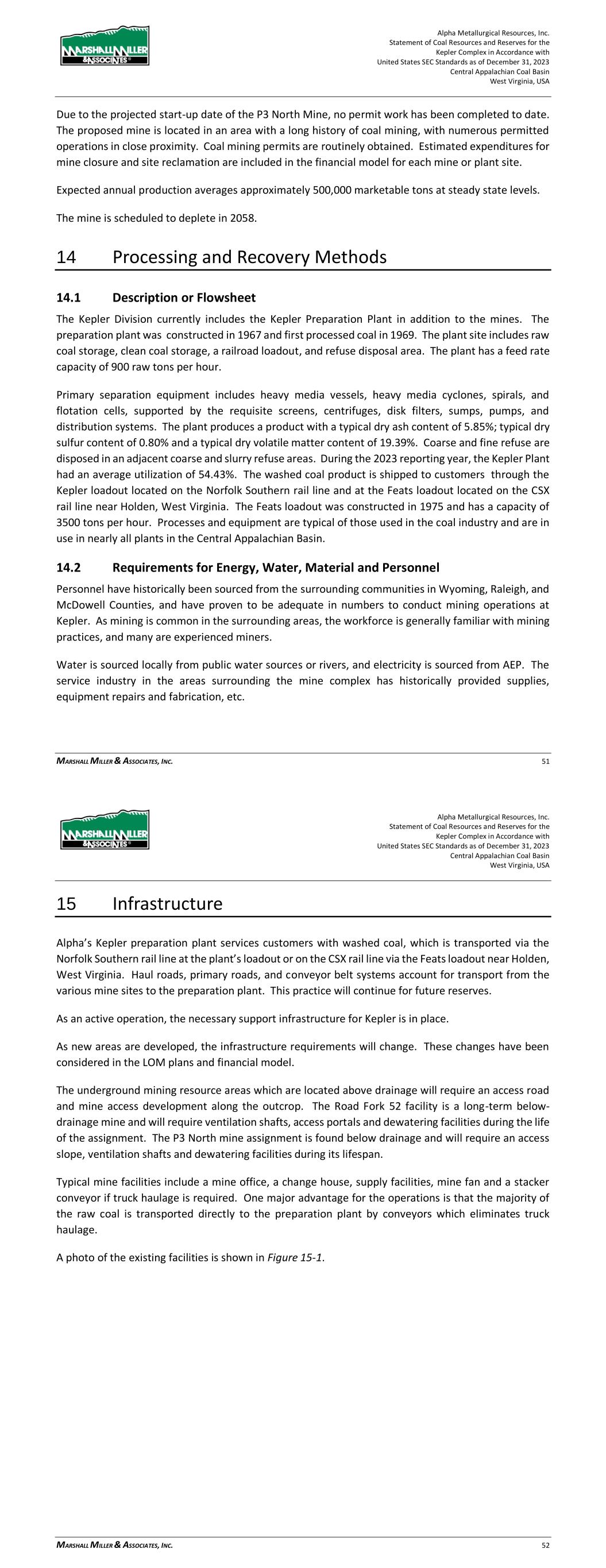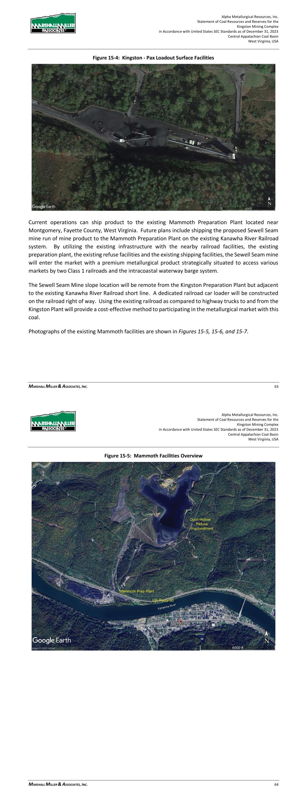 Alpha Metallurgical Resources, Inc. Statement of Coal Resources and Reserves for the Elk Run Underground Complex in Accordance with United States SEC Standards as of December 31, 2023 Central Appalachian Coal Basin West Virginia, USA MARSHALL MILLER & ASSOCIATES, INC. 50 Figure 14-2: Railcar Loading Facility on the December 2022 Site Visit Processes and equipment are typical of those used in the coal industry and are in use in nearly all plants in the Central Appalachian Basin. 14.2 Requirements for Energy, Water, Material and Personnel Personnel have historically been sourced from the surrounding communities in Raleigh, Kanawha, Fayette, and Boone Counties, and have proven to be adequate in numbers to conduct processing Alpha Metallurgical Resources, Inc. Statement of Coal Resources and Reserves for the Elk Run Underground Complex in Accordance with United States SEC Standards as of December 31, 2023 Central Appalachian Coal Basin West Virginia, USA MARSHALL MILLER & ASSOCIATES, INC. 51 operations at Elk Run. As mining is common in the surrounding areas, the workforce is generally familiar with mining practices, and many are experienced miners. Water is sourced locally from public water sources or rivers, and electricity is sourced from American Electric Power. The service industry in the areas surrounding the mine complex has historically provided supplies, equipment repairs and fabrication, etc. 15 Infrastructure Alpha’s Chess Processing preparation plant services the area with washed coal, which is transported via the CSX rail line at the plant’s loadout. Haul roads, primary roads, and conveyor belt systems account for transport from the various mine sites to the preparation plant. This practice will continue for future reserves. 15.1 Chess Processing Preparation Plant The preparation plant and associated refuse disposal areas have been established and maintained to provide a modern coal processing facility. The coal handling ability in both the raw coal and clean coal areas allows for separating different types of coals for servicing different customer’s needs. The existing blending capabilities and the variety of coal seams reporting to the facility allows for a custom coal to be provided. An aerial photo of the facility follows in Figure 15-1.