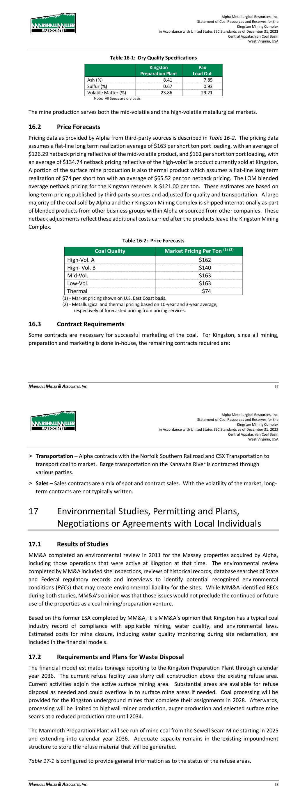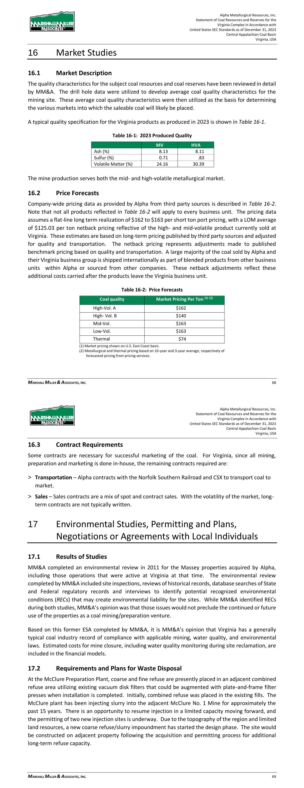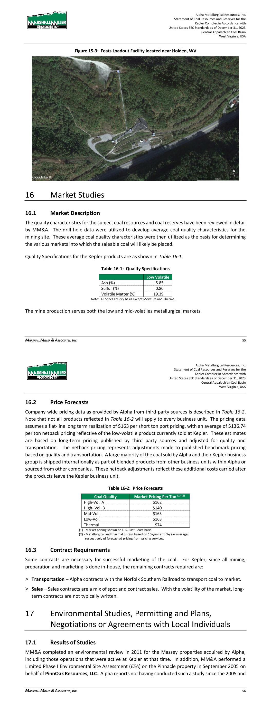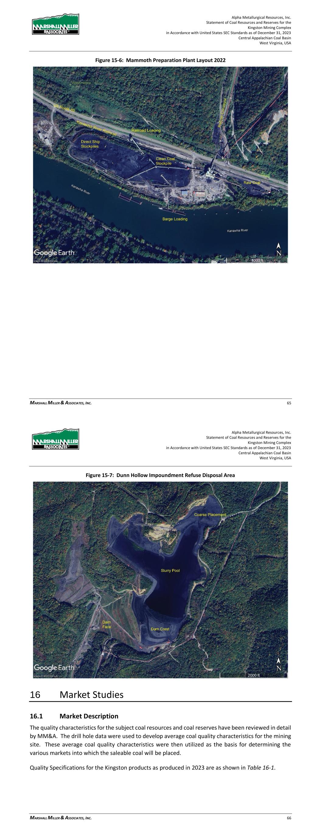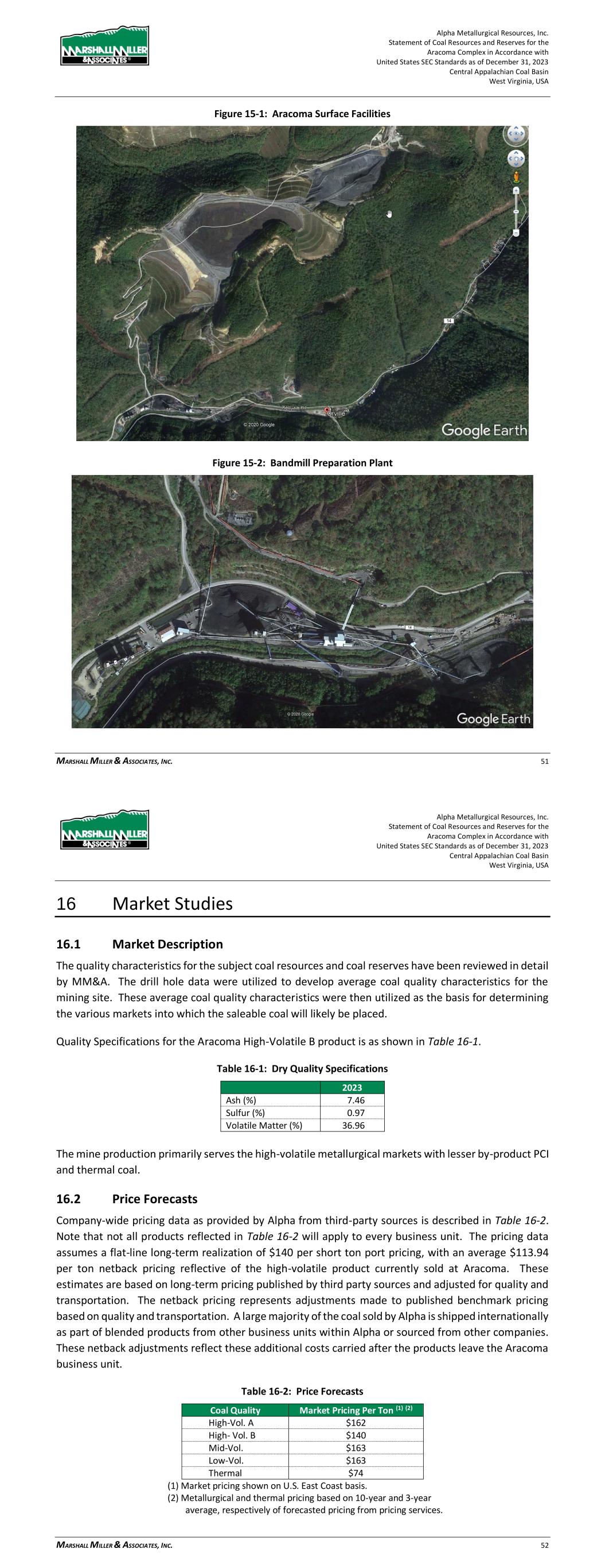 Alpha Metallurgical Resources, Inc. Statement of Coal Resources and Reserves for the Elk Run Underground Complex in Accordance with United States SEC Standards as of December 31, 2023 Central Appalachian Coal Basin West Virginia, USA MARSHALL MILLER & ASSOCIATES, INC. 54 Figure 15-3: Chess Processing Refuse Impoundment As new areas are developed, the infrastructure requirements will change. These changes have been considered in the LOM plans and financial model. 16 Market Studies 16.1 Market Description The quality characteristics for the subject coal resources and coal reserves have been reviewed in detail by MM&A. The drill hole data were utilized to develop average coal quality characteristics for the mining site. These average coal quality characteristics were then utilized as the basis for determining the various markets into which the saleable coal will likely be placed. The mine production serves the high-volatile metallurgical markets. A typical quality specification for the Elk Run products is as shown in Table 16-1. Alpha Metallurgical Resources, Inc. Statement of Coal Resources and Reserves for the Elk Run Underground Complex in Accordance with United States SEC Standards as of December 31, 2023 Central Appalachian Coal Basin West Virginia, USA MARSHALL MILLER & ASSOCIATES, INC. 55 Table 16-1: Quality Specifications HV Ash (%) 5.94 Sulfur (%) 1.01 Volatile Matter (%) 34 16.2 Price Forecasts Company-wide pricing data as provided by Alpha from third-party sources is described in Table 16-2. Note that not all products reflected in Table 16-2 will apply to every business unit. The pricing data assumes a flat-line long-term realization of $140 per short ton port pricing, with an average of $113.94 per ton netback pricing reflective of the high-volatile product proposed to be sold at Elk Run. These estimates are based on long-term pricing published by third-party sources and adjusted for quality and transportation. The netback pricing represents adjustments made to published benchmark pricing based on quality and transportation. A large majority of the coal sold by Alpha and their future Elk Run business group is shipped internationally as part of blended products from other business units within Alpha or sourced from other companies. These netback adjustments reflect these additional costs carried after the products leave the Elk Run business unit. Table 16-2: Price Forecasts Coal Quality Market Pricing Per Ton (1) (2) High-Vol. A $162 High- Vol. B $140 Mid-Vol. $163 Low-Vol. $163 Thermal $74 (1) Market pricing shown on U.S. East Coast basis. (2) Metallurgical and thermal pricing based on 10-year and 3- year average, respectively of forecasted pricing from pricing services. 16.3 Contract Requirements Some contracts are necessary for successful marketing of the coal. For Elk Run, since all mining, preparation and marketing is done in-house, the remaining contracts required are: > Transportation – Alpha contracts with the CSX Railroad to transport coal to market > Sales – Sales contracts are a mix of spot and contract sales. With the volatility of the market, long- term contracts are not typically written.