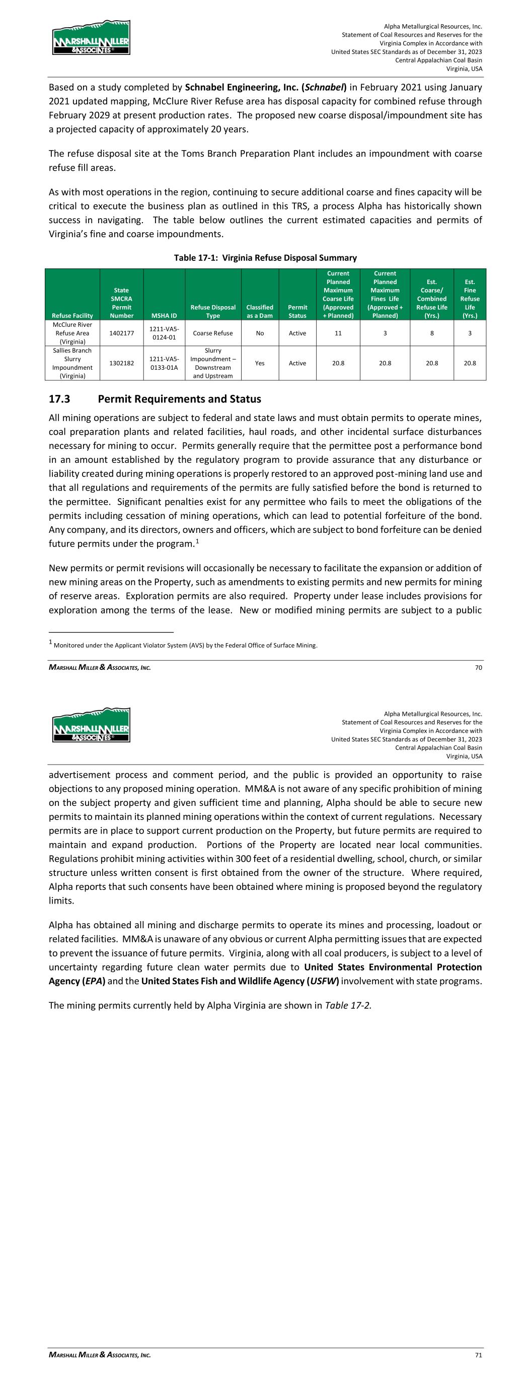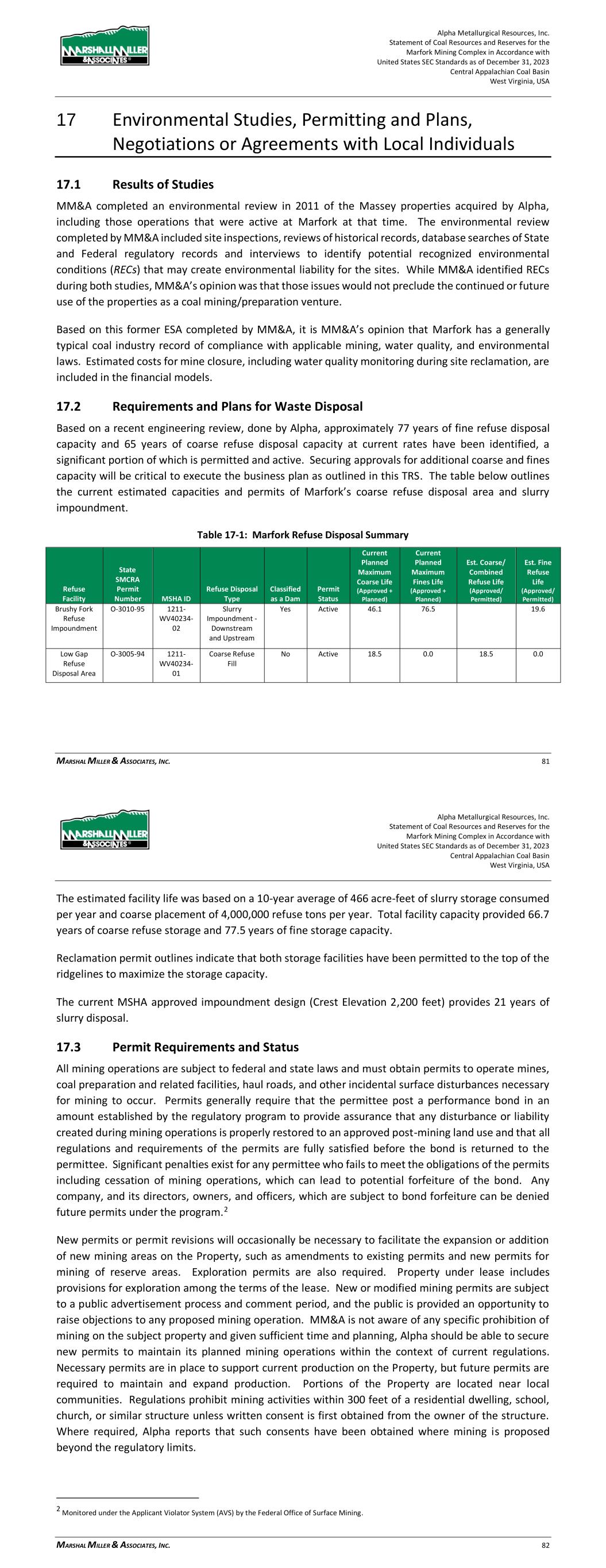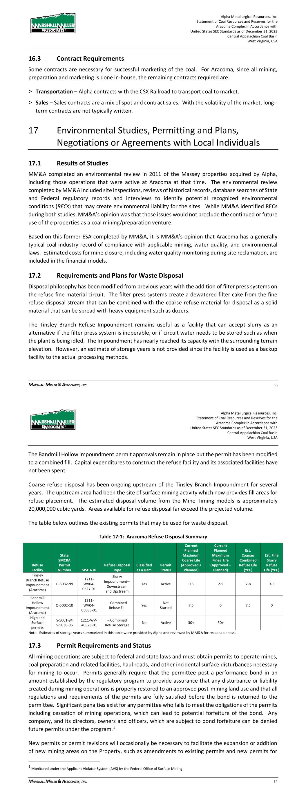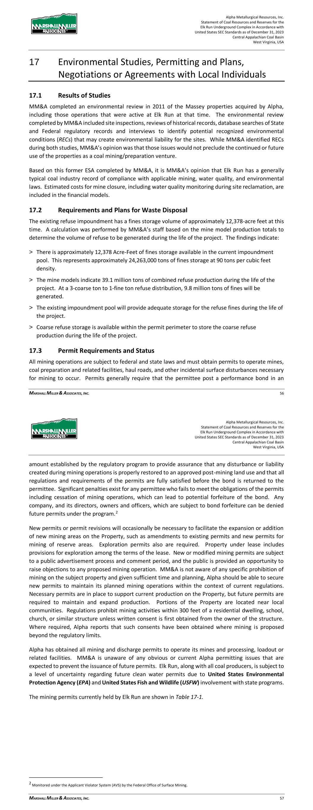 Alpha Metallurgical Resources, Inc. Statement of Coal Resources and Reserves for the Elk Run Underground Complex in Accordance with United States SEC Standards as of December 31, 2023 Central Appalachian Coal Basin West Virginia, USA MARSHALL MILLER & ASSOCIATES, INC. 56 17 Environmental Studies, Permitting and Plans, Negotiations or Agreements with Local Individuals 17.1 Results of Studies MM&A completed an environmental review in 2011 of the Massey properties acquired by Alpha, including those operations that were active at Elk Run at that time. The environmental review completed by MM&A included site inspections, reviews of historical records, database searches of State and Federal regulatory records and interviews to identify potential recognized environmental conditions (RECs) that may create environmental liability for the sites. While MM&A identified RECs during both studies, MM&A’s opinion was that those issues would not preclude the continued or future use of the properties as a coal mining/preparation venture. Based on this former ESA completed by MM&A, it is MM&A’s opinion that Elk Run has a generally typical coal industry record of compliance with applicable mining, water quality, and environmental laws. Estimated costs for mine closure, including water quality monitoring during site reclamation, are included in the financial models. 17.2 Requirements and Plans for Waste Disposal The existing refuse impoundment has a fines storage volume of approximately 12,378-acre feet at this time. A calculation was performed by MM&A’s staff based on the mine model production totals to determine the volume of refuse to be generated during the life of the project. The findings indicate: > There is approximately 12,378 Acre-Feet of fines storage available in the current impoundment pool. This represents approximately 24,263,000 tons of fines storage at 90 tons per cubic feet density. > The mine models indicate 39.1 million tons of combined refuse production during the life of the project. At a 3-coarse ton to 1-fine ton refuse distribution, 9.8 million tons of fines will be generated. > The existing impoundment pool will provide adequate storage for the refuse fines during the life of the project. > Coarse refuse storage is available within the permit perimeter to store the coarse refuse production during the life of the project. 17.3 Permit Requirements and Status All mining operations are subject to federal and state laws and must obtain permits to operate mines, coal preparation and related facilities, haul roads, and other incidental surface disturbances necessary for mining to occur. Permits generally require that the permittee post a performance bond in an Alpha Metallurgical Resources, Inc. Statement of Coal Resources and Reserves for the Elk Run Underground Complex in Accordance with United States SEC Standards as of December 31, 2023 Central Appalachian Coal Basin West Virginia, USA MARSHALL MILLER & ASSOCIATES, INC. 57 amount established by the regulatory program to provide assurance that any disturbance or liability created during mining operations is properly restored to an approved post-mining land use and that all regulations and requirements of the permits are fully satisfied before the bond is returned to the permittee. Significant penalties exist for any permittee who fails to meet the obligations of the permits including cessation of mining operations, which can lead to potential forfeiture of the bond. Any company, and its directors, owners and officers, which are subject to bond forfeiture can be denied future permits under the program.2 New permits or permit revisions will occasionally be necessary to facilitate the expansion or addition of new mining areas on the Property, such as amendments to existing permits and new permits for mining of reserve areas. Exploration permits also are required. Property under lease includes provisions for exploration among the terms of the lease. New or modified mining permits are subject to a public advertisement process and comment period, and the public is provided an opportunity to raise objections to any proposed mining operation. MM&A is not aware of any specific prohibition of mining on the subject property and given sufficient time and planning, Alpha should be able to secure new permits to maintain its planned mining operations within the context of current regulations. Necessary permits are in place to support current production on the Property, but future permits are required to maintain and expand production. Portions of the Property are located near local communities. Regulations prohibit mining activities within 300 feet of a residential dwelling, school, church, or similar structure unless written consent is first obtained from the owner of the structure. Where required, Alpha reports that such consents have been obtained where mining is proposed beyond the regulatory limits. Alpha has obtained all mining and discharge permits to operate its mines and processing, loadout or related facilities. MM&A is unaware of any obvious or current Alpha permitting issues that are expected to prevent the issuance of future permits. Elk Run, along with all coal producers, is subject to a level of uncertainty regarding future clean water permits due to United States Environmental Protection Agency (EPA) and United States Fish and Wildlife (USFW) involvement with state programs. The mining permits currently held by Elk Run are shown in Table 17-1. 2 Monitored under the Applicant Violator System (AVS) by the Federal Office of Surface Mining.