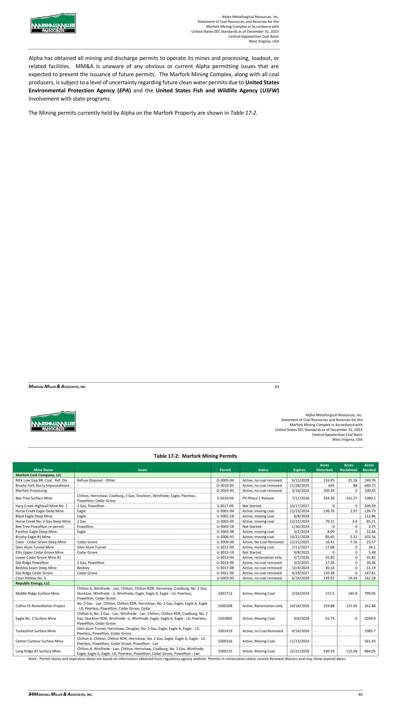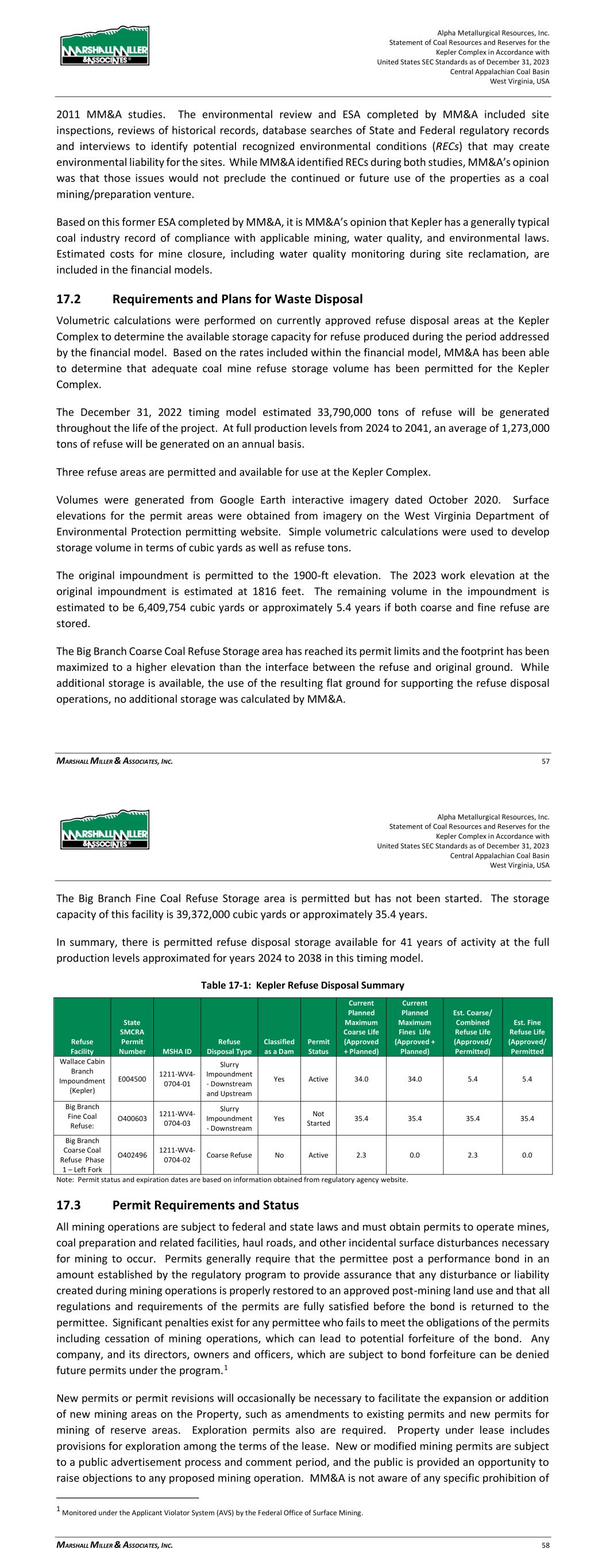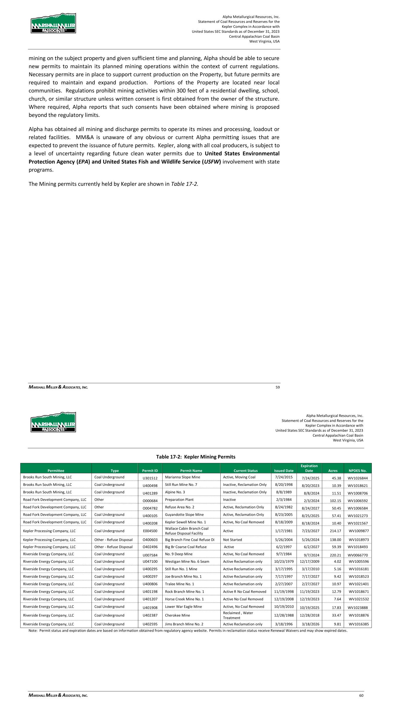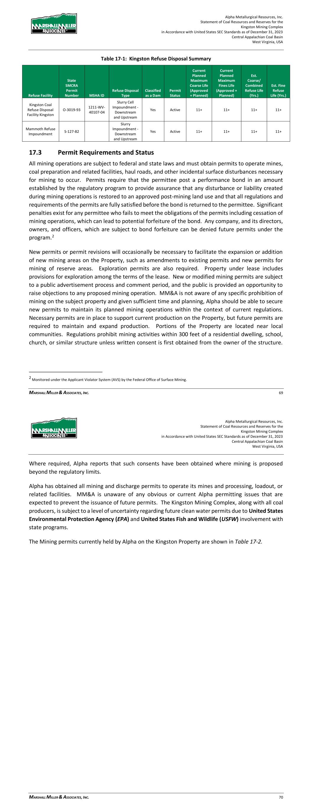 Alpha Metallurgical Resources, Inc. Statement of Coal Resources and Reserves for the Elk Run Underground Complex in Accordance with United States SEC Standards as of December 31, 2023 Central Appalachian Coal Basin West Virginia, USA MARSHALL MILLER & ASSOCIATES, INC. 56 17 Environmental Studies, Permitting and Plans, Negotiations or Agreements with Local Individuals 17.1 Results of Studies MM&A completed an environmental review in 2011 of the Massey properties acquired by Alpha, including those operations that were active at Elk Run at that time. The environmental review completed by MM&A included site inspections, reviews of historical records, database searches of State and Federal regulatory records and interviews to identify potential recognized environmental conditions (RECs) that may create environmental liability for the sites. While MM&A identified RECs during both studies, MM&A’s opinion was that those issues would not preclude the continued or future use of the properties as a coal mining/preparation venture. Based on this former ESA completed by MM&A, it is MM&A’s opinion that Elk Run has a generally typical coal industry record of compliance with applicable mining, water quality, and environmental laws. Estimated costs for mine closure, including water quality monitoring during site reclamation, are included in the financial models. 17.2 Requirements and Plans for Waste Disposal The existing refuse impoundment has a fines storage volume of approximately 12,378-acre feet at this time. A calculation was performed by MM&A’s staff based on the mine model production totals to determine the volume of refuse to be generated during the life of the project. The findings indicate: > There is approximately 12,378 Acre-Feet of fines storage available in the current impoundment pool. This represents approximately 24,263,000 tons of fines storage at 90 tons per cubic feet density. > The mine models indicate 39.1 million tons of combined refuse production during the life of the project. At a 3-coarse ton to 1-fine ton refuse distribution, 9.8 million tons of fines will be generated. > The existing impoundment pool will provide adequate storage for the refuse fines during the life of the project. > Coarse refuse storage is available within the permit perimeter to store the coarse refuse production during the life of the project. 17.3 Permit Requirements and Status All mining operations are subject to federal and state laws and must obtain permits to operate mines, coal preparation and related facilities, haul roads, and other incidental surface disturbances necessary for mining to occur. Permits generally require that the permittee post a performance bond in an Alpha Metallurgical Resources, Inc. Statement of Coal Resources and Reserves for the Elk Run Underground Complex in Accordance with United States SEC Standards as of December 31, 2023 Central Appalachian Coal Basin West Virginia, USA MARSHALL MILLER & ASSOCIATES, INC. 57 amount established by the regulatory program to provide assurance that any disturbance or liability created during mining operations is properly restored to an approved post-mining land use and that all regulations and requirements of the permits are fully satisfied before the bond is returned to the permittee. Significant penalties exist for any permittee who fails to meet the obligations of the permits including cessation of mining operations, which can lead to potential forfeiture of the bond. Any company, and its directors, owners and officers, which are subject to bond forfeiture can be denied future permits under the program.2 New permits or permit revisions will occasionally be necessary to facilitate the expansion or addition of new mining areas on the Property, such as amendments to existing permits and new permits for mining of reserve areas. Exploration permits also are required. Property under lease includes provisions for exploration among the terms of the lease. New or modified mining permits are subject to a public advertisement process and comment period, and the public is provided an opportunity to raise objections to any proposed mining operation. MM&A is not aware of any specific prohibition of mining on the subject property and given sufficient time and planning, Alpha should be able to secure new permits to maintain its planned mining operations within the context of current regulations. Necessary permits are in place to support current production on the Property, but future permits are required to maintain and expand production. Portions of the Property are located near local communities. Regulations prohibit mining activities within 300 feet of a residential dwelling, school, church, or similar structure unless written consent is first obtained from the owner of the structure. Where required, Alpha reports that such consents have been obtained where mining is proposed beyond the regulatory limits. Alpha has obtained all mining and discharge permits to operate its mines and processing, loadout or related facilities. MM&A is unaware of any obvious or current Alpha permitting issues that are expected to prevent the issuance of future permits. Elk Run, along with all coal producers, is subject to a level of uncertainty regarding future clean water permits due to United States Environmental Protection Agency (EPA) and United States Fish and Wildlife (USFW) involvement with state programs. The mining permits currently held by Elk Run are shown in Table 17-1. 2 Monitored under the Applicant Violator System (AVS) by the Federal Office of Surface Mining.
