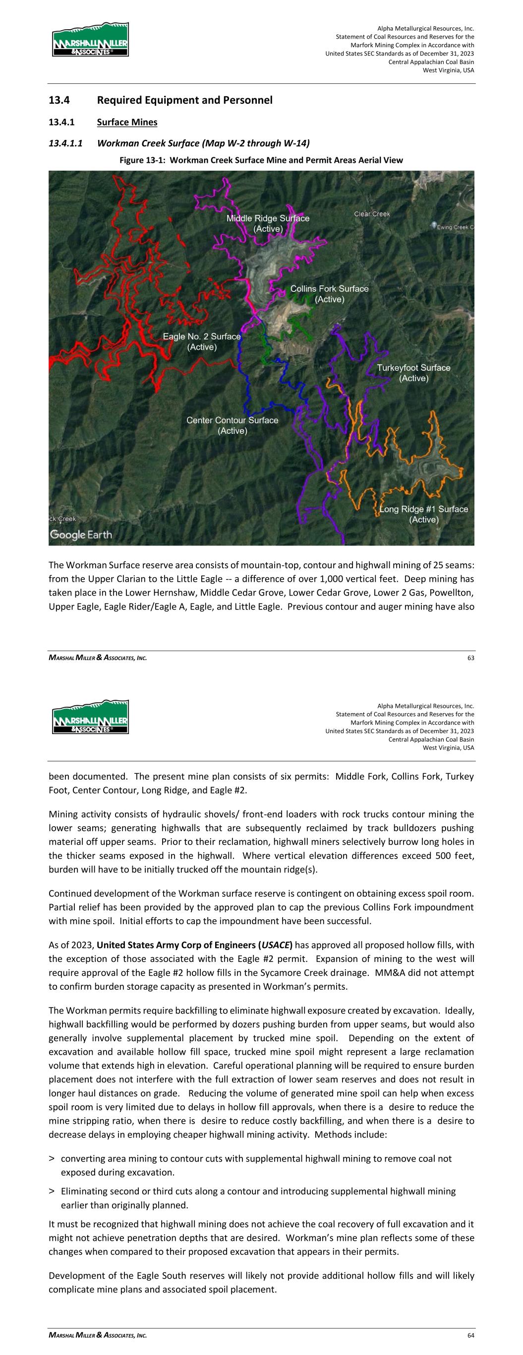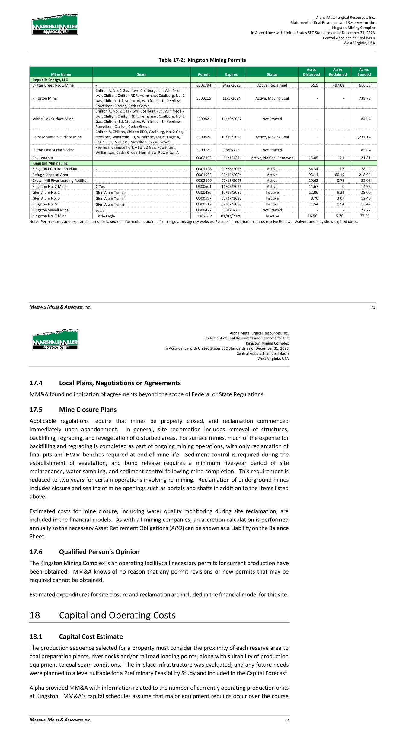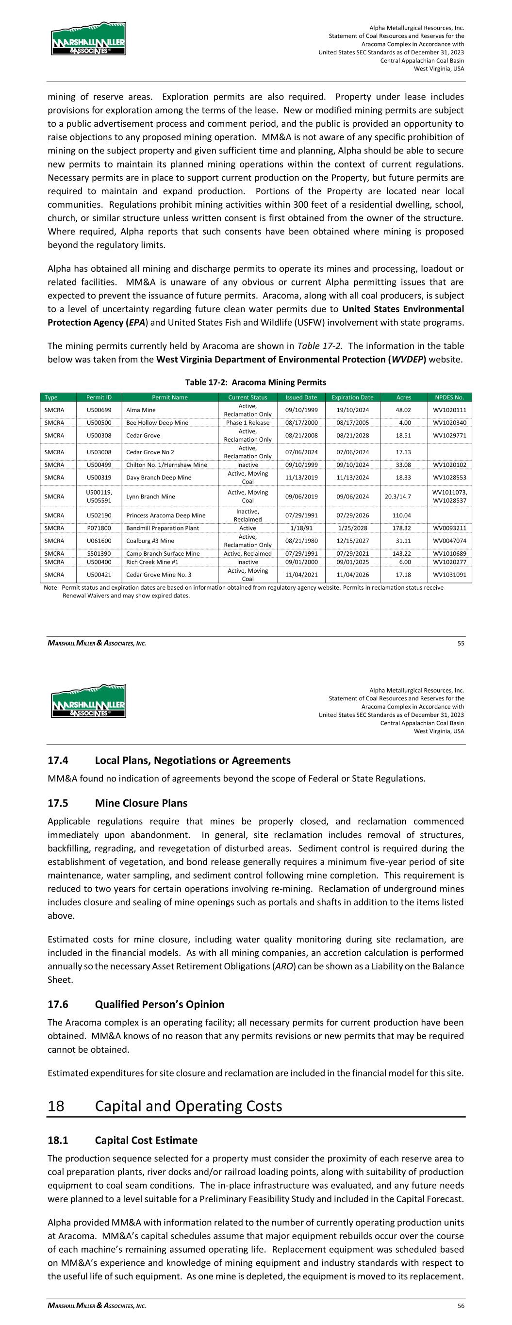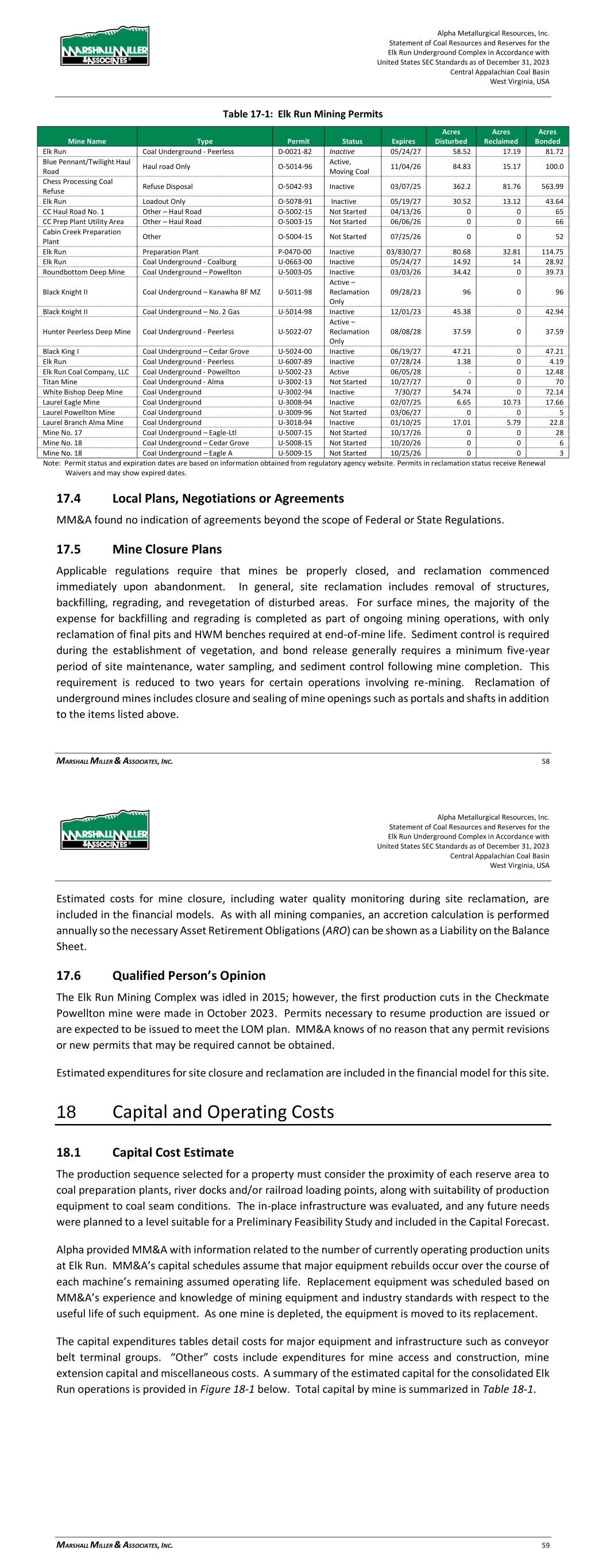 Alpha Metallurgical Resources, Inc. Statement of Coal Resources and Reserves for the Elk Run Underground Complex in Accordance with United States SEC Standards as of December 31, 2023 Central Appalachian Coal Basin West Virginia, USA MARSHALL MILLER & ASSOCIATES, INC. 58 Table 17-1: Elk Run Mining Permits Mine Name Type Permit Status Expires Acres Disturbed Acres Reclaimed Acres Bonded Elk Run Coal Underground - Peerless D-0021-82 Inactive 05/24/27 58.52 17.19 81.72 Blue Pennant/Twilight Haul Road Haul road Only O-5014-96 Active, Moving Coal 11/04/26 84.83 15.17 100.0 Chess Processing Coal Refuse Refuse Disposal O-5042-93 Inactive 03/07/25 362.2 81.76 563.99 Elk Run Loadout Only O-5078-91 Inactive 05/19/27 30.52 13.12 43.64 CC Haul Road No. 1 Other – Haul Road O-5002-15 Not Started 04/13/26 0 0 65 CC Prep Plant Utility Area Other – Haul Road O-5003-15 Not Started 06/06/26 0 0 66 Cabin Creek Preparation Plant Other O-5004-15 Not Started 07/25/26 0 0 52 Elk Run Preparation Plant P-0470-00 Inactive 03/830/27 80.68 32.81 114.75 Elk Run Coal Underground - Coalburg U-0663-00 Inactive 05/24/27 14.92 14 28.92 Roundbottom Deep Mine Coal Underground – Powellton U-5003-05 Inactive 03/03/26 34.42 0 39.73 Black Knight II Coal Underground – Kanawha BF MZ U-5011-98 Active – Reclamation Only 09/28/23 96 0 96 Black Knight II Coal Underground – No. 2 Gas U-5014-98 Inactive 12/01/23 45.38 0 42.94 Hunter Peerless Deep Mine Coal Underground - Peerless U-5022-07 Active – Reclamation Only 08/08/28 37.59 0 37.59 Black King I Coal Underground – Cedar Grove U-5024-00 Inactive 06/19/27 47.21 0 47.21 Elk Run Coal Underground - Peerless U-6007-89 Inactive 07/28/24 1.38 0 4.19 Elk Run Coal Company, LLC Coal Underground - Powellton U-5002-23 Active 06/05/28 - 0 12.48 Titan Mine Coal Underground - Alma U-3002-13 Not Started 10/27/27 0 0 70 White Bishop Deep Mine Coal Underground U-3002-94 Inactive 7/30/27 54.74 0 72.14 Laurel Eagle Mine Coal Underground U-3008-94 Inactive 02/07/25 6.65 10.73 17.66 Laurel Powellton Mine Coal Underground U-3009-96 Not Started 03/06/27 0 0 5 Laurel Branch Alma Mine Coal Underground U-3018-94 Inactive 01/10/25 17.01 5.79 22.8 Mine No. 17 Coal Underground – Eagle-Ltl U-5007-15 Not Started 10/17/26 0 0 28 Mine No. 18 Coal Underground – Cedar Grove U-5008-15 Not Started 10/20/26 0 0 6 Mine No. 18 Coal Underground – Eagle A U-5009-15 Not Started 10/25/26 0 0 3 Note: Permit status and expiration dates are based on information obtained from regulatory agency website. Permits in reclamation status receive Renewal Waivers and may show expired dates. 17.4 Local Plans, Negotiations or Agreements MM&A found no indication of agreements beyond the scope of Federal or State Regulations. 17.5 Mine Closure Plans Applicable regulations require that mines be properly closed, and reclamation commenced immediately upon abandonment. In general, site reclamation includes removal of structures, backfilling, regrading, and revegetation of disturbed areas. For surface mines, the majority of the expense for backfilling and regrading is completed as part of ongoing mining operations, with only reclamation of final pits and HWM benches required at end-of-mine life. Sediment control is required during the establishment of vegetation, and bond release generally requires a minimum five-year period of site maintenance, water sampling, and sediment control following mine completion. This requirement is reduced to two years for certain operations involving re-mining. Reclamation of underground mines includes closure and sealing of mine openings such as portals and shafts in addition to the items listed above. Alpha Metallurgical Resources, Inc. Statement of Coal Resources and Reserves for the Elk Run Underground Complex in Accordance with United States SEC Standards as of December 31, 2023 Central Appalachian Coal Basin West Virginia, USA MARSHALL MILLER & ASSOCIATES, INC. 59 Estimated costs for mine closure, including water quality monitoring during site reclamation, are included in the financial models. As with all mining companies, an accretion calculation is performed annually so the necessary Asset Retirement Obligations (ARO) can be shown as a Liability on the Balance Sheet. 17.6 Qualified Person’s Opinion The Elk Run Mining Complex was idled in 2015; however, the first production cuts in the Checkmate Powellton mine were made in October 2023. Permits necessary to resume production are issued or are expected to be issued to meet the LOM plan. MM&A knows of no reason that any permit revisions or new permits that may be required cannot be obtained. Estimated expenditures for site closure and reclamation are included in the financial model for this site. 18 Capital and Operating Costs 18.1 Capital Cost Estimate The production sequence selected for a property must consider the proximity of each reserve area to coal preparation plants, river docks and/or railroad loading points, along with suitability of production equipment to coal seam conditions. The in-place infrastructure was evaluated, and any future needs were planned to a level suitable for a Preliminary Feasibility Study and included in the Capital Forecast. Alpha provided MM&A with information related to the number of currently operating production units at Elk Run. MM&A’s capital schedules assume that major equipment rebuilds occur over the course of each machine’s remaining assumed operating life. Replacement equipment was scheduled based on MM&A’s experience and knowledge of mining equipment and industry standards with respect to the useful life of such equipment. As one mine is depleted, the equipment is moved to its replacement. The capital expenditures tables detail costs for major equipment and infrastructure such as conveyor belt terminal groups. “Other” costs include expenditures for mine access and construction, mine extension capital and miscellaneous costs. A summary of the estimated capital for the consolidated Elk 