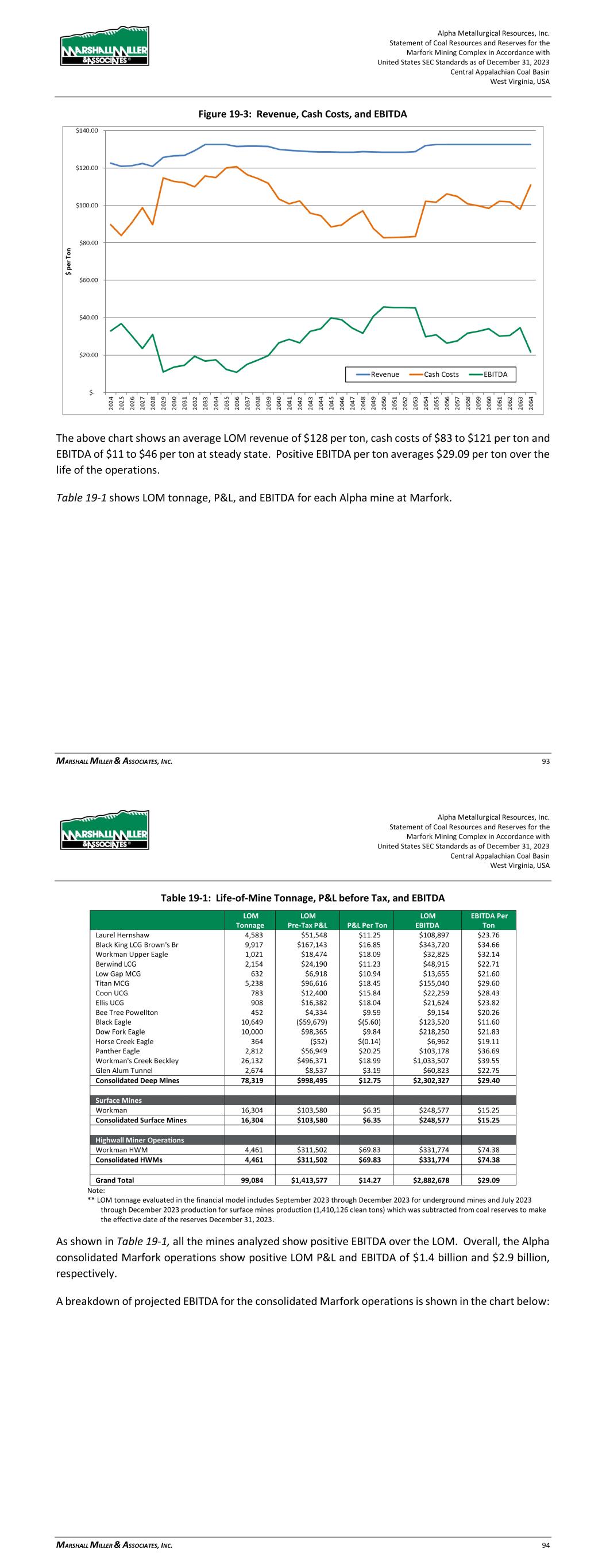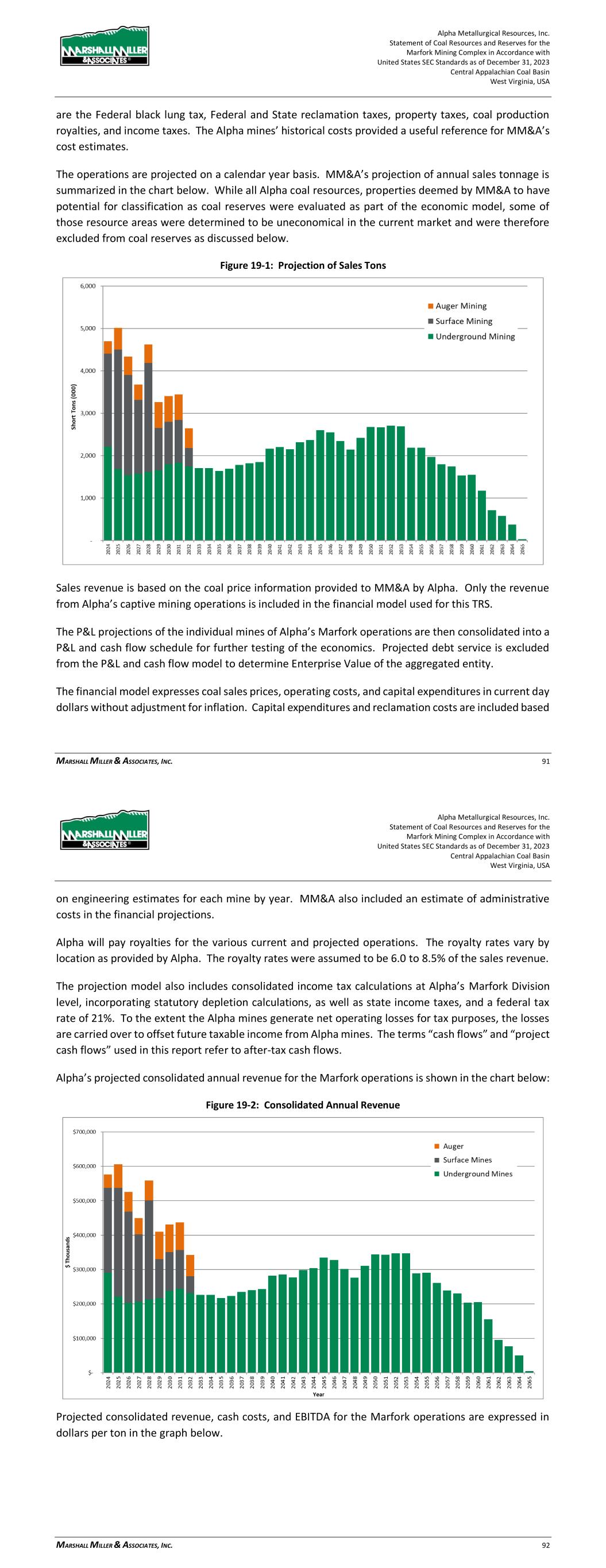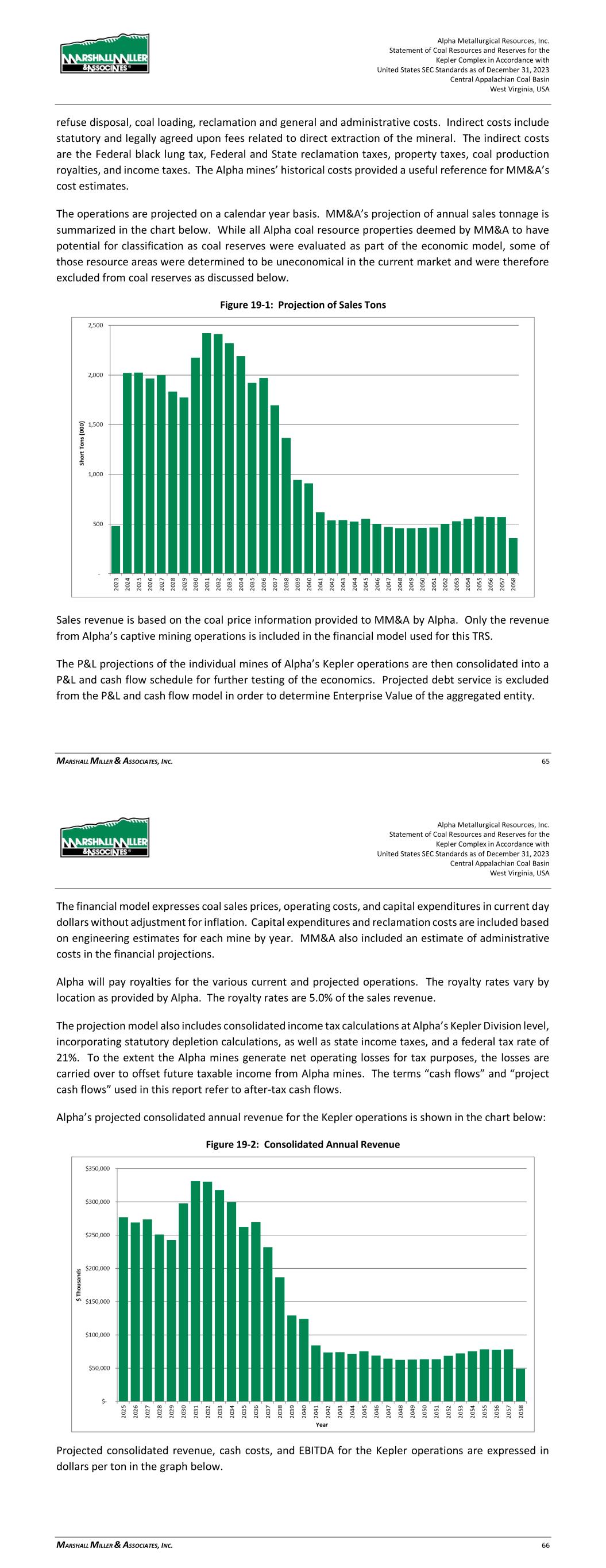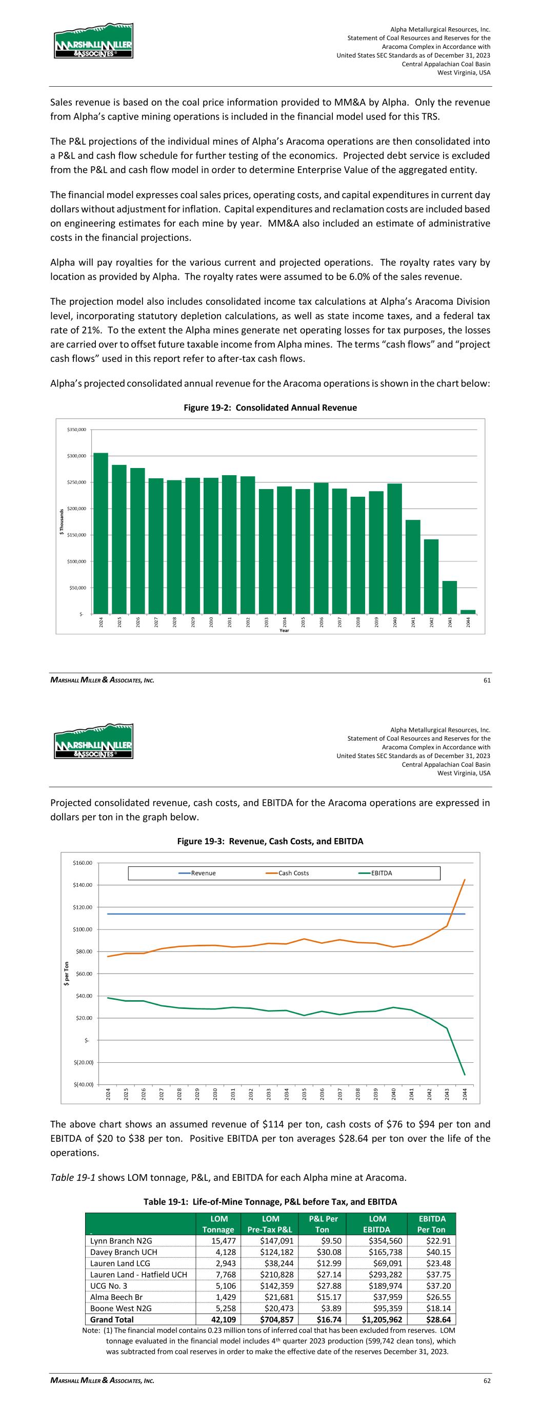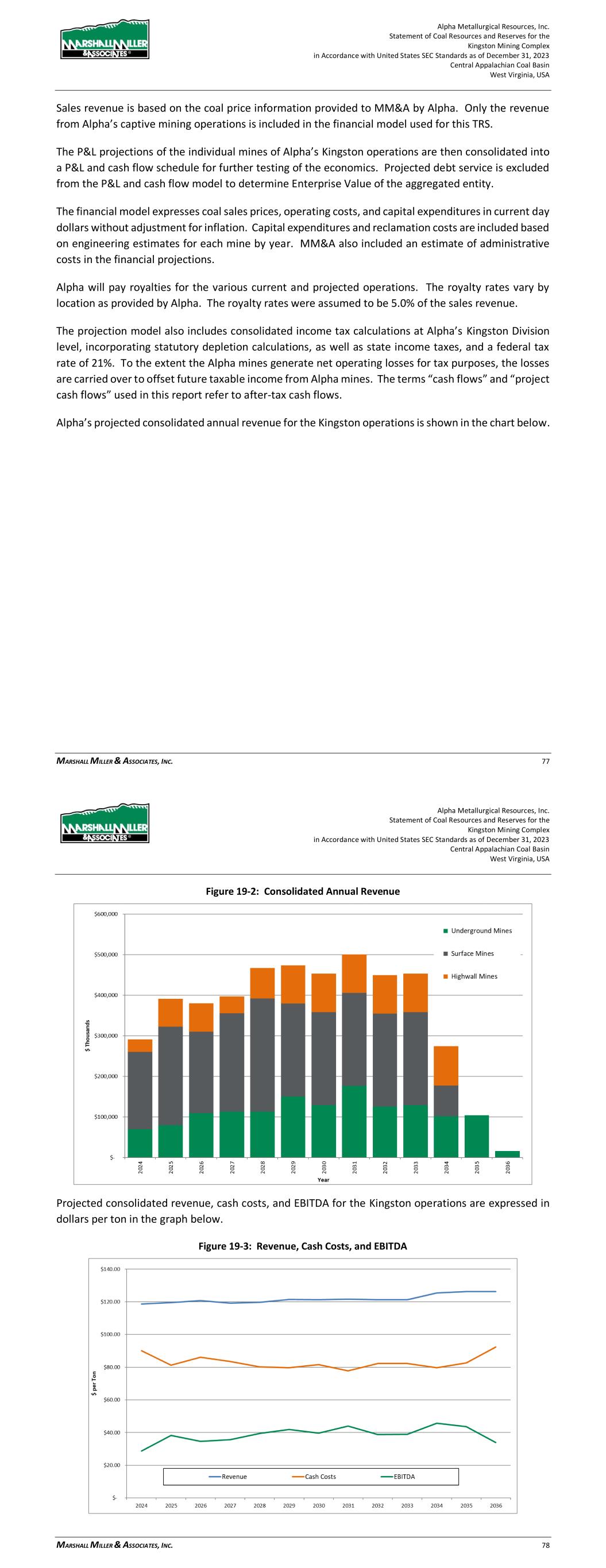 Alpha Metallurgical Resources, Inc. Statement of Coal Resources and Reserves for the Elk Run Underground Complex in Accordance with United States SEC Standards as of December 31, 2023 Central Appalachian Coal Basin West Virginia, USA MARSHALL MILLER & ASSOCIATES, INC. 64 on engineering estimates for each mine by year. MM&A also included an estimate of administrative costs in the financial projections. Alpha will pay royalties for the various current and projected operations. The royalty rates vary by location as provided by Alpha. The royalty rates were assumed to be 6.0% of the sales revenue. The projection model also includes consolidated income tax calculations at Alpha’s Elk Run Division level, incorporating statutory depletion calculations, as well as state income taxes, and a federal tax rate of 21%. To the extent the Alpha mines generate net operating losses for tax purposes, the losses are carried over to offset future taxable income from Alpha mines. The terms “cash flows” and “project cash flows” used in this report refer to after-tax cash flows. Alpha’s projected consolidated annual revenue for the Elk Run operations is shown in the chart below: Figure 19-2: Consolidated Annual Revenue Projected consolidated revenue, cash costs, and EBITDA for the Elk Run operations are expressed in dollars per ton in the graph below. Alpha Metallurgical Resources, Inc. Statement of Coal Resources and Reserves for the Elk Run Underground Complex in Accordance with United States SEC Standards as of December 31, 2023 Central Appalachian Coal Basin West Virginia, USA MARSHALL MILLER & ASSOCIATES, INC. 65 Figure 19-3: Revenue, Cash Costs, and EBITDA The above chart shows an average LOM revenue of $114 per ton, cash costs of $91 to $106 per ton and EBITDA of $8 to $23 per ton at steady state. Positive EBITDA per ton averages $16.26 per ton over the life of the operations. Table 19-1 shows LOM tonnage, P&L, and EBITDA for each Alpha mine at Elk Run. Table 19-1: Life-of-Mine Tonnage, P&L before Tax, and EBITDA LOM Tonnage LOM Pre-Tax P&L P&L Per Ton LOM EBITDA EBITDA Per Ton Castle Peerless* - $0 $- $0 $- Checkmate Powellton 28,457 $40,698 $1.43 $462,803 $16.26 Consolidated Deep Mines 28,457 $40,698 $1.43 $462,803 $16.26 Note: * This resource area failed to achieve positive results in the economic evaluation. Therefore, the coal tons and negative economic results have been excluded from the estimate of coal reserves in this TRS and economic summary above. ** LOM tonnage evaluated in the financial model includes 4th quarter 2023 production (22,902 clean tons), which was subtracted from coal reserves in order to make the effective date of the reserves December 31, 2023. As shown in Table 19-1, the Alpha consolidated Elk Run operations show positive LOM P&L and EBITDA of $40.7 million and $462.8 million, respectively. A breakdown of projected EBITDA for the consolidated Elk Run operations is shown in the chart below: