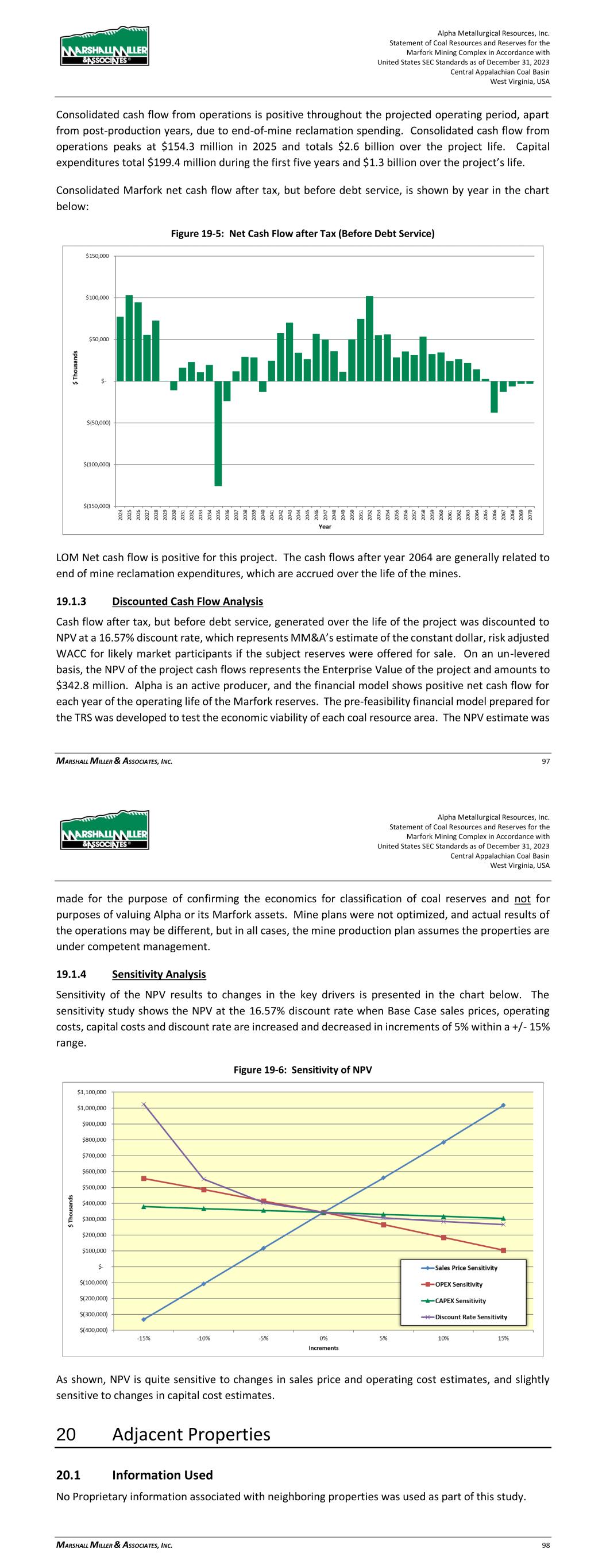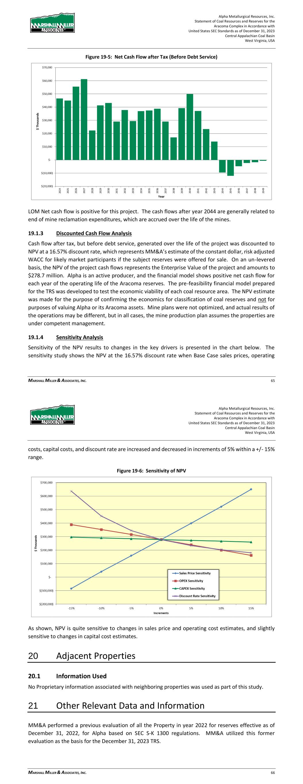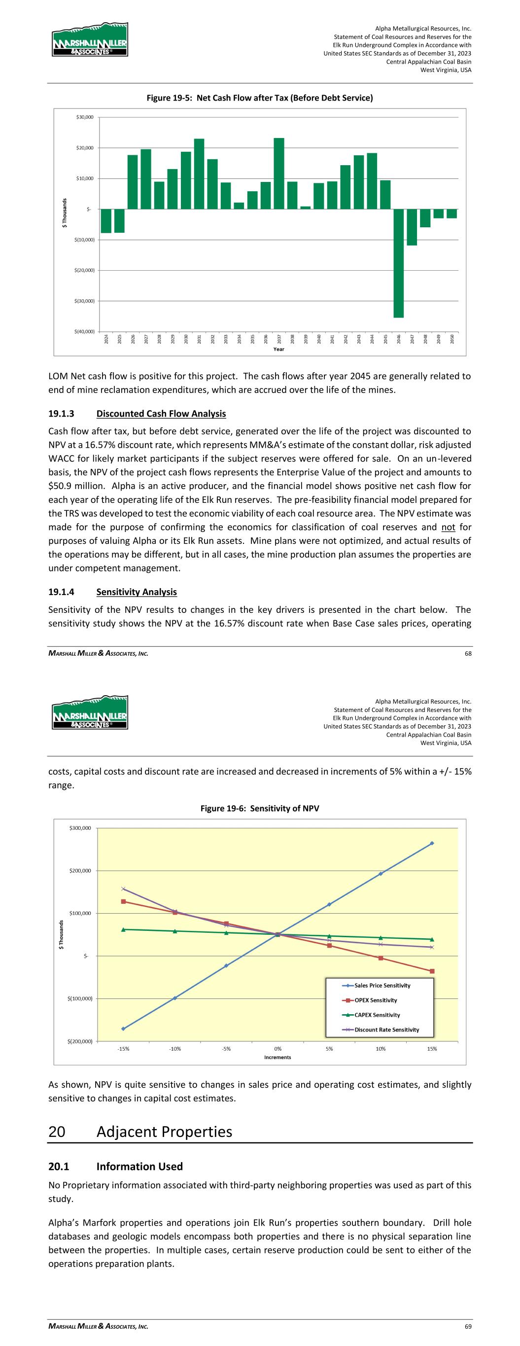 Alpha Metallurgical Resources, Inc. Statement of Coal Resources and Reserves for the Elk Run Underground Complex in Accordance with United States SEC Standards as of December 31, 2023 Central Appalachian Coal Basin West Virginia, USA MARSHALL MILLER & ASSOCIATES, INC. 68 Figure 19-5: Net Cash Flow after Tax (Before Debt Service) LOM Net cash flow is positive for this project. The cash flows after year 2045 are generally related to end of mine reclamation expenditures, which are accrued over the life of the mines. 19.1.3 Discounted Cash Flow Analysis Cash flow after tax, but before debt service, generated over the life of the project was discounted to NPV at a 16.57% discount rate, which represents MM&A’s estimate of the constant dollar, risk adjusted WACC for likely market participants if the subject reserves were offered for sale. On an un-levered basis, the NPV of the project cash flows represents the Enterprise Value of the project and amounts to $50.9 million. Alpha is an active producer, and the financial model shows positive net cash flow for each year of the operating life of the Elk Run reserves. The pre-feasibility financial model prepared for the TRS was developed to test the economic viability of each coal resource area. The NPV estimate was made for the purpose of confirming the economics for classification of coal reserves and not for purposes of valuing Alpha or its Elk Run assets. Mine plans were not optimized, and actual results of the operations may be different, but in all cases, the mine production plan assumes the properties are under competent management. 19.1.4 Sensitivity Analysis Sensitivity of the NPV results to changes in the key drivers is presented in the chart below. The sensitivity study shows the NPV at the 16.57% discount rate when Base Case sales prices, operating Alpha Metallurgical Resources, Inc. Statement of Coal Resources and Reserves for the Elk Run Underground Complex in Accordance with United States SEC Standards as of December 31, 2023 Central Appalachian Coal Basin West Virginia, USA MARSHALL MILLER & ASSOCIATES, INC. 69 costs, capital costs and discount rate are increased and decreased in increments of 5% within a +/- 15% range. Figure 19-6: Sensitivity of NPV As shown, NPV is quite sensitive to changes in sales price and operating cost estimates, and slightly sensitive to changes in capital cost estimates. 20 Adjacent Properties 20.1 Information Used No Proprietary information associated with third-party neighboring properties was used as part of this study. Alpha’s Marfork properties and operations join Elk Run’s properties southern boundary. Drill hole databases and geologic models encompass both properties and there is no physical separation line between the properties. In multiple cases, certain reserve production could be sent to either of the operations preparation plants.