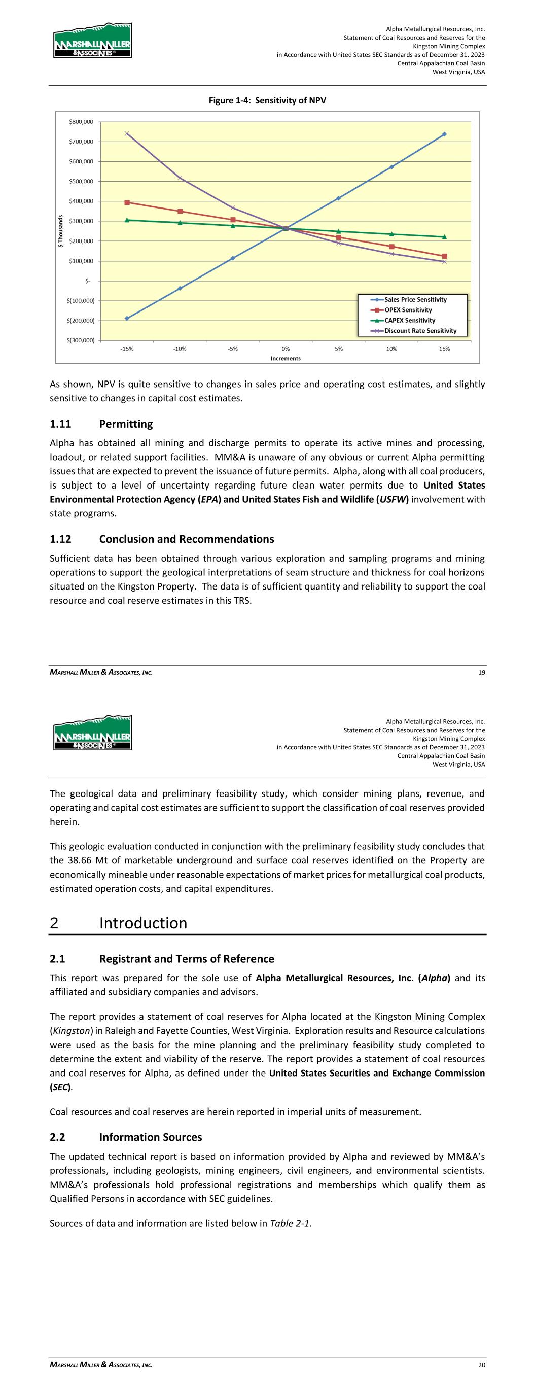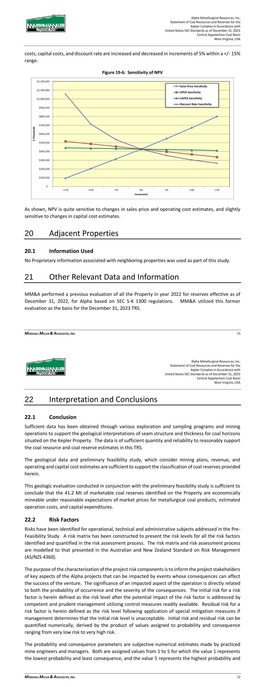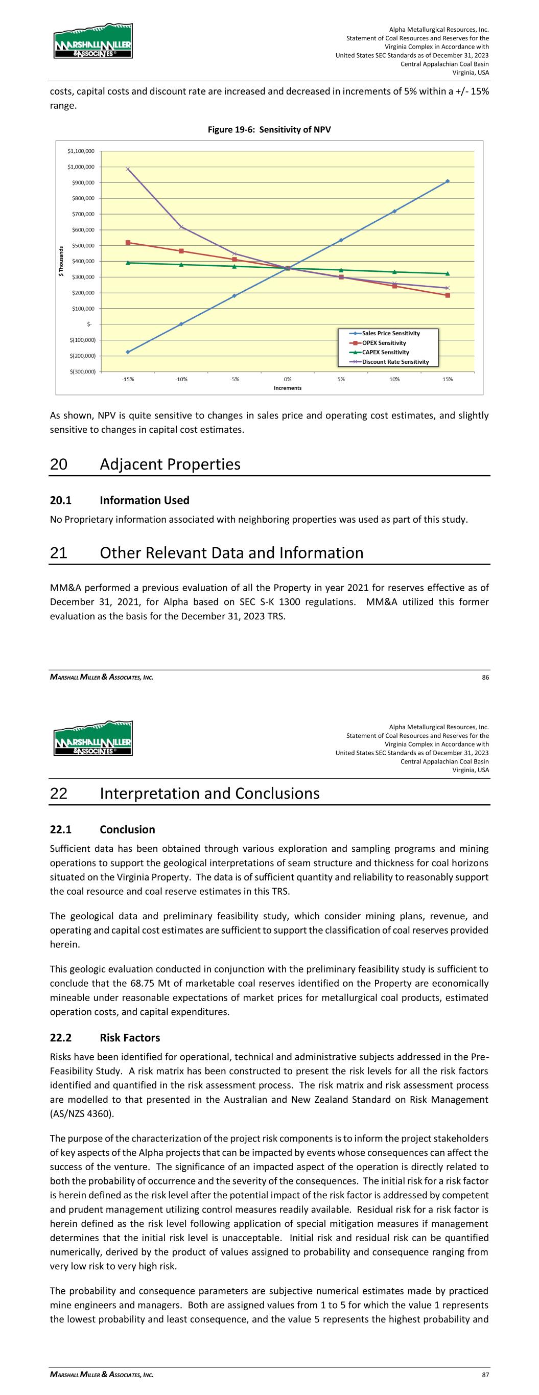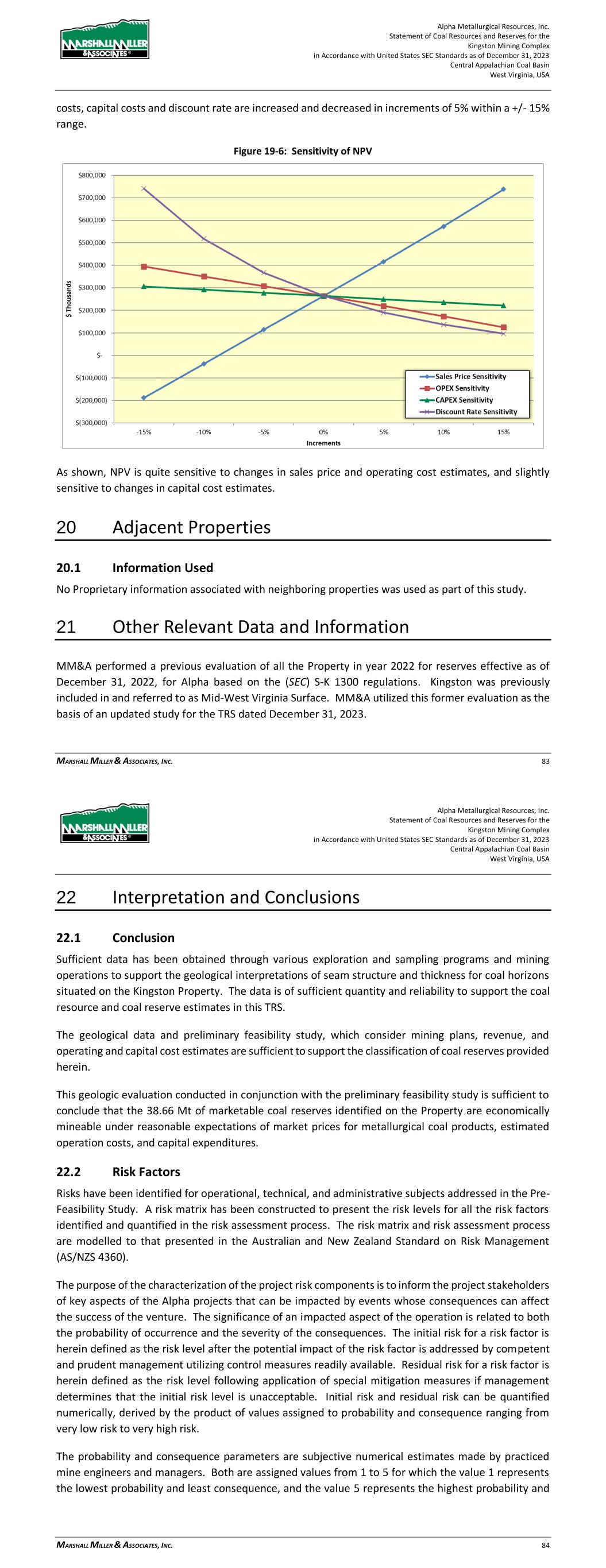 Alpha Metallurgical Resources, Inc. Statement of Coal Resources and Reserves for the Elk Run Underground Complex in Accordance with United States SEC Standards as of December 31, 2023 Central Appalachian Coal Basin West Virginia, USA MARSHALL MILLER & ASSOCIATES, INC. 68 Figure 19-5: Net Cash Flow after Tax (Before Debt Service) LOM Net cash flow is positive for this project. The cash flows after year 2045 are generally related to end of mine reclamation expenditures, which are accrued over the life of the mines. 19.1.3 Discounted Cash Flow Analysis Cash flow after tax, but before debt service, generated over the life of the project was discounted to NPV at a 16.57% discount rate, which represents MM&A’s estimate of the constant dollar, risk adjusted WACC for likely market participants if the subject reserves were offered for sale. On an un-levered basis, the NPV of the project cash flows represents the Enterprise Value of the project and amounts to $50.9 million. Alpha is an active producer, and the financial model shows positive net cash flow for each year of the operating life of the Elk Run reserves. The pre-feasibility financial model prepared for the TRS was developed to test the economic viability of each coal resource area. The NPV estimate was made for the purpose of confirming the economics for classification of coal reserves and not for purposes of valuing Alpha or its Elk Run assets. Mine plans were not optimized, and actual results of the operations may be different, but in all cases, the mine production plan assumes the properties are under competent management. 19.1.4 Sensitivity Analysis Sensitivity of the NPV results to changes in the key drivers is presented in the chart below. The sensitivity study shows the NPV at the 16.57% discount rate when Base Case sales prices, operating Alpha Metallurgical Resources, Inc. Statement of Coal Resources and Reserves for the Elk Run Underground Complex in Accordance with United States SEC Standards as of December 31, 2023 Central Appalachian Coal Basin West Virginia, USA MARSHALL MILLER & ASSOCIATES, INC. 69 costs, capital costs and discount rate are increased and decreased in increments of 5% within a +/- 15% range. Figure 19-6: Sensitivity of NPV As shown, NPV is quite sensitive to changes in sales price and operating cost estimates, and slightly sensitive to changes in capital cost estimates. 20 Adjacent Properties 20.1 Information Used No Proprietary information associated with third-party neighboring properties was used as part of this study. Alpha’s Marfork properties and operations join Elk Run’s properties southern boundary. Drill hole databases and geologic models encompass both properties and there is no physical separation line between the properties. In multiple cases, certain reserve production could be sent to either of the operations preparation plants.