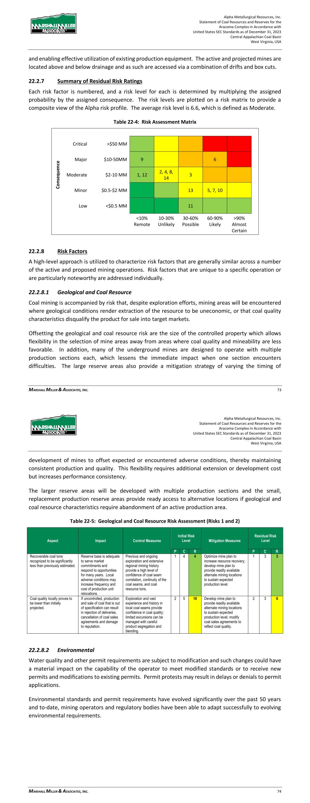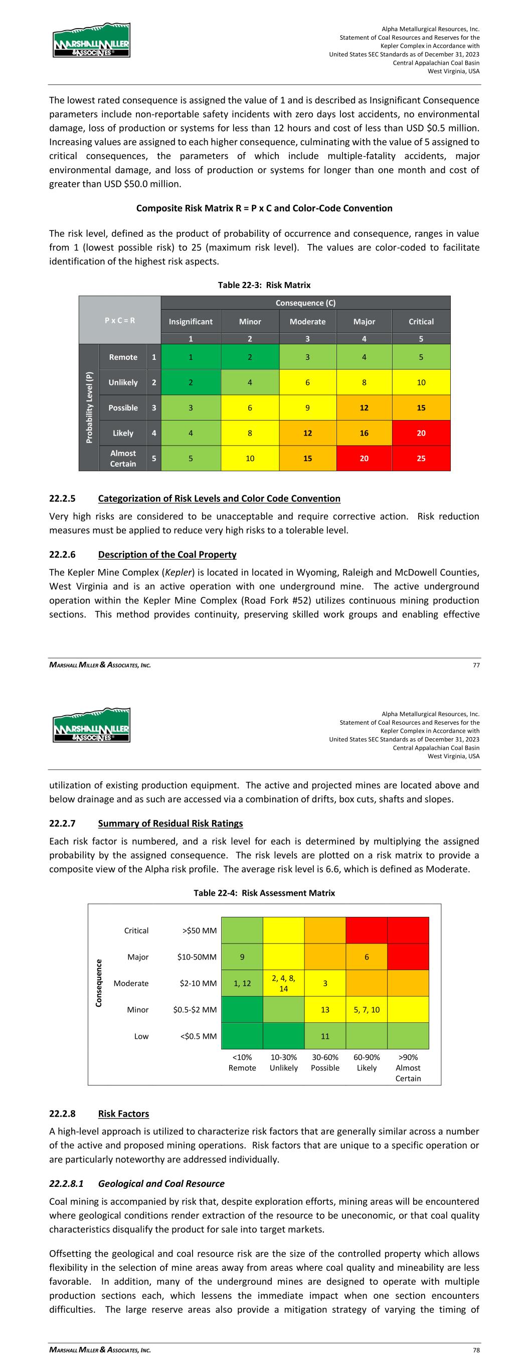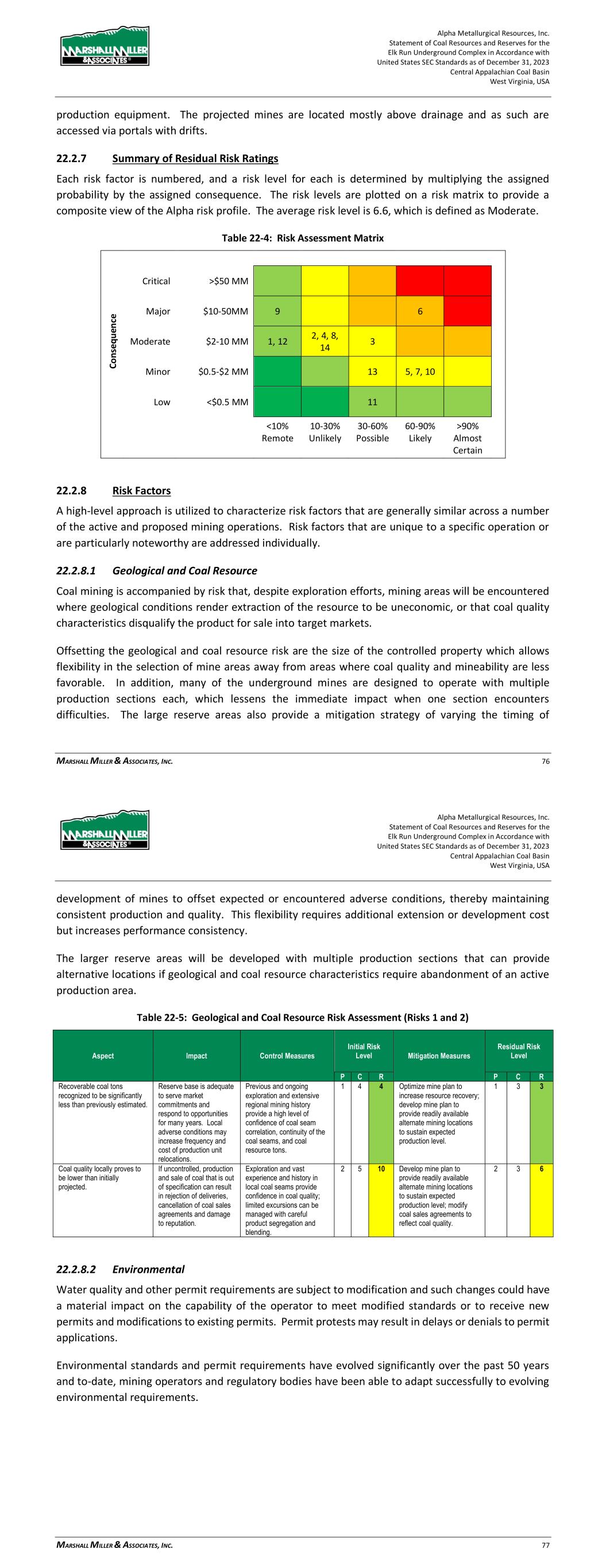 Alpha Metallurgical Resources, Inc. Statement of Coal Resources and Reserves for the Elk Run Underground Complex in Accordance with United States SEC Standards as of December 31, 2023 Central Appalachian Coal Basin West Virginia, USA MARSHALL MILLER & ASSOCIATES, INC. 76 production equipment. The projected mines are located mostly above drainage and as such are accessed via portals with drifts. 22.2.7 Summary of Residual Risk Ratings Each risk factor is numbered, and a risk level for each is determined by multiplying the assigned probability by the assigned consequence. The risk levels are plotted on a risk matrix to provide a composite view of the Alpha risk profile. The average risk level is 6.6, which is defined as Moderate. Table 22-4: Risk Assessment Matrix C o n se q u en ce Critical >$50 MM Major $10-50MM 9 6 Moderate $2-10 MM 1, 12 2, 4, 8, 14 3 Minor $0.5-$2 MM 13 5, 7, 10 Low <$0.5 MM 11 <10% 10-30% 30-60% 60-90% >90% Remote Unlikely Possible Likely Almost Certain 22.2.8 Risk Factors A high-level approach is utilized to characterize risk factors that are generally similar across a number of the active and proposed mining operations. Risk factors that are unique to a specific operation or are particularly noteworthy are addressed individually. 22.2.8.1 Geological and Coal Resource Coal mining is accompanied by risk that, despite exploration efforts, mining areas will be encountered where geological conditions render extraction of the resource to be uneconomic, or that coal quality characteristics disqualify the product for sale into target markets. Offsetting the geological and coal resource risk are the size of the controlled property which allows flexibility in the selection of mine areas away from areas where coal quality and mineability are less favorable. In addition, many of the underground mines are designed to operate with multiple production sections each, which lessens the immediate impact when one section encounters difficulties. The large reserve areas also provide a mitigation strategy of varying the timing of Alpha Metallurgical Resources, Inc. Statement of Coal Resources and Reserves for the Elk Run Underground Complex in Accordance with United States SEC Standards as of December 31, 2023 Central Appalachian Coal Basin West Virginia, USA MARSHALL MILLER & ASSOCIATES, INC. 77 development of mines to offset expected or encountered adverse conditions, thereby maintaining consistent production and quality. This flexibility requires additional extension or development cost but increases performance consistency. The larger reserve areas will be developed with multiple production sections that can provide alternative locations if geological and coal resource characteristics require abandonment of an active production area. Table 22-5: Geological and Coal Resource Risk Assessment (Risks 1 and 2) Aspect Impact Control Measures Initial Risk Level Mitigation Measures Residual Risk Level P C R P C R Recoverable coal tons recognized to be significantly less than previously estimated. Reserve base is adequate to serve market commitments and respond to opportunities for many years. Local adverse conditions may increase frequency and cost of production unit relocations. Previous and ongoing exploration and extensive regional mining history provide a high level of confidence of coal seam correlation, continuity of the coal seams, and coal resource tons. 1 4 4 Optimize mine plan to increase resource recovery; develop mine plan to provide readily available alternate mining locations to sustain expected production level. 1 3 3 Coal quality locally proves to be lower than initially projected. If uncontrolled, production and sale of coal that is out of specification can result in rejection of deliveries, cancellation of coal sales agreements and damage to reputation. Exploration and vast experience and history in local coal seams provide confidence in coal quality; limited excursions can be managed with careful product segregation and blending. 2 5 10 Develop mine plan to provide readily available alternate mining locations to sustain expected production level; modify coal sales agreements to reflect coal quality. 2 3 6 22.2.8.2 Environmental Water quality and other permit requirements are subject to modification and such changes could have a material impact on the capability of the operator to meet modified standards or to receive new permits and modifications to existing permits. Permit protests may result in delays or denials to permit applications. Environmental standards and permit requirements have evolved significantly over the past 50 years and to-date, mining operators and regulatory bodies have been able to adapt successfully to evolving environmental requirements.
