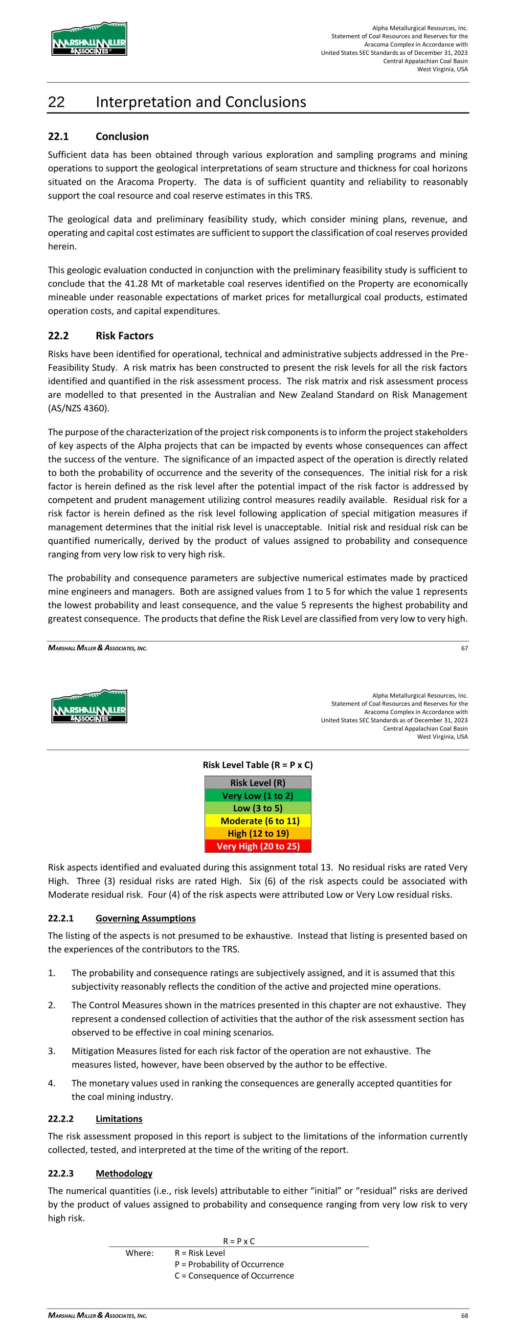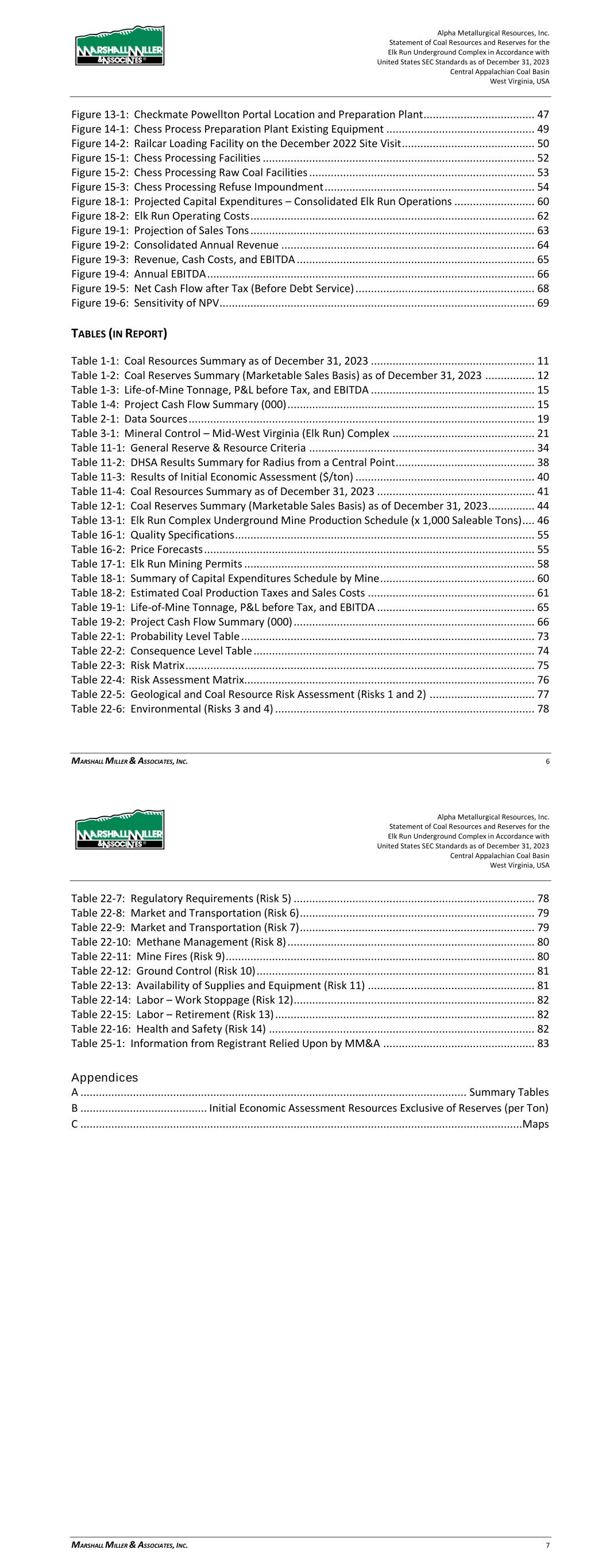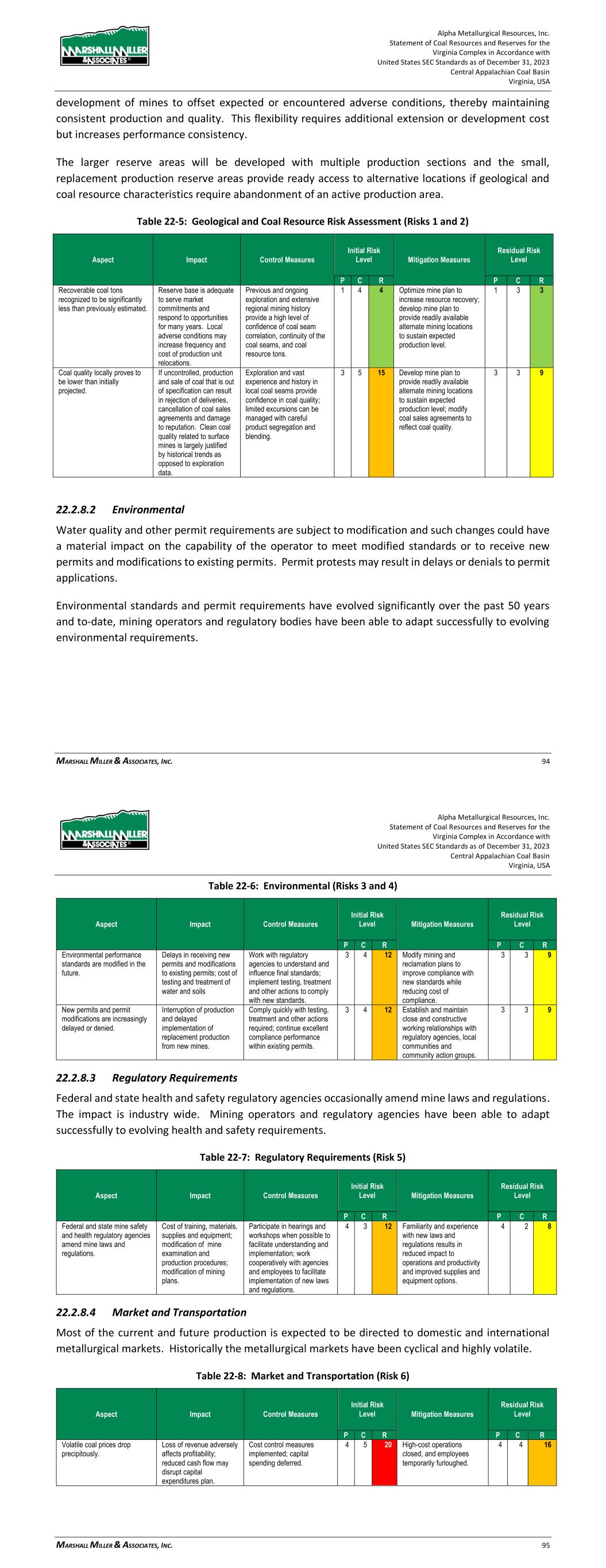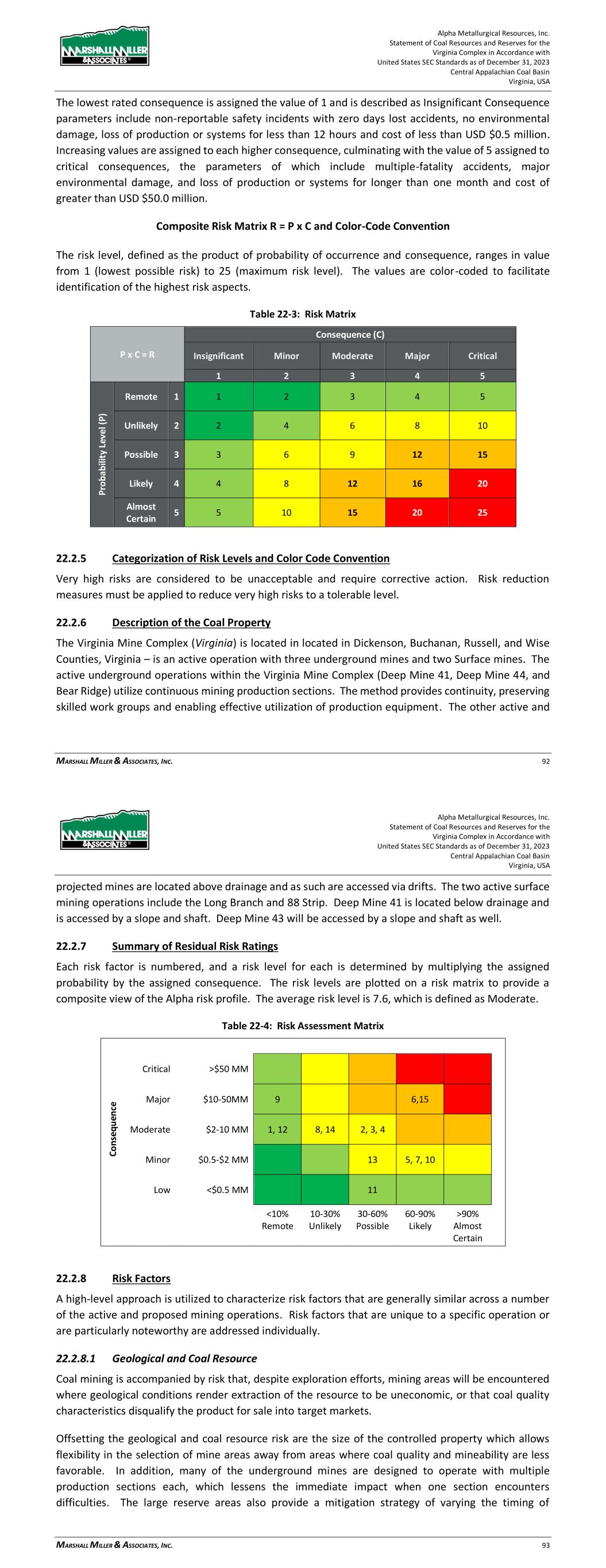 Alpha Metallurgical Resources, Inc. Statement of Coal Resources and Reserves for the Elk Run Underground Complex in Accordance with United States SEC Standards as of December 31, 2023 Central Appalachian Coal Basin West Virginia, USA MARSHALL MILLER & ASSOCIATES, INC. 76 production equipment. The projected mines are located mostly above drainage and as such are accessed via portals with drifts. 22.2.7 Summary of Residual Risk Ratings Each risk factor is numbered, and a risk level for each is determined by multiplying the assigned probability by the assigned consequence. The risk levels are plotted on a risk matrix to provide a composite view of the Alpha risk profile. The average risk level is 6.6, which is defined as Moderate. Table 22-4: Risk Assessment Matrix C o n se q u en ce Critical >$50 MM Major $10-50MM 9 6 Moderate $2-10 MM 1, 12 2, 4, 8, 14 3 Minor $0.5-$2 MM 13 5, 7, 10 Low <$0.5 MM 11 <10% 10-30% 30-60% 60-90% >90% Remote Unlikely Possible Likely Almost Certain 22.2.8 Risk Factors A high-level approach is utilized to characterize risk factors that are generally similar across a number of the active and proposed mining operations. Risk factors that are unique to a specific operation or are particularly noteworthy are addressed individually. 22.2.8.1 Geological and Coal Resource Coal mining is accompanied by risk that, despite exploration efforts, mining areas will be encountered where geological conditions render extraction of the resource to be uneconomic, or that coal quality characteristics disqualify the product for sale into target markets. Offsetting the geological and coal resource risk are the size of the controlled property which allows flexibility in the selection of mine areas away from areas where coal quality and mineability are less favorable. In addition, many of the underground mines are designed to operate with multiple production sections each, which lessens the immediate impact when one section encounters difficulties. The large reserve areas also provide a mitigation strategy of varying the timing of Alpha Metallurgical Resources, Inc. Statement of Coal Resources and Reserves for the Elk Run Underground Complex in Accordance with United States SEC Standards as of December 31, 2023 Central Appalachian Coal Basin West Virginia, USA MARSHALL MILLER & ASSOCIATES, INC. 77 development of mines to offset expected or encountered adverse conditions, thereby maintaining consistent production and quality. This flexibility requires additional extension or development cost but increases performance consistency. The larger reserve areas will be developed with multiple production sections that can provide alternative locations if geological and coal resource characteristics require abandonment of an active production area. Table 22-5: Geological and Coal Resource Risk Assessment (Risks 1 and 2) Aspect Impact Control Measures Initial Risk Level Mitigation Measures Residual Risk Level P C R P C R Recoverable coal tons recognized to be significantly less than previously estimated. Reserve base is adequate to serve market commitments and respond to opportunities for many years. Local adverse conditions may increase frequency and cost of production unit relocations. Previous and ongoing exploration and extensive regional mining history provide a high level of confidence of coal seam correlation, continuity of the coal seams, and coal resource tons. 1 4 4 Optimize mine plan to increase resource recovery; develop mine plan to provide readily available alternate mining locations to sustain expected production level. 1 3 3 Coal quality locally proves to be lower than initially projected. If uncontrolled, production and sale of coal that is out of specification can result in rejection of deliveries, cancellation of coal sales agreements and damage to reputation. Exploration and vast experience and history in local coal seams provide confidence in coal quality; limited excursions can be managed with careful product segregation and blending. 2 5 10 Develop mine plan to provide readily available alternate mining locations to sustain expected production level; modify coal sales agreements to reflect coal quality. 2 3 6 22.2.8.2 Environmental Water quality and other permit requirements are subject to modification and such changes could have a material impact on the capability of the operator to meet modified standards or to receive new permits and modifications to existing permits. Permit protests may result in delays or denials to permit applications. Environmental standards and permit requirements have evolved significantly over the past 50 years and to-date, mining operators and regulatory bodies have been able to adapt successfully to evolving environmental requirements.
