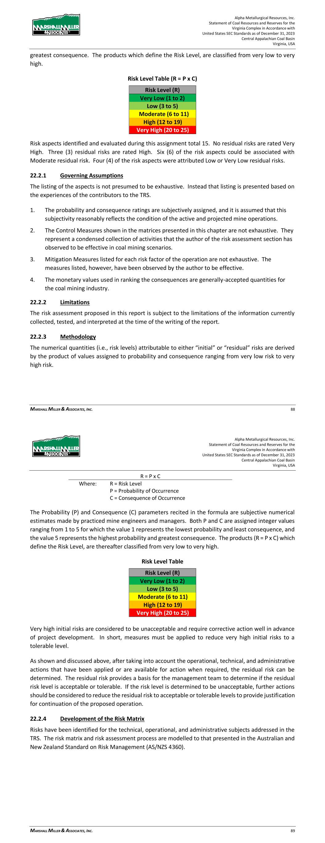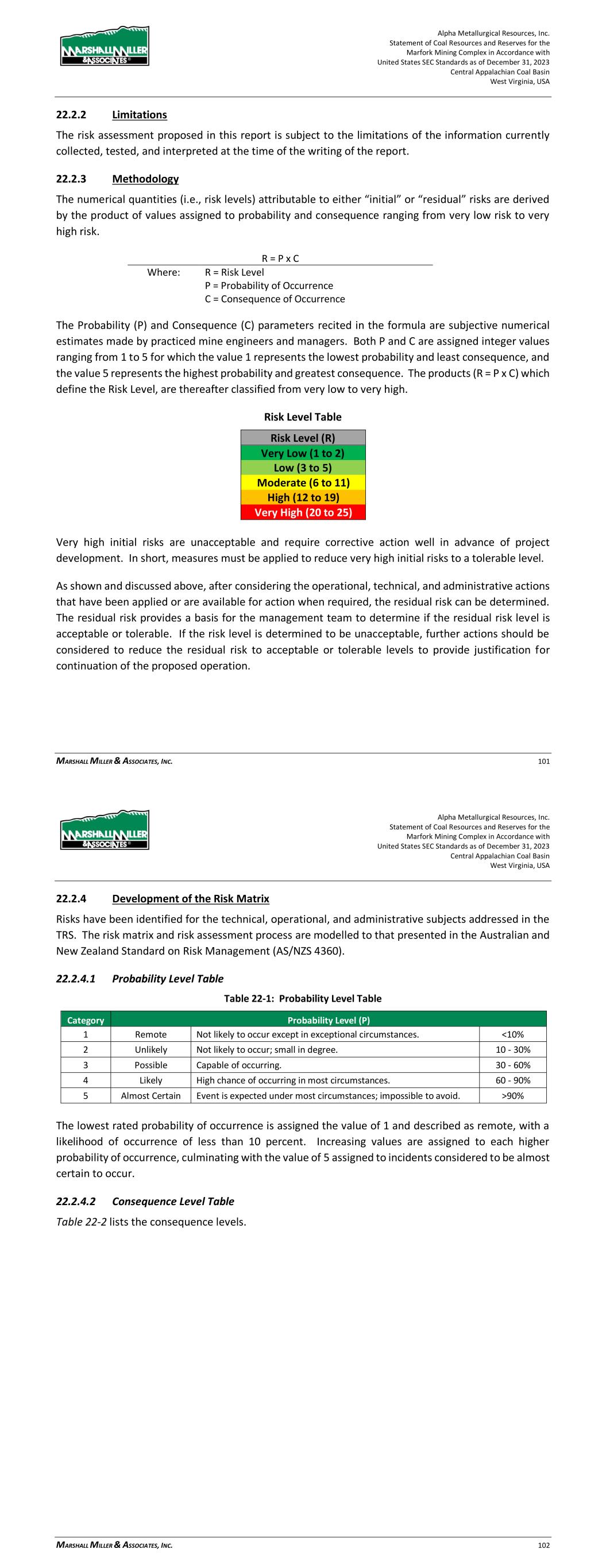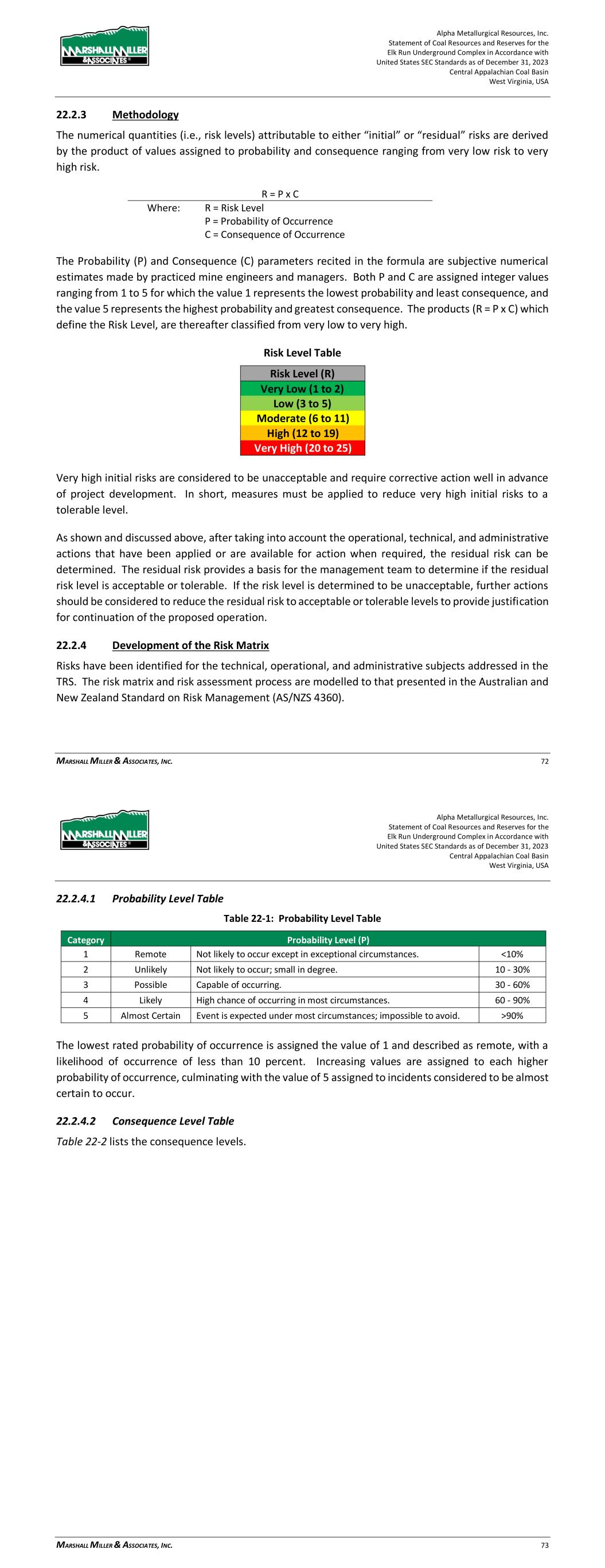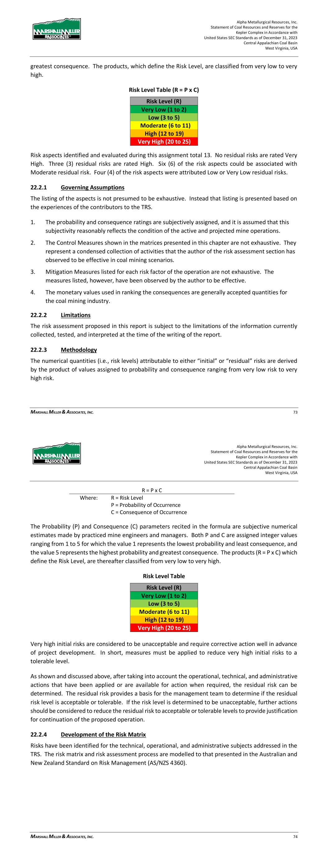 Alpha Metallurgical Resources, Inc. Statement of Coal Resources and Reserves for the Elk Run Underground Complex in Accordance with United States SEC Standards as of December 31, 2023 Central Appalachian Coal Basin West Virginia, USA MARSHALL MILLER & ASSOCIATES, INC. 72 22.2.3 Methodology The numerical quantities (i.e., risk levels) attributable to either “initial” or “residual” risks are derived by the product of values assigned to probability and consequence ranging from very low risk to very high risk. R = P x C Where: R = Risk Level P = Probability of Occurrence C = Consequence of Occurrence The Probability (P) and Consequence (C) parameters recited in the formula are subjective numerical estimates made by practiced mine engineers and managers. Both P and C are assigned integer values ranging from 1 to 5 for which the value 1 represents the lowest probability and least consequence, and the value 5 represents the highest probability and greatest consequence. The products (R = P x C) which define the Risk Level, are thereafter classified from very low to very high. Risk Level Table Risk Level (R) Very Low (1 to 2) Low (3 to 5) Moderate (6 to 11) High (12 to 19) Very High (20 to 25) Very high initial risks are considered to be unacceptable and require corrective action well in advance of project development. In short, measures must be applied to reduce very high initial risks to a tolerable level. As shown and discussed above, after taking into account the operational, technical, and administrative actions that have been applied or are available for action when required, the residual risk can be determined. The residual risk provides a basis for the management team to determine if the residual risk level is acceptable or tolerable. If the risk level is determined to be unacceptable, further actions should be considered to reduce the residual risk to acceptable or tolerable levels to provide justification for continuation of the proposed operation. 22.2.4 Development of the Risk Matrix Risks have been identified for the technical, operational, and administrative subjects addressed in the TRS. The risk matrix and risk assessment process are modelled to that presented in the Australian and New Zealand Standard on Risk Management (AS/NZS 4360). Alpha Metallurgical Resources, Inc. Statement of Coal Resources and Reserves for the Elk Run Underground Complex in Accordance with United States SEC Standards as of December 31, 2023 Central Appalachian Coal Basin West Virginia, USA MARSHALL MILLER & ASSOCIATES, INC. 73 22.2.4.1 Probability Level Table Table 22-1: Probability Level Table Category Probability Level (P) 1 Remote Not likely to occur except in exceptional circumstances. <10% 2 Unlikely Not likely to occur; small in degree. 10 - 30% 3 Possible Capable of occurring. 30 - 60% 4 Likely High chance of occurring in most circumstances. 60 - 90% 5 Almost Certain Event is expected under most circumstances; impossible to avoid. >90% The lowest rated probability of occurrence is assigned the value of 1 and described as remote, with a likelihood of occurrence of less than 10 percent. Increasing values are assigned to each higher probability of occurrence, culminating with the value of 5 assigned to incidents considered to be almost certain to occur. 22.2.4.2 Consequence Level Table Table 22-2 lists the consequence levels.