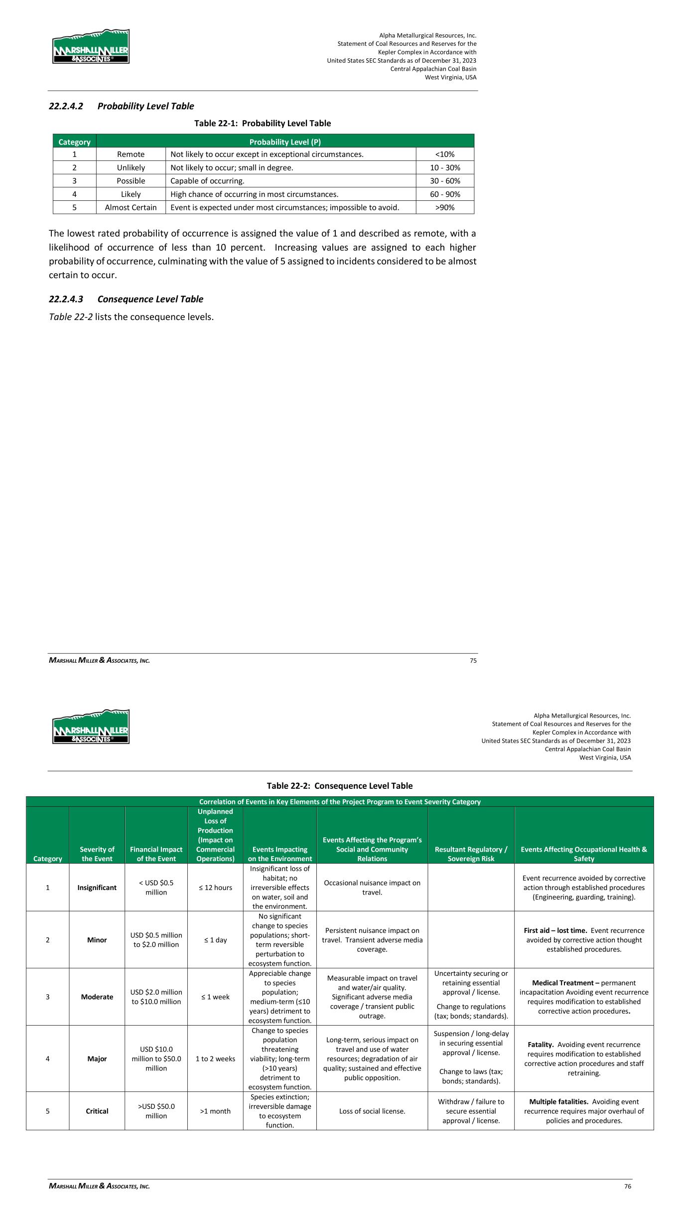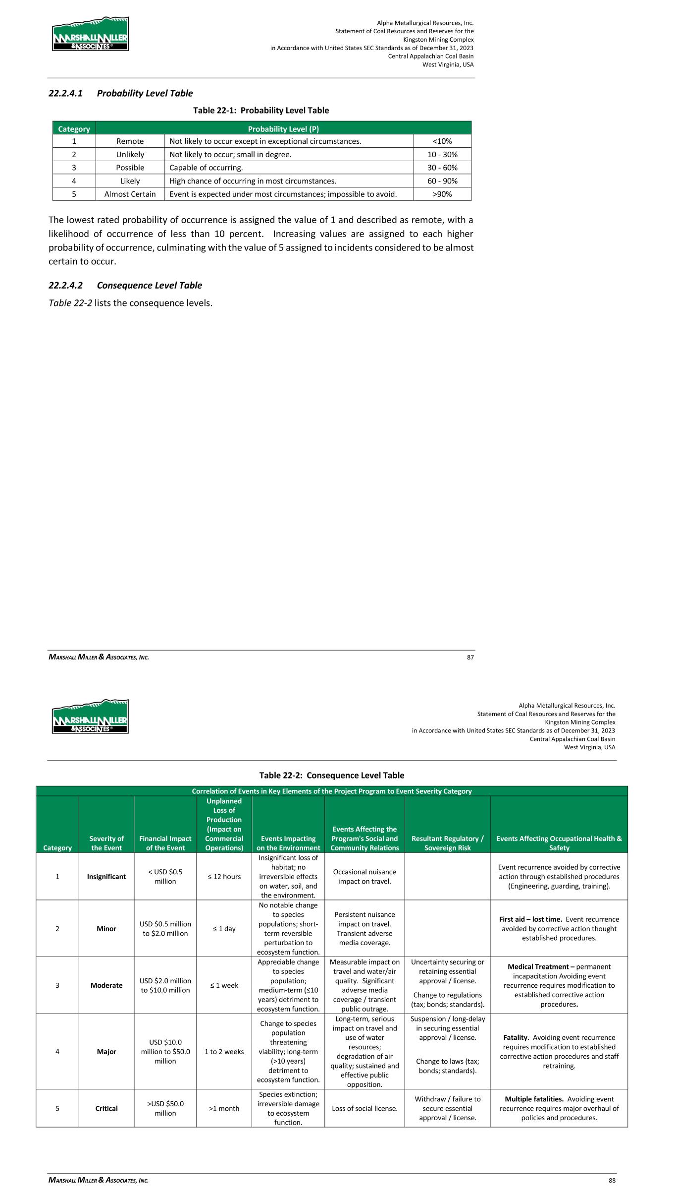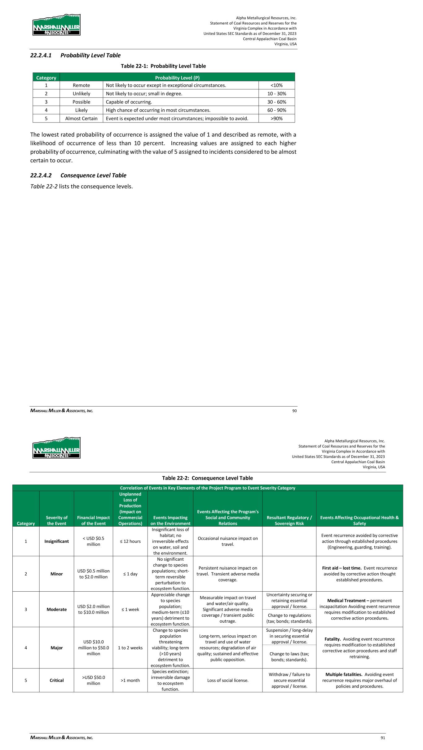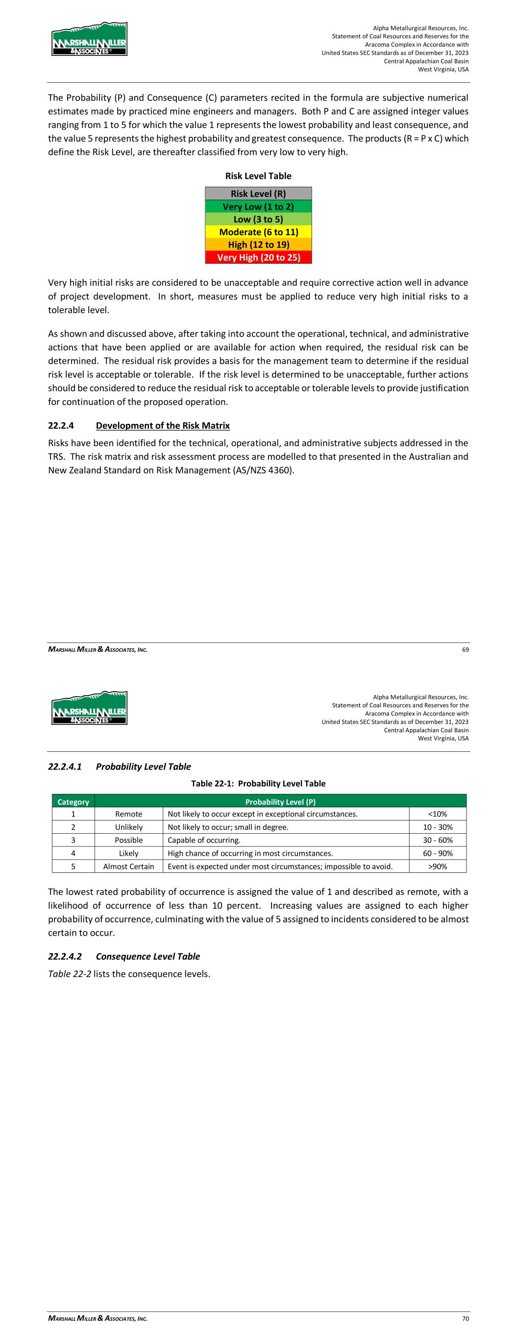 Alpha Metallurgical Resources, Inc. Statement of Coal Resources and Reserves for the Elk Run Underground Complex in Accordance with United States SEC Standards as of December 31, 2023 Central Appalachian Coal Basin West Virginia, USA MARSHALL MILLER & ASSOCIATES, INC. 72 22.2.3 Methodology The numerical quantities (i.e., risk levels) attributable to either “initial” or “residual” risks are derived by the product of values assigned to probability and consequence ranging from very low risk to very high risk. R = P x C Where: R = Risk Level P = Probability of Occurrence C = Consequence of Occurrence The Probability (P) and Consequence (C) parameters recited in the formula are subjective numerical estimates made by practiced mine engineers and managers. Both P and C are assigned integer values ranging from 1 to 5 for which the value 1 represents the lowest probability and least consequence, and the value 5 represents the highest probability and greatest consequence. The products (R = P x C) which define the Risk Level, are thereafter classified from very low to very high. Risk Level Table Risk Level (R) Very Low (1 to 2) Low (3 to 5) Moderate (6 to 11) High (12 to 19) Very High (20 to 25) Very high initial risks are considered to be unacceptable and require corrective action well in advance of project development. In short, measures must be applied to reduce very high initial risks to a tolerable level. As shown and discussed above, after taking into account the operational, technical, and administrative actions that have been applied or are available for action when required, the residual risk can be determined. The residual risk provides a basis for the management team to determine if the residual risk level is acceptable or tolerable. If the risk level is determined to be unacceptable, further actions should be considered to reduce the residual risk to acceptable or tolerable levels to provide justification for continuation of the proposed operation. 22.2.4 Development of the Risk Matrix Risks have been identified for the technical, operational, and administrative subjects addressed in the TRS. The risk matrix and risk assessment process are modelled to that presented in the Australian and New Zealand Standard on Risk Management (AS/NZS 4360). Alpha Metallurgical Resources, Inc. Statement of Coal Resources and Reserves for the Elk Run Underground Complex in Accordance with United States SEC Standards as of December 31, 2023 Central Appalachian Coal Basin West Virginia, USA MARSHALL MILLER & ASSOCIATES, INC. 73 22.2.4.1 Probability Level Table Table 22-1: Probability Level Table Category Probability Level (P) 1 Remote Not likely to occur except in exceptional circumstances. <10% 2 Unlikely Not likely to occur; small in degree. 10 - 30% 3 Possible Capable of occurring. 30 - 60% 4 Likely High chance of occurring in most circumstances. 60 - 90% 5 Almost Certain Event is expected under most circumstances; impossible to avoid. >90% The lowest rated probability of occurrence is assigned the value of 1 and described as remote, with a likelihood of occurrence of less than 10 percent. Increasing values are assigned to each higher probability of occurrence, culminating with the value of 5 assigned to incidents considered to be almost certain to occur. 22.2.4.2 Consequence Level Table Table 22-2 lists the consequence levels.