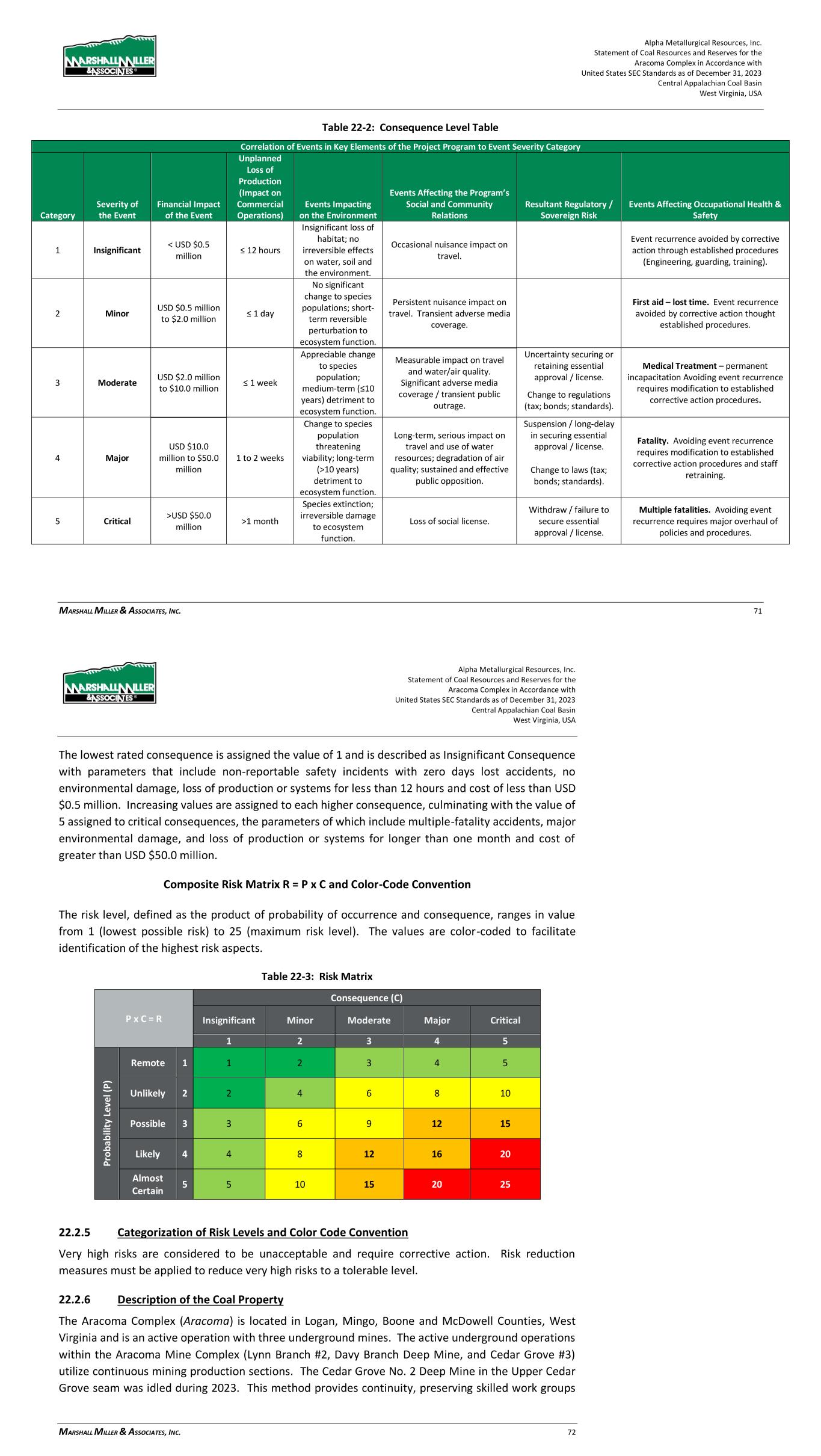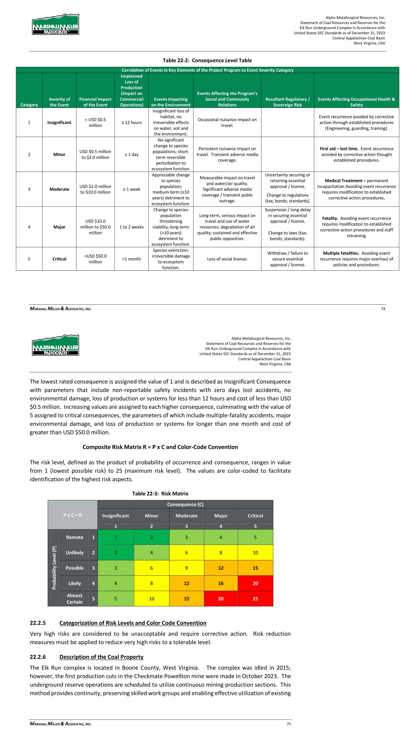 Alpha Metallurgical Resources, Inc. Statement of Coal Resources and Reserves for the Elk Run Underground Complex in Accordance with United States SEC Standards as of December 31, 2023 Central Appalachian Coal Basin West Virginia, USA MARSHALL MILLER & ASSOCIATES, INC. 74 Table 22-2: Consequence Level Table Correlation of Events in Key Elements of the Project Program to Event Severity Category Category Severity of the Event Financial Impact of the Event Unplanned Loss of Production (Impact on Commercial Operations) Events Impacting on the Environment Events Affecting the Program’s Social and Community Relations Resultant Regulatory / Sovereign Risk Events Affecting Occupational Health & Safety 1 Insignificant < USD $0.5 million ≤ 12 hours Insignificant loss of habitat; no irreversible effects on water, soil and the environment. Occasional nuisance impact on travel. Event recurrence avoided by corrective action through established procedures (Engineering, guarding, training). 2 Minor USD $0.5 million to $2.0 million ≤ 1 day No significant change to species populations; short- term reversible perturbation to ecosystem function. Persistent nuisance impact on travel. Transient adverse media coverage. First aid – lost time. Event recurrence avoided by corrective action thought established procedures. 3 Moderate USD $2.0 million to $10.0 million ≤ 1 week Appreciable change to species population; medium-term (≤10 years) detriment to ecosystem function. Measurable impact on travel and water/air quality. Significant adverse media coverage / transient public outrage. Uncertainty securing or retaining essential approval / license. Medical Treatment – permanent incapacitation Avoiding event recurrence requires modification to established corrective action procedures. Change to regulations (tax; bonds; standards). 4 Major USD $10.0 million to $50.0 million 1 to 2 weeks Change to species population threatening viability; long-term (>10 years) detriment to ecosystem function. Long-term, serious impact on travel and use of water resources; degradation of air quality; sustained and effective public opposition. Suspension / long-delay in securing essential approval / license. Fatality. Avoiding event recurrence requires modification to established corrective action procedures and staff retraining. Change to laws (tax; bonds; standards). 5 Critical >USD $50.0 million >1 month Species extinction; irreversible damage to ecosystem function. Loss of social license. Withdraw / failure to secure essential approval / license. Multiple fatalities. Avoiding event recurrence requires major overhaul of policies and procedures. Alpha Metallurgical Resources, Inc. Statement of Coal Resources and Reserves for the Elk Run Underground Complex in Accordance with United States SEC Standards as of December 31, 2023 Central Appalachian Coal Basin West Virginia, USA MARSHALL MILLER & ASSOCIATES, INC. 75 The lowest rated consequence is assigned the value of 1 and is described as Insignificant Consequence with parameters that include non-reportable safety incidents with zero days lost accidents, no environmental damage, loss of production or systems for less than 12 hours and cost of less than USD $0.5 million. Increasing values are assigned to each higher consequence, culminating with the value of 5 assigned to critical consequences, the parameters of which include multiple-fatality accidents, major environmental damage, and loss of production or systems for longer than one month and cost of greater than USD $50.0 million. Composite Risk Matrix R = P x C and Color-Code Convention The risk level, defined as the product of probability of occurrence and consequence, ranges in value from 1 (lowest possible risk) to 25 (maximum risk level). The values are color-coded to facilitate identification of the highest risk aspects. Table 22-3: Risk Matrix P x C = R Consequence (C) Insignificant Minor Moderate Major Critical 1 2 3 4 5 P ro b ab ili ty L ev el ( P ) Remote 1 1 2 3 4 5 Unlikely 2 2 4 6 8 10 Possible 3 3 6 9 12 15 Likely 4 4 8 12 16 20 Almost Certain 5 5 10 15 20 25 22.2.5 Categorization of Risk Levels and Color Code Convention Very high risks are considered to be unacceptable and require corrective action. Risk reduction measures must be applied to reduce very high risks to a tolerable level. 22.2.6 Description of the Coal Property The Elk Run complex is located in Boone County, West Virginia. The complex was idled in 2015; however, the first production cuts in the Checkmate Powellton mine were made in October 2023. The underground reserve operations are scheduled to utilize continuous mining production sections. This method provides continuity, preserving skilled work groups and enabling effective utilization of existing