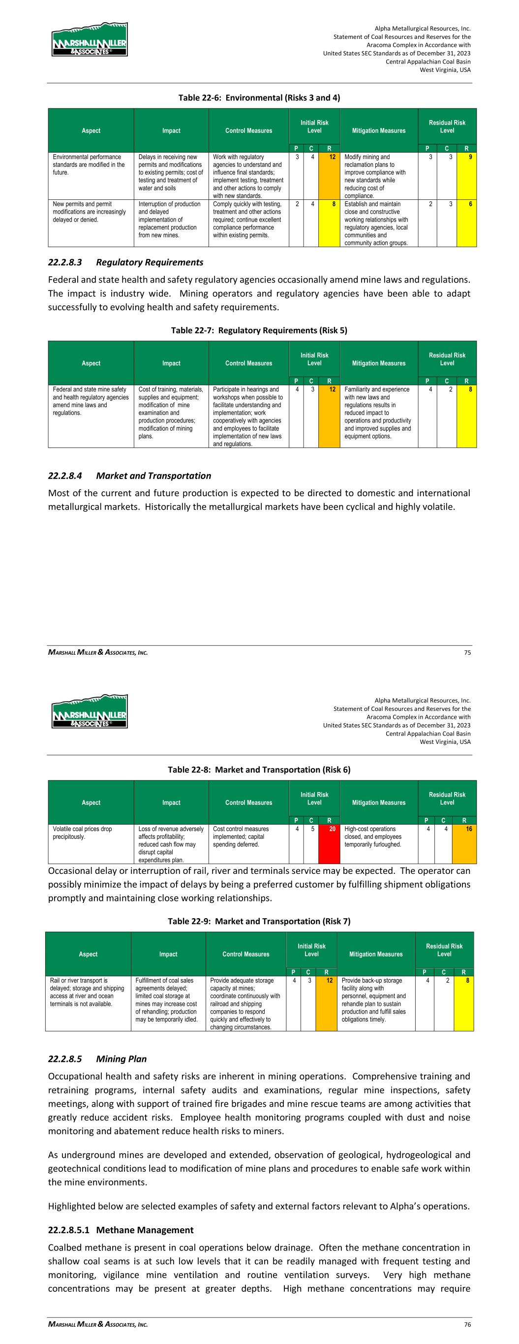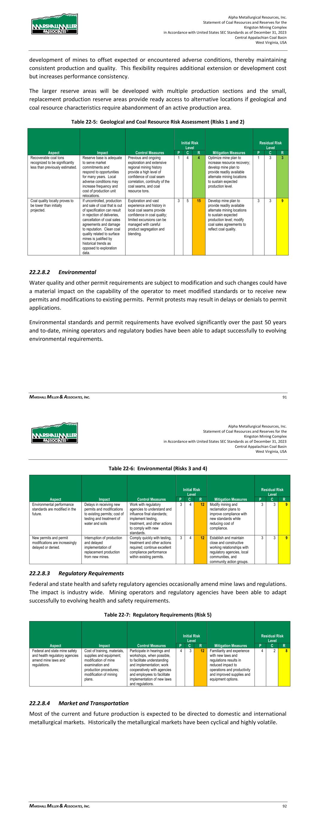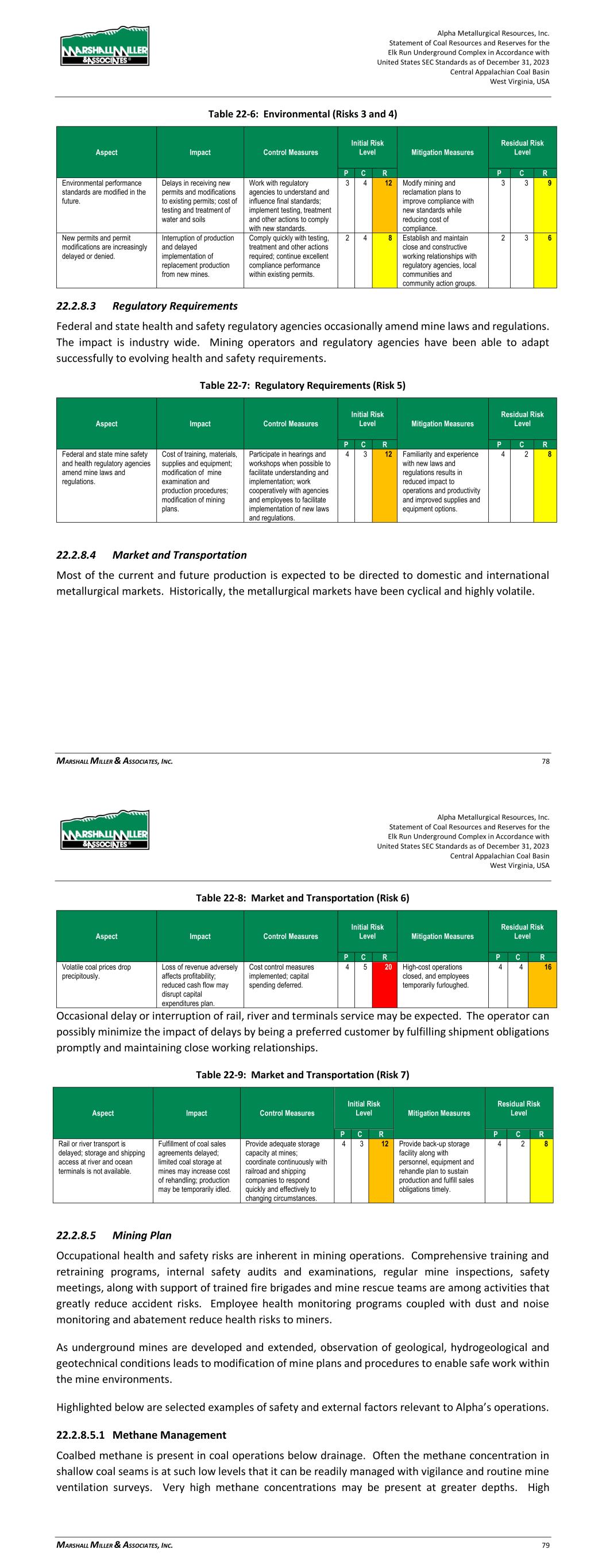 Alpha Metallurgical Resources, Inc. Statement of Coal Resources and Reserves for the Elk Run Underground Complex in Accordance with United States SEC Standards as of December 31, 2023 Central Appalachian Coal Basin West Virginia, USA MARSHALL MILLER & ASSOCIATES, INC. 78 Table 22-6: Environmental (Risks 3 and 4) Aspect Impact Control Measures Initial Risk Level Mitigation Measures Residual Risk Level P C R P C R Environmental performance standards are modified in the future. Delays in receiving new permits and modifications to existing permits; cost of testing and treatment of water and soils Work with regulatory agencies to understand and influence final standards; implement testing, treatment and other actions to comply with new standards. 3 4 12 Modify mining and reclamation plans to improve compliance with new standards while reducing cost of compliance. 3 3 9 New permits and permit modifications are increasingly delayed or denied. Interruption of production and delayed implementation of replacement production from new mines. Comply quickly with testing, treatment and other actions required; continue excellent compliance performance within existing permits. 2 4 8 Establish and maintain close and constructive working relationships with regulatory agencies, local communities and community action groups. 2 3 6 22.2.8.3 Regulatory Requirements Federal and state health and safety regulatory agencies occasionally amend mine laws and regulations. The impact is industry wide. Mining operators and regulatory agencies have been able to adapt successfully to evolving health and safety requirements. Table 22-7: Regulatory Requirements (Risk 5) Aspect Impact Control Measures Initial Risk Level Mitigation Measures Residual Risk Level P C R P C R Federal and state mine safety and health regulatory agencies amend mine laws and regulations. Cost of training, materials, supplies and equipment; modification of mine examination and production procedures; modification of mining plans. Participate in hearings and workshops when possible to facilitate understanding and implementation; work cooperatively with agencies and employees to facilitate implementation of new laws and regulations. 4 3 12 Familiarity and experience with new laws and regulations results in reduced impact to operations and productivity and improved supplies and equipment options. 4 2 8 22.2.8.4 Market and Transportation Most of the current and future production is expected to be directed to domestic and international metallurgical markets. Historically, the metallurgical markets have been cyclical and highly volatile. Alpha Metallurgical Resources, Inc. Statement of Coal Resources and Reserves for the Elk Run Underground Complex in Accordance with United States SEC Standards as of December 31, 2023 Central Appalachian Coal Basin West Virginia, USA MARSHALL MILLER & ASSOCIATES, INC. 79 Table 22-8: Market and Transportation (Risk 6) Aspect Impact Control Measures Initial Risk Level Mitigation Measures Residual Risk Level P C R P C R Volatile coal prices drop precipitously. Loss of revenue adversely affects profitability; reduced cash flow may disrupt capital expenditures plan. Cost control measures implemented; capital spending deferred. 4 5 20 High-cost operations closed, and employees temporarily furloughed. 4 4 16 Occasional delay or interruption of rail, river and terminals service may be expected. The operator can possibly minimize the impact of delays by being a preferred customer by fulfilling shipment obligations promptly and maintaining close working relationships. Table 22-9: Market and Transportation (Risk 7) Aspect Impact Control Measures Initial Risk Level Mitigation Measures Residual Risk Level P C R P C R Rail or river transport is delayed; storage and shipping access at river and ocean terminals is not available. Fulfillment of coal sales agreements delayed; limited coal storage at mines may increase cost of rehandling; production may be temporarily idled. Provide adequate storage capacity at mines; coordinate continuously with railroad and shipping companies to respond quickly and effectively to changing circumstances. 4 3 12 Provide back-up storage facility along with personnel, equipment and rehandle plan to sustain production and fulfill sales obligations timely. 4 2 8 22.2.8.5 Mining Plan Occupational health and safety risks are inherent in mining operations. Comprehensive training and retraining programs, internal safety audits and examinations, regular mine inspections, safety meetings, along with support of trained fire brigades and mine rescue teams are among activities that greatly reduce accident risks. Employee health monitoring programs coupled with dust and noise monitoring and abatement reduce health risks to miners. As underground mines are developed and extended, observation of geological, hydrogeological and geotechnical conditions leads to modification of mine plans and procedures to enable safe work within the mine environments. Highlighted below are selected examples of safety and external factors relevant to Alpha’s operations. 22.2.8.5.1 Methane Management Coalbed methane is present in coal operations below drainage. Often the methane concentration in shallow coal seams is at such low levels that it can be readily managed with vigilance and routine mine ventilation surveys. Very high methane concentrations may be present at greater depths. High
