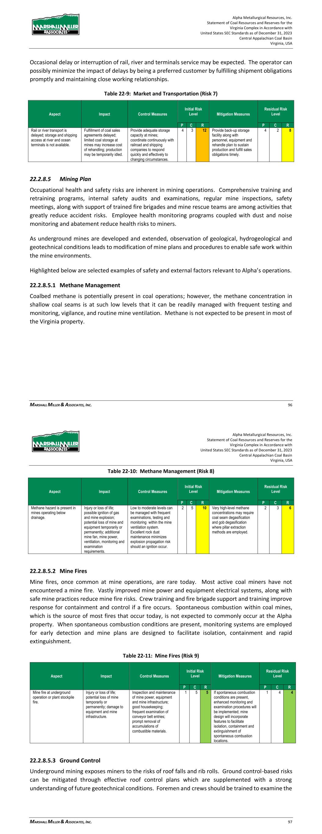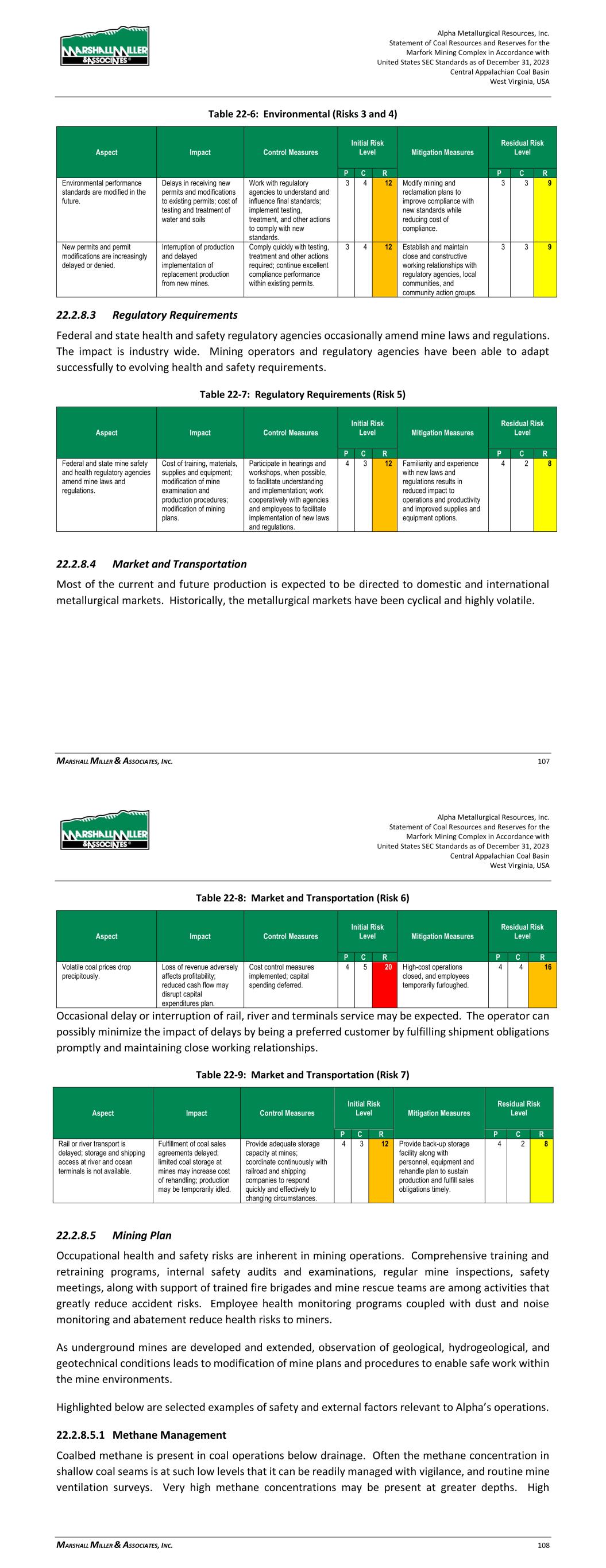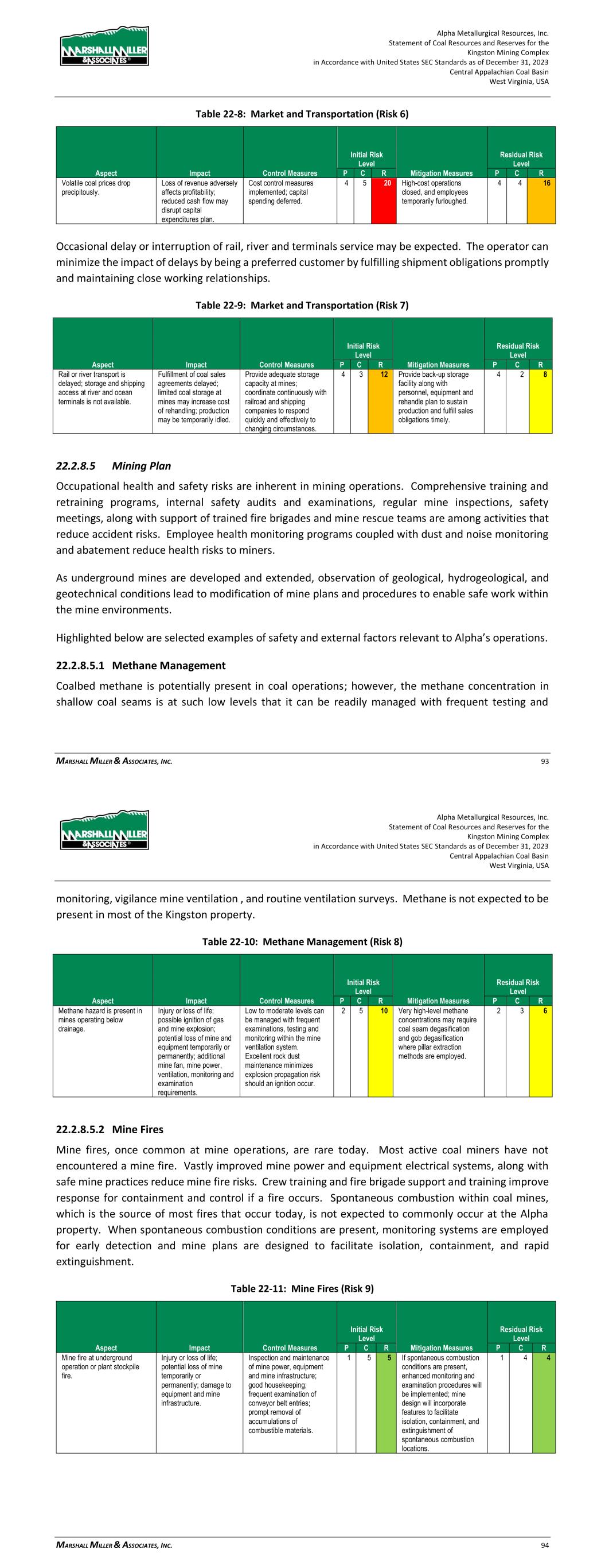 Alpha Metallurgical Resources, Inc. Statement of Coal Resources and Reserves for the Elk Run Underground Complex in Accordance with United States SEC Standards as of December 31, 2023 Central Appalachian Coal Basin West Virginia, USA MARSHALL MILLER & ASSOCIATES, INC. 78 Table 22-6: Environmental (Risks 3 and 4) Aspect Impact Control Measures Initial Risk Level Mitigation Measures Residual Risk Level P C R P C R Environmental performance standards are modified in the future. Delays in receiving new permits and modifications to existing permits; cost of testing and treatment of water and soils Work with regulatory agencies to understand and influence final standards; implement testing, treatment and other actions to comply with new standards. 3 4 12 Modify mining and reclamation plans to improve compliance with new standards while reducing cost of compliance. 3 3 9 New permits and permit modifications are increasingly delayed or denied. Interruption of production and delayed implementation of replacement production from new mines. Comply quickly with testing, treatment and other actions required; continue excellent compliance performance within existing permits. 2 4 8 Establish and maintain close and constructive working relationships with regulatory agencies, local communities and community action groups. 2 3 6 22.2.8.3 Regulatory Requirements Federal and state health and safety regulatory agencies occasionally amend mine laws and regulations. The impact is industry wide. Mining operators and regulatory agencies have been able to adapt successfully to evolving health and safety requirements. Table 22-7: Regulatory Requirements (Risk 5) Aspect Impact Control Measures Initial Risk Level Mitigation Measures Residual Risk Level P C R P C R Federal and state mine safety and health regulatory agencies amend mine laws and regulations. Cost of training, materials, supplies and equipment; modification of mine examination and production procedures; modification of mining plans. Participate in hearings and workshops when possible to facilitate understanding and implementation; work cooperatively with agencies and employees to facilitate implementation of new laws and regulations. 4 3 12 Familiarity and experience with new laws and regulations results in reduced impact to operations and productivity and improved supplies and equipment options. 4 2 8 22.2.8.4 Market and Transportation Most of the current and future production is expected to be directed to domestic and international metallurgical markets. Historically, the metallurgical markets have been cyclical and highly volatile. Alpha Metallurgical Resources, Inc. Statement of Coal Resources and Reserves for the Elk Run Underground Complex in Accordance with United States SEC Standards as of December 31, 2023 Central Appalachian Coal Basin West Virginia, USA MARSHALL MILLER & ASSOCIATES, INC. 79 Table 22-8: Market and Transportation (Risk 6) Aspect Impact Control Measures Initial Risk Level Mitigation Measures Residual Risk Level P C R P C R Volatile coal prices drop precipitously. Loss of revenue adversely affects profitability; reduced cash flow may disrupt capital expenditures plan. Cost control measures implemented; capital spending deferred. 4 5 20 High-cost operations closed, and employees temporarily furloughed. 4 4 16 Occasional delay or interruption of rail, river and terminals service may be expected. The operator can possibly minimize the impact of delays by being a preferred customer by fulfilling shipment obligations promptly and maintaining close working relationships. Table 22-9: Market and Transportation (Risk 7) Aspect Impact Control Measures Initial Risk Level Mitigation Measures Residual Risk Level P C R P C R Rail or river transport is delayed; storage and shipping access at river and ocean terminals is not available. Fulfillment of coal sales agreements delayed; limited coal storage at mines may increase cost of rehandling; production may be temporarily idled. Provide adequate storage capacity at mines; coordinate continuously with railroad and shipping companies to respond quickly and effectively to changing circumstances. 4 3 12 Provide back-up storage facility along with personnel, equipment and rehandle plan to sustain production and fulfill sales obligations timely. 4 2 8 22.2.8.5 Mining Plan Occupational health and safety risks are inherent in mining operations. Comprehensive training and retraining programs, internal safety audits and examinations, regular mine inspections, safety meetings, along with support of trained fire brigades and mine rescue teams are among activities that greatly reduce accident risks. Employee health monitoring programs coupled with dust and noise monitoring and abatement reduce health risks to miners. As underground mines are developed and extended, observation of geological, hydrogeological and geotechnical conditions leads to modification of mine plans and procedures to enable safe work within the mine environments. Highlighted below are selected examples of safety and external factors relevant to Alpha’s operations. 22.2.8.5.1 Methane Management Coalbed methane is present in coal operations below drainage. Often the methane concentration in shallow coal seams is at such low levels that it can be readily managed with vigilance and routine mine ventilation surveys. Very high methane concentrations may be present at greater depths. High