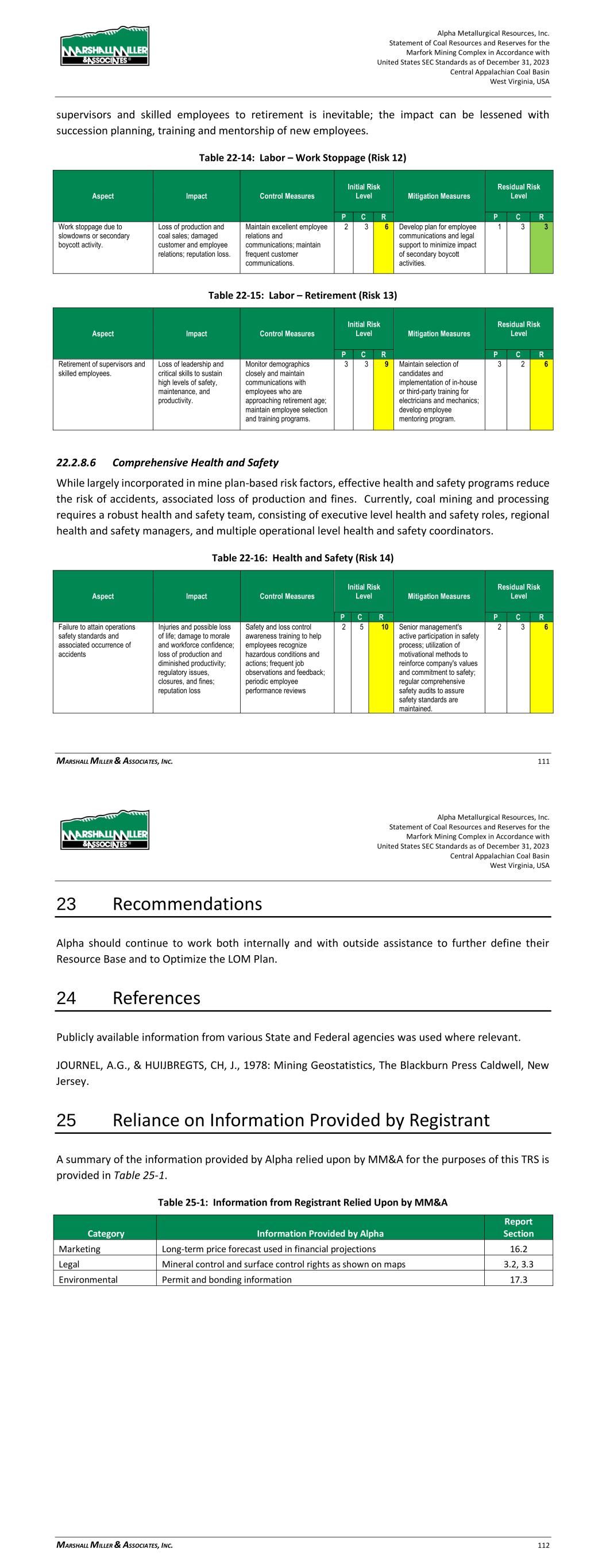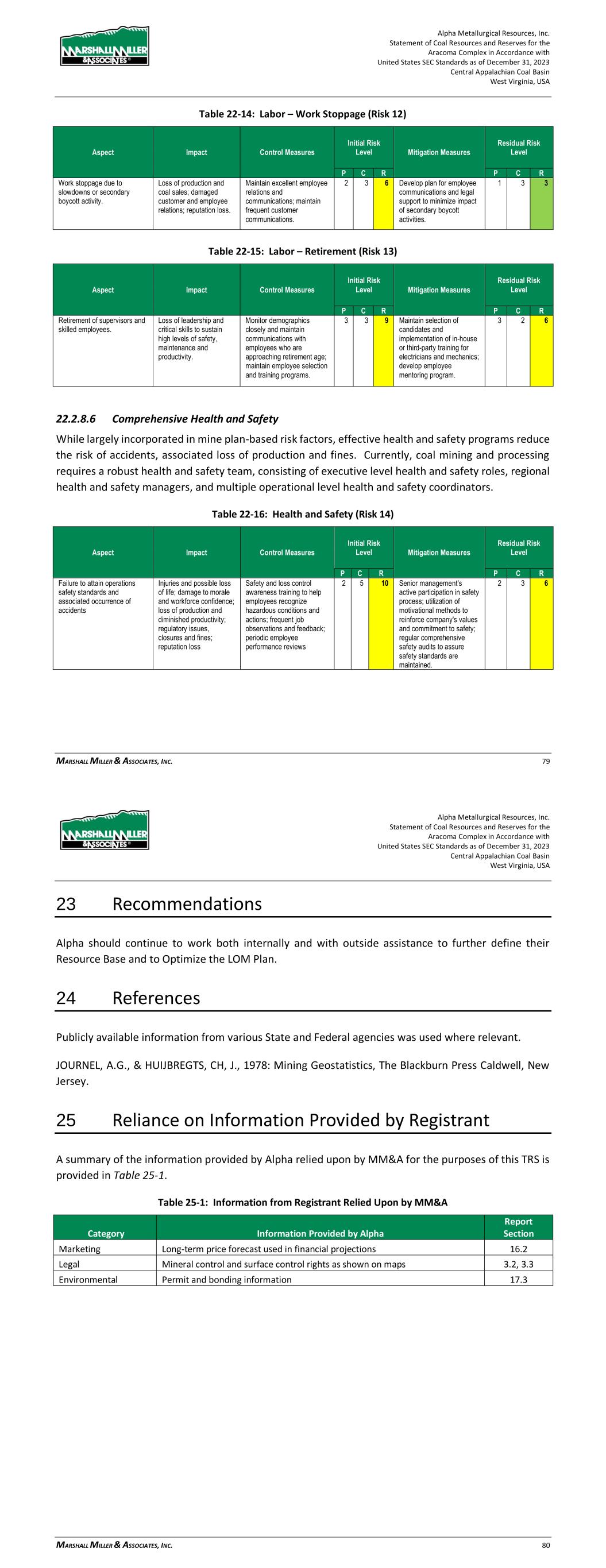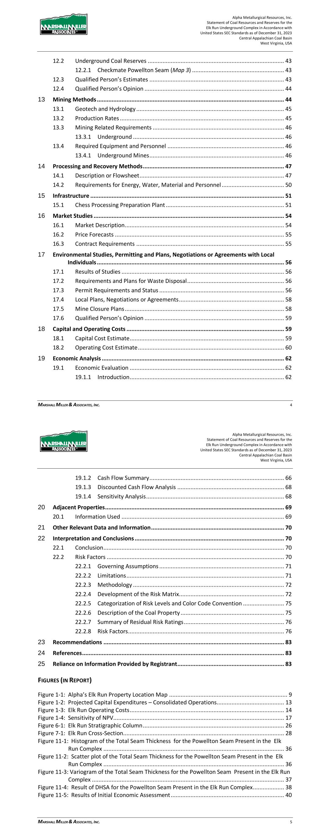 Alpha Metallurgical Resources, Inc. Statement of Coal Resources and Reserves for the Elk Run Underground Complex in Accordance with United States SEC Standards as of December 31, 2023 Central Appalachian Coal Basin West Virginia, USA MARSHALL MILLER & ASSOCIATES, INC. 82 protesters. Loss of supervisors and skilled employees to retirement is inevitable; the impact can be lessened with succession planning, training, and mentorship of new employees. Table 22-14: Labor – Work Stoppage (Risk 12) Aspect Impact Control Measures Initial Risk Level Mitigation Measures Residual Risk Level P C R P C R Work stoppage due to slowdowns or secondary boycott activity. Loss of production and coal sales; damaged customer and employee relations; reputation loss. Maintain excellent employee relations and communications; maintain frequent customer communications. 2 3 6 Develop plan for employee communications and legal support to minimize impact of secondary boycott activities. 1 3 3 Table 22-15: Labor – Retirement (Risk 13) Aspect Impact Control Measures Initial Risk Level Mitigation Measures Residual Risk Level P C R P C R Retirement of supervisors and skilled employees. Loss of leadership and critical skills to sustain high levels of safety, maintenance and productivity. Monitor demographics closely and maintain communications with employees who are approaching retirement age; maintain employee selection and training programs. 3 3 9 Maintain selection of candidates and implementation of in-house or third-party training for electricians and mechanics; develop employee mentoring program. 3 2 6 22.2.8.6 Comprehensive Health and Safety While largely incorporated in mine plan-based risk factors, effective health and safety programs reduce the risk of accidents, associated loss of production and fines. Currently, coal mining and processing requires a robust health and safety team, consisting of executive level health and safety roles, regional health and safety managers, and multiple operational level health and safety coordinators. Table 22-16: Health and Safety (Risk 14) Aspect Impact Control Measures Initial Risk Level Mitigation Measures Residual Risk Level P C R P C R Failure to attain operations safety standards and associated occurrence of accidents Injuries and possible loss of life; damage to morale and workforce confidence; loss of production and diminished productivity; regulatory issues, closures and fines; reputation loss Safety and loss control awareness training to help employees recognize hazardous conditions and actions; frequent job observations and feedback; periodic employee performance reviews 2 5 10 Senior management's active participation in safety process; utilization of motivational methods to reinforce company's values and commitment to safety; regular comprehensive safety audits to assure safety standards are maintained. 2 3 6 Alpha Metallurgical Resources, Inc. Statement of Coal Resources and Reserves for the Elk Run Underground Complex in Accordance with United States SEC Standards as of December 31, 2023 Central Appalachian Coal Basin West Virginia, USA MARSHALL MILLER & ASSOCIATES, INC. 83 23 Recommendations Alpha should continue to work both internally and with outside assistance to further define their Resource Base and to Optimize the LOM Plan. 24 References Publicly available information from various State and Federal agencies was used where relevant. JOURNEL, A.G., & HUIJBREGTS, CH, J., 1978: Mining Geostatistics, The Blackburn Press Caldwell, New Jersey. 25 Reliance on Information Provided by Registrant A summary of the information relied upon by MM&A for the purposes of this TRS is provided in Table 25-1. Table 25-1: Information from Registrant Relied Upon by MM&A Category Information Provided by Alpha Report Section Marketing Long-term price forecast used in financial projections 16.2 Legal Mineral control and surface control rights as shown on maps 3.2, 3.3 Environmental Permit and bonding information 17.3
