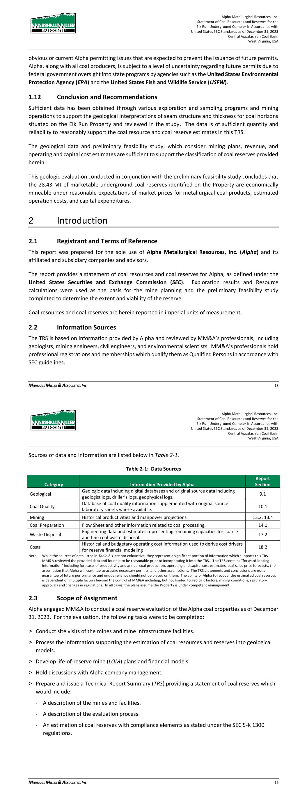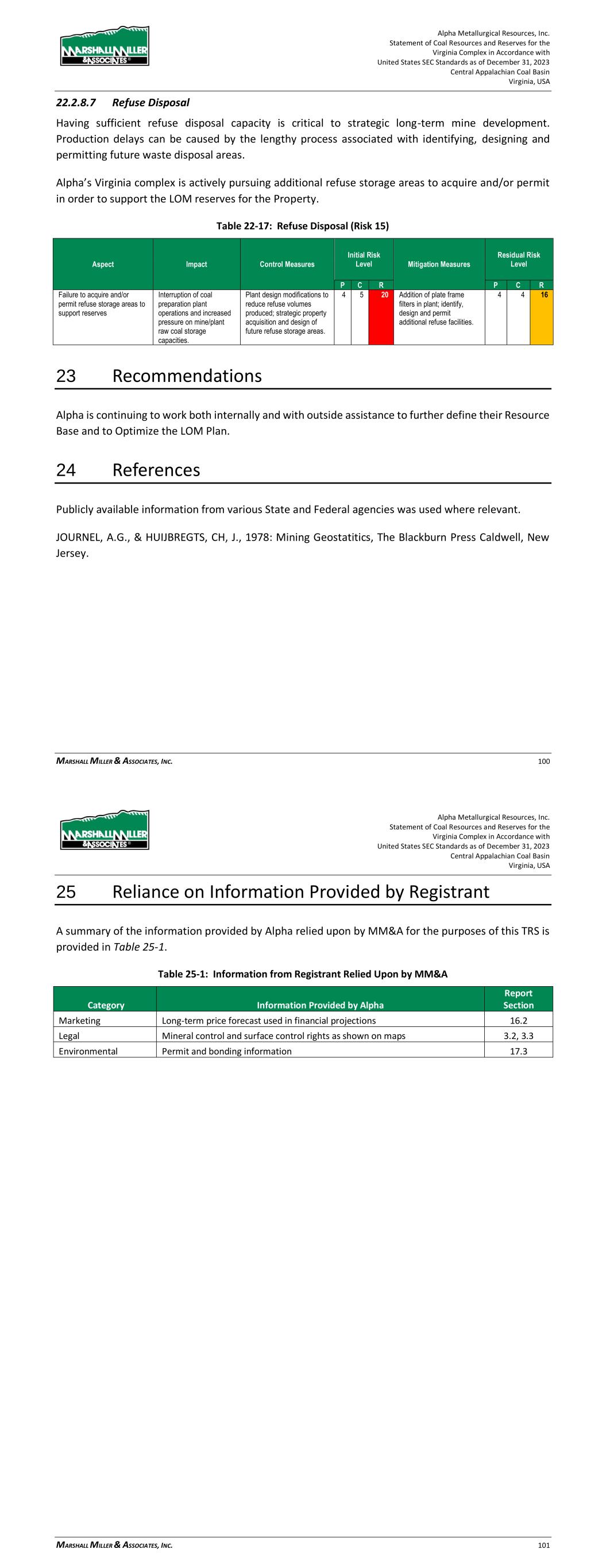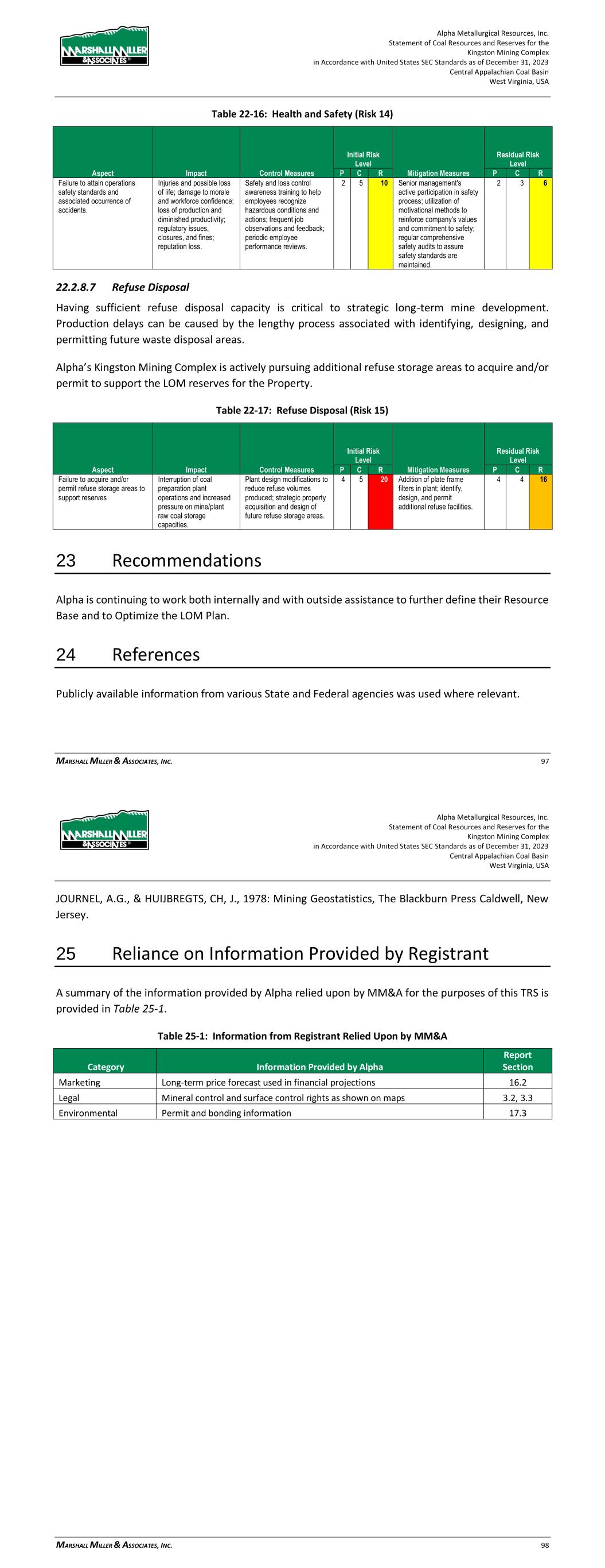 Alpha Metallurgical Resources, Inc. Statement of Coal Resources and Reserves for the Elk Run Underground Complex in Accordance with United States SEC Standards as of December 31, 2023 Central Appalachian Coal Basin West Virginia, USA MARSHALL MILLER & ASSOCIATES, INC. 82 protesters. Loss of supervisors and skilled employees to retirement is inevitable; the impact can be lessened with succession planning, training, and mentorship of new employees. Table 22-14: Labor – Work Stoppage (Risk 12) Aspect Impact Control Measures Initial Risk Level Mitigation Measures Residual Risk Level P C R P C R Work stoppage due to slowdowns or secondary boycott activity. Loss of production and coal sales; damaged customer and employee relations; reputation loss. Maintain excellent employee relations and communications; maintain frequent customer communications. 2 3 6 Develop plan for employee communications and legal support to minimize impact of secondary boycott activities. 1 3 3 Table 22-15: Labor – Retirement (Risk 13) Aspect Impact Control Measures Initial Risk Level Mitigation Measures Residual Risk Level P C R P C R Retirement of supervisors and skilled employees. Loss of leadership and critical skills to sustain high levels of safety, maintenance and productivity. Monitor demographics closely and maintain communications with employees who are approaching retirement age; maintain employee selection and training programs. 3 3 9 Maintain selection of candidates and implementation of in-house or third-party training for electricians and mechanics; develop employee mentoring program. 3 2 6 22.2.8.6 Comprehensive Health and Safety While largely incorporated in mine plan-based risk factors, effective health and safety programs reduce the risk of accidents, associated loss of production and fines. Currently, coal mining and processing requires a robust health and safety team, consisting of executive level health and safety roles, regional health and safety managers, and multiple operational level health and safety coordinators. Table 22-16: Health and Safety (Risk 14) Aspect Impact Control Measures Initial Risk Level Mitigation Measures Residual Risk Level P C R P C R Failure to attain operations safety standards and associated occurrence of accidents Injuries and possible loss of life; damage to morale and workforce confidence; loss of production and diminished productivity; regulatory issues, closures and fines; reputation loss Safety and loss control awareness training to help employees recognize hazardous conditions and actions; frequent job observations and feedback; periodic employee performance reviews 2 5 10 Senior management's active participation in safety process; utilization of motivational methods to reinforce company's values and commitment to safety; regular comprehensive safety audits to assure safety standards are maintained. 2 3 6 Alpha Metallurgical Resources, Inc. Statement of Coal Resources and Reserves for the Elk Run Underground Complex in Accordance with United States SEC Standards as of December 31, 2023 Central Appalachian Coal Basin West Virginia, USA MARSHALL MILLER & ASSOCIATES, INC. 83 23 Recommendations Alpha should continue to work both internally and with outside assistance to further define their Resource Base and to Optimize the LOM Plan. 24 References Publicly available information from various State and Federal agencies was used where relevant. JOURNEL, A.G., & HUIJBREGTS, CH, J., 1978: Mining Geostatistics, The Blackburn Press Caldwell, New Jersey. 25 Reliance on Information Provided by Registrant A summary of the information relied upon by MM&A for the purposes of this TRS is provided in Table 25-1. Table 25-1: Information from Registrant Relied Upon by MM&A Category Information Provided by Alpha Report Section Marketing Long-term price forecast used in financial projections 16.2 Legal Mineral control and surface control rights as shown on maps 3.2, 3.3 Environmental Permit and bonding information 17.3