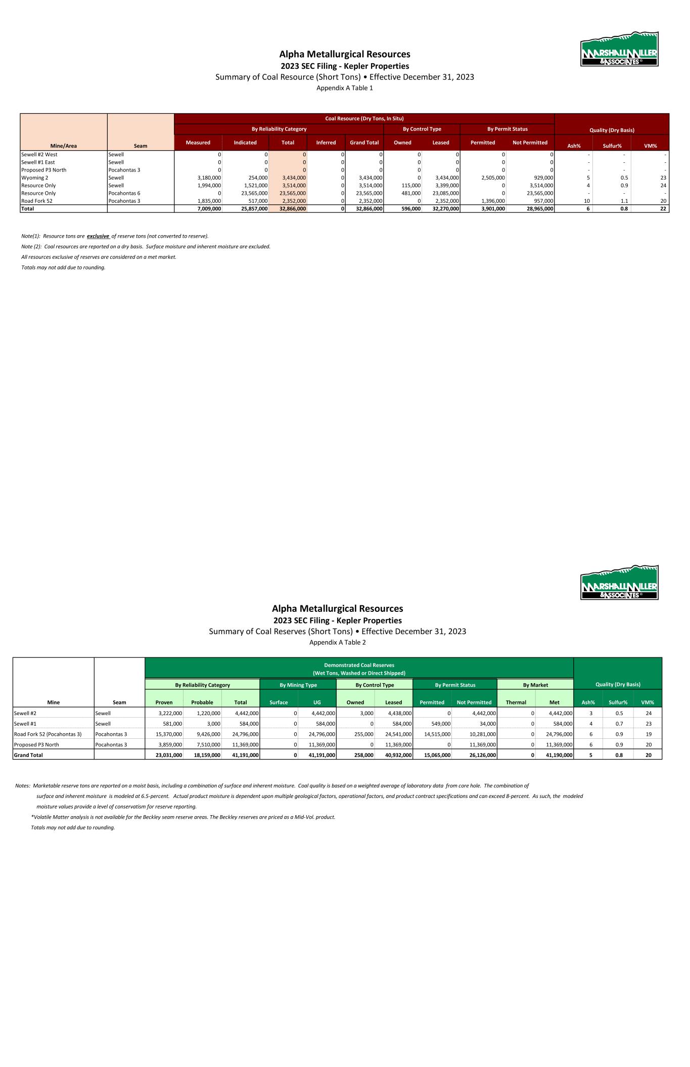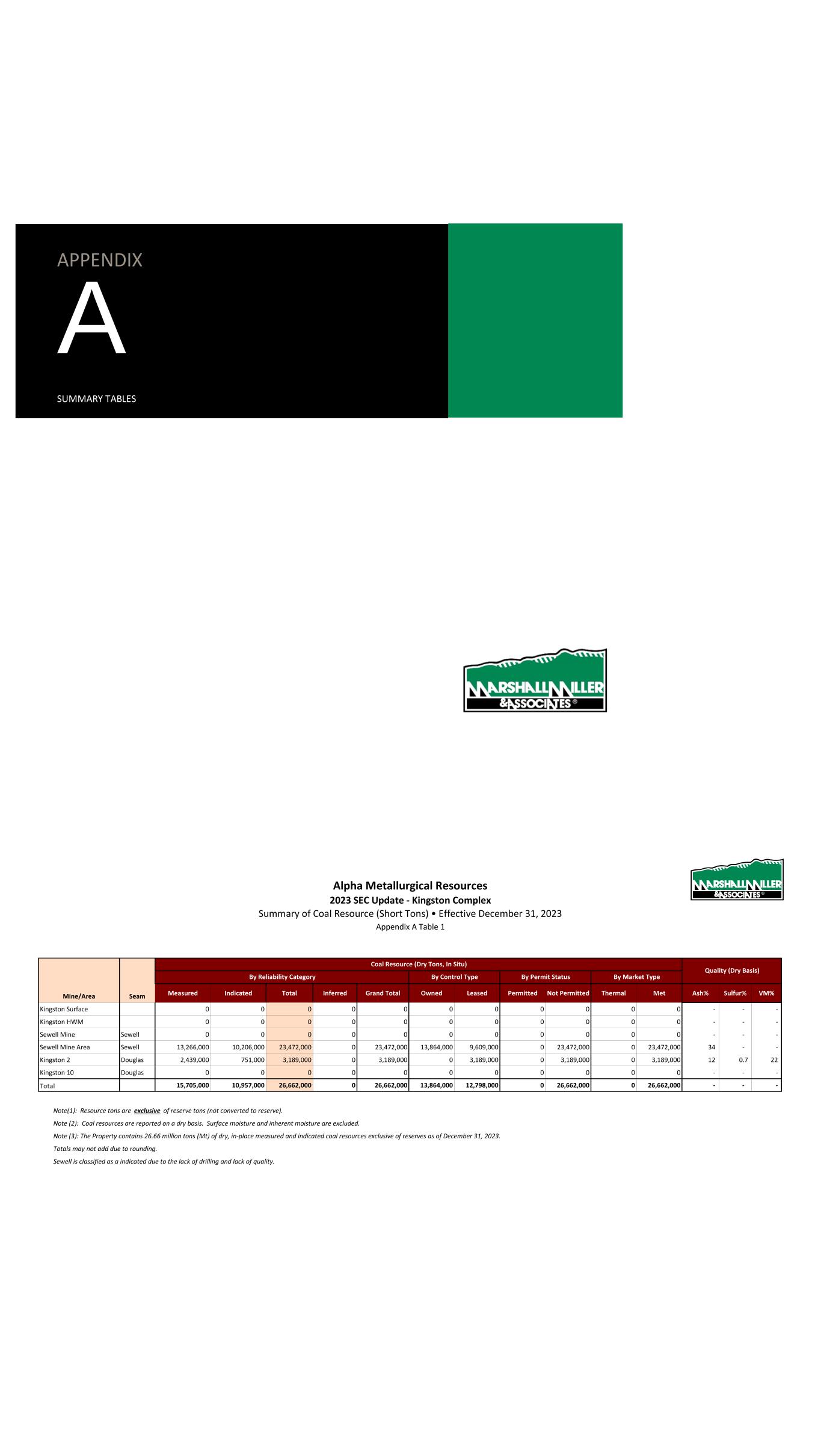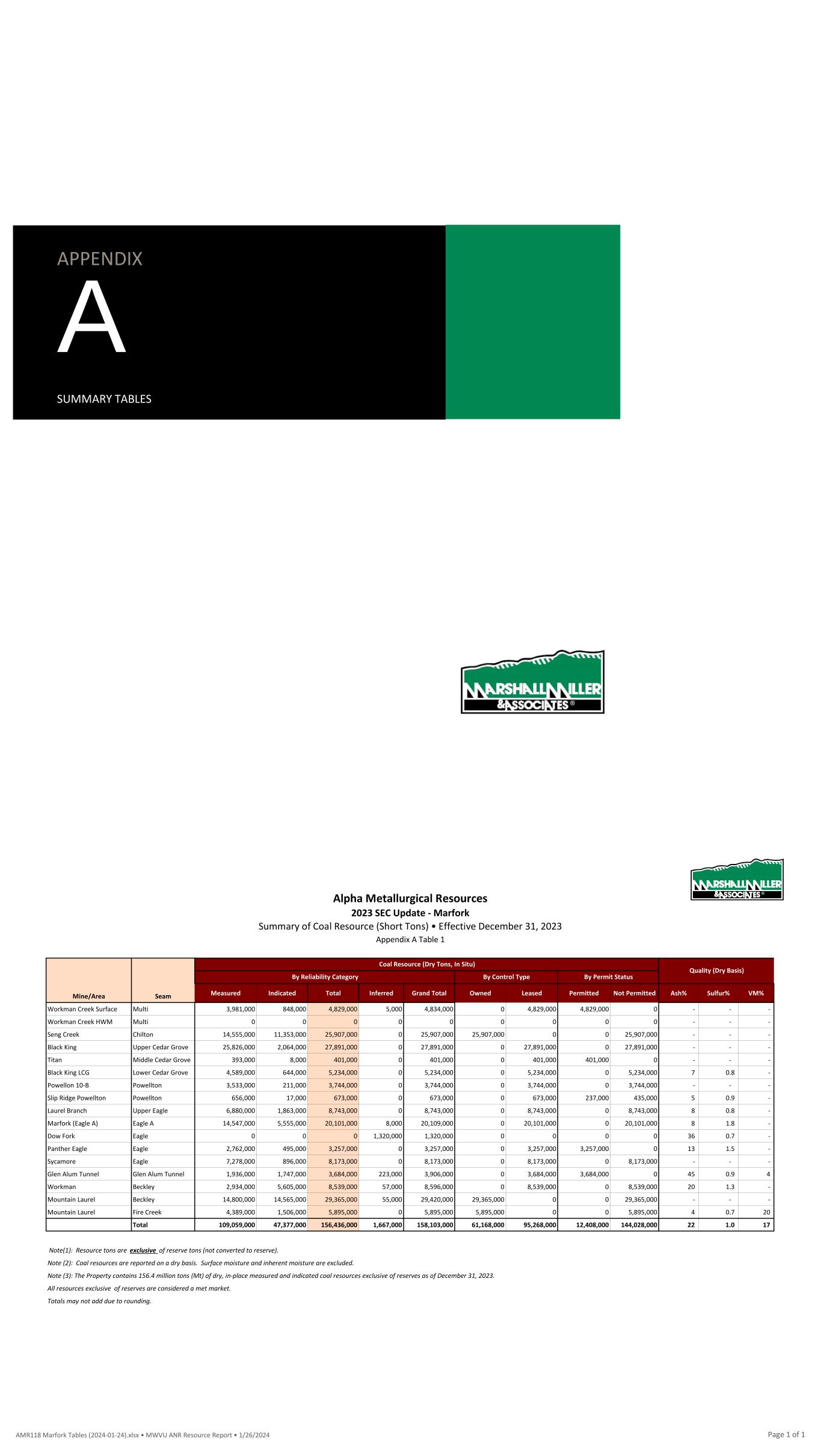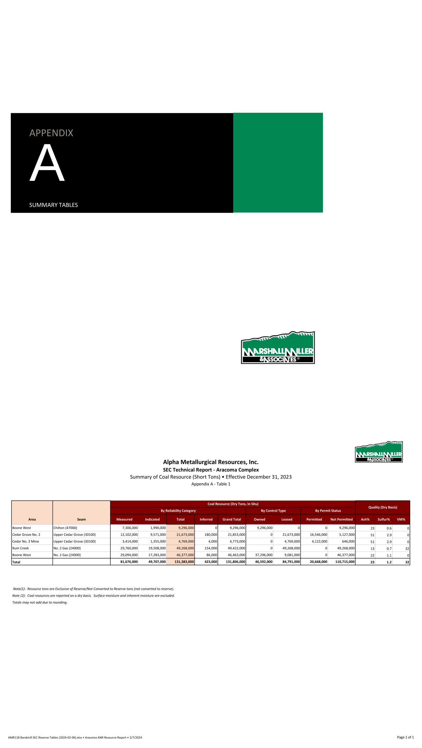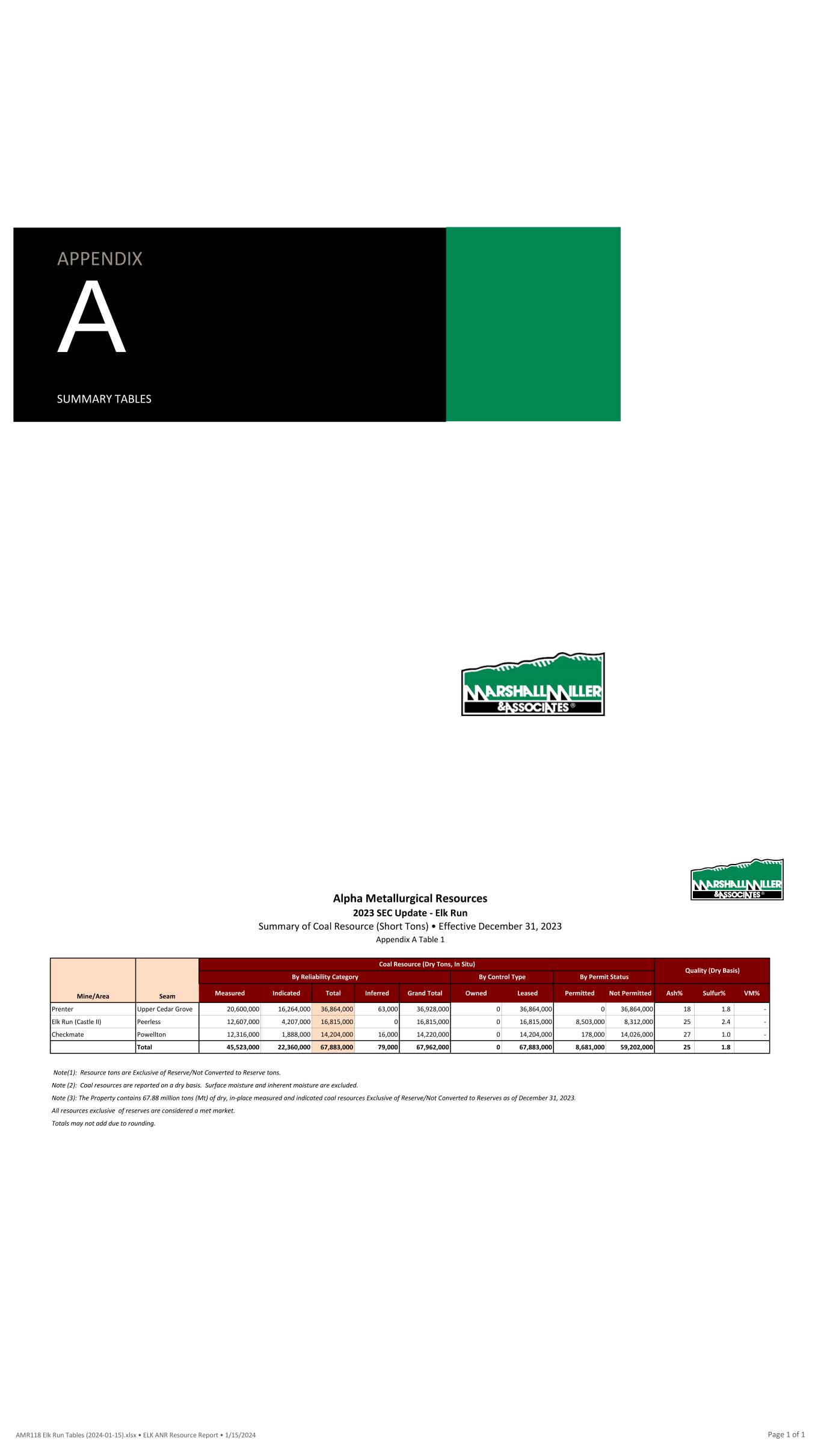 APPENDIX A SUMMARY TABLES Alpha Metallurgical Resources 2023 SEC Update - Elk Run Summary of Coal Resource (Short Tons) • Effective December 31, 2023 Appendix A Table 1 Mine/Area Seam Measured Indicated Total Inferred Grand Total Owned Leased Permitted Not Permitted Ash% Sulfur% VM% Prenter Upper Cedar Grove 20,600,000 16,264,000 36,864,000 63,000 36,928,000 0 36,864,000 0 36,864,000 18 1.8 - Elk Run (Castle II) Peerless 12,607,000 4,207,000 16,815,000 0 16,815,000 0 16,815,000 8,503,000 8,312,000 25 2.4 - Checkmate Powellton 12,316,000 1,888,000 14,204,000 16,000 14,220,000 0 14,204,000 178,000 14,026,000 27 1.0 - Total 45,523,000 22,360,000 67,883,000 79,000 67,962,000 0 67,883,000 8,681,000 59,202,000 25 1.8 Note(1): Resource tons are Exclusive of Reserve/Not Converted to Reserve tons. Note (2): Coal resources are reported on a dry basis. Surface moisture and inherent moisture are excluded. Note (3): The Property contains 67.88 million tons (Mt) of dry, in-place measured and indicated coal resources Exclusive of Reserve/Not Converted to Reserves as of December 31, 2023. All resources exclusive of reserves are considered a met market. Totals may not add due to rounding. Quality (Dry Basis) By Permit StatusBy Reliability Category Coal Resource (Dry Tons, In Situ) By Control Type AMR118 Elk Run Tables (2024-01-15).xlsx • ELK ANR Resource Report • 1/15/2024 Page 1 of 1