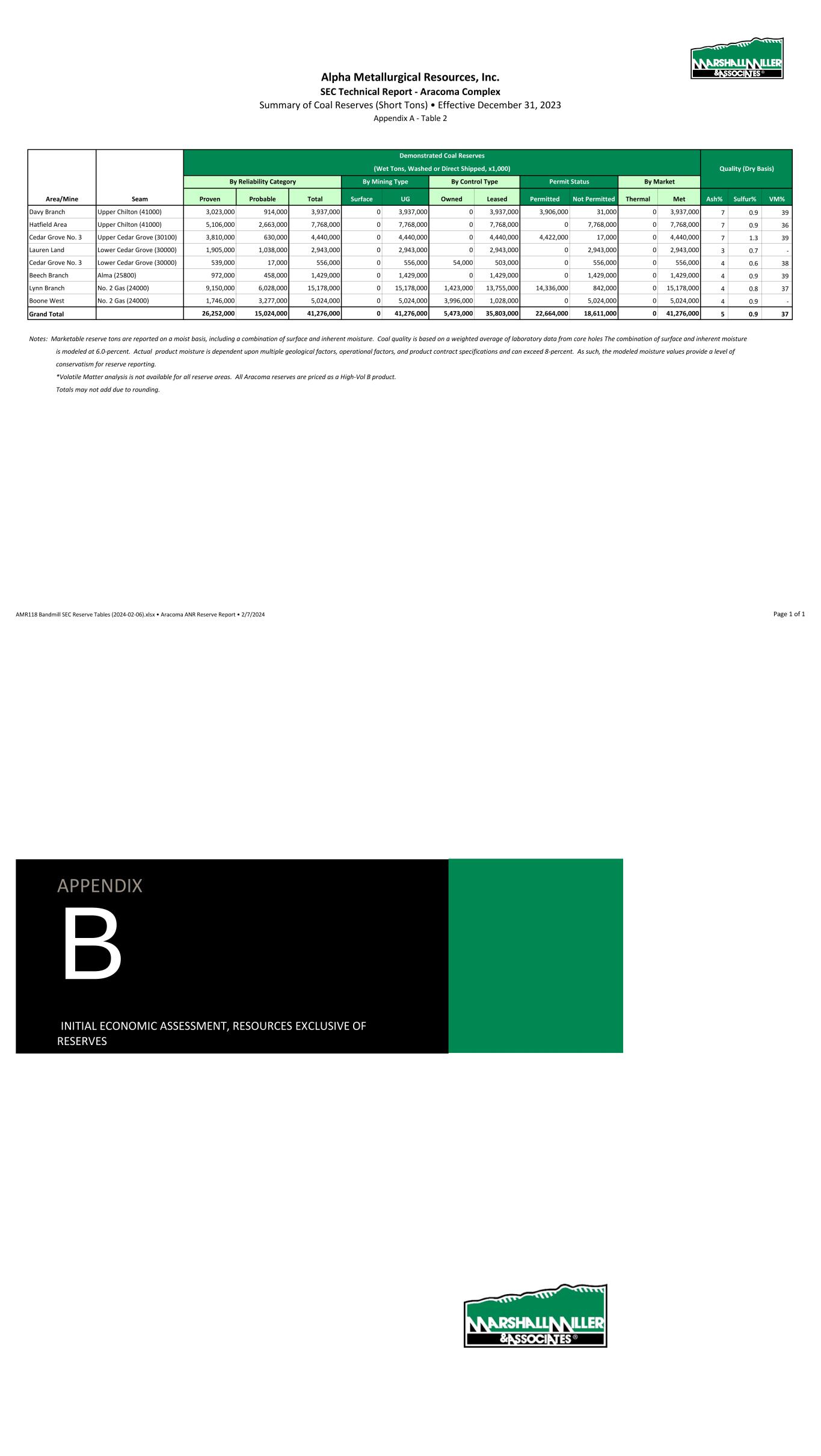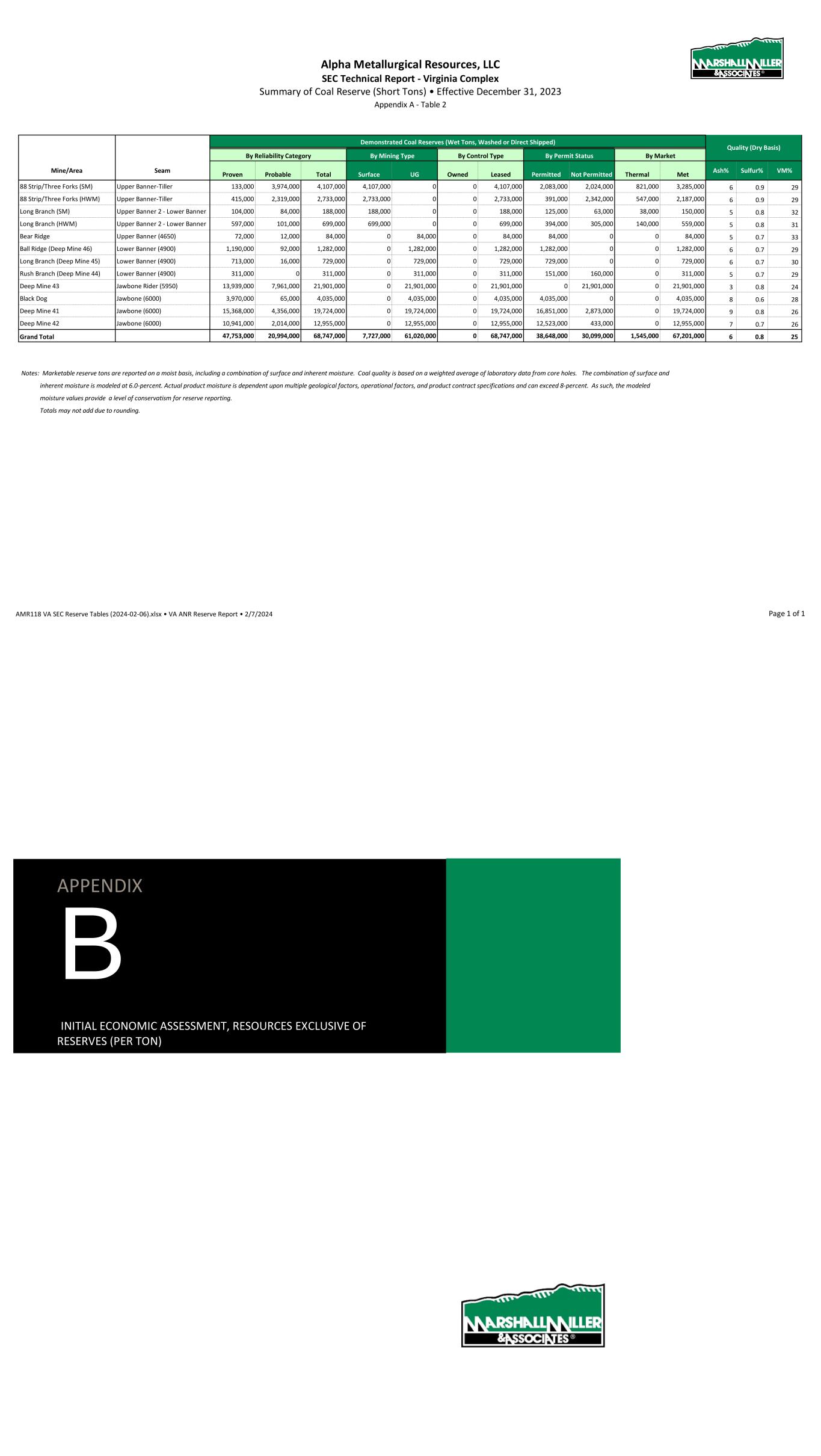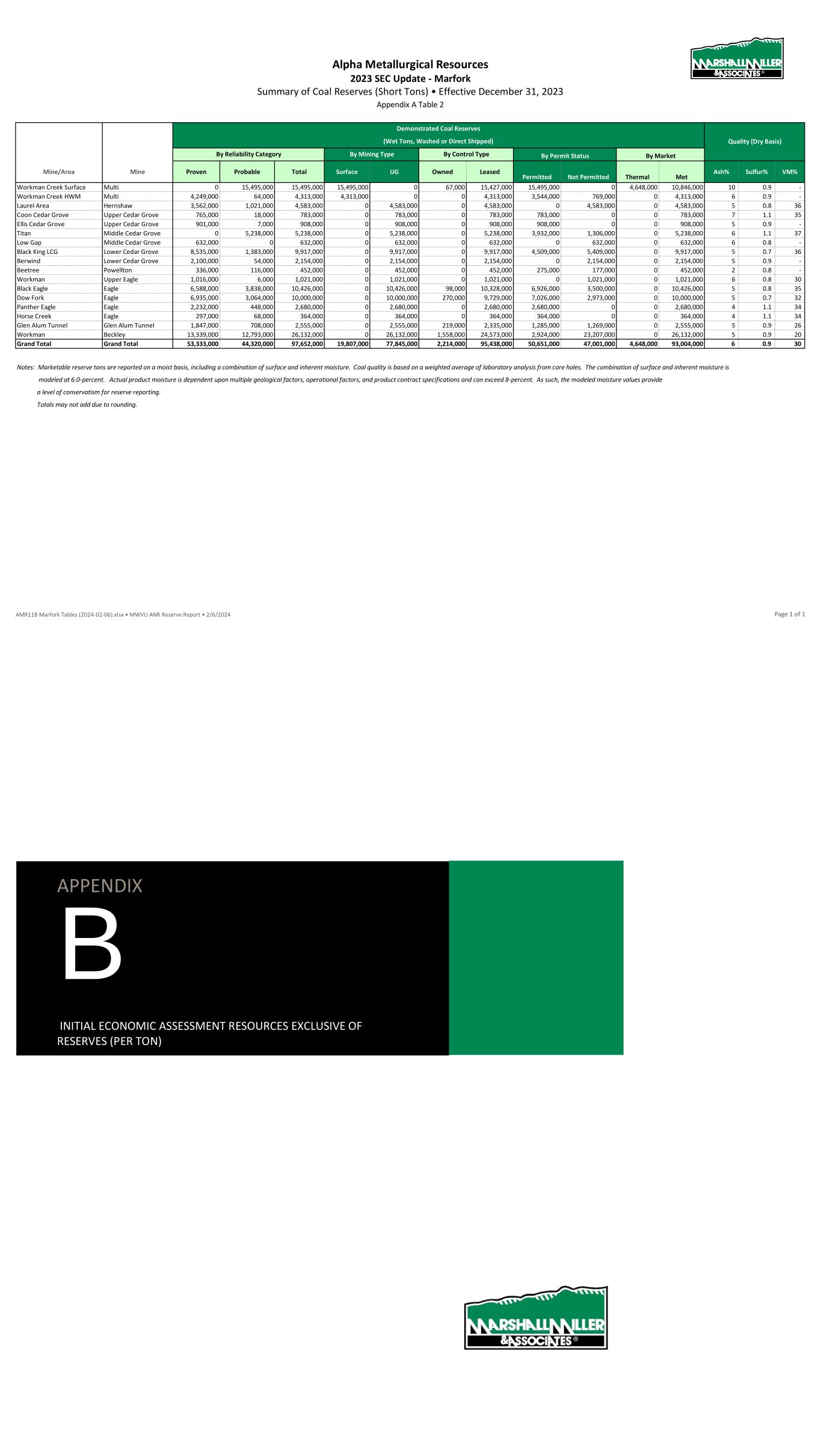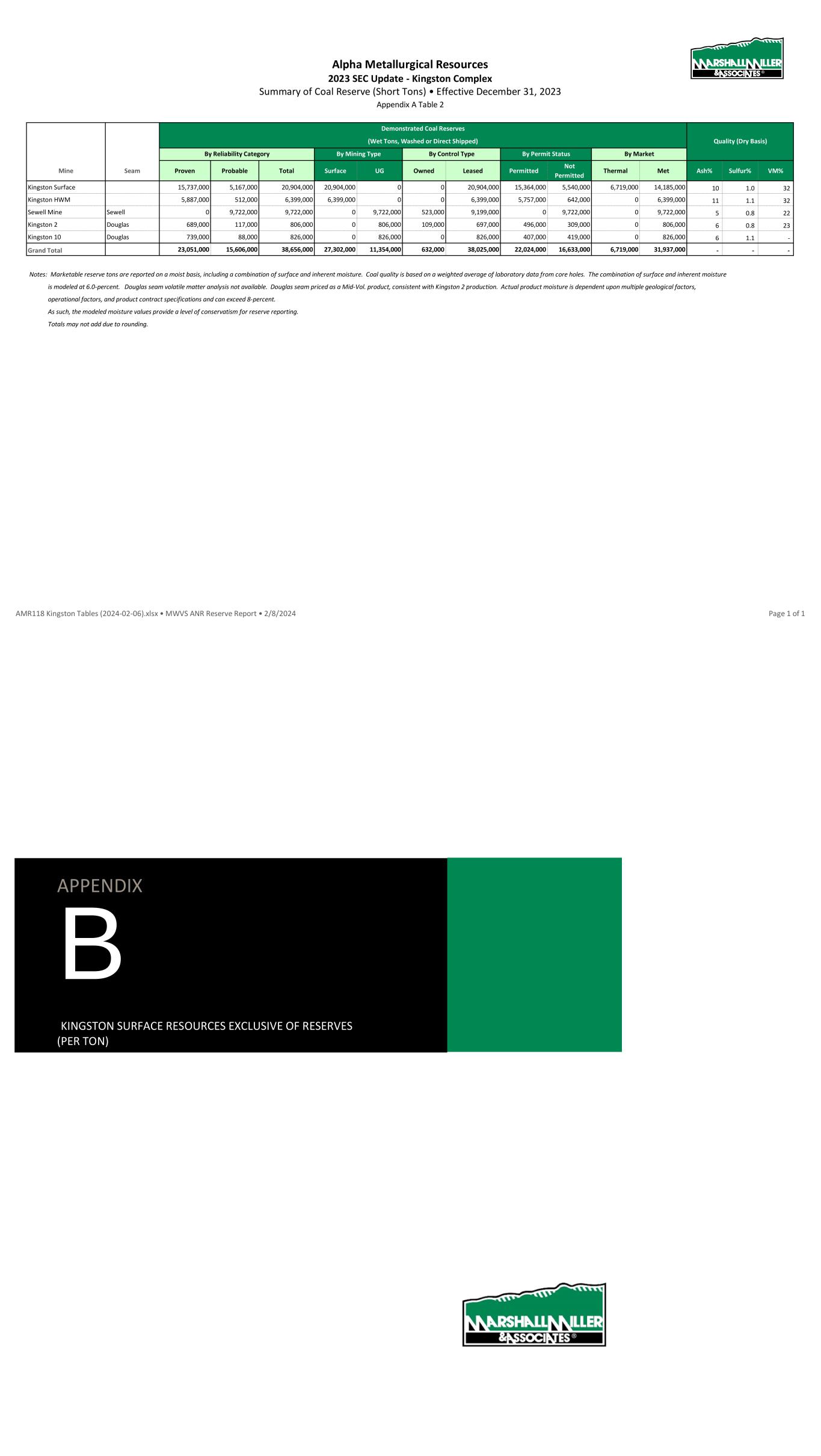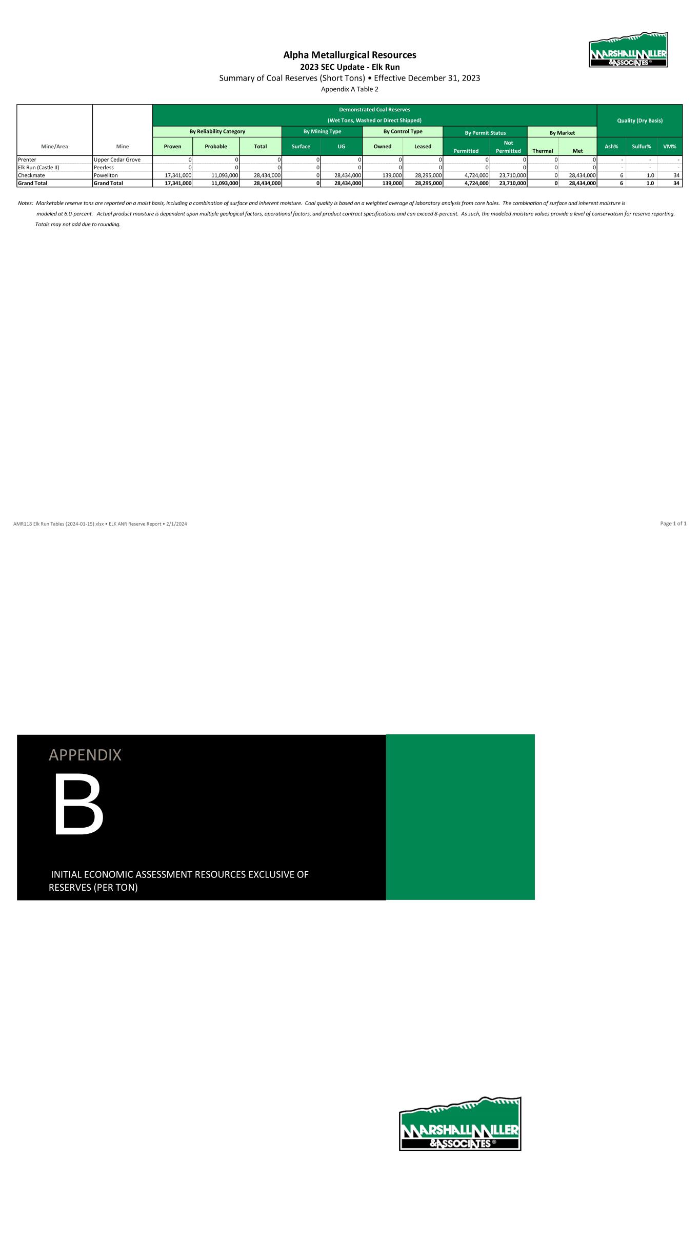Alpha Metallurgical Resources 2023 SEC Update - Elk Run Summary of Coal Reserves (Short Tons) • Effective December 31, 2023 Appendix A Table 2 By Permit Status By Market Mine/Area Mine Proven Probable Total Surface UG Owned Leased Permitted Not Permitted Thermal Met Ash% Sulfur% VM% Prenter Upper Cedar Grove 0 0 0 0 0 0 0 0 0 0 0 - - - Elk Run (Castle II) Peerless 0 0 0 0 0 0 0 0 0 0 0 - - - Checkmate Powellton 17,341,000 11,093,000 28,434,000 0 28,434,000 139,000 28,295,000 4,724,000 23,710,000 0 28,434,000 6 1.0 34 Grand Total Grand Total 17,341,000 11,093,000 28,434,000 0 28,434,000 139,000 28,295,000 4,724,000 23,710,000 0 28,434,000 6 1.0 34 Notes: Marketable reserve tons are reported on a moist basis, including a combination of surface and inherent moisture. Coal quality is based on a weighted average of laboratory analysis from core holes. The combination of surface and inherent moisture is modeled at 6.0-percent. Actual product moisture is dependent upon multiple geological factors, operational factors, and product contract specifications and can exceed 8-percent. As such, the modeled moisture values provide a level of conservatism for reserve reporting. Totals may not add due to rounding. Demonstrated Coal Reserves By Mining TypeBy Reliability Category Quality (Dry Basis)(Wet Tons, Washed or Direct Shipped) By Control Type AMR118 Elk Run Tables (2024-01-15).xlsx • ELK ANR Reserve Report • 2/1/2024 Page 1 of 1 APPENDIX B INITIAL ECONOMIC ASSESSMENT RESOURCES EXCLUSIVE OF RESERVES (PER TON)