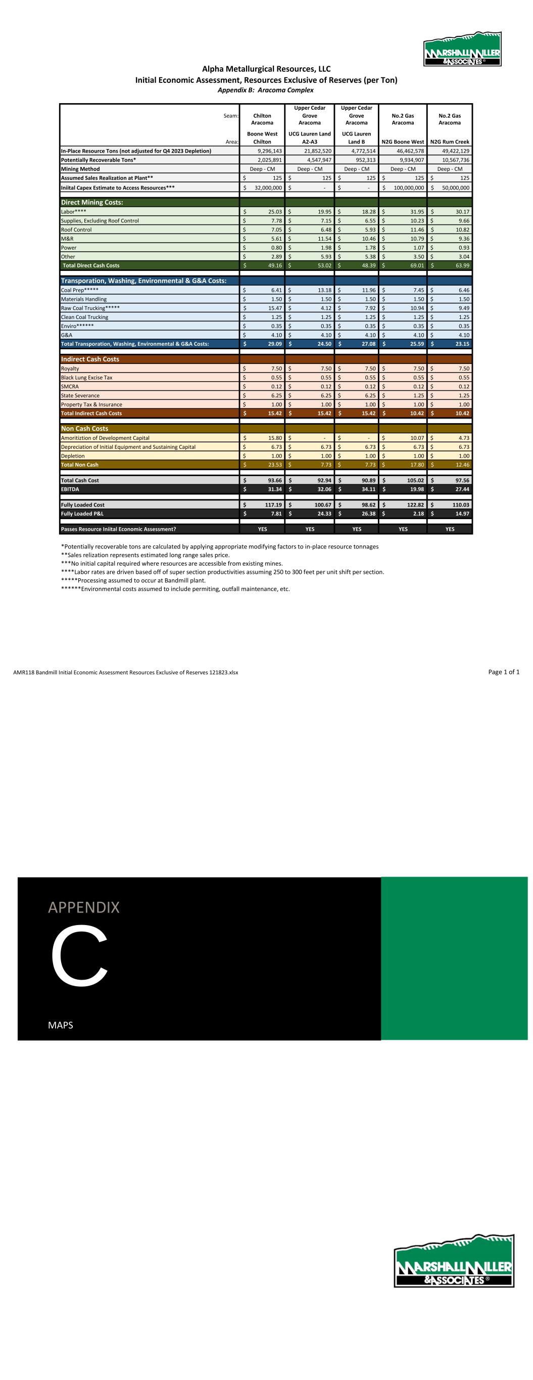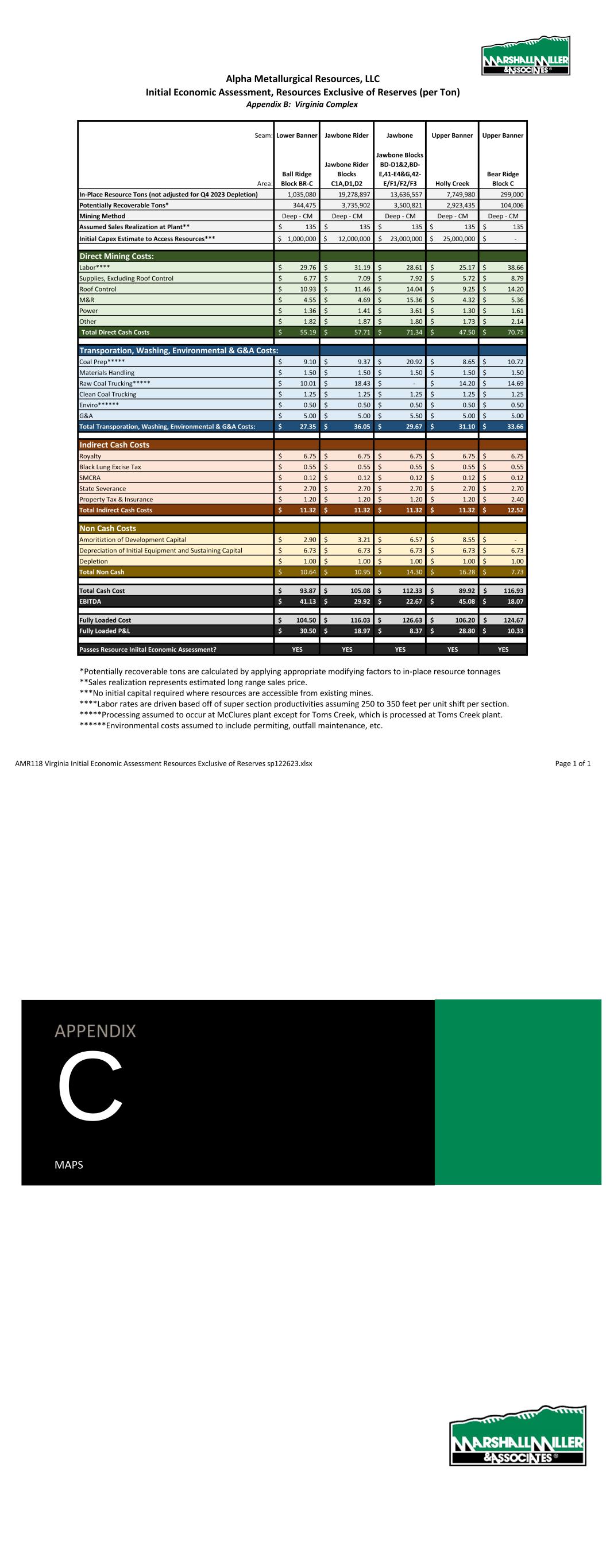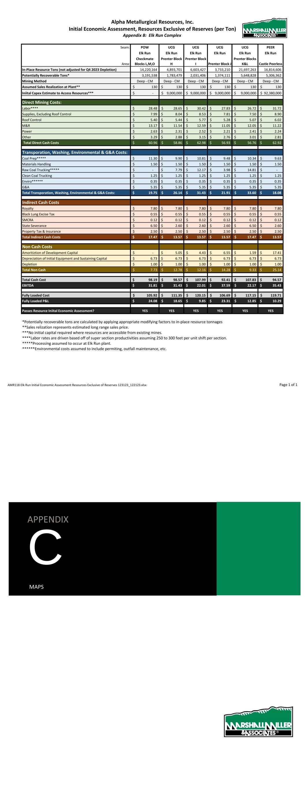 Alpha Metallurgical Resources, Inc. Initial Economic Assessment, Resources Exclusive of Reserves (per Ton) Appendix B: Elk Run Complex Seam: POW UCG UCG UCG UCG PEER Elk Run Elk Run Elk Run Elk Run Elk Run Elk Run Area: Checkmate Blocks L,M,O Prenter Block H Prenter Block I Prenter Block J Prenter Blocks K&L Castle Peerless In-Place Resource Tons (not adjusted for Q4 2023 Depletion) 14,220,164 4,893,701 6,603,427 3,733,210 21,697,263 16,814,606 Potentially Recoverable Tons* 3,191,538 1,783,479 2,031,406 1,374,111 5,648,828 5,306,362 Mining Method Deep - CM Deep - CM Deep - CM Deep - CM Deep - CM Deep - CM Assumed Sales Realization at Plant** 130$ 130$ 130$ 130$ 130$ 130$ Iniital Capex Estimate to Access Resources*** -$ 9,000,000$ 9,000,000$ 9,000,000$ 9,000,000$ 92,380,000$ Direct Mining Costs: Labor**** 28.48$ 28.65$ 30.42$ 27.83$ 26.72$ 31.72$ Supplies, Excluding Roof Control 7.99$ 8.04$ 8.53$ 7.81$ 7.50$ 8.90$ Roof Control 5.40$ 5.44$ 5.77$ 5.28$ 5.07$ 6.02$ M&R 13.17$ 11.54$ 12.59$ 11.05$ 12.05$ 11.22$ Power 2.63$ 2.31$ 2.52$ 2.21$ 2.41$ 2.24$ Other 3.29$ 2.88$ 3.15$ 2.76$ 3.01$ 2.81$ Total Direct Cash Costs 60.96$ 58.86$ 62.98$ 56.93$ 56.76$ 62.92$ Transporation, Washing, Environmental & G&A Costs: Coal Prep***** 11.30$ 9.90$ 10.81$ 9.48$ 10.34$ 9.63$ Materials Handling 1.50$ 1.50$ 1.50$ 1.50$ 1.50$ 1.50$ Raw Coal Trucking***** -$ 7.79$ 12.17$ 3.98$ 14.81$ -$ Clean Coal Trucking 1.25$ 1.25$ 1.25$ 1.25$ 1.25$ 1.25$ Enviro****** 0.35$ 0.35$ 0.35$ 0.35$ 0.35$ 0.35$ G&A 5.35$ 5.35$ 5.35$ 5.35$ 5.35$ 5.35$ Total Transporation, Washing, Environmental & G&A Costs: 19.75$ 26.14$ 31.43$ 21.91$ 33.60$ 18.08$ Indirect Cash Costs Royalty 7.80$ 7.80$ 7.80$ 7.80$ 7.80$ 7.80$ Black Lung Excise Tax 0.55$ 0.55$ 0.55$ 0.55$ 0.55$ 0.55$ SMCRA 0.12$ 0.12$ 0.12$ 0.12$ 0.12$ 0.12$ State Severance 6.50$ 2.60$ 2.60$ 2.60$ 6.50$ 2.60$ Property Tax & Insurance 2.50$ 2.50$ 2.50$ 2.50$ 2.50$ 2.50$ Total Indirect Cash Costs 17.47$ 13.57$ 13.57$ 13.57$ 17.47$ 13.57$ Non Cash Costs Amoritiztion of Development Capital -$ 5.05$ 4.43$ 6.55$ 1.59$ 17.41$ Depreciation of Initial Equipment and Sustaining Capital 6.73$ 6.73$ 6.73$ 6.73$ 6.73$ 6.73$ Depletion 1.00$ 1.00$ 1.00$ 1.00$ 1.00$ 1.00$ Total Non Cash 7.73$ 12.78$ 12.16$ 14.28$ 9.33$ 25.14$ Total Cash Cost 98.19$ 98.57$ 107.99$ 92.41$ 107.83$ 94.57$ EBITDA 31.81$ 31.43$ 22.01$ 37.59$ 22.17$ 35.43$ Fully Loaded Cost 105.92$ 111.35$ 120.15$ 106.69$ 117.15$ 119.71$ Fully Loaded P&L 24.08$ 18.65$ 9.85$ 23.31$ 12.85$ 10.29$ Passes Resource Iniital Economic Assessment? YES YES YES YES YES YES *Potentially recoverable tons are calculated by applying appropriate modifying factors to in-place resource tonnages **Sales relization represents estimated long range sales price. ***No initial capital required where resources are accessible from existing mines. ****Labor rates are driven based off of super section productivities assuming 250 to 300 feet per unit shift per section. *****Processing assumed to occur at Elk Run plant. ******Environmental costs assumed to include permiting, outfall maintenance, etc. AMR118 Elk Run Initial Economic Assessment Resources Exclusive of Reserves 123123_122123.xlsx Page 1 of 1 APPENDIX C MAPS