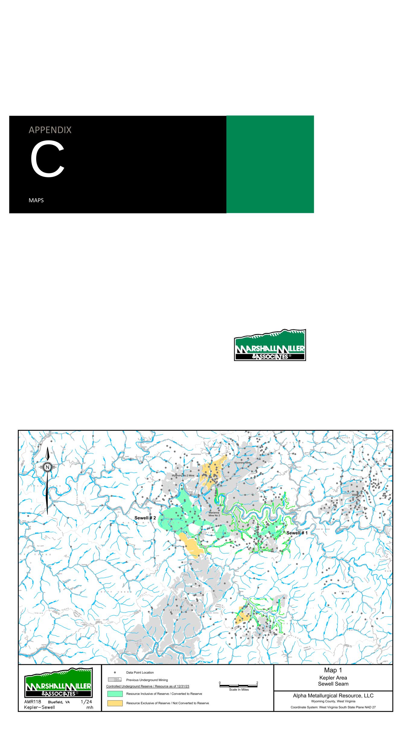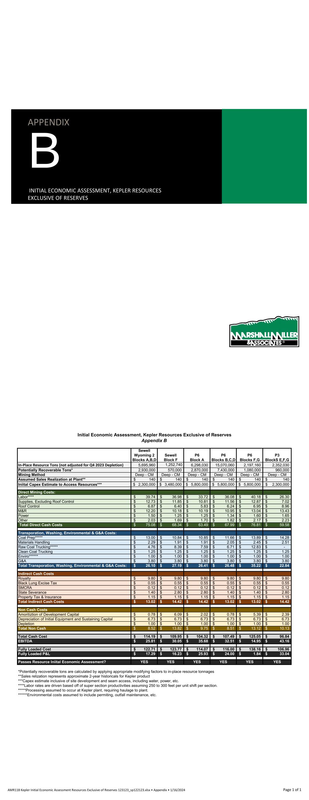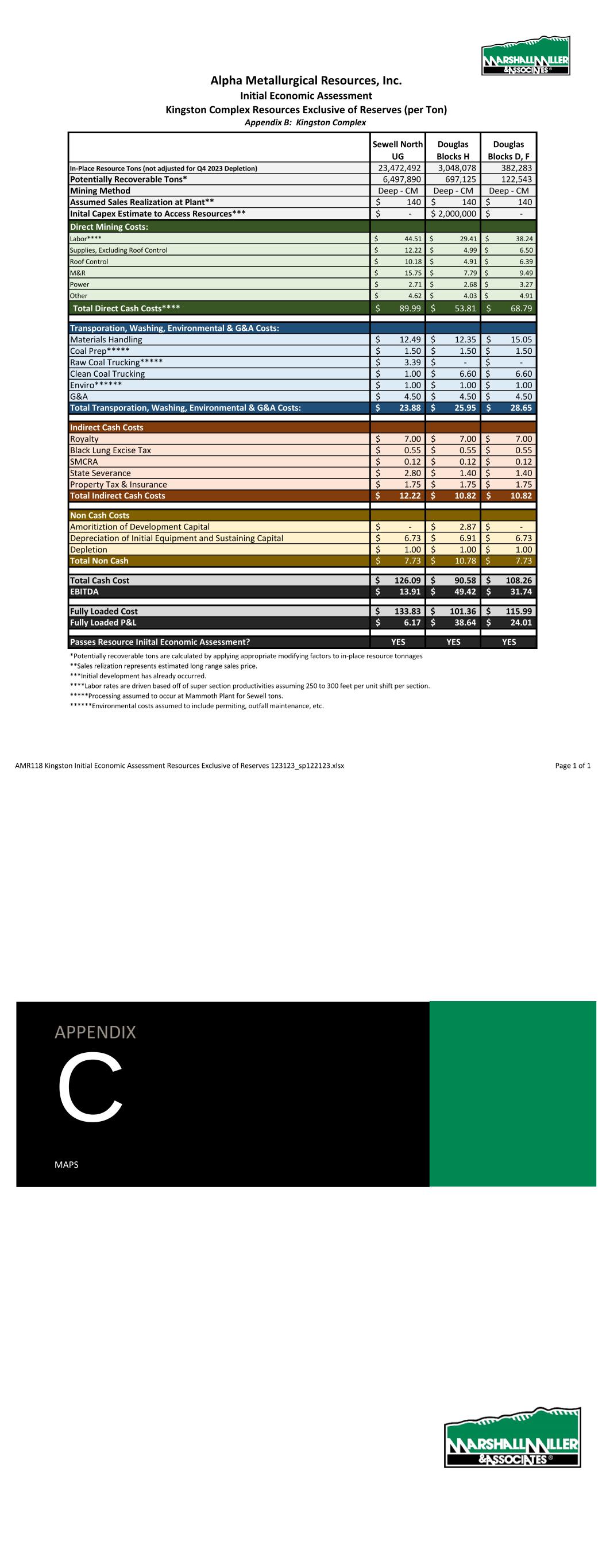 Alpha Metallurgical Resources, Inc. Initial Economic Assessment, Resources Exclusive of Reserves (per Ton) Appendix B: Elk Run Complex Seam: POW UCG UCG UCG UCG PEER Elk Run Elk Run Elk Run Elk Run Elk Run Elk Run Area: Checkmate Blocks L,M,O Prenter Block H Prenter Block I Prenter Block J Prenter Blocks K&L Castle Peerless In-Place Resource Tons (not adjusted for Q4 2023 Depletion) 14,220,164 4,893,701 6,603,427 3,733,210 21,697,263 16,814,606 Potentially Recoverable Tons* 3,191,538 1,783,479 2,031,406 1,374,111 5,648,828 5,306,362 Mining Method Deep - CM Deep - CM Deep - CM Deep - CM Deep - CM Deep - CM Assumed Sales Realization at Plant** 130$ 130$ 130$ 130$ 130$ 130$ Iniital Capex Estimate to Access Resources*** -$ 9,000,000$ 9,000,000$ 9,000,000$ 9,000,000$ 92,380,000$ Direct Mining Costs: Labor**** 28.48$ 28.65$ 30.42$ 27.83$ 26.72$ 31.72$ Supplies, Excluding Roof Control 7.99$ 8.04$ 8.53$ 7.81$ 7.50$ 8.90$ Roof Control 5.40$ 5.44$ 5.77$ 5.28$ 5.07$ 6.02$ M&R 13.17$ 11.54$ 12.59$ 11.05$ 12.05$ 11.22$ Power 2.63$ 2.31$ 2.52$ 2.21$ 2.41$ 2.24$ Other 3.29$ 2.88$ 3.15$ 2.76$ 3.01$ 2.81$ Total Direct Cash Costs 60.96$ 58.86$ 62.98$ 56.93$ 56.76$ 62.92$ Transporation, Washing, Environmental & G&A Costs: Coal Prep***** 11.30$ 9.90$ 10.81$ 9.48$ 10.34$ 9.63$ Materials Handling 1.50$ 1.50$ 1.50$ 1.50$ 1.50$ 1.50$ Raw Coal Trucking***** -$ 7.79$ 12.17$ 3.98$ 14.81$ -$ Clean Coal Trucking 1.25$ 1.25$ 1.25$ 1.25$ 1.25$ 1.25$ Enviro****** 0.35$ 0.35$ 0.35$ 0.35$ 0.35$ 0.35$ G&A 5.35$ 5.35$ 5.35$ 5.35$ 5.35$ 5.35$ Total Transporation, Washing, Environmental & G&A Costs: 19.75$ 26.14$ 31.43$ 21.91$ 33.60$ 18.08$ Indirect Cash Costs Royalty 7.80$ 7.80$ 7.80$ 7.80$ 7.80$ 7.80$ Black Lung Excise Tax 0.55$ 0.55$ 0.55$ 0.55$ 0.55$ 0.55$ SMCRA 0.12$ 0.12$ 0.12$ 0.12$ 0.12$ 0.12$ State Severance 6.50$ 2.60$ 2.60$ 2.60$ 6.50$ 2.60$ Property Tax & Insurance 2.50$ 2.50$ 2.50$ 2.50$ 2.50$ 2.50$ Total Indirect Cash Costs 17.47$ 13.57$ 13.57$ 13.57$ 17.47$ 13.57$ Non Cash Costs Amoritiztion of Development Capital -$ 5.05$ 4.43$ 6.55$ 1.59$ 17.41$ Depreciation of Initial Equipment and Sustaining Capital 6.73$ 6.73$ 6.73$ 6.73$ 6.73$ 6.73$ Depletion 1.00$ 1.00$ 1.00$ 1.00$ 1.00$ 1.00$ Total Non Cash 7.73$ 12.78$ 12.16$ 14.28$ 9.33$ 25.14$ Total Cash Cost 98.19$ 98.57$ 107.99$ 92.41$ 107.83$ 94.57$ EBITDA 31.81$ 31.43$ 22.01$ 37.59$ 22.17$ 35.43$ Fully Loaded Cost 105.92$ 111.35$ 120.15$ 106.69$ 117.15$ 119.71$ Fully Loaded P&L 24.08$ 18.65$ 9.85$ 23.31$ 12.85$ 10.29$ Passes Resource Iniital Economic Assessment? YES YES YES YES YES YES *Potentially recoverable tons are calculated by applying appropriate modifying factors to in-place resource tonnages **Sales relization represents estimated long range sales price. ***No initial capital required where resources are accessible from existing mines. ****Labor rates are driven based off of super section productivities assuming 250 to 300 feet per unit shift per section. *****Processing assumed to occur at Elk Run plant. ******Environmental costs assumed to include permiting, outfall maintenance, etc. AMR118 Elk Run Initial Economic Assessment Resources Exclusive of Reserves 123123_122123.xlsx Page 1 of 1 APPENDIX C MAPS