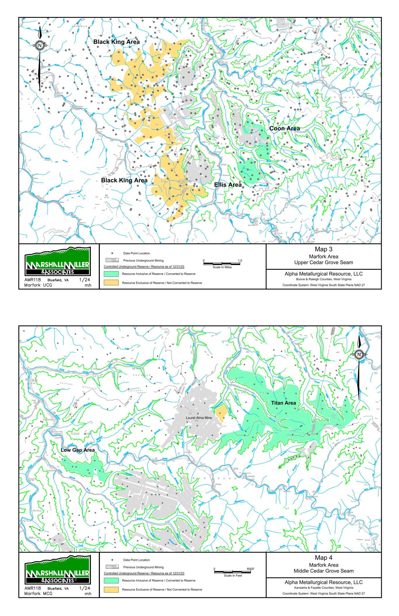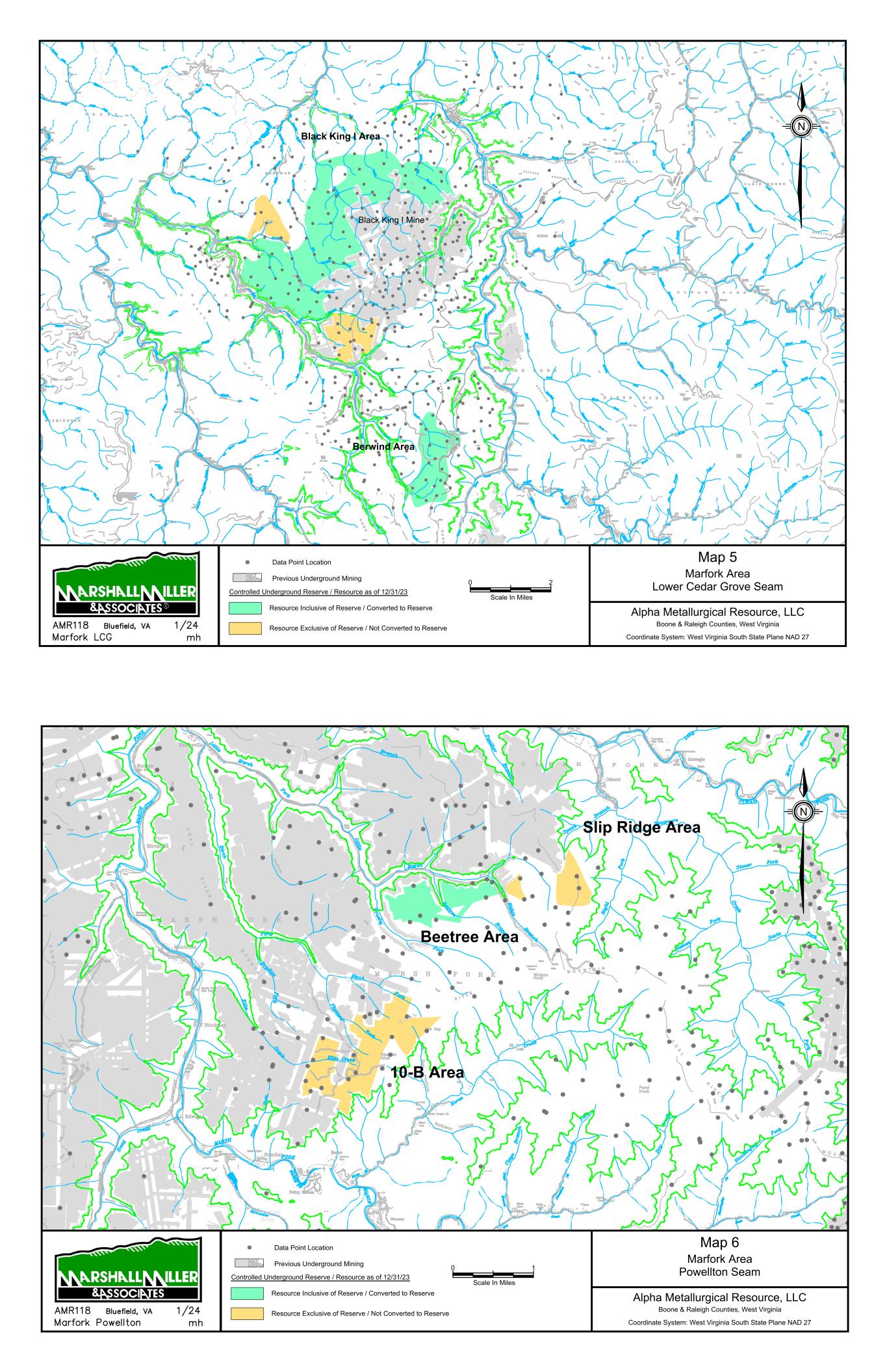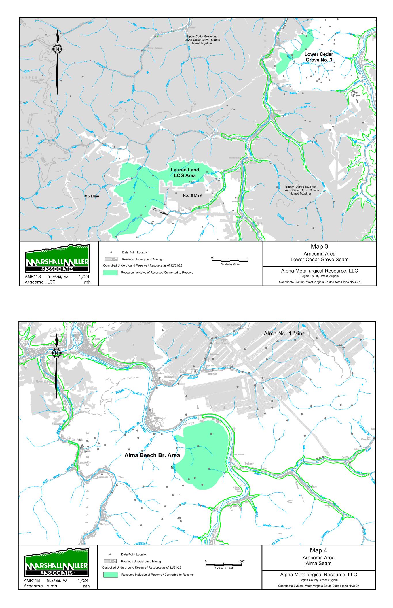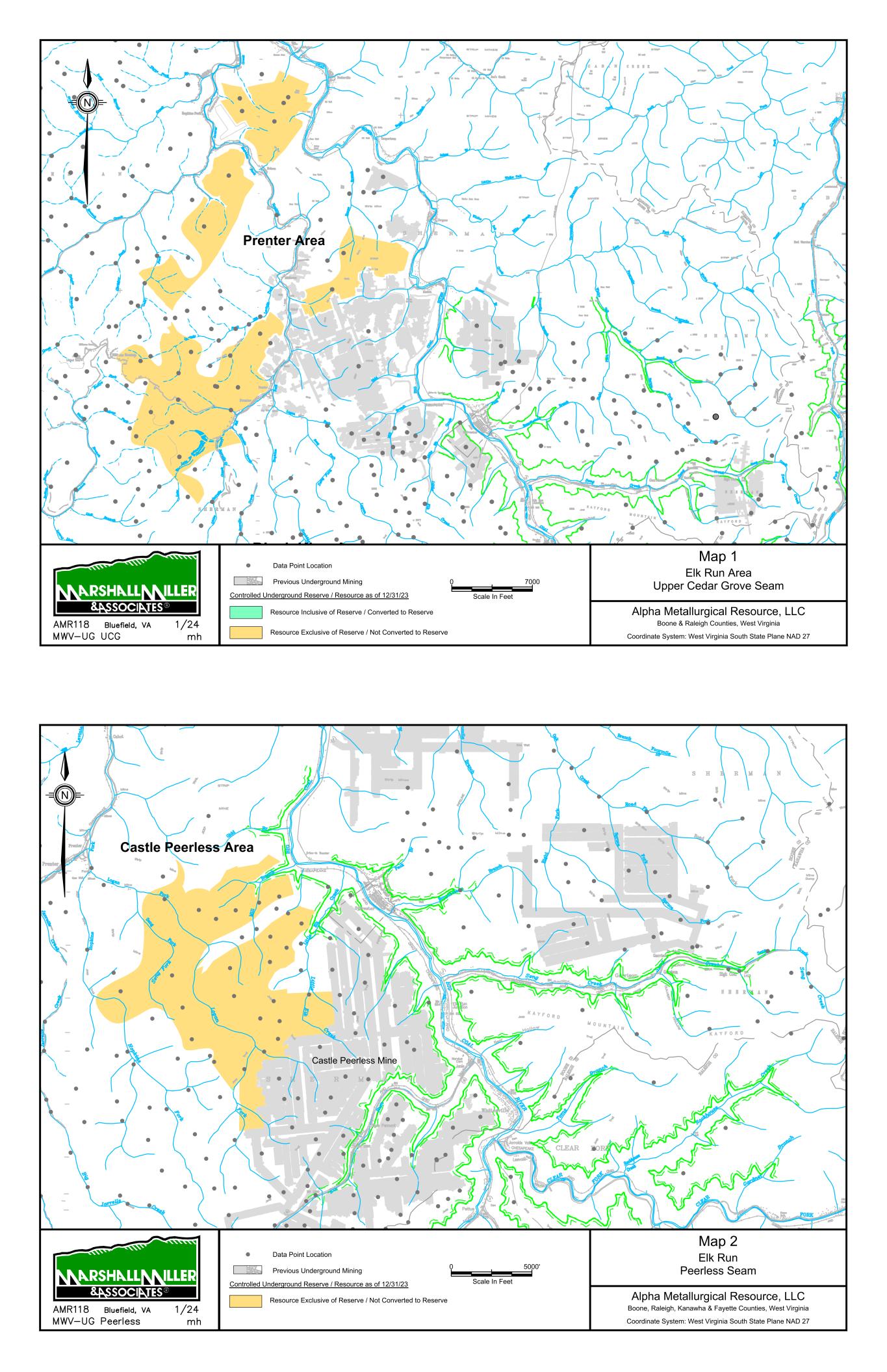 9/14/67 Prenter Area Black King Area 7000 Scale In Feet 0 Data Point Location Map 1 Elk Run Area Upper Cedar Grove Seam Alpha Metallurgical Resource, LLC Boone & Raleigh Counties, West Virginia Coordinate System: West Virginia South State Plane NAD 27 Controlled Underground Reserve / Resource as of 12/31/23 Previous Underground Mining N Resource Exclusive of Reserve / Not Converted to Reserve Resource Inclusive of Reserve / Converted to Reserve Caymus Mine Castle East Portal Mine Castle Peerless Mine Castle Peerless Area 5000' Scale In Feet 0 Data Point Location Map 2 Elk Run Peerless Seam Alpha Metallurgical Resource, LLC Boone, Raleigh, Kanawha & Fayette Counties, West Virginia Coordinate System: West Virginia South State Plane NAD 27 Controlled Underground Reserve / Resource as of 12/31/23 Previous Underground Mining N Resource Exclusive of Reserve / Not Converted to Reserve