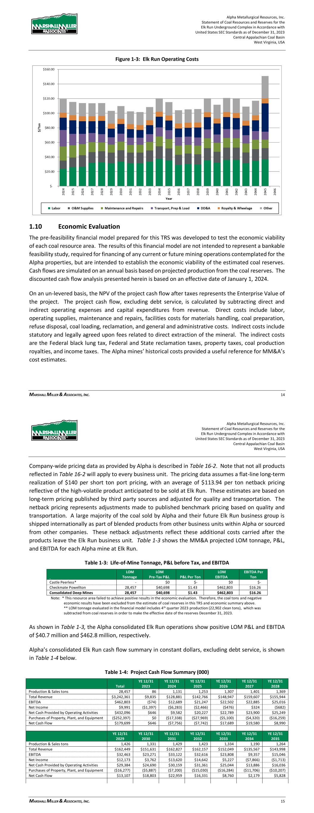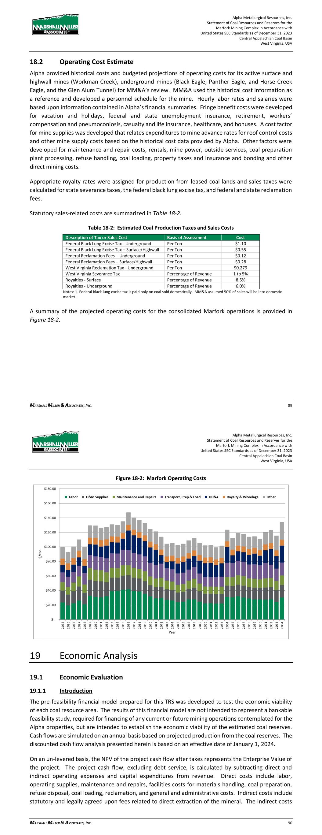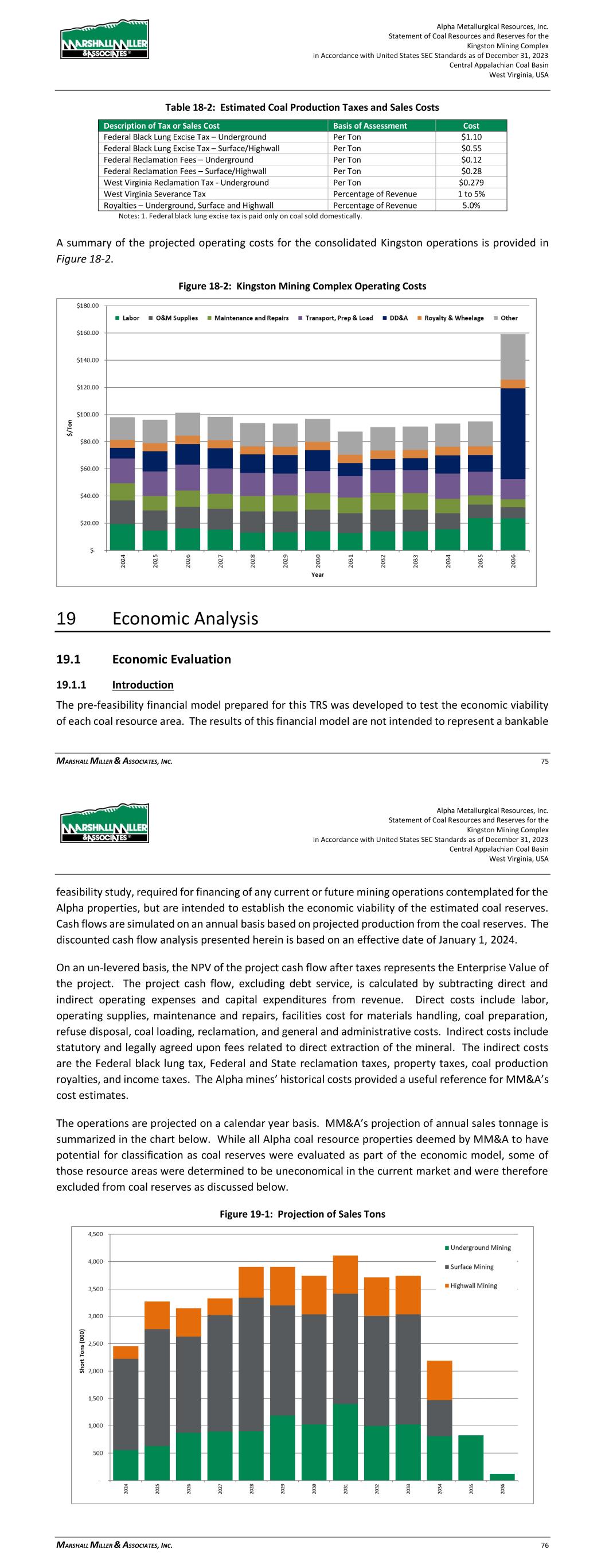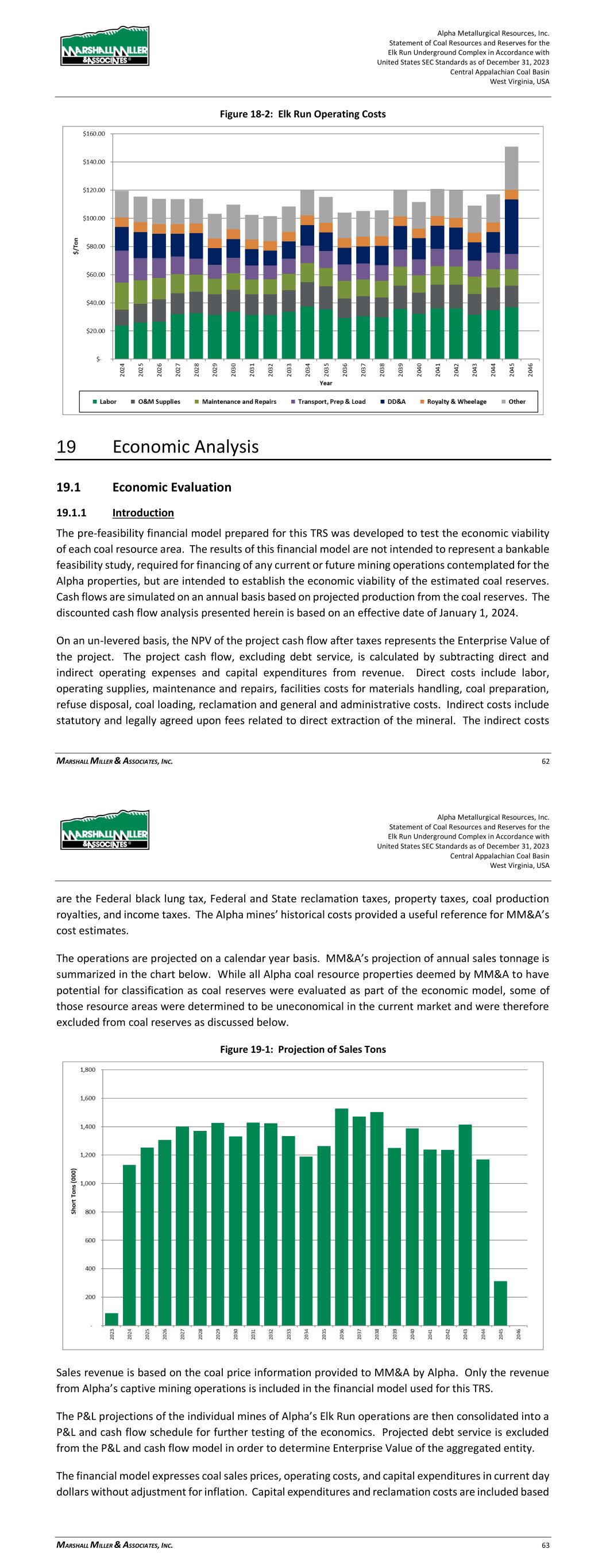 Alpha Metallurgical Resources, Inc. Statement of Coal Resources and Reserves for the Elk Run Underground Complex in Accordance with United States SEC Standards as of December 31, 2023 Central Appalachian Coal Basin West Virginia, USA MARSHALL MILLER & ASSOCIATES, INC. 62 Figure 18-2: Elk Run Operating Costs 19 Economic Analysis 19.1 Economic Evaluation 19.1.1 Introduction The pre-feasibility financial model prepared for this TRS was developed to test the economic viability of each coal resource area. The results of this financial model are not intended to represent a bankable feasibility study, required for financing of any current or future mining operations contemplated for the Alpha properties, but are intended to establish the economic viability of the estimated coal reserves. Cash flows are simulated on an annual basis based on projected production from the coal reserves. The discounted cash flow analysis presented herein is based on an effective date of January 1, 2024. On an un-levered basis, the NPV of the project cash flow after taxes represents the Enterprise Value of the project. The project cash flow, excluding debt service, is calculated by subtracting direct and indirect operating expenses and capital expenditures from revenue. Direct costs include labor, operating supplies, maintenance and repairs, facilities costs for materials handling, coal preparation, refuse disposal, coal loading, reclamation and general and administrative costs. Indirect costs include statutory and legally agreed upon fees related to direct extraction of the mineral. The indirect costs Alpha Metallurgical Resources, Inc. Statement of Coal Resources and Reserves for the Elk Run Underground Complex in Accordance with United States SEC Standards as of December 31, 2023 Central Appalachian Coal Basin West Virginia, USA MARSHALL MILLER & ASSOCIATES, INC. 63 are the Federal black lung tax, Federal and State reclamation taxes, property taxes, coal production royalties, and income taxes. The Alpha mines’ historical costs provided a useful reference for MM&A’s cost estimates. The operations are projected on a calendar year basis. MM&A’s projection of annual sales tonnage is summarized in the chart below. While all Alpha coal resource properties deemed by MM&A to have potential for classification as coal reserves were evaluated as part of the economic model, some of those resource areas were determined to be uneconomical in the current market and were therefore excluded from coal reserves as discussed below. Figure 19-1: Projection of Sales Tons Sales revenue is based on the coal price information provided to MM&A by Alpha. Only the revenue from Alpha’s captive mining operations is included in the financial model used for this TRS. The P&L projections of the individual mines of Alpha’s Elk Run operations are then consolidated into a P&L and cash flow schedule for further testing of the economics. Projected debt service is excluded from the P&L and cash flow model in order to determine Enterprise Value of the aggregated entity. The financial model expresses coal sales prices, operating costs, and capital expenditures in current day dollars without adjustment for inflation. Capital expenditures and reclamation costs are included based