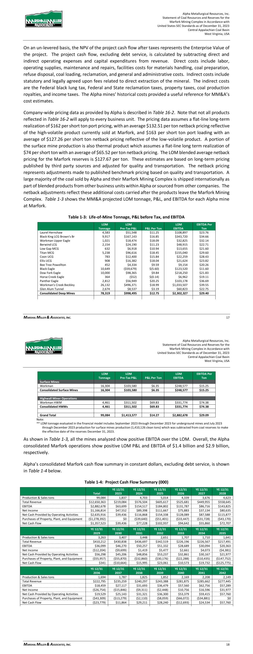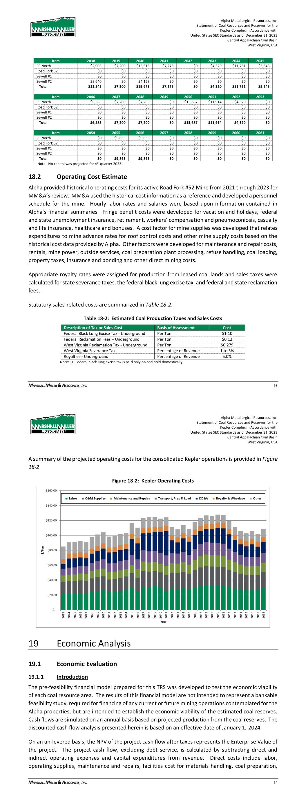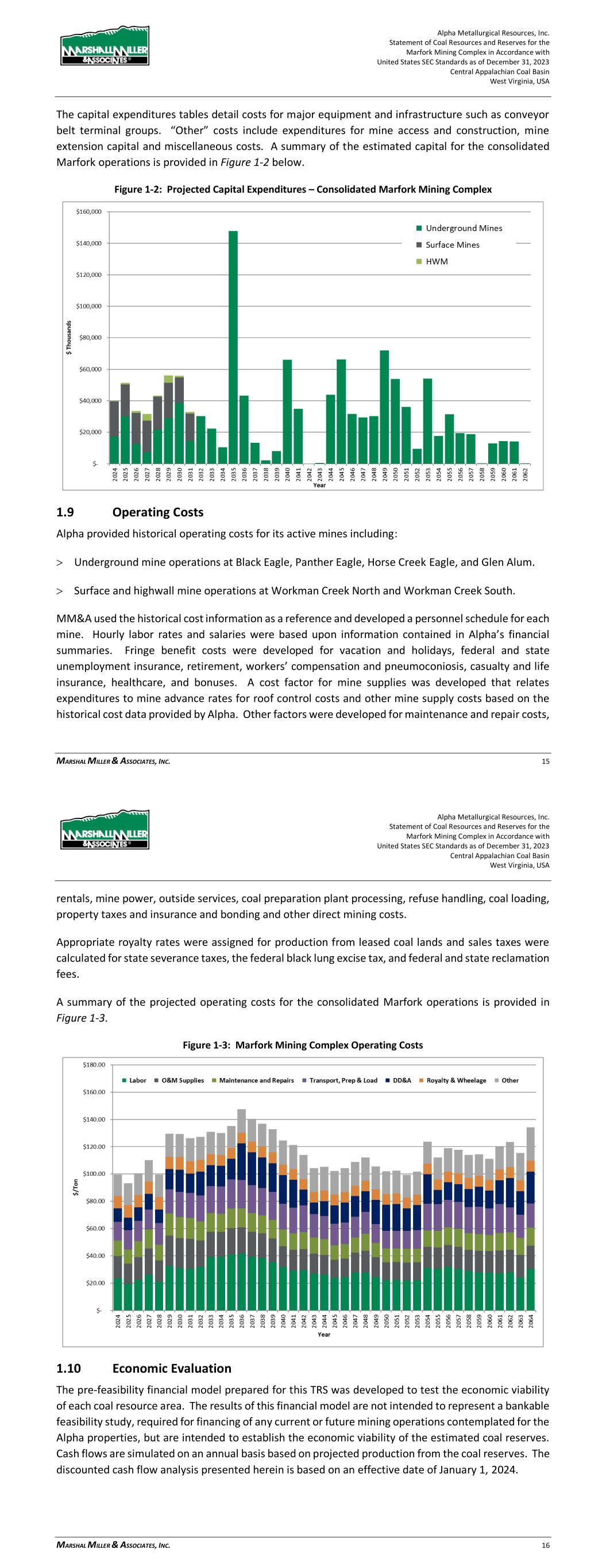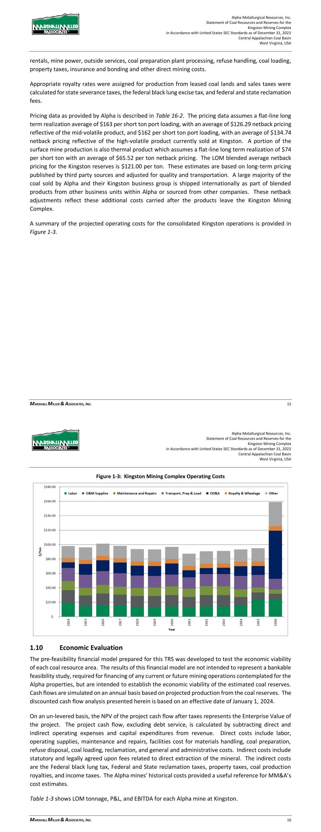 Alpha Metallurgical Resources, Inc. Statement of Coal Resources and Reserves for the Elk Run Underground Complex in Accordance with United States SEC Standards as of December 31, 2023 Central Appalachian Coal Basin West Virginia, USA MARSHALL MILLER & ASSOCIATES, INC. 62 Figure 18-2: Elk Run Operating Costs 19 Economic Analysis 19.1 Economic Evaluation 19.1.1 Introduction The pre-feasibility financial model prepared for this TRS was developed to test the economic viability of each coal resource area. The results of this financial model are not intended to represent a bankable feasibility study, required for financing of any current or future mining operations contemplated for the Alpha properties, but are intended to establish the economic viability of the estimated coal reserves. Cash flows are simulated on an annual basis based on projected production from the coal reserves. The discounted cash flow analysis presented herein is based on an effective date of January 1, 2024. On an un-levered basis, the NPV of the project cash flow after taxes represents the Enterprise Value of the project. The project cash flow, excluding debt service, is calculated by subtracting direct and indirect operating expenses and capital expenditures from revenue. Direct costs include labor, operating supplies, maintenance and repairs, facilities costs for materials handling, coal preparation, refuse disposal, coal loading, reclamation and general and administrative costs. Indirect costs include statutory and legally agreed upon fees related to direct extraction of the mineral. The indirect costs Alpha Metallurgical Resources, Inc. Statement of Coal Resources and Reserves for the Elk Run Underground Complex in Accordance with United States SEC Standards as of December 31, 2023 Central Appalachian Coal Basin West Virginia, USA MARSHALL MILLER & ASSOCIATES, INC. 63 are the Federal black lung tax, Federal and State reclamation taxes, property taxes, coal production royalties, and income taxes. The Alpha mines’ historical costs provided a useful reference for MM&A’s cost estimates. The operations are projected on a calendar year basis. MM&A’s projection of annual sales tonnage is summarized in the chart below. While all Alpha coal resource properties deemed by MM&A to have potential for classification as coal reserves were evaluated as part of the economic model, some of those resource areas were determined to be uneconomical in the current market and were therefore excluded from coal reserves as discussed below. Figure 19-1: Projection of Sales Tons Sales revenue is based on the coal price information provided to MM&A by Alpha. Only the revenue from Alpha’s captive mining operations is included in the financial model used for this TRS. The P&L projections of the individual mines of Alpha’s Elk Run operations are then consolidated into a P&L and cash flow schedule for further testing of the economics. Projected debt service is excluded from the P&L and cash flow model in order to determine Enterprise Value of the aggregated entity. The financial model expresses coal sales prices, operating costs, and capital expenditures in current day dollars without adjustment for inflation. Capital expenditures and reclamation costs are included based
