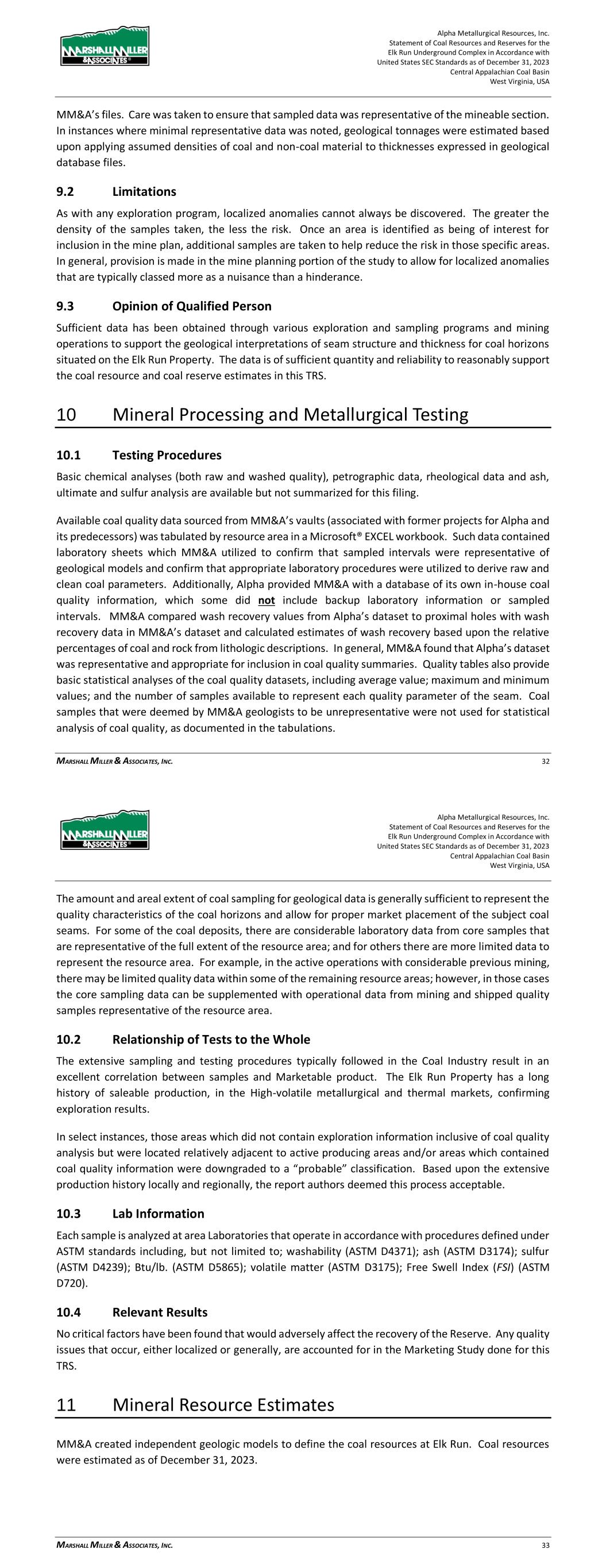 Alpha Metallurgical Resources, Inc. Statement of Coal Resources and Reserves for the Elk Run Underground Complex in Accordance with United States SEC Standards as of December 31, 2023 Central Appalachian Coal Basin West Virginia, USA MARSHALL MILLER & ASSOCIATES, INC. 32 MM&A’s files. Care was taken to ensure that sampled data was representative of the mineable section. In instances where minimal representative data was noted, geological tonnages were estimated based upon applying assumed densities of coal and non-coal material to thicknesses expressed in geological database files. 9.2 Limitations As with any exploration program, localized anomalies cannot always be discovered. The greater the density of the samples taken, the less the risk. Once an area is identified as being of interest for inclusion in the mine plan, additional samples are taken to help reduce the risk in those specific areas. In general, provision is made in the mine planning portion of the study to allow for localized anomalies that are typically classed more as a nuisance than a hinderance. 9.3 Opinion of Qualified Person Sufficient data has been obtained through various exploration and sampling programs and mining operations to support the geological interpretations of seam structure and thickness for coal horizons situated on the Elk Run Property. The data is of sufficient quantity and reliability to reasonably support the coal resource and coal reserve estimates in this TRS. 10 Mineral Processing and Metallurgical Testing 10.1 Testing Procedures Basic chemical analyses (both raw and washed quality), petrographic data, rheological data and ash, ultimate and sulfur analysis are available but not summarized for this filing. Available coal quality data sourced from MM&A’s vaults (associated with former projects for Alpha and its predecessors) was tabulated by resource area in a Microsoft® EXCEL workbook. Such data contained laboratory sheets which MM&A utilized to confirm that sampled intervals were representative of geological models and confirm that appropriate laboratory procedures were utilized to derive raw and clean coal parameters. Additionally, Alpha provided MM&A with a database of its own in-house coal quality information, which some did not include backup laboratory information or sampled intervals. MM&A compared wash recovery values from Alpha’s dataset to proximal holes with wash recovery data in MM&A’s dataset and calculated estimates of wash recovery based upon the relative percentages of coal and rock from lithologic descriptions. In general, MM&A found that Alpha’s dataset was representative and appropriate for inclusion in coal quality summaries. Quality tables also provide basic statistical analyses of the coal quality datasets, including average value; maximum and minimum values; and the number of samples available to represent each quality parameter of the seam. Coal samples that were deemed by MM&A geologists to be unrepresentative were not used for statistical analysis of coal quality, as documented in the tabulations. Alpha Metallurgical Resources, Inc. Statement of Coal Resources and Reserves for the Elk Run Underground Complex in Accordance with United States SEC Standards as of December 31, 2023 Central Appalachian Coal Basin West Virginia, USA MARSHALL MILLER & ASSOCIATES, INC. 33 The amount and areal extent of coal sampling for geological data is generally sufficient to represent the quality characteristics of the coal horizons and allow for proper market placement of the subject coal seams. For some of the coal deposits, there are considerable laboratory data from core samples that are representative of the full extent of the resource area; and for others there are more limited data to represent the resource area. For example, in the active operations with considerable previous mining, there may be limited quality data within some of the remaining resource areas; however, in those cases the core sampling data can be supplemented with operational data from mining and shipped quality samples representative of the resource area. 10.2 Relationship of Tests to the Whole The extensive sampling and testing procedures typically followed in the Coal Industry result in an excellent correlation between samples and Marketable product. The Elk Run Property has a long history of saleable production, in the High-volatile metallurgical and thermal markets, confirming exploration results. In select instances, those areas which did not contain exploration information inclusive of coal quality analysis but were located relatively adjacent to active producing areas and/or areas which contained coal quality information were downgraded to a “probable” classification. Based upon the extensive production history locally and regionally, the report authors deemed this process acceptable. 10.3 Lab Information Each sample is analyzed at area Laboratories that operate in accordance with procedures defined under ASTM standards including, but not limited to; washability (ASTM D4371); ash (ASTM D3174); sulfur (ASTM D4239); Btu/lb. (ASTM D5865); volatile matter (ASTM D3175); Free Swell Index (FSI) (ASTM D720). 10.4 Relevant Results No critical factors have been found that would adversely affect the recovery of the Reserve. Any quality issues that occur, either localized or generally, are accounted for in the Marketing Study done for this TRS. 11 Mineral Resource Estimates MM&A created independent geologic models to define the coal resources at Elk Run. Coal resources were estimated as of December 31, 2023.