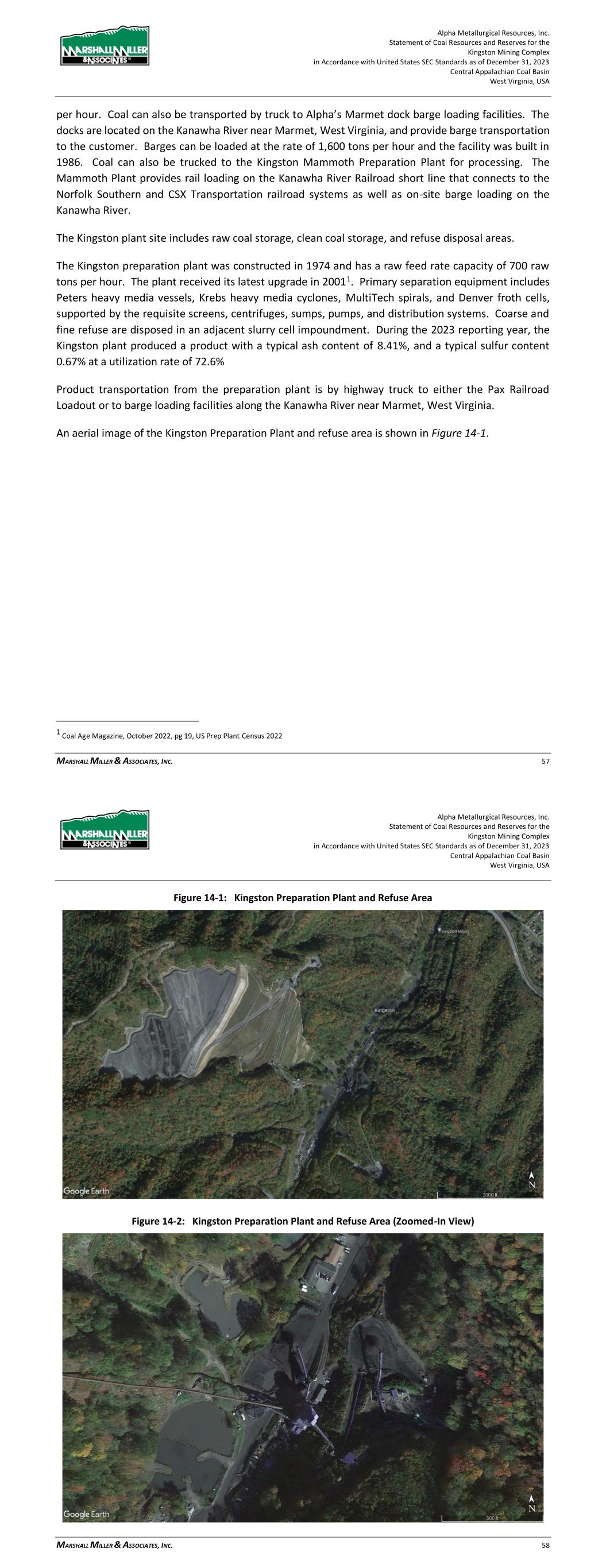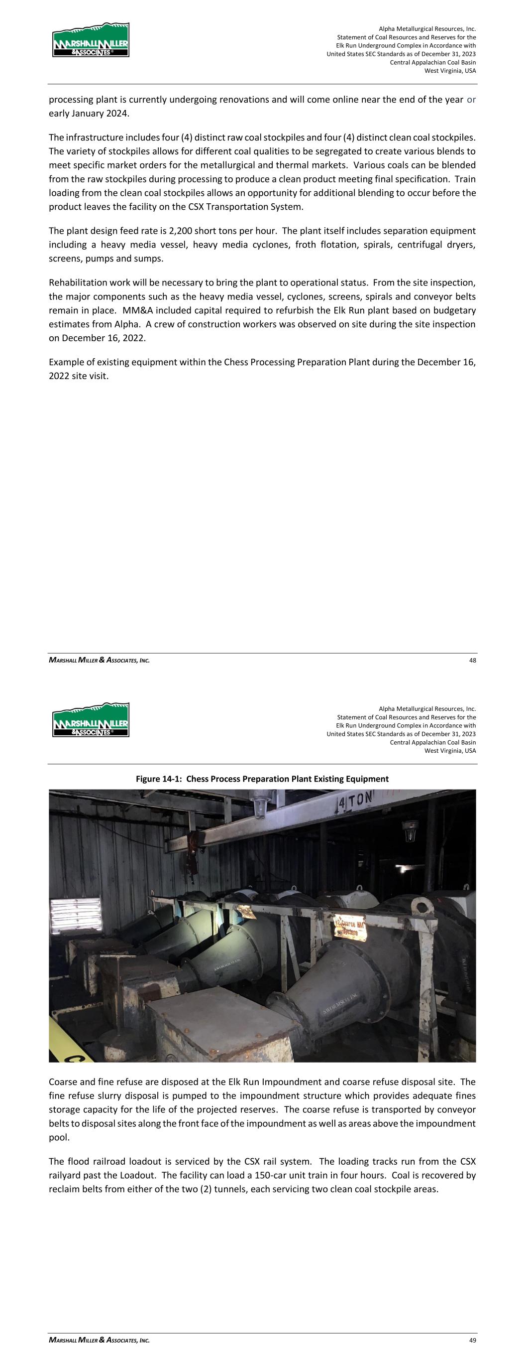 Alpha Metallurgical Resources, Inc. Statement of Coal Resources and Reserves for the Elk Run Underground Complex in Accordance with United States SEC Standards as of December 31, 2023 Central Appalachian Coal Basin West Virginia, USA MARSHALL MILLER & ASSOCIATES, INC. 48 processing plant is currently undergoing renovations and will come online near the end of the year or early January 2024. The infrastructure includes four (4) distinct raw coal stockpiles and four (4) distinct clean coal stockpiles. The variety of stockpiles allows for different coal qualities to be segregated to create various blends to meet specific market orders for the metallurgical and thermal markets. Various coals can be blended from the raw stockpiles during processing to produce a clean product meeting final specification. Train loading from the clean coal stockpiles allows an opportunity for additional blending to occur before the product leaves the facility on the CSX Transportation System. The plant design feed rate is 2,200 short tons per hour. The plant itself includes separation equipment including a heavy media vessel, heavy media cyclones, froth flotation, spirals, centrifugal dryers, screens, pumps and sumps. Rehabilitation work will be necessary to bring the plant to operational status. From the site inspection, the major components such as the heavy media vessel, cyclones, screens, spirals and conveyor belts remain in place. MM&A included capital required to refurbish the Elk Run plant based on budgetary estimates from Alpha. A crew of construction workers was observed on site during the site inspection on December 16, 2022. Example of existing equipment within the Chess Processing Preparation Plant during the December 16, 2022 site visit. Alpha Metallurgical Resources, Inc. Statement of Coal Resources and Reserves for the Elk Run Underground Complex in Accordance with United States SEC Standards as of December 31, 2023 Central Appalachian Coal Basin West Virginia, USA MARSHALL MILLER & ASSOCIATES, INC. 49 Figure 14-1: Chess Process Preparation Plant Existing Equipment Coarse and fine refuse are disposed at the Elk Run Impoundment and coarse refuse disposal site. The fine refuse slurry disposal is pumped to the impoundment structure which provides adequate fines storage capacity for the life of the projected reserves. The coarse refuse is transported by conveyor belts to disposal sites along the front face of the impoundment as well as areas above the impoundment pool. The flood railroad loadout is serviced by the CSX rail system. The loading tracks run from the CSX railyard past the Loadout. The facility can load a 150-car unit train in four hours. Coal is recovered by reclaim belts from either of the two (2) tunnels, each servicing two clean coal stockpile areas.