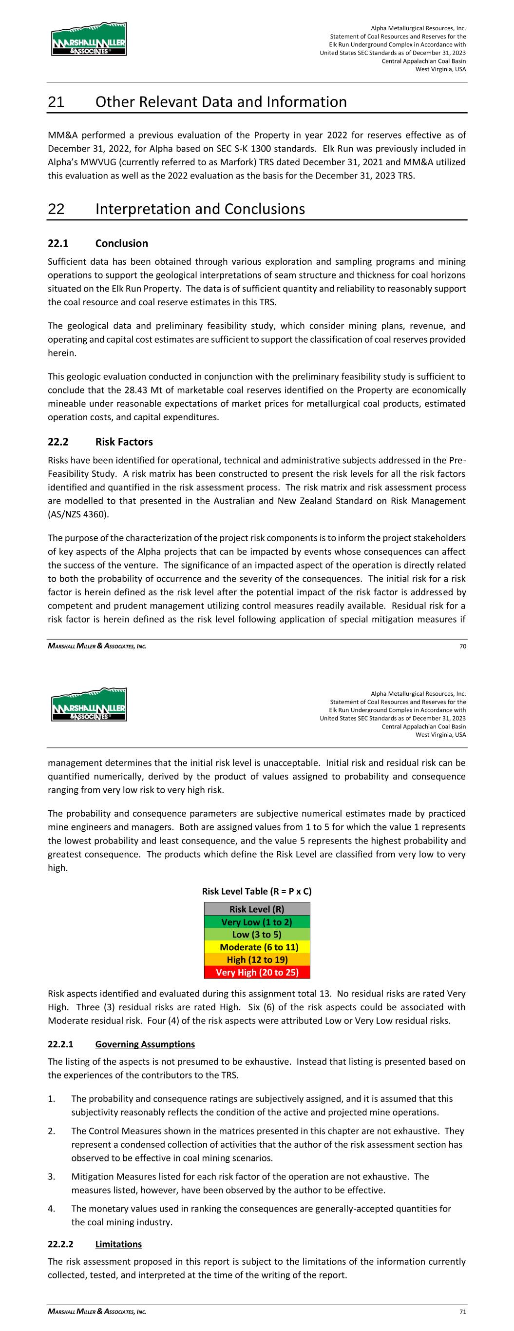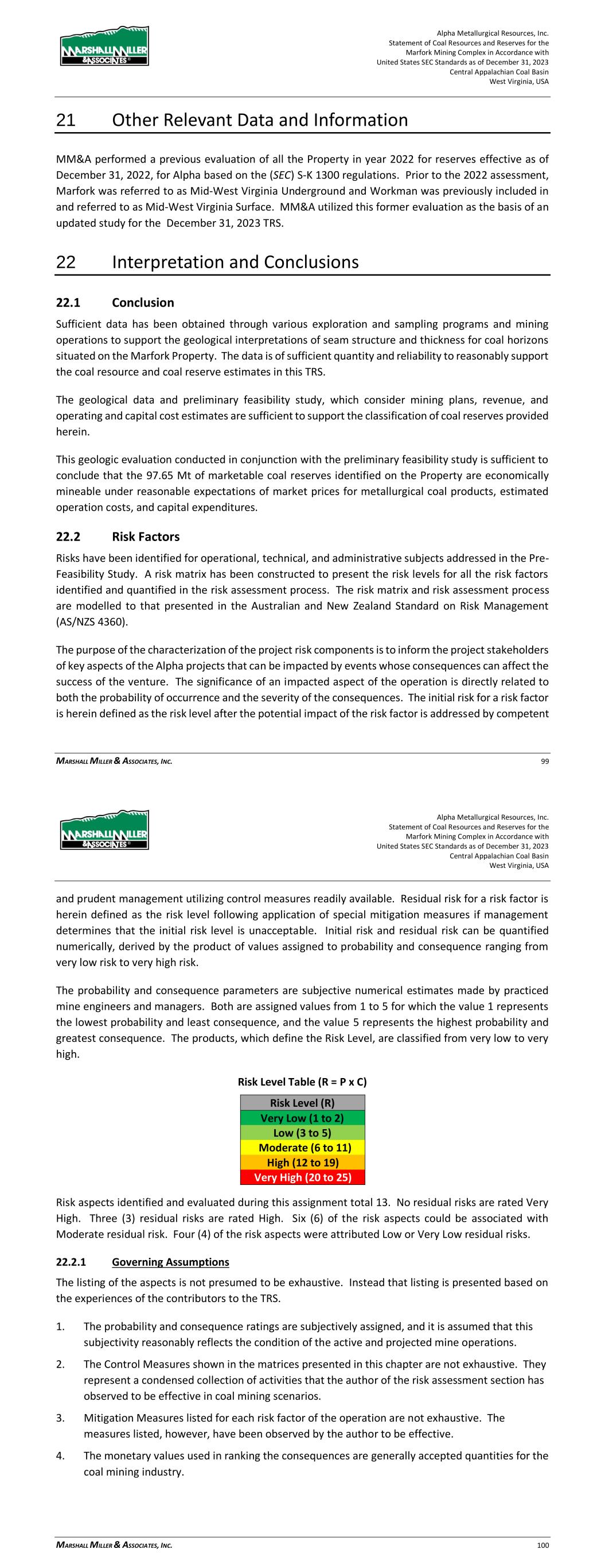 Alpha Metallurgical Resources, Inc. Statement of Coal Resources and Reserves for the Elk Run Underground Complex in Accordance with United States SEC Standards as of December 31, 2023 Central Appalachian Coal Basin West Virginia, USA MARSHALL MILLER & ASSOCIATES, INC. 70 21 Other Relevant Data and Information MM&A performed a previous evaluation of the Property in year 2022 for reserves effective as of December 31, 2022, for Alpha based on SEC S-K 1300 standards. Elk Run was previously included in Alpha’s MWVUG (currently referred to as Marfork) TRS dated December 31, 2021 and MM&A utilized this evaluation as well as the 2022 evaluation as the basis for the December 31, 2023 TRS. 22 Interpretation and Conclusions 22.1 Conclusion Sufficient data has been obtained through various exploration and sampling programs and mining operations to support the geological interpretations of seam structure and thickness for coal horizons situated on the Elk Run Property. The data is of sufficient quantity and reliability to reasonably support the coal resource and coal reserve estimates in this TRS. The geological data and preliminary feasibility study, which consider mining plans, revenue, and operating and capital cost estimates are sufficient to support the classification of coal reserves provided herein. This geologic evaluation conducted in conjunction with the preliminary feasibility study is sufficient to conclude that the 28.43 Mt of marketable coal reserves identified on the Property are economically mineable under reasonable expectations of market prices for metallurgical coal products, estimated operation costs, and capital expenditures. 22.2 Risk Factors Risks have been identified for operational, technical and administrative subjects addressed in the Pre- Feasibility Study. A risk matrix has been constructed to present the risk levels for all the risk factors identified and quantified in the risk assessment process. The risk matrix and risk assessment process are modelled to that presented in the Australian and New Zealand Standard on Risk Management (AS/NZS 4360). The purpose of the characterization of the project risk components is to inform the project stakeholders of key aspects of the Alpha projects that can be impacted by events whose consequences can affect the success of the venture. The significance of an impacted aspect of the operation is directly related to both the probability of occurrence and the severity of the consequences. The initial risk for a risk factor is herein defined as the risk level after the potential impact of the risk factor is addressed by competent and prudent management utilizing control measures readily available. Residual risk for a risk factor is herein defined as the risk level following application of special mitigation measures if Alpha Metallurgical Resources, Inc. Statement of Coal Resources and Reserves for the Elk Run Underground Complex in Accordance with United States SEC Standards as of December 31, 2023 Central Appalachian Coal Basin West Virginia, USA MARSHALL MILLER & ASSOCIATES, INC. 71 management determines that the initial risk level is unacceptable. Initial risk and residual risk can be quantified numerically, derived by the product of values assigned to probability and consequence ranging from very low risk to very high risk. The probability and consequence parameters are subjective numerical estimates made by practiced mine engineers and managers. Both are assigned values from 1 to 5 for which the value 1 represents the lowest probability and least consequence, and the value 5 represents the highest probability and greatest consequence. The products which define the Risk Level are classified from very low to very high. Risk Level Table (R = P x C) Risk Level (R) Very Low (1 to 2) Low (3 to 5) Moderate (6 to 11) High (12 to 19) Very High (20 to 25) Risk aspects identified and evaluated during this assignment total 13. No residual risks are rated Very High. Three (3) residual risks are rated High. Six (6) of the risk aspects could be associated with Moderate residual risk. Four (4) of the risk aspects were attributed Low or Very Low residual risks. 22.2.1 Governing Assumptions The listing of the aspects is not presumed to be exhaustive. Instead that listing is presented based on the experiences of the contributors to the TRS. 1. The probability and consequence ratings are subjectively assigned, and it is assumed that this subjectivity reasonably reflects the condition of the active and projected mine operations. 2. The Control Measures shown in the matrices presented in this chapter are not exhaustive. They represent a condensed collection of activities that the author of the risk assessment section has observed to be effective in coal mining scenarios. 3. Mitigation Measures listed for each risk factor of the operation are not exhaustive. The measures listed, however, have been observed by the author to be effective. 4. The monetary values used in ranking the consequences are generally-accepted quantities for the coal mining industry. 22.2.2 Limitations The risk assessment proposed in this report is subject to the limitations of the information currently collected, tested, and interpreted at the time of the writing of the report.