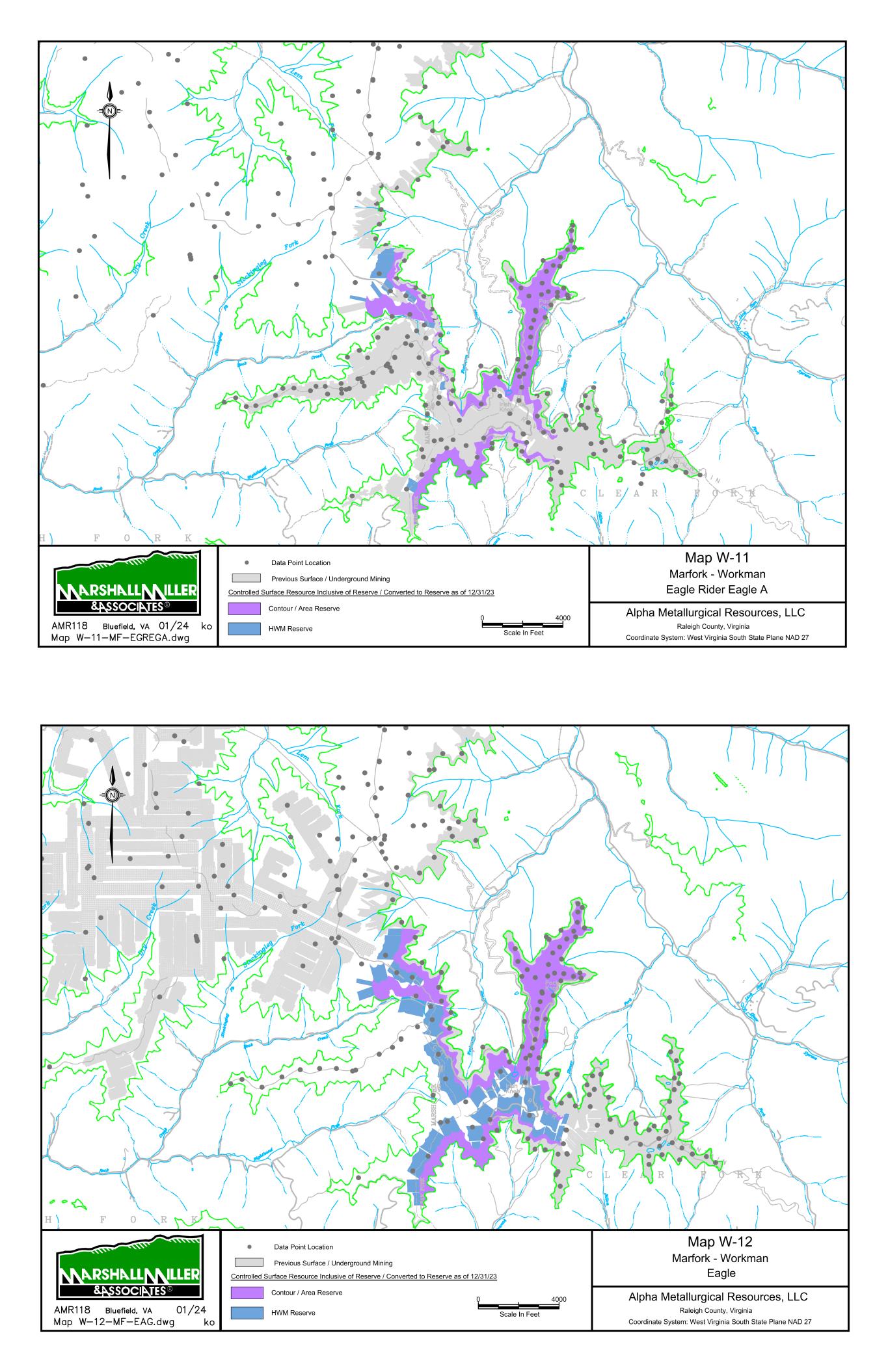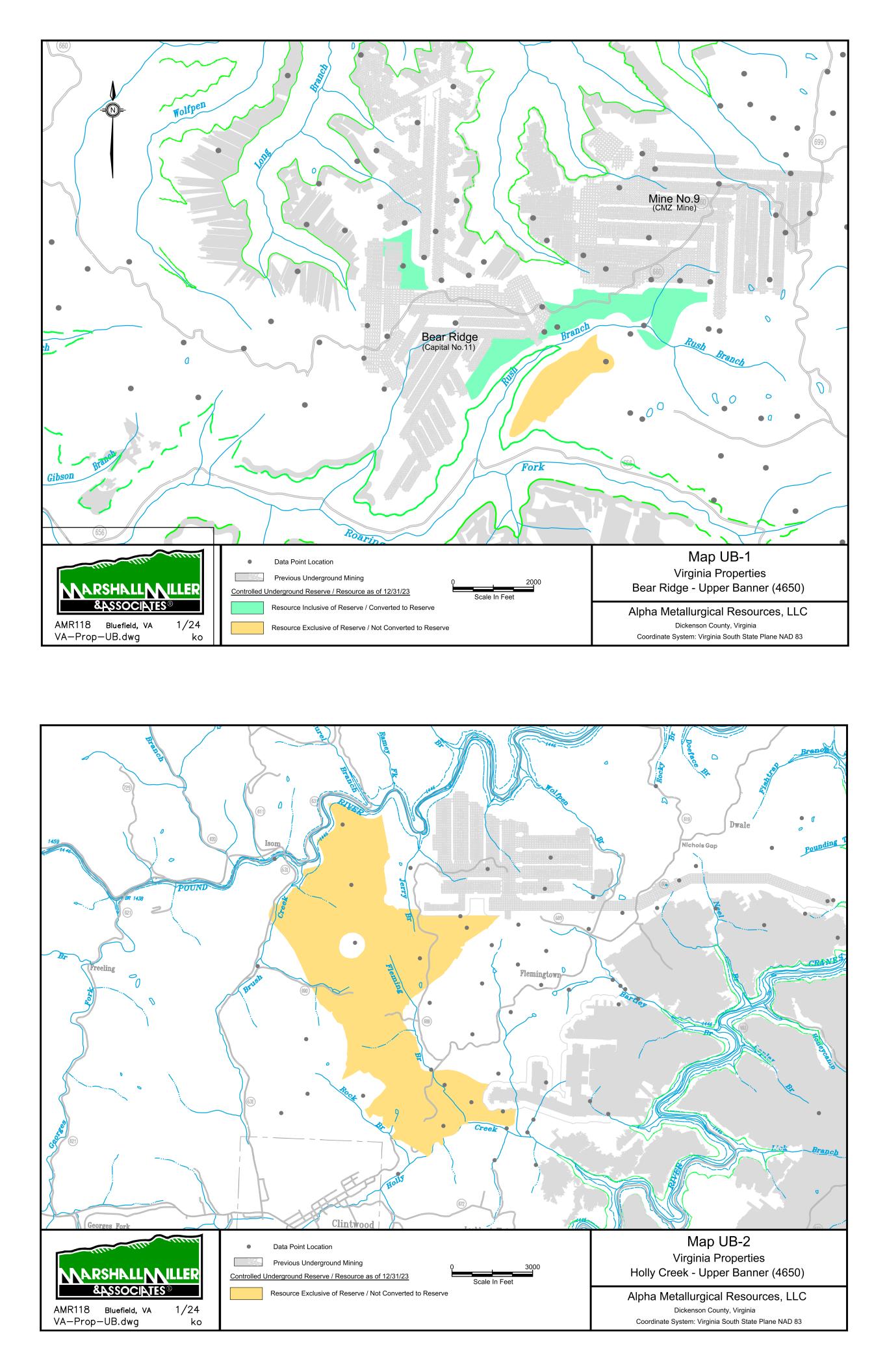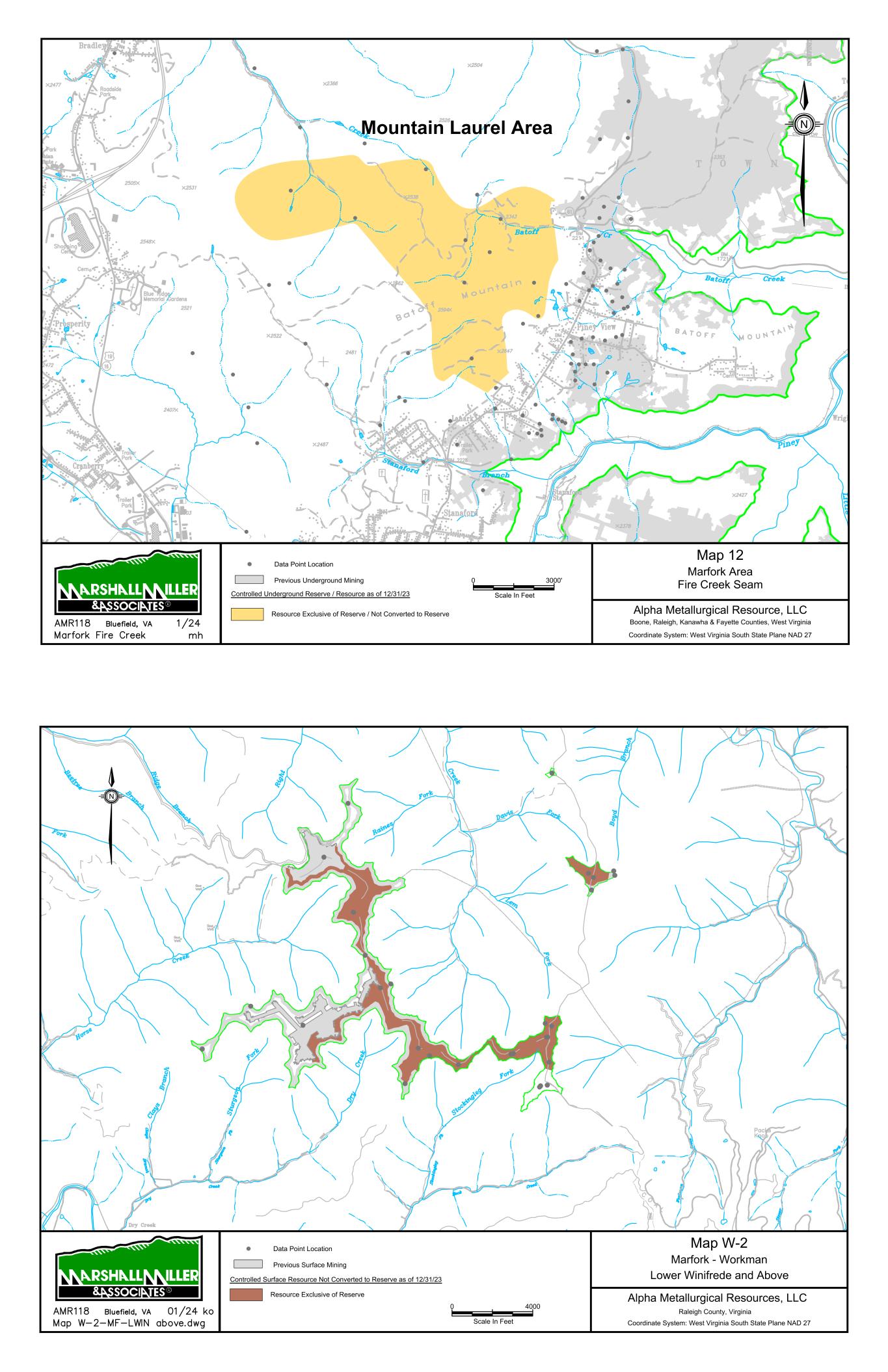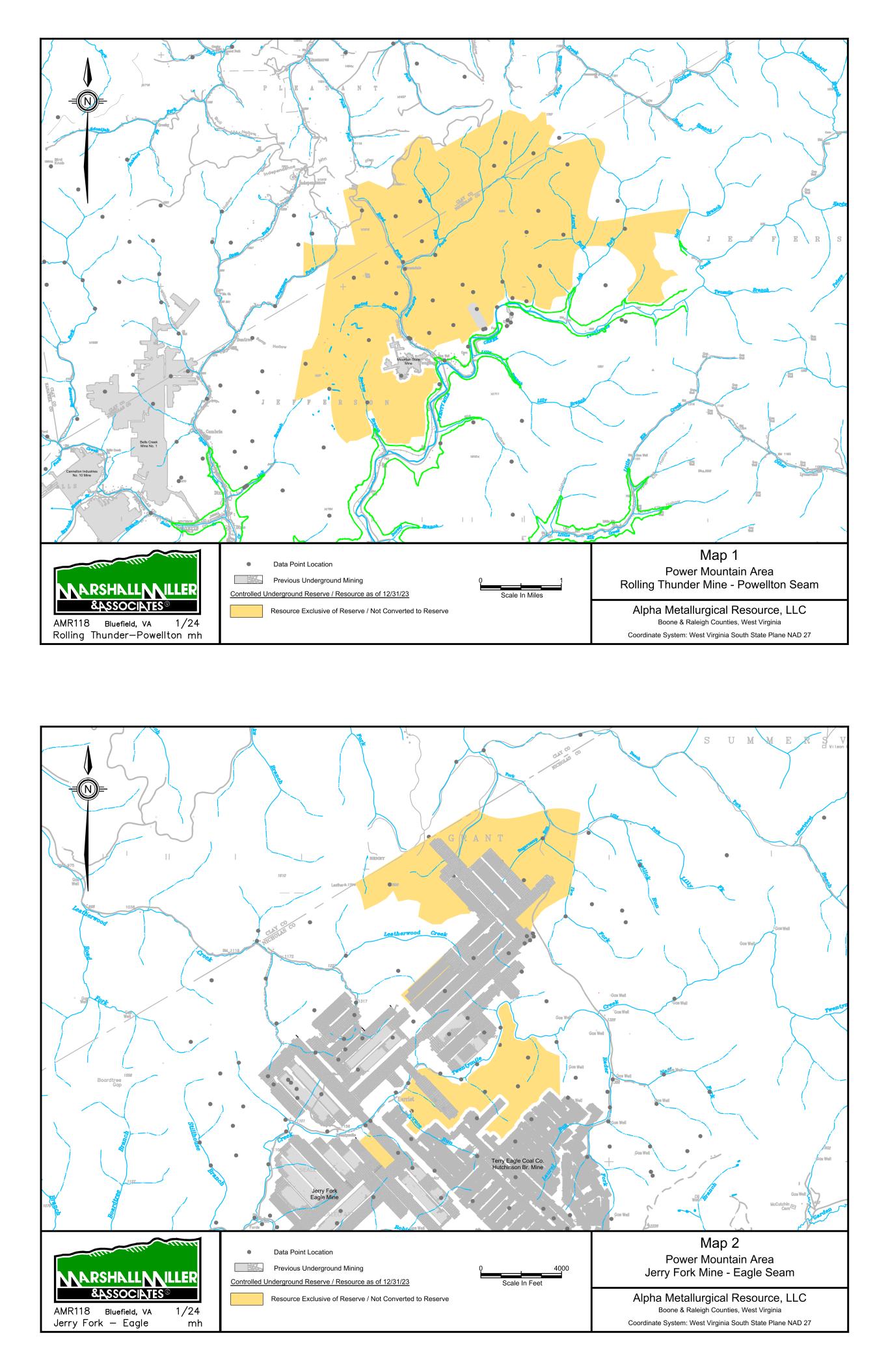 Mountain State Mine Bells Creek Mine No. 1 Cannelton Industries No. 10 Mine 1 Scale In Miles 0 Data Point Location Map 1 Power Mountain Area Rolling Thunder Mine - Powellton Seam Alpha Metallurgical Resource, LLC Boone & Raleigh Counties, West Virginia Coordinate System: West Virginia South State Plane NAD 27 Controlled Underground Reserve / Resource as of 12/31/23 Previous Underground Mining N Resource Exclusive of Reserve / Not Converted to Reserve S E A L S S E A L S TERRY EAGLE COAL CO. HUTCHINSON BR. MINE MSHA ID 46-07899 STATE ID U-3002-90 SEALED AREA SEALED AREA Jerry Fork Eagle Mine Terry Eagle Coal Co. Hutchinson Br. Mine SEALED AREA SE AL ED A RE A 4000 Scale In Feet 0 Data Point Location Map 2 Power Mountain Area Jerry Fork Mine - Eagle Seam Alpha Metallurgical Resource, LLC Boone & Raleigh Counties, West Virginia Coordinate System: West Virginia South State Plane NAD 27 Controlled Underground Reserve / Resource as of 12/31/23 Previous Underground Mining N Resource Exclusive of Reserve / Not Converted to Reserve