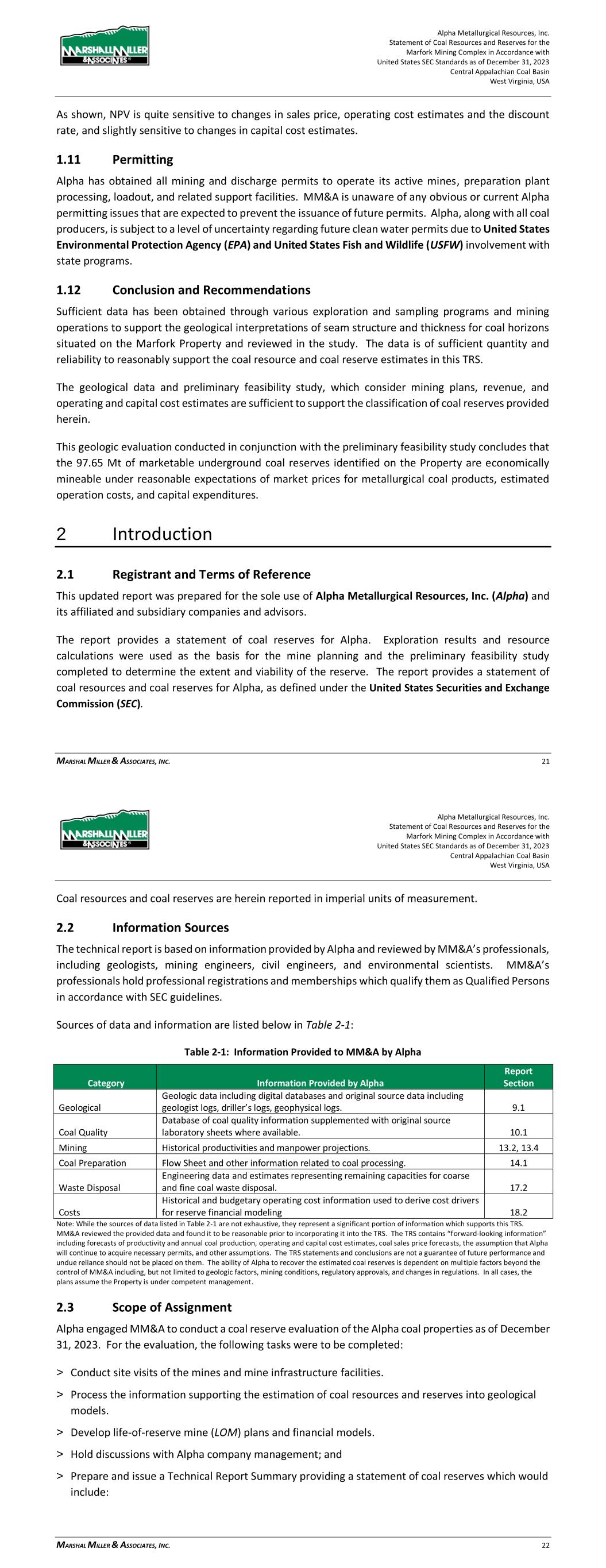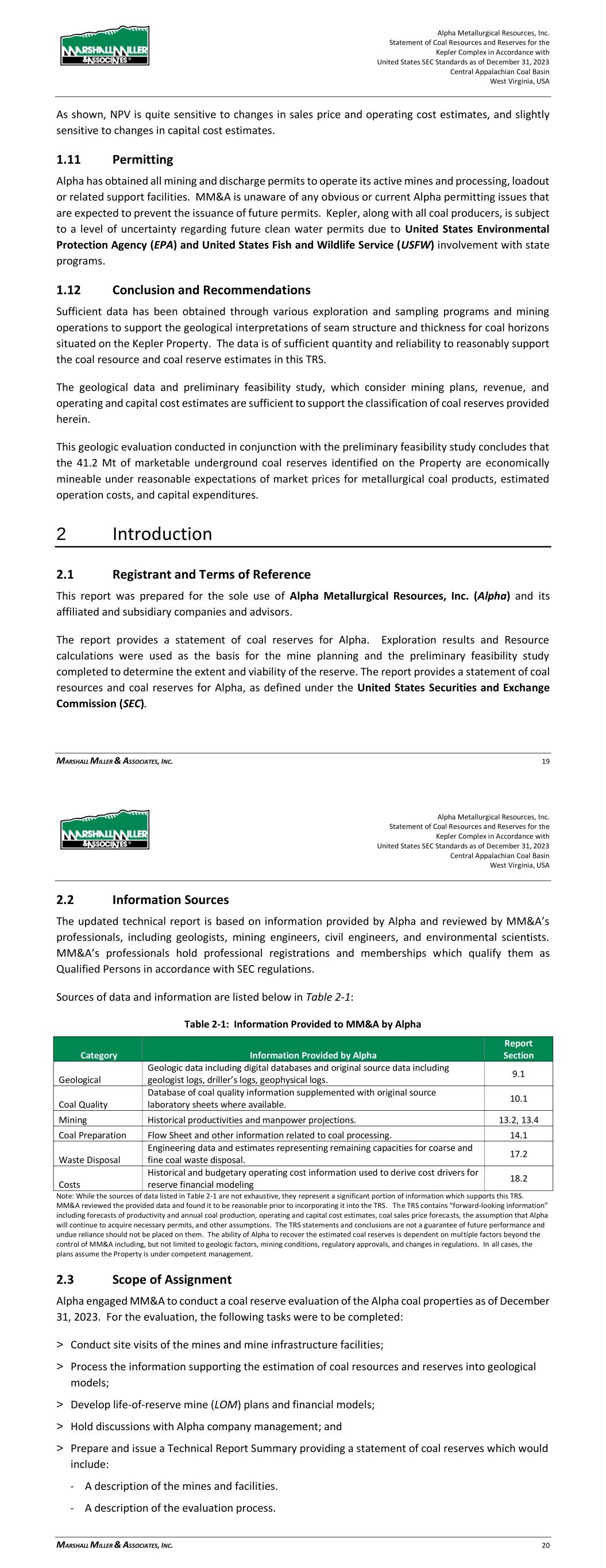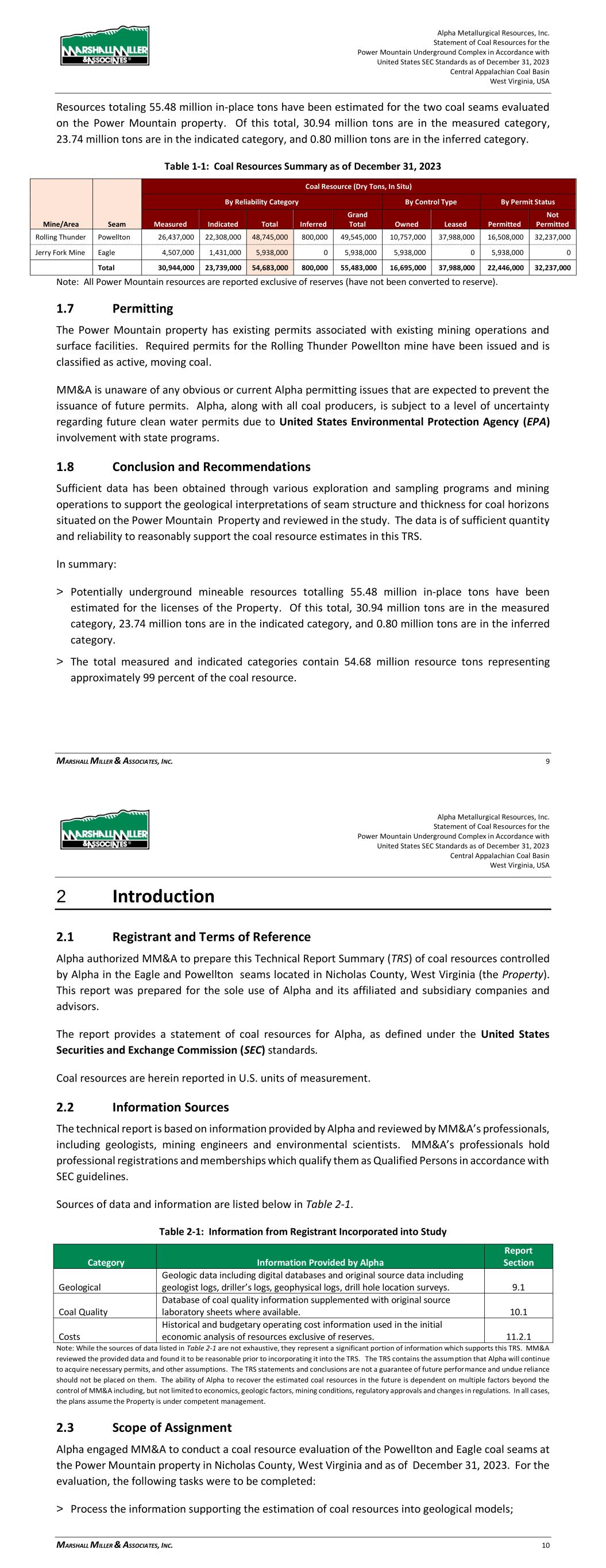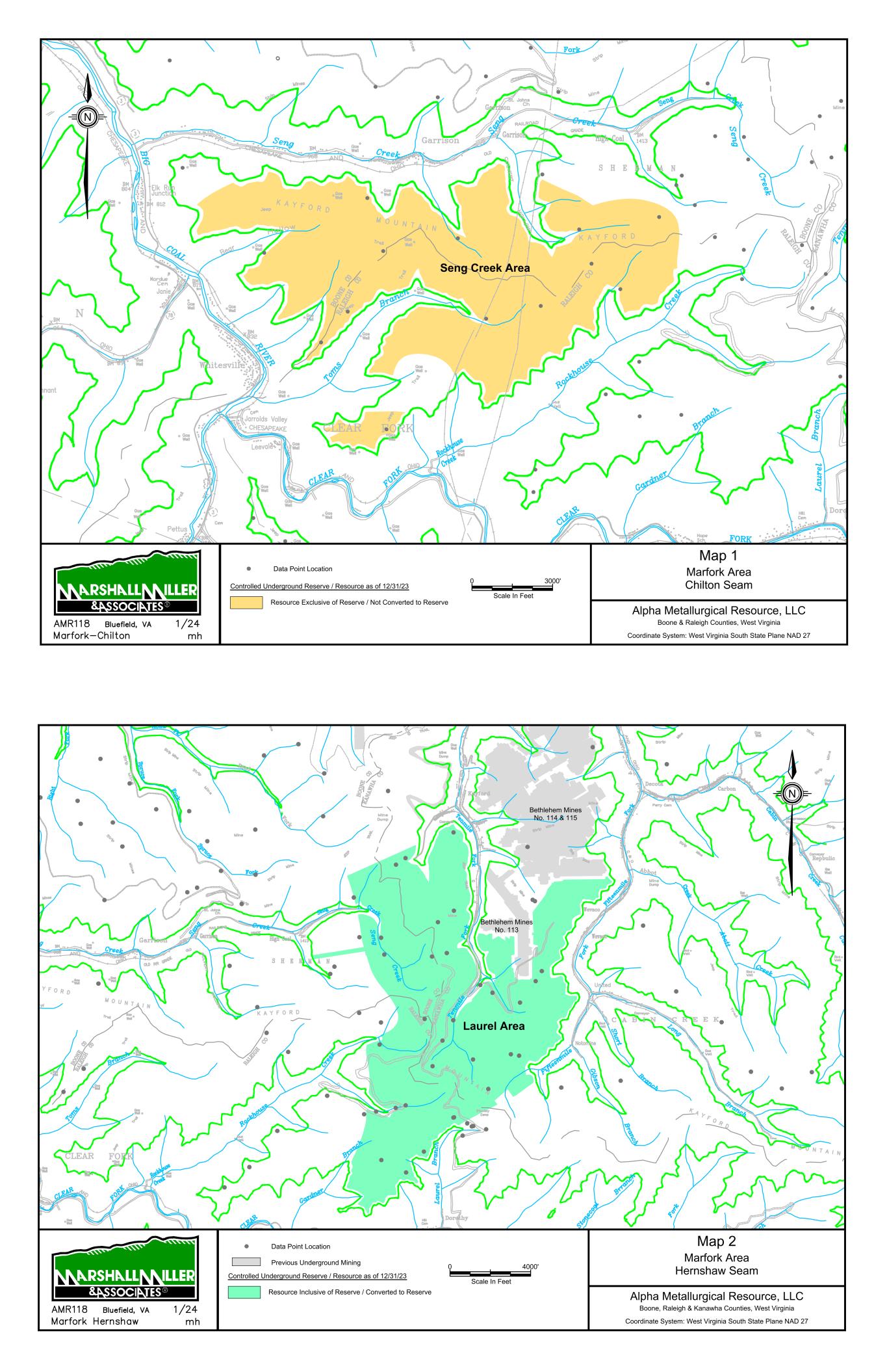Alpha Metallurgical Resources, Inc. Statement of Coal Resources for the Power Mountain Underground Complex in Accordance with United States SEC Standards as of December 31, 2023 Central Appalachian Coal Basin West Virginia, USA MARSHALL MILLER & ASSOCIATES, INC. 9 Resources totaling 55.48 million in-place tons have been estimated for the two coal seams evaluated on the Power Mountain property. Of this total, 30.94 million tons are in the measured category, 23.74 million tons are in the indicated category, and 0.80 million tons are in the inferred category. Table 1-1: Coal Resources Summary as of December 31, 2023 Coal Resource (Dry Tons, In Situ) By Reliability Category By Control Type By Permit Status Mine/Area Seam Measured Indicated Total Inferred Grand Total Owned Leased Permitted Not Permitted Rolling Thunder Powellton 26,437,000 22,308,000 48,745,000 800,000 49,545,000 10,757,000 37,988,000 16,508,000 32,237,000 Jerry Fork Mine Eagle 4,507,000 1,431,000 5,938,000 0 5,938,000 5,938,000 0 5,938,000 0 Total 30,944,000 23,739,000 54,683,000 800,000 55,483,000 16,695,000 37,988,000 22,446,000 32,237,000 Note: All Power Mountain resources are reported exclusive of reserves (have not been converted to reserve). 1.7 Permitting The Power Mountain property has existing permits associated with existing mining operations and surface facilities. Required permits for the Rolling Thunder Powellton mine have been issued and is classified as active, moving coal. MM&A is unaware of any obvious or current Alpha permitting issues that are expected to prevent the issuance of future permits. Alpha, along with all coal producers, is subject to a level of uncertainty regarding future clean water permits due to United States Environmental Protection Agency (EPA) involvement with state programs. 1.8 Conclusion and Recommendations Sufficient data has been obtained through various exploration and sampling programs and mining operations to support the geological interpretations of seam structure and thickness for coal horizons situated on the Power Mountain Property and reviewed in the study. The data is of sufficient quantity and reliability to reasonably support the coal resource estimates in this TRS. In summary: > Potentially underground mineable resources totalling 55.48 million in-place tons have been estimated for the licenses of the Property. Of this total, 30.94 million tons are in the measured category, 23.74 million tons are in the indicated category, and 0.80 million tons are in the inferred category. > The total measured and indicated categories contain 54.68 million resource tons representing approximately 99 percent of the coal resource. Alpha Metallurgical Resources, Inc. Statement of Coal Resources for the Power Mountain Underground Complex in Accordance with United States SEC Standards as of December 31, 2023 Central Appalachian Coal Basin West Virginia, USA MARSHALL MILLER & ASSOCIATES, INC. 10 2 Introduction 2.1 Registrant and Terms of Reference Alpha authorized MM&A to prepare this Technical Report Summary (TRS) of coal resources controlled by Alpha in the Eagle and Powellton seams located in Nicholas County, West Virginia (the Property). This report was prepared for the sole use of Alpha and its affiliated and subsidiary companies and advisors. The report provides a statement of coal resources for Alpha, as defined under the United States Securities and Exchange Commission (SEC) standards. Coal resources are herein reported in U.S. units of measurement. 2.2 Information Sources The technical report is based on information provided by Alpha and reviewed by MM&A’s professionals, including geologists, mining engineers and environmental scientists. MM&A’s professionals hold professional registrations and memberships which qualify them as Qualified Persons in accordance with SEC guidelines. Sources of data and information are listed below in Table 2-1. Table 2-1: Information from Registrant Incorporated into Study Category Information Provided by Alpha Report Section Geological Geologic data including digital databases and original source data including geologist logs, driller’s logs, geophysical logs, drill hole location surveys. 9.1 Coal Quality Database of coal quality information supplemented with original source laboratory sheets where available. 10.1 Costs Historical and budgetary operating cost information used in the initial economic analysis of resources exclusive of reserves. 11.2.1 Note: While the sources of data listed in Table 2-1 are not exhaustive, they represent a significant portion of information which supports this TRS. MM&A reviewed the provided data and found it to be reasonable prior to incorporating it into the TRS. The TRS contains the assumption that Alpha will continue to acquire necessary permits, and other assumptions. The TRS statements and conclusions are not a guarantee of future performance and undue reliance should not be placed on them. The ability of Alpha to recover the estimated coal resources in the future is dependent on multiple factors beyond the control of MM&A including, but not limited to economics, geologic factors, mining conditions, regulatory approvals and changes in regulations. In all cases, the plans assume the Property is under competent management. 2.3 Scope of Assignment Alpha engaged MM&A to conduct a coal resource evaluation of the Powellton and Eagle coal seams at the Power Mountain property in Nicholas County, West Virginia and as of December 31, 2023. For the evaluation, the following tasks were to be completed: > Process the information supporting the estimation of coal resources into geological models;
