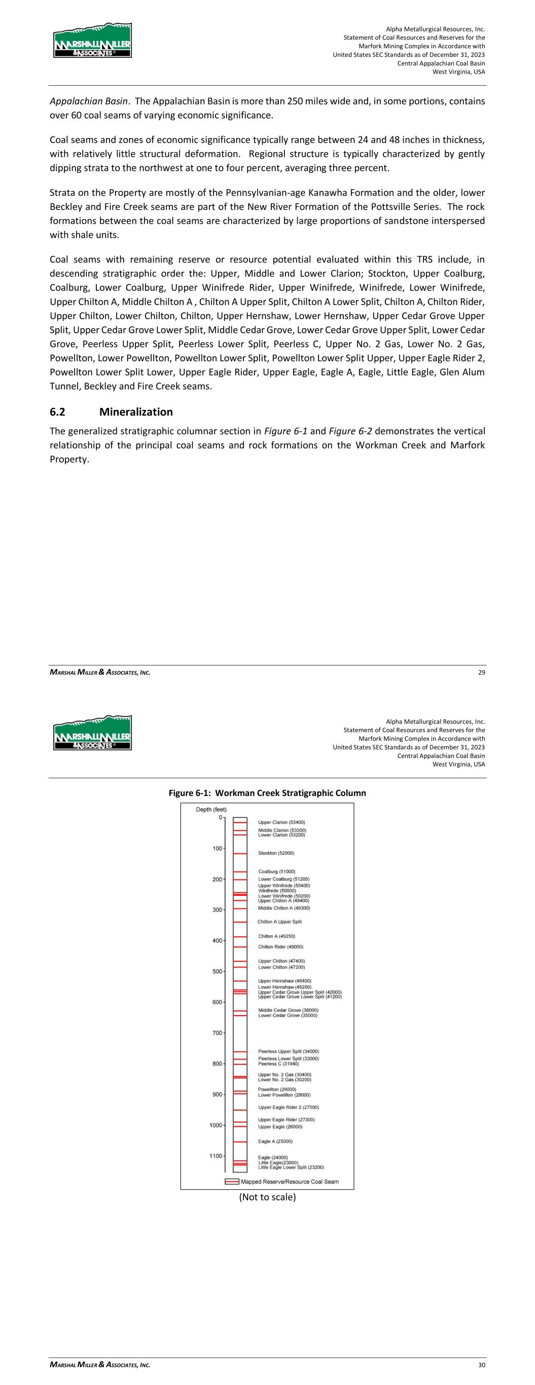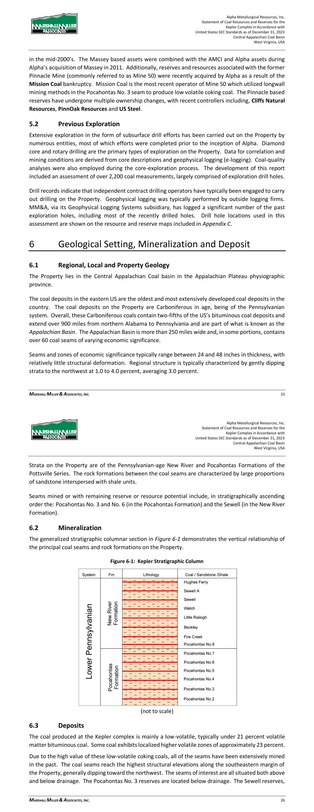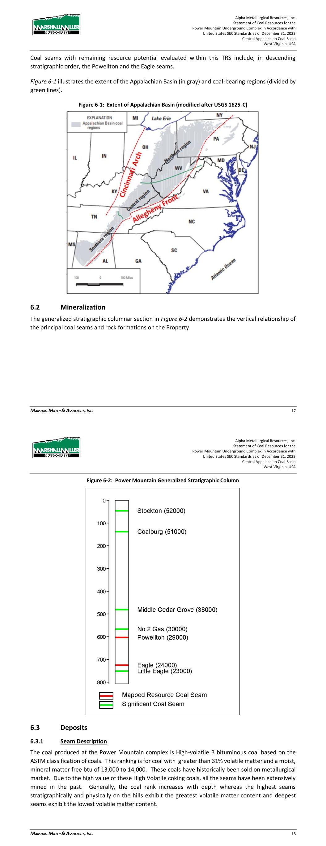 Alpha Metallurgical Resources, Inc. Statement of Coal Resources for the Power Mountain Underground Complex in Accordance with United States SEC Standards as of December 31, 2023 Central Appalachian Coal Basin West Virginia, USA MARSHALL MILLER & ASSOCIATES, INC. 17 Coal seams with remaining resource potential evaluated within this TRS include, in descending stratigraphic order, the Powellton and the Eagle seams. Figure 6-1 illustrates the extent of the Appalachian Basin (in gray) and coal-bearing regions (divided by green lines). Figure 6-1: Extent of Appalachian Basin (modified after USGS 1625-C) 6.2 Mineralization The generalized stratigraphic columnar section in Figure 6-2 demonstrates the vertical relationship of the principal coal seams and rock formations on the Property. Alpha Metallurgical Resources, Inc. Statement of Coal Resources for the Power Mountain Underground Complex in Accordance with United States SEC Standards as of December 31, 2023 Central Appalachian Coal Basin West Virginia, USA MARSHALL MILLER & ASSOCIATES, INC. 18 Figure 6-2: Power Mountain Generalized Stratigraphic Column 6.3 Deposits 6.3.1 Seam Description The coal produced at the Power Mountain complex is High-volatile B bituminous coal based on the ASTM classification of coals. This ranking is for coal with greater than 31% volatile matter and a moist, mineral matter free btu of 13,000 to 14,000. These coals have historically been sold on metallurgical market. Due to the high value of these High Volatile coking coals, all the seams have been extensively mined in the past. Generally, the coal rank increases with depth whereas the highest seams stratigraphically and physically on the hills exhibit the greatest volatile matter content and deepest seams exhibit the lowest volatile matter content.