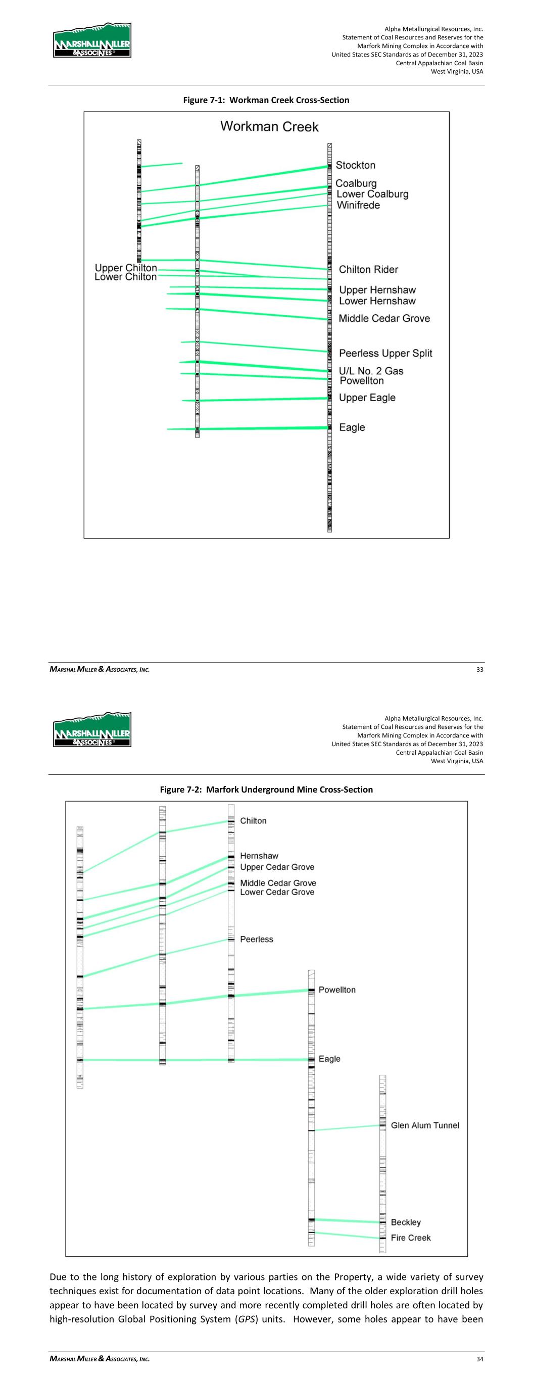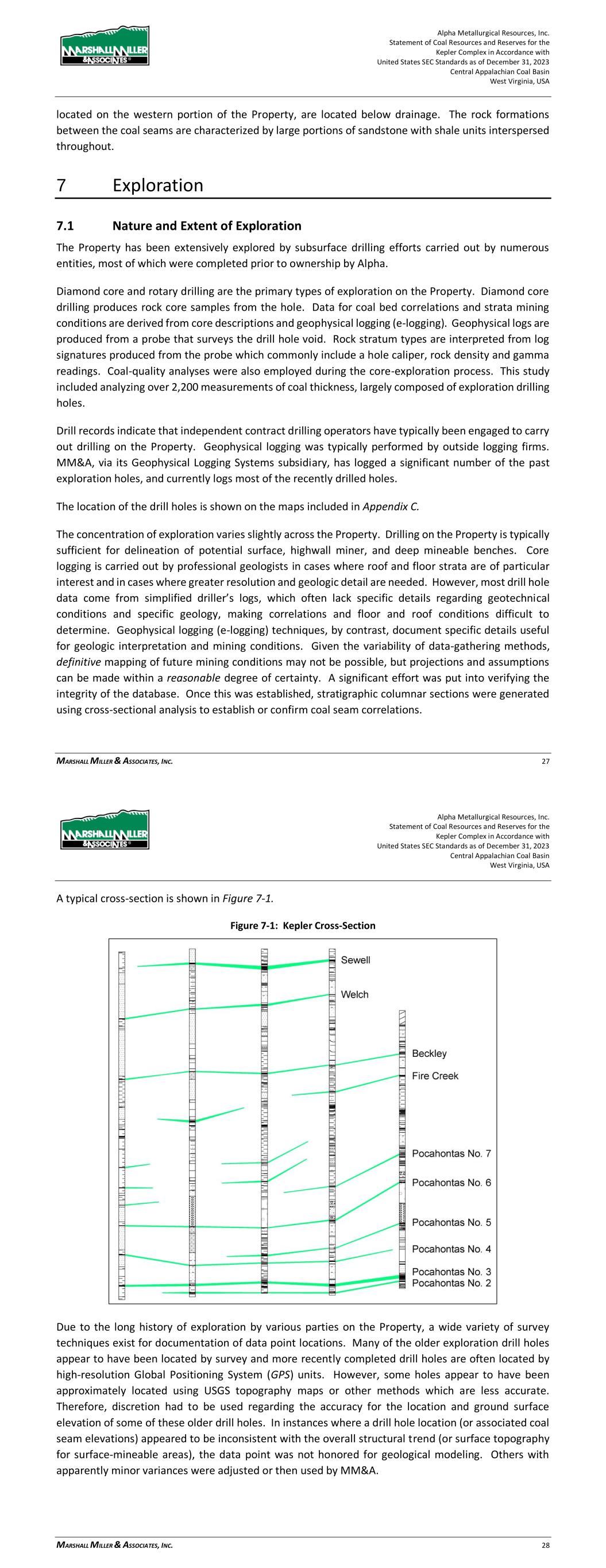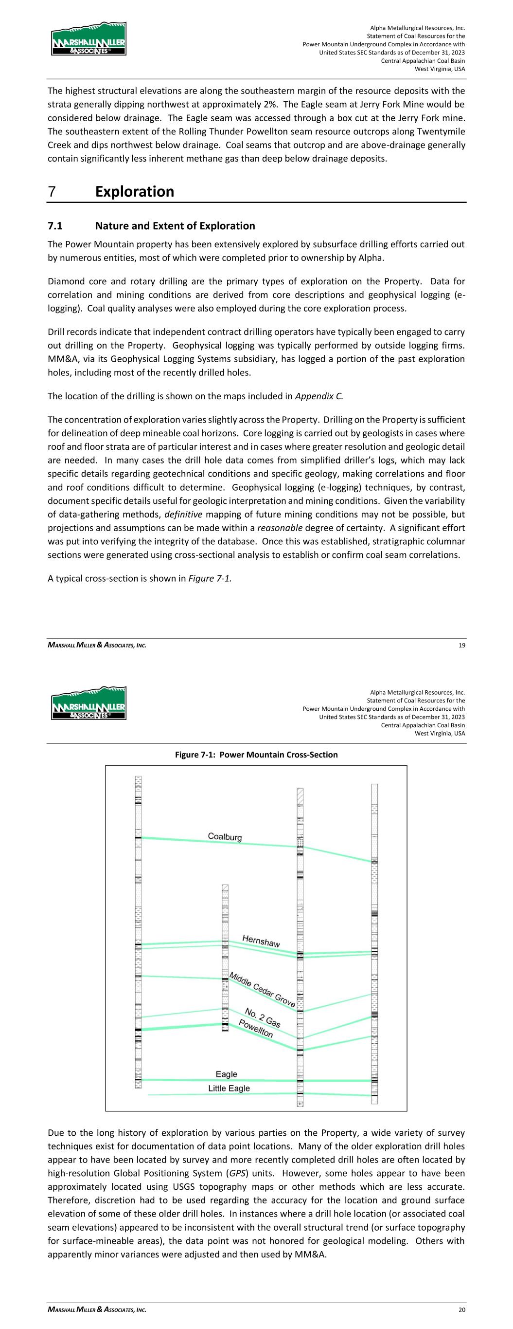 Alpha Metallurgical Resources, Inc. Statement of Coal Resources for the Power Mountain Underground Complex in Accordance with United States SEC Standards as of December 31, 2023 Central Appalachian Coal Basin West Virginia, USA MARSHALL MILLER & ASSOCIATES, INC. 19 The highest structural elevations are along the southeastern margin of the resource deposits with the strata generally dipping northwest at approximately 2%. The Eagle seam at Jerry Fork Mine would be considered below drainage. The Eagle seam was accessed through a box cut at the Jerry Fork mine. The southeastern extent of the Rolling Thunder Powellton seam resource outcrops along Twentymile Creek and dips northwest below drainage. Coal seams that outcrop and are above-drainage generally contain significantly less inherent methane gas than deep below drainage deposits. 7 Exploration 7.1 Nature and Extent of Exploration The Power Mountain property has been extensively explored by subsurface drilling efforts carried out by numerous entities, most of which were completed prior to ownership by Alpha. Diamond core and rotary drilling are the primary types of exploration on the Property. Data for correlation and mining conditions are derived from core descriptions and geophysical logging (e- logging). Coal quality analyses were also employed during the core exploration process. Drill records indicate that independent contract drilling operators have typically been engaged to carry out drilling on the Property. Geophysical logging was typically performed by outside logging firms. MM&A, via its Geophysical Logging Systems subsidiary, has logged a portion of the past exploration holes, including most of the recently drilled holes. The location of the drilling is shown on the maps included in Appendix C. The concentration of exploration varies slightly across the Property. Drilling on the Property is sufficient for delineation of deep mineable coal horizons. Core logging is carried out by geologists in cases where roof and floor strata are of particular interest and in cases where greater resolution and geologic detail are needed. In many cases the drill hole data comes from simplified driller’s logs, which may lack specific details regarding geotechnical conditions and specific geology, making correlations and floor and roof conditions difficult to determine. Geophysical logging (e-logging) techniques, by contrast, document specific details useful for geologic interpretation and mining conditions. Given the variability of data-gathering methods, definitive mapping of future mining conditions may not be possible, but projections and assumptions can be made within a reasonable degree of certainty. A significant effort was put into verifying the integrity of the database. Once this was established, stratigraphic columnar sections were generated using cross-sectional analysis to establish or confirm coal seam correlations. A typical cross-section is shown in Figure 7-1. Alpha Metallurgical Resources, Inc. Statement of Coal Resources for the Power Mountain Underground Complex in Accordance with United States SEC Standards as of December 31, 2023 Central Appalachian Coal Basin West Virginia, USA MARSHALL MILLER & ASSOCIATES, INC. 20 Figure 7-1: Power Mountain Cross-Section Due to the long history of exploration by various parties on the Property, a wide variety of survey techniques exist for documentation of data point locations. Many of the older exploration drill holes appear to have been located by survey and more recently completed drill holes are often located by high-resolution Global Positioning System (GPS) units. However, some holes appear to have been approximately located using USGS topography maps or other methods which are less accurate. Therefore, discretion had to be used regarding the accuracy for the location and ground surface elevation of some of these older drill holes. In instances where a drill hole location (or associated coal seam elevations) appeared to be inconsistent with the overall structural trend (or surface topography for surface-mineable areas), the data point was not honored for geological modeling. Others with apparently minor variances were adjusted and then used by MM&A.